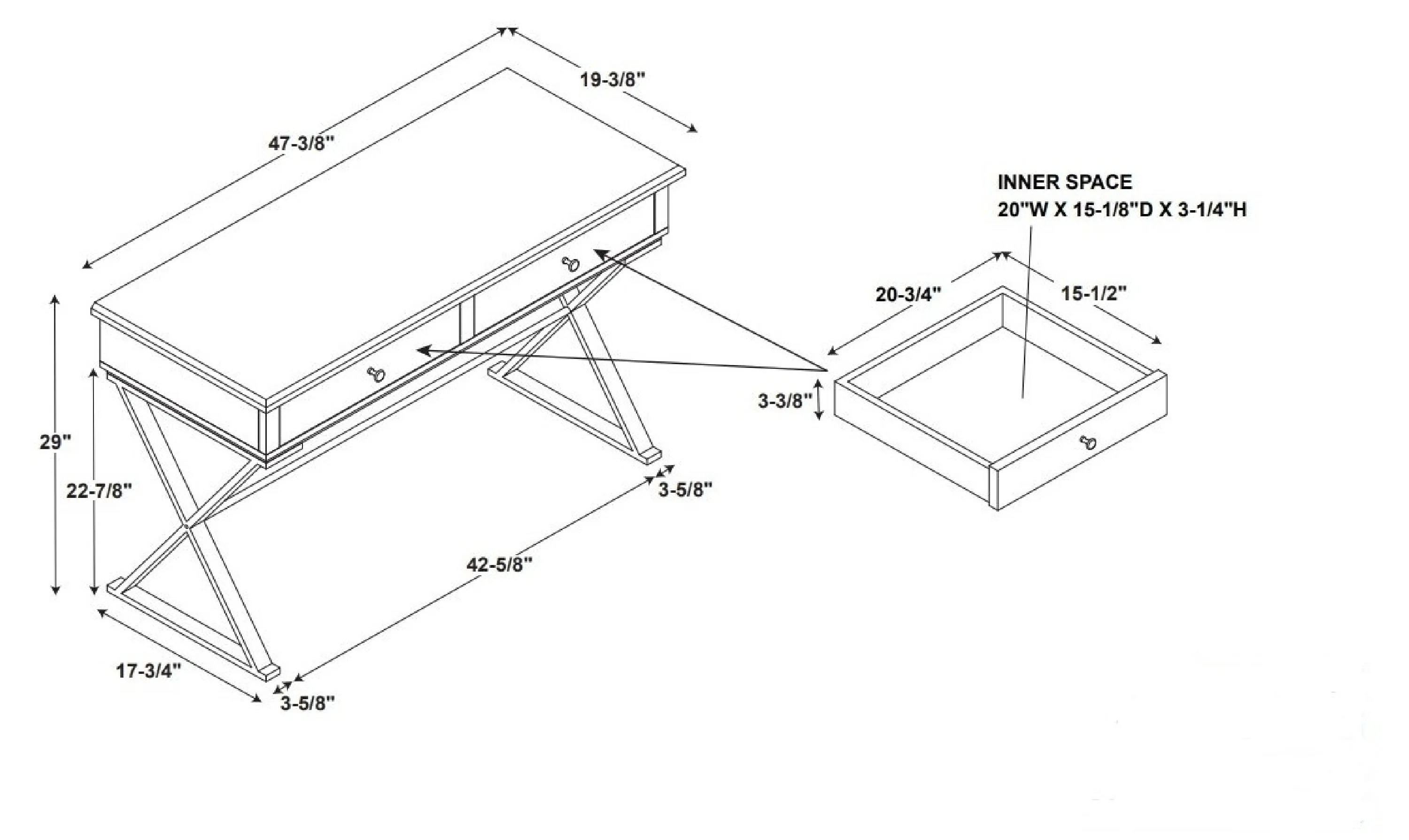 Modern Campaign design Metal base with gold finish Gray painted top Two storage drawers with smooth metal glides. Top and drawers fully assembled; metal legs require simple assembly Overall dimensions: 47.37″ w x 19.37″ d x 29″ h Distance between legs: 42.625″ Drawer inner space: 20″ w x 15.125″ d x 3.25″ h Weight Limit: Top: 100 lbs, Drawer: 10 lbs