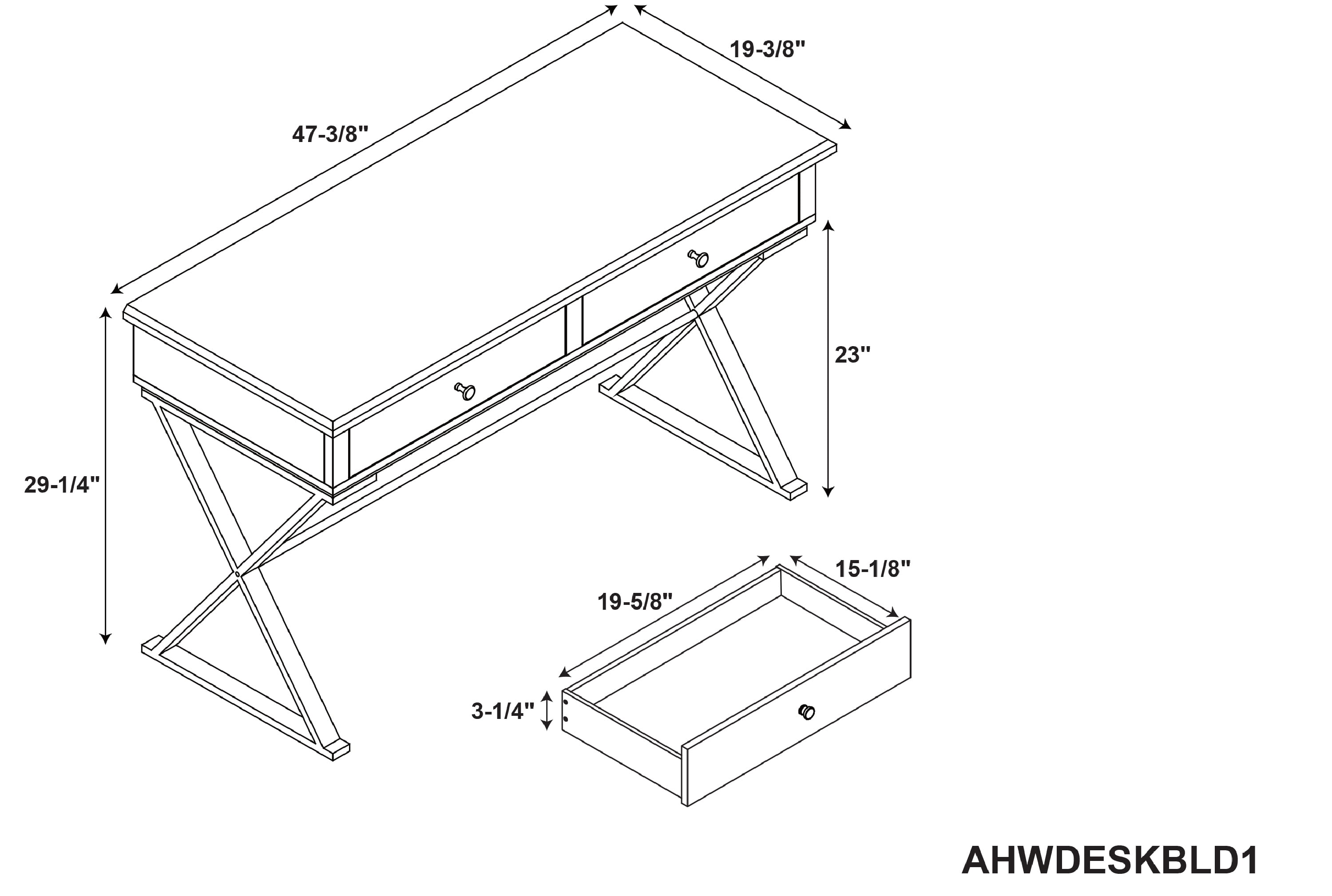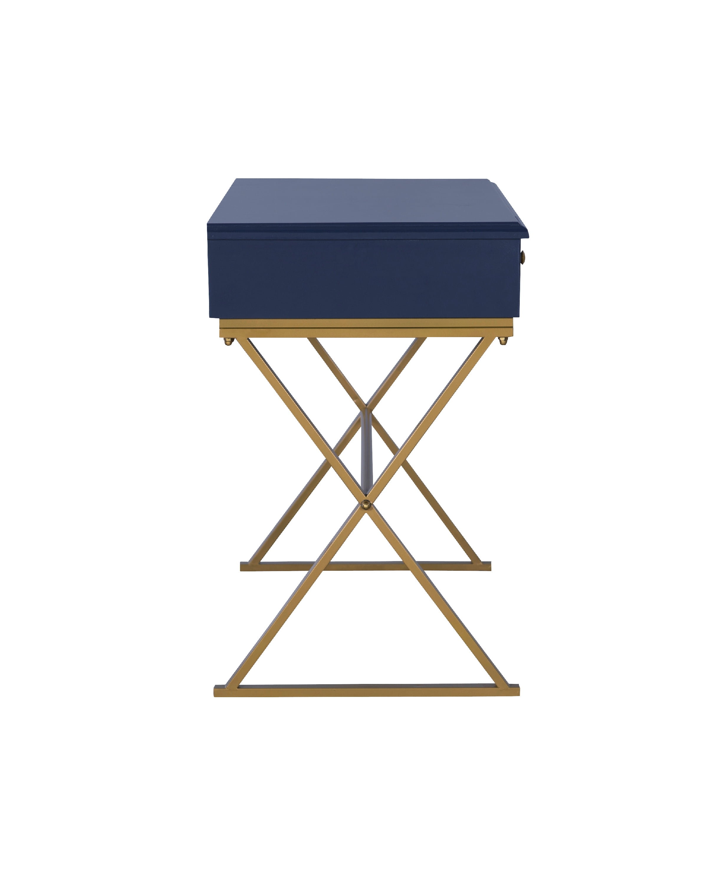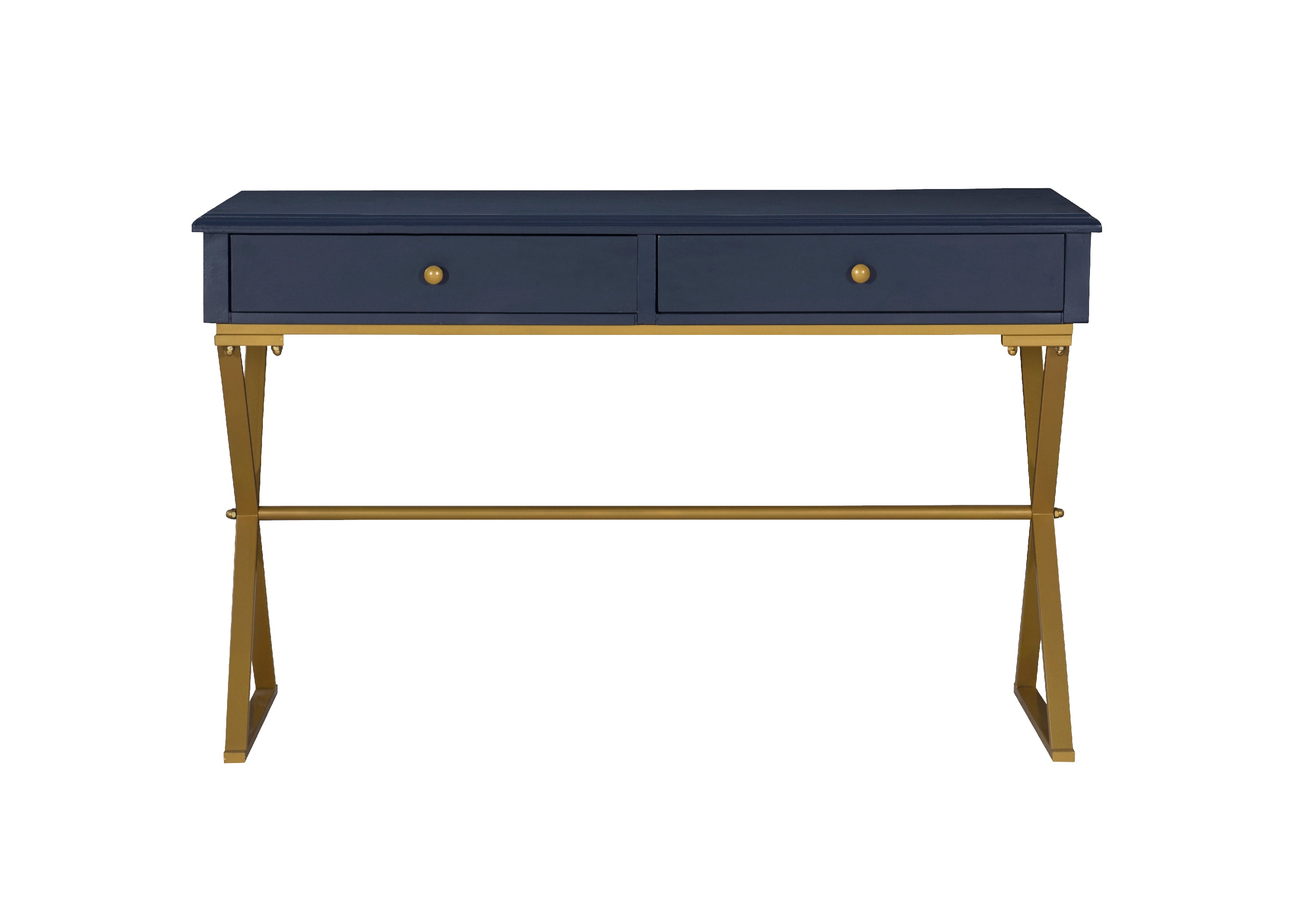 Stylish workstation for your office. Gold Knobs “X” Styled Sides Blue and Gold Matte Finish Interior Drawer Dimension: 19.75″ w x 15.125″ d x 3.5″ h Floor to Base of Desk: 23″ H Also available in black or white Weight Limit: 100 lbs Assembled Dimensions: 47.25″ w x 19.63″ d x 28.88″ h Suggested for Adult Use