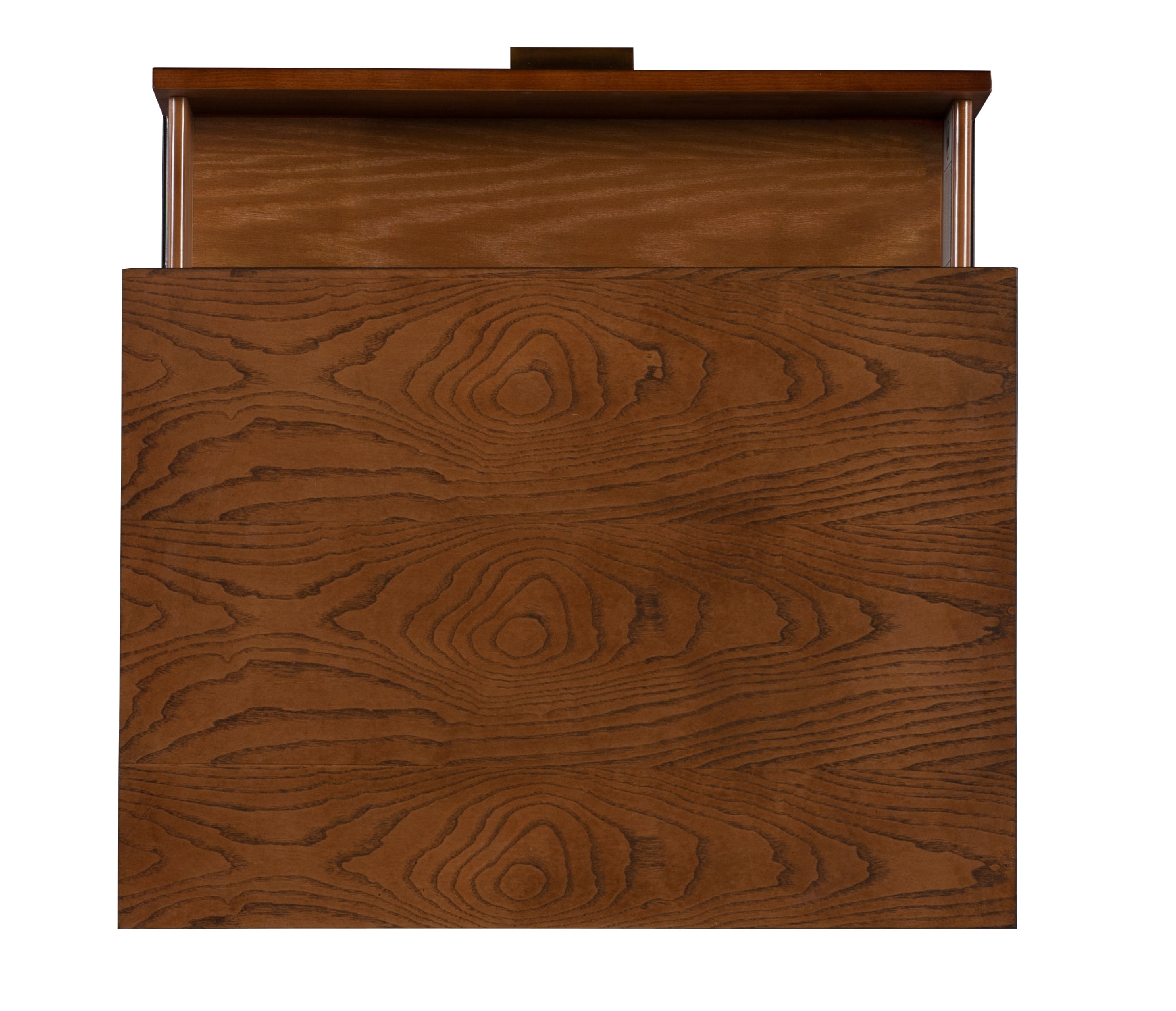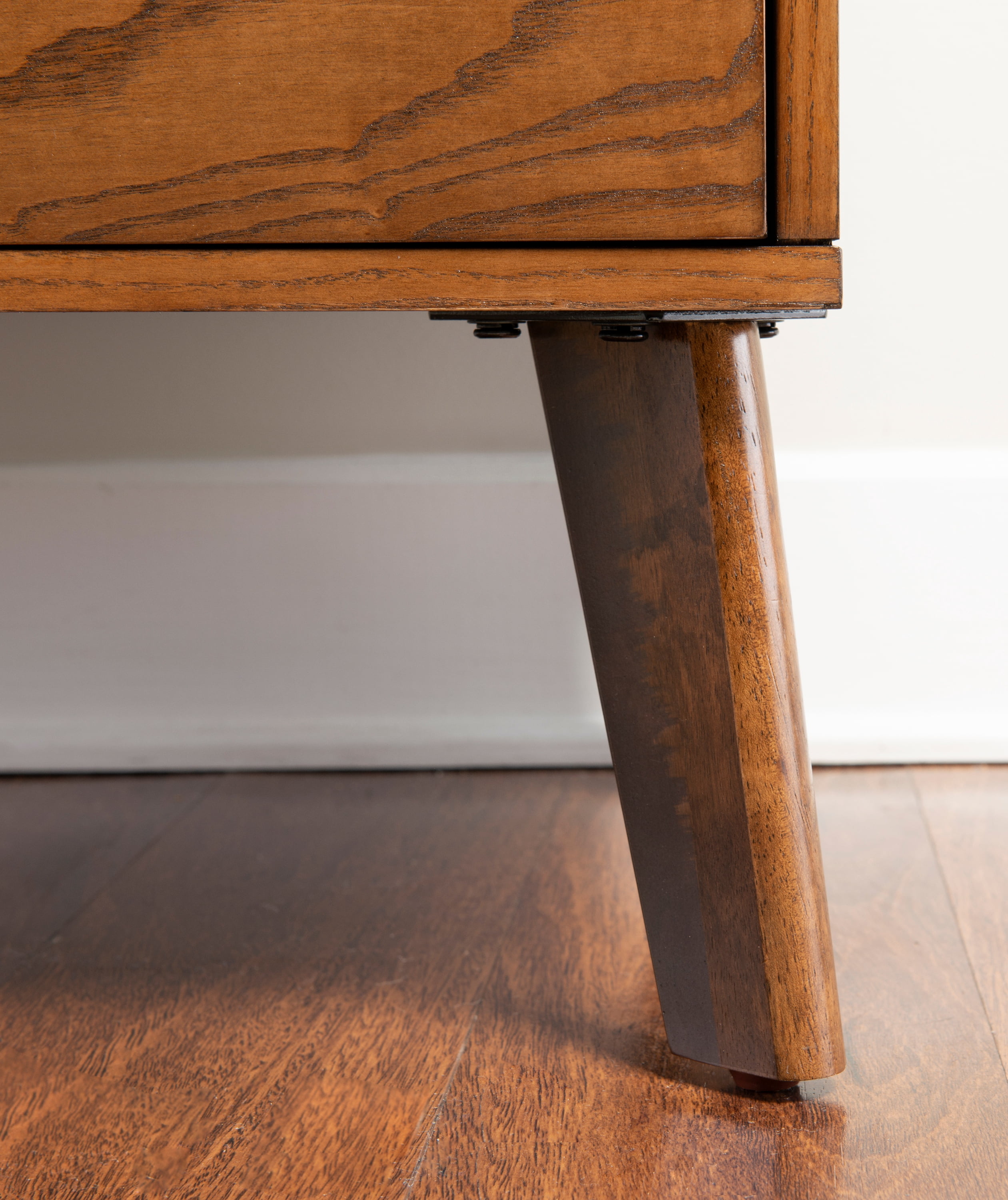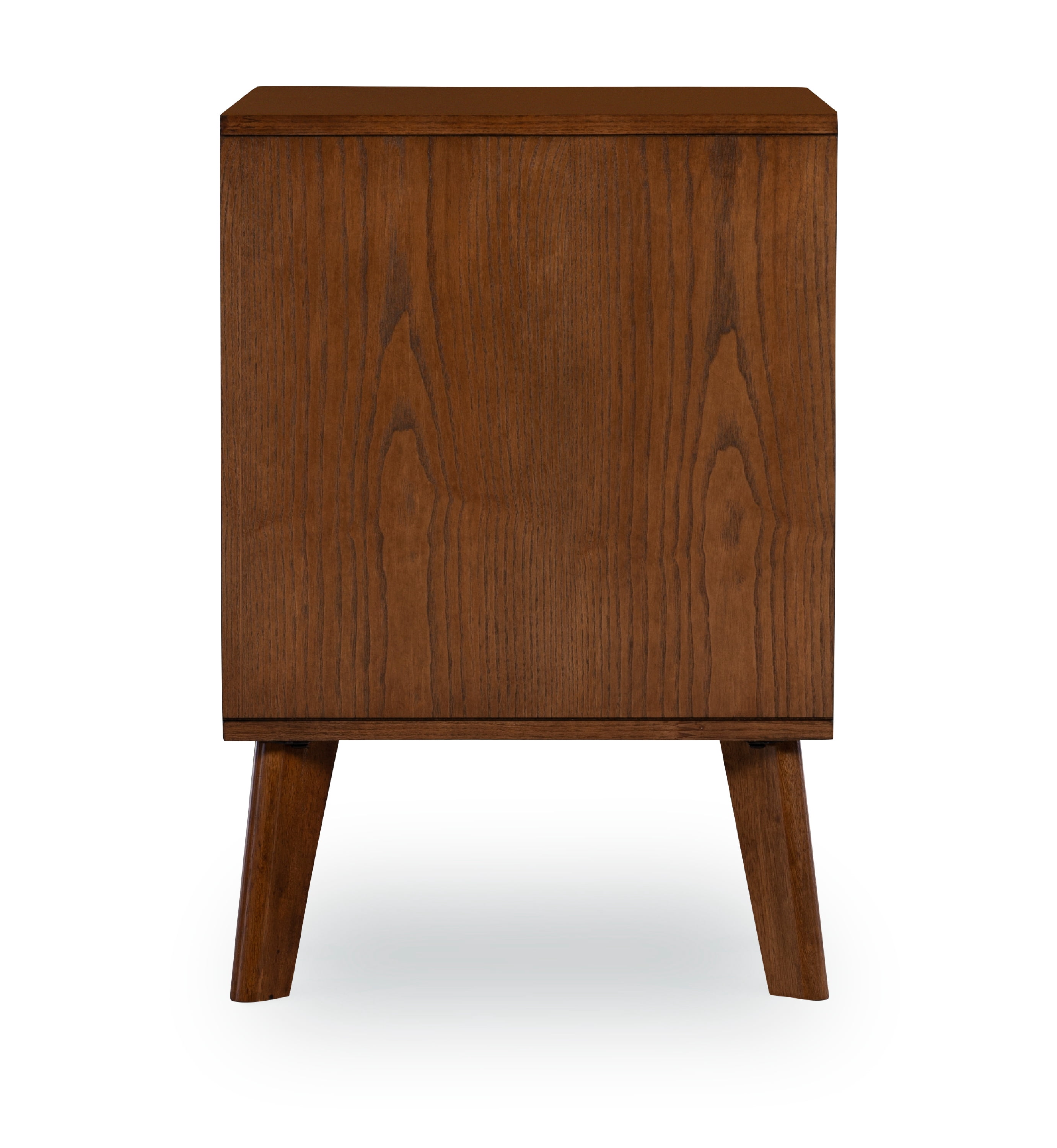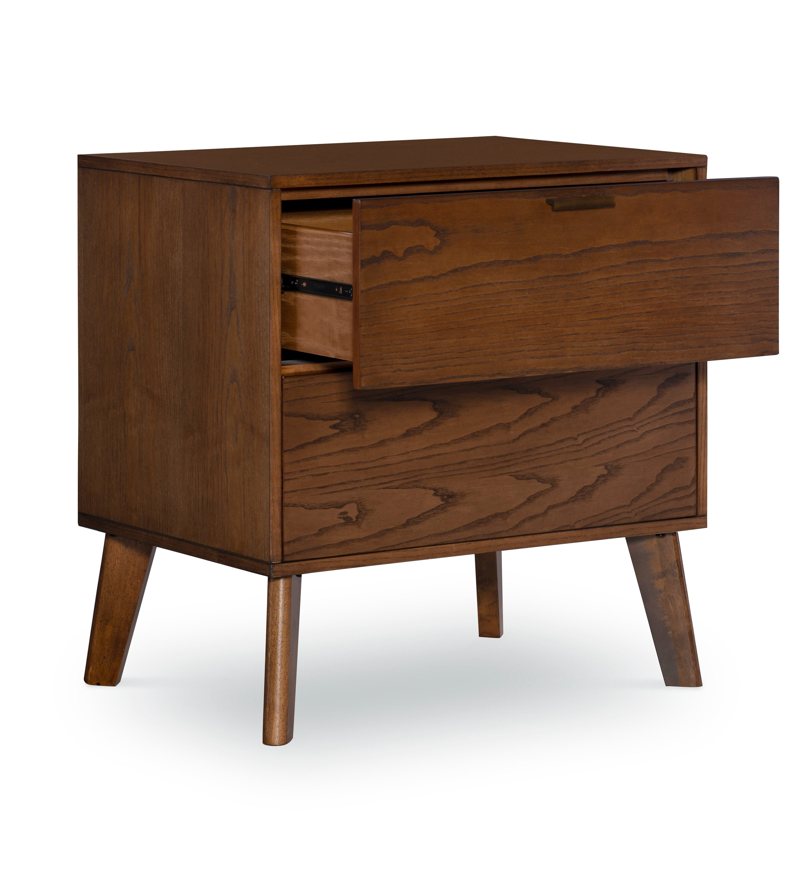 Showcase the beauty of mid-century modern style with this handsome nightstand. Angular and sleek, this piece offers an appealing simplicity that suits any style of home. A rich finish highlights the natural grain patterns of the ash wood veneer while bronze hardware completes the look. Two spacious drawers add convenient and versatile storage. For a timeless, cohesive effect, design your ideal bedroom set by pairing this piece with others in the collection.