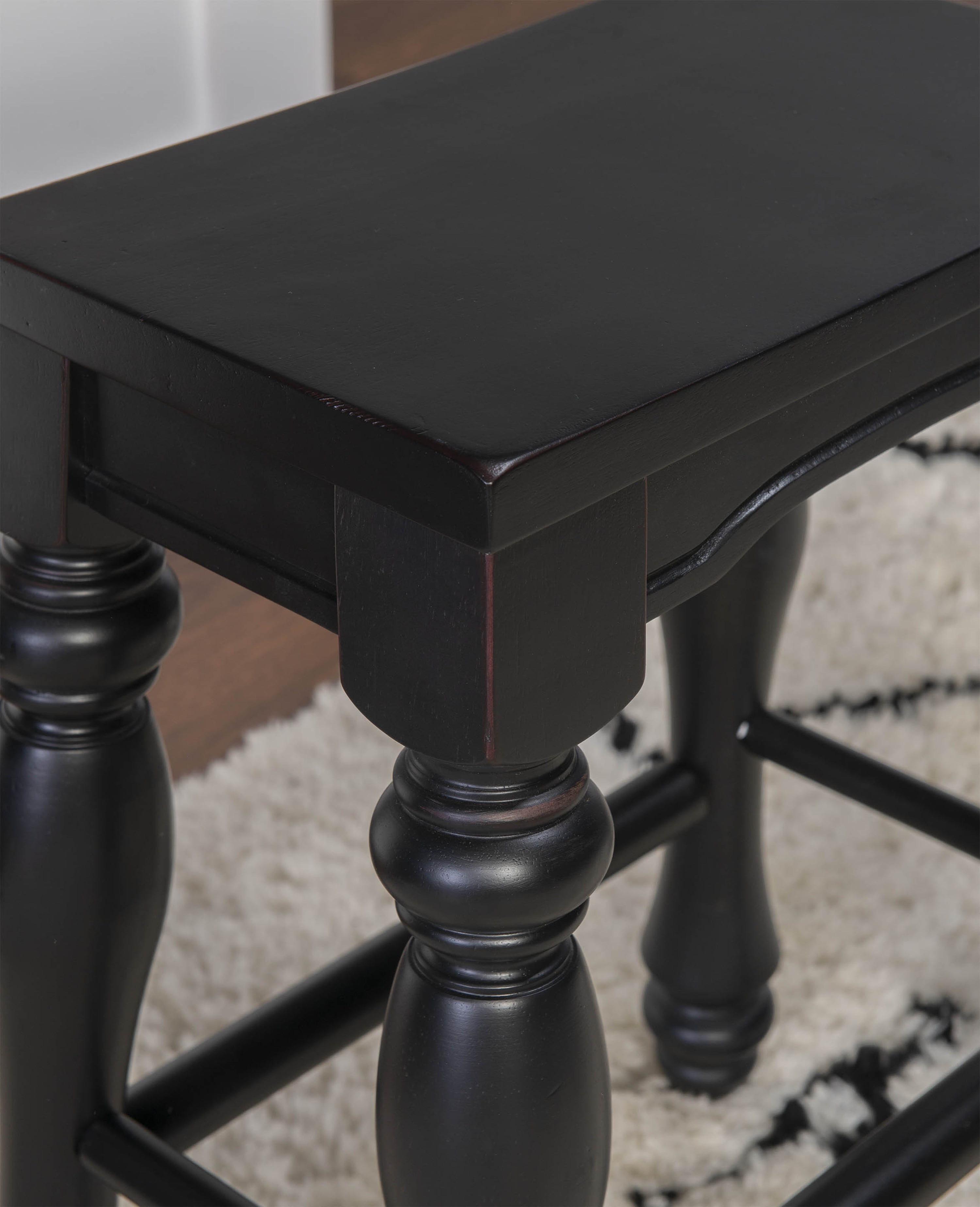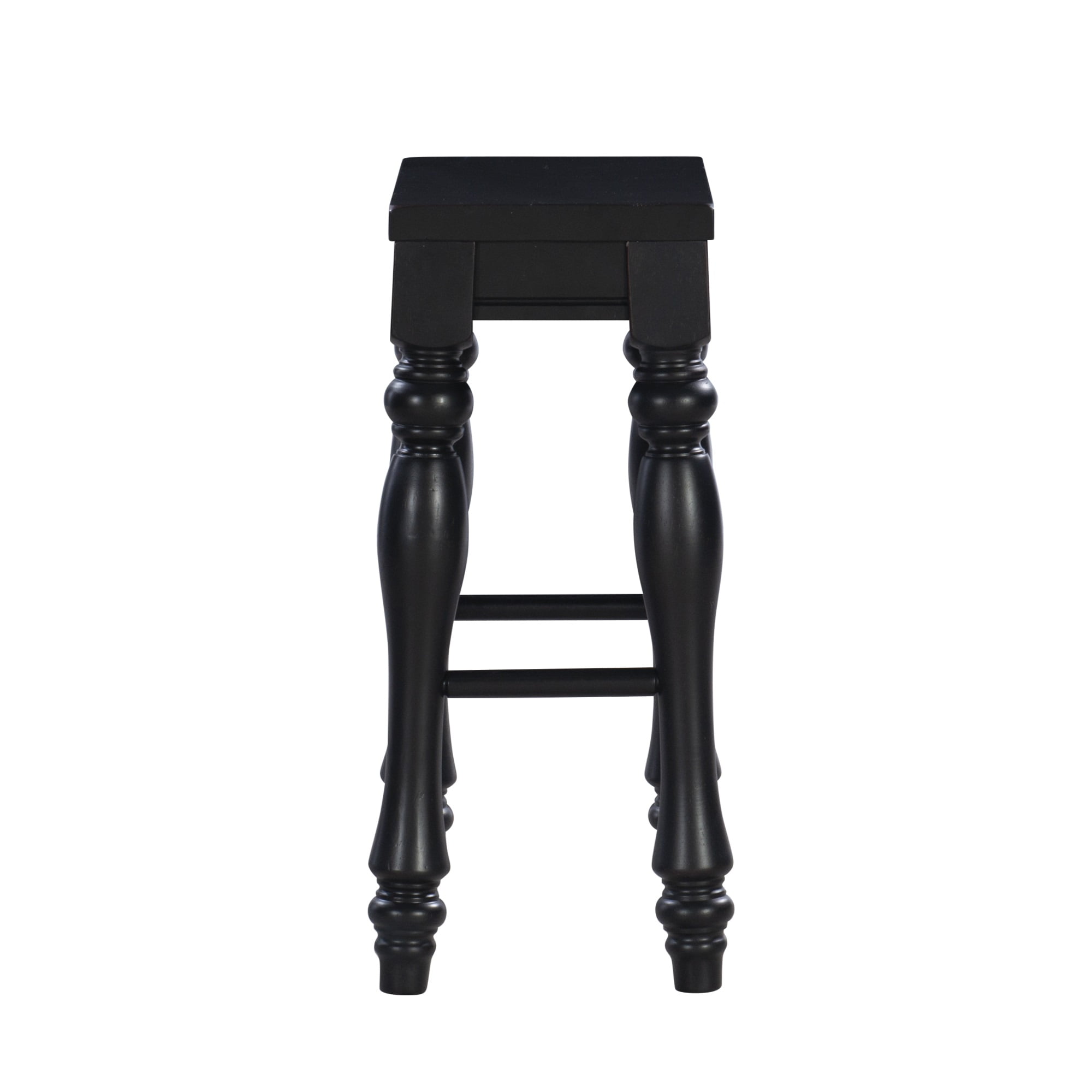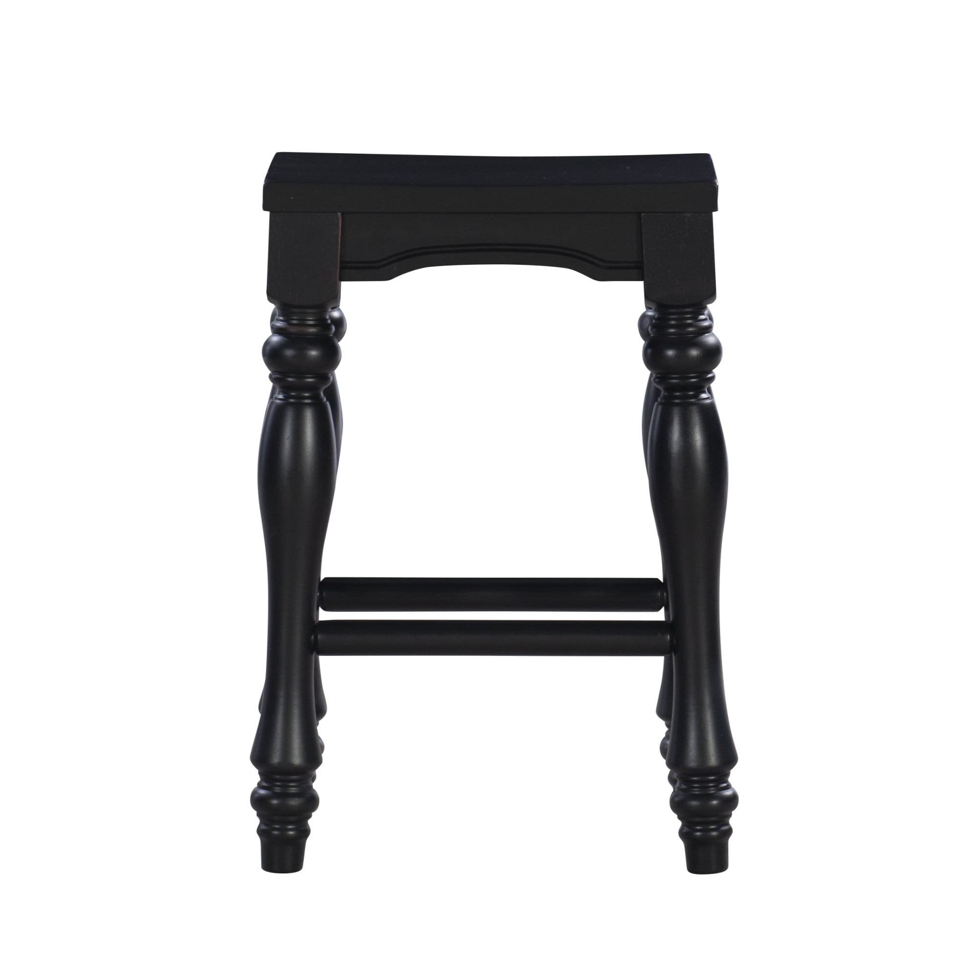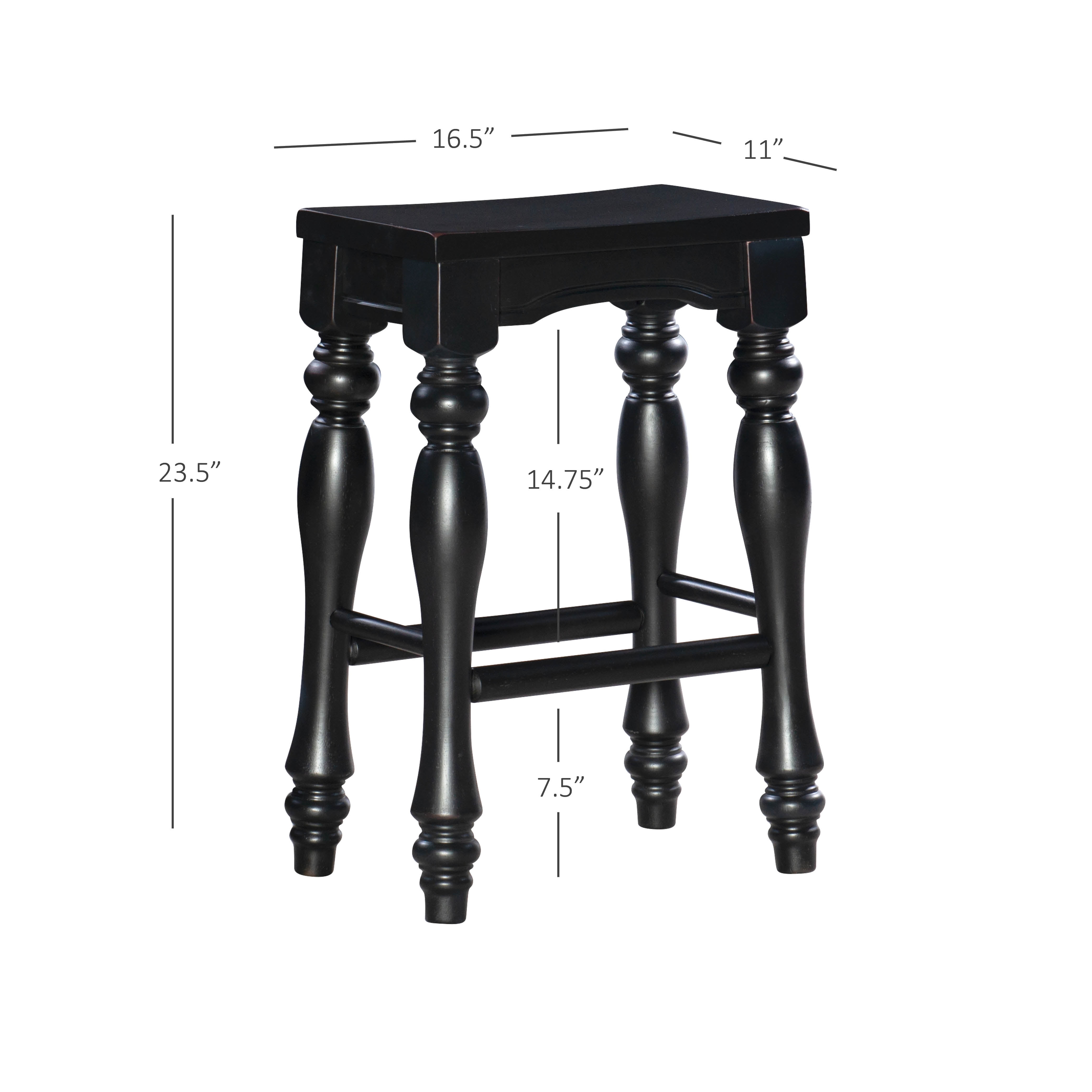Make a statement in a kitchen or dining area with these bold country-inspired Kitchen Stools. Dramatic, turned legs support a gently contoured seat for a strong and sturdy design that exudes classic elegance. Features a black sand-through finish and a solid wood seat. Sold as a set of two. Some assembly required. Features: Crafted from Acacia Solid Wood Black with a Sand Rubthrough Finish Turned Legs Solid wood seat Set of Two Counter Height Specifications: Assembly Required: Some Assembly Required Product Dimensions: 16.5″w x 11″d x 23.5″h Product Height: 26.46 lbs Seat Height: 23.5″ Seat Dimensions: 15″w x 9.5″d Weight Capacity: 275 lbs