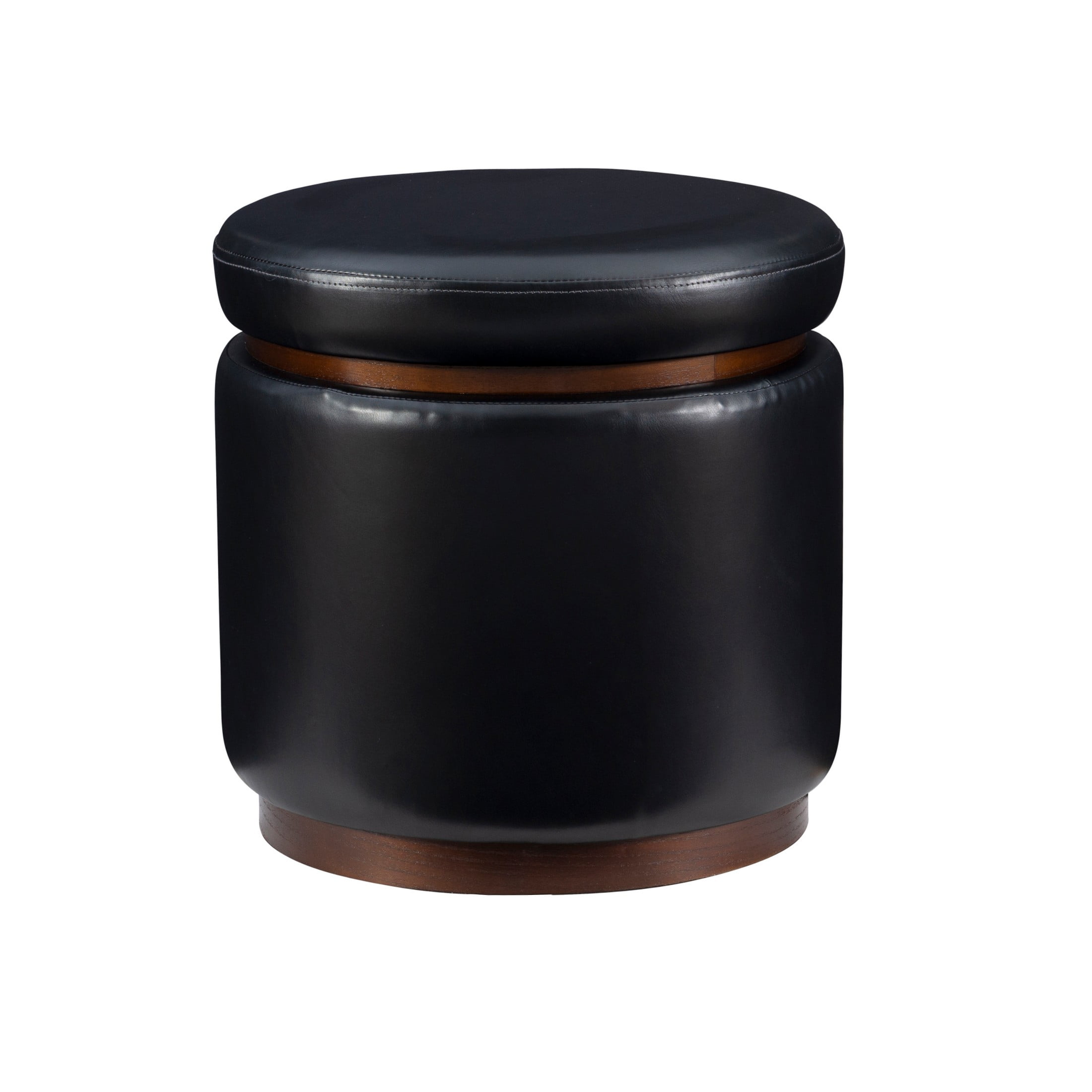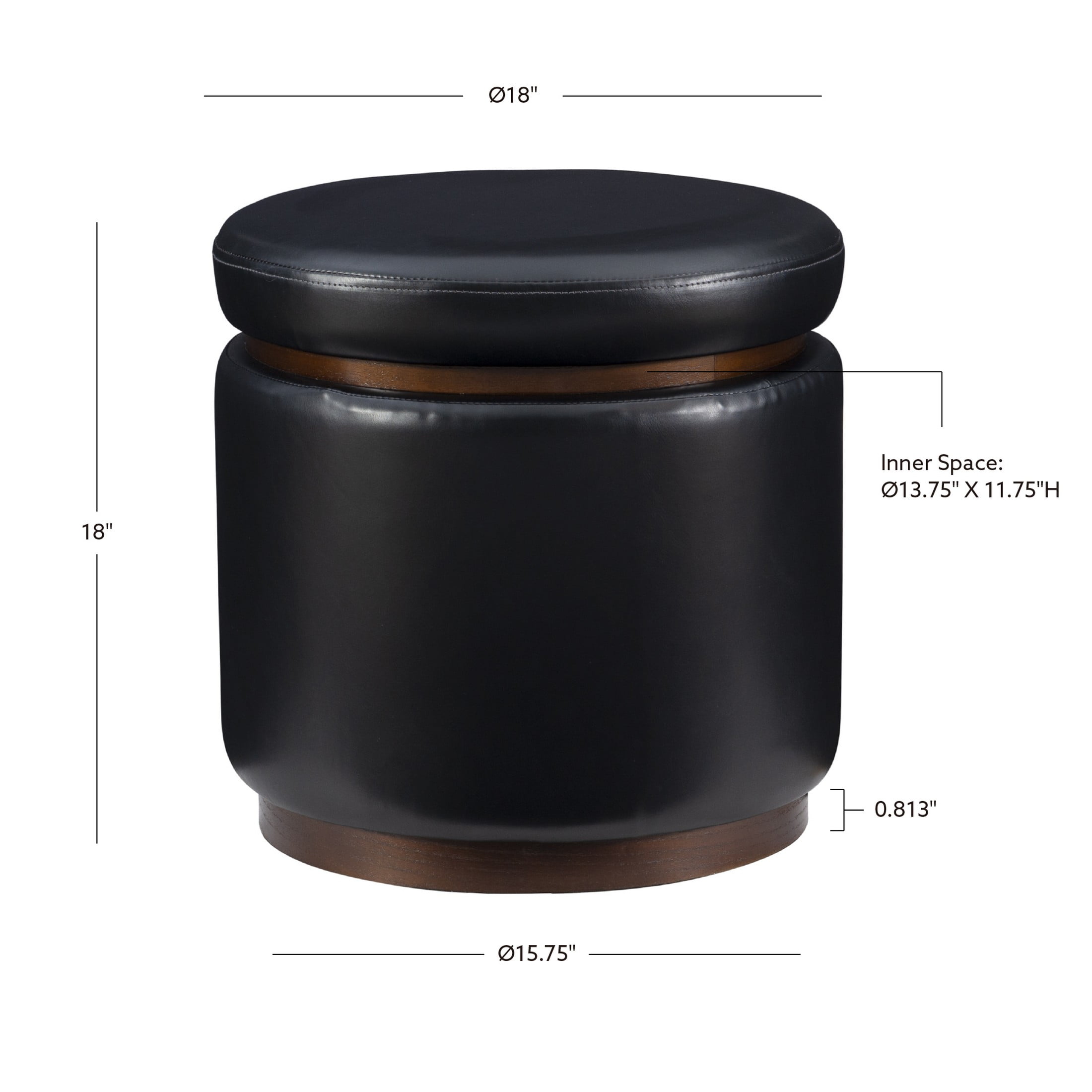 18in w x 18in d x 18in h dimensions fit perfectly next to your favorite chair desk or makeup vanity Black faux leather on side panels and lid offers a refined aesthetic and easy cleaning Removable lid lifts to reveal 13.75in diameter x 11.75in height interior space lined with black felt Pinewood trim in dark walnut finish provides understated accent Multifunctional design allows for use as foot rest extra seating and subtle storage Lightweight design makes for easy transport around the house Supports up to 200 lbs Arrives fully assembled Assembled Dimensions: 18 L x 18 D x 18 H in Seat Height: 18 in Weight Capacity: 225 Lbs Ships in 1 box