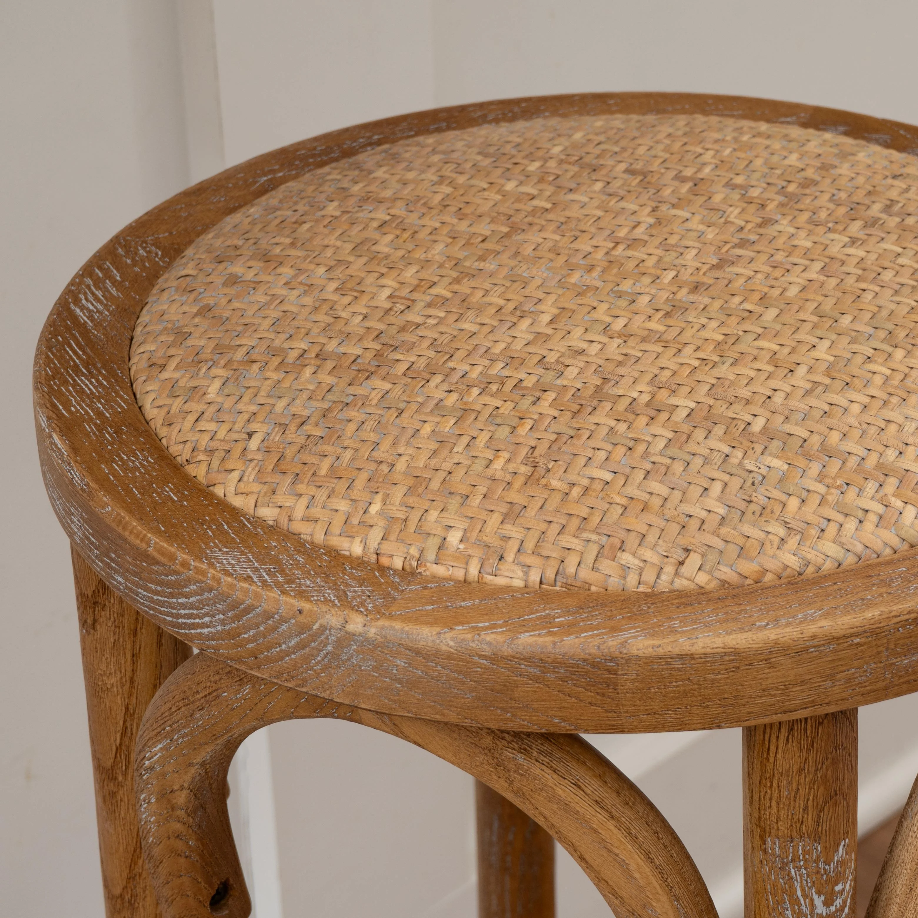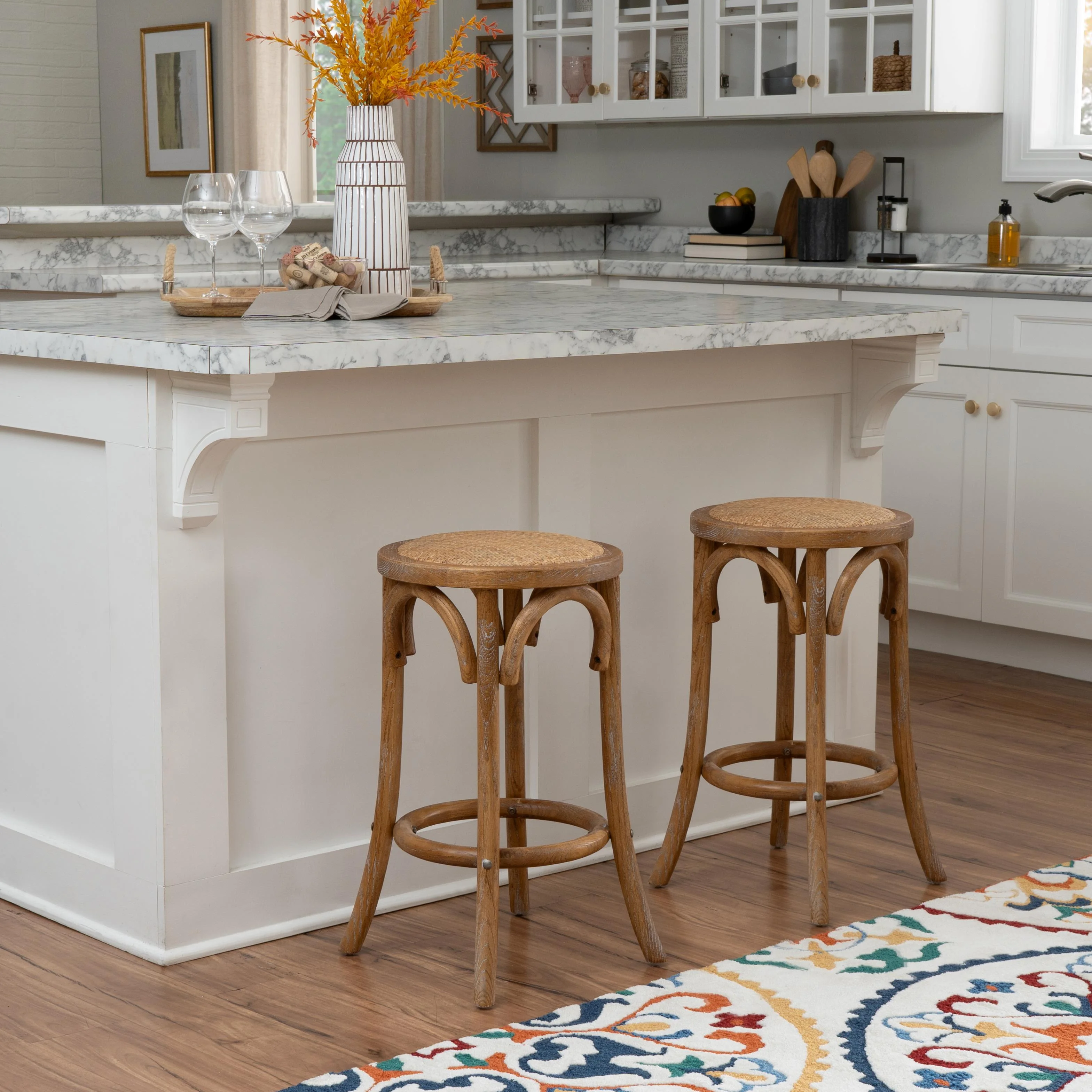Linon Rae Rattan Backless Counter Stool, Brown, 24 inch Seat Height, Fully Assembled: Rounded Backless Seat Counter Stool Natural Wood Finish Natural fiber seat Weight Limit: 250 lbs Materials: Elm Wood Floor to Footrest: 8.25″, Floor to Bottom of Seat: 23″, Floor to Top of Seat: 24″ Dimensions: 14″w x 14″d x 24″h Carton Dimensions: 14.37″w x 14.37″d x 25″h Fully Assembled Sku: CS153RATT01U