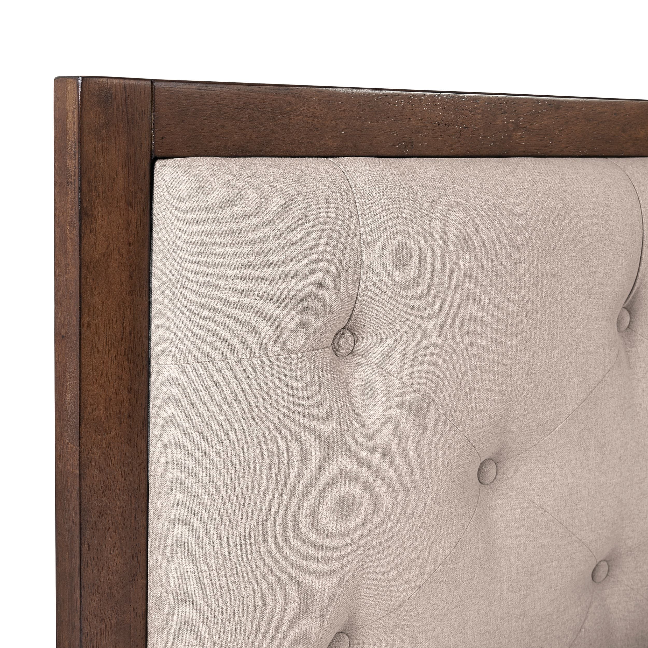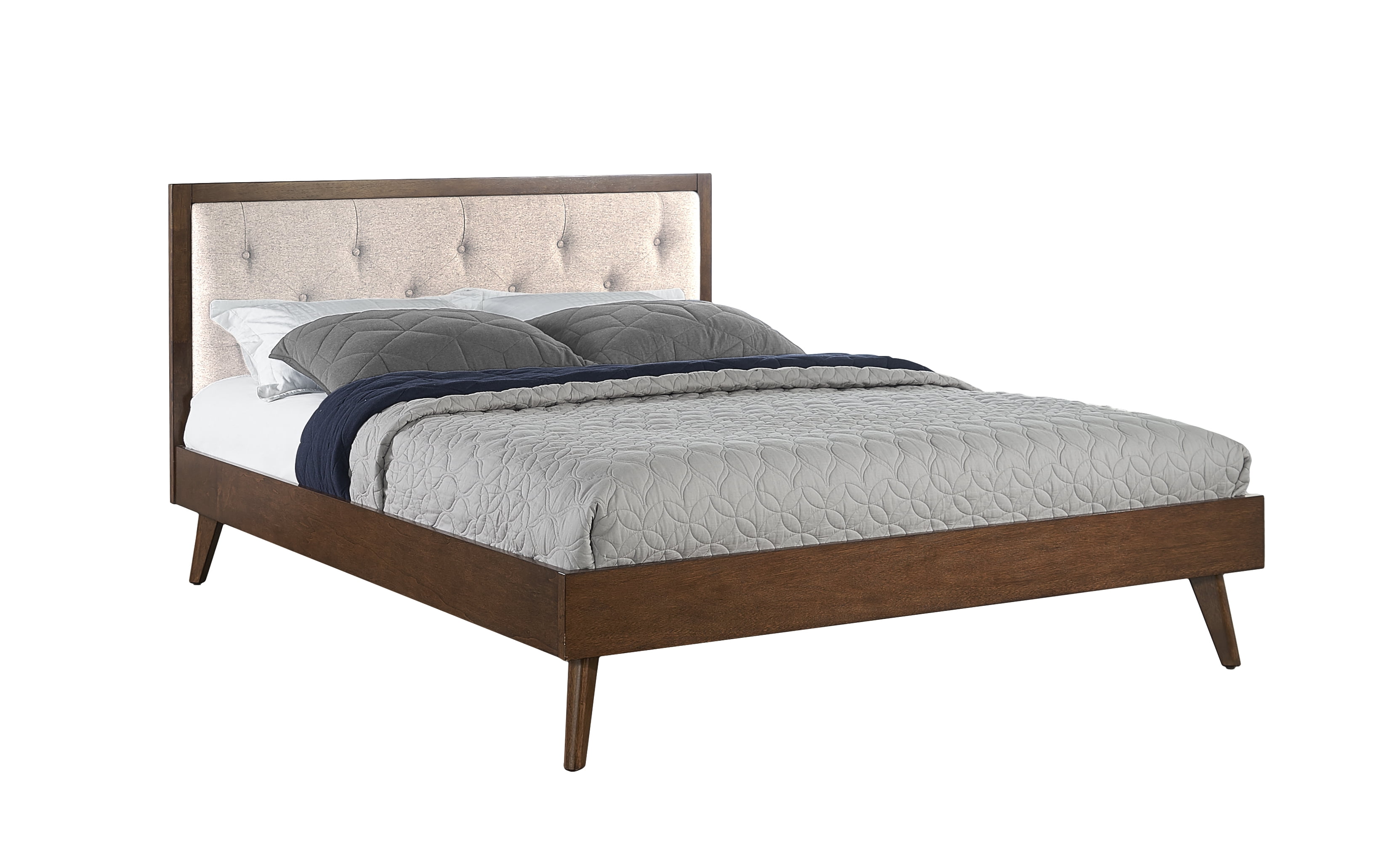 Mid-century modern design Ashwood veneer in a medium brown, walnut finish Button-tufted upholstered headboard 13 wood slats eliminate need for a box spring Accommodates either memory foam or spring mattresses with boxspring For Queen size mattresses Headboard: 62.75″ w x 2.25″ d x 40″ h, Footboard: 61″ w x 2.25″ d x 14″ h, Side Rails: 63″ w x 6″ d x 2″ h Fully Assembled Dims: 84.65″ l x 62.56″ w x 39.84″ h 128.06 lbs Ships in 2 boxes Assembly Required