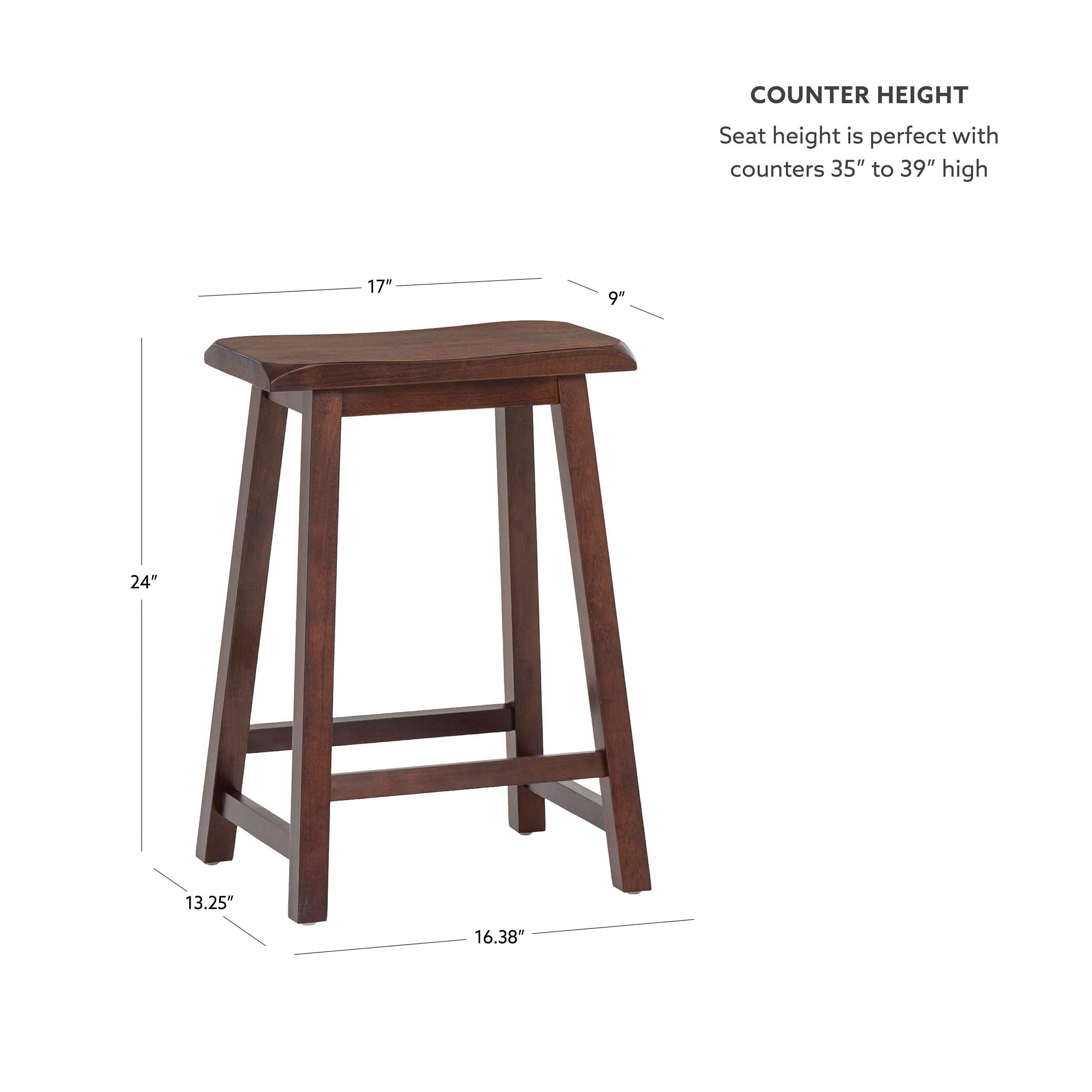 Seat Dimensions: 24″ Seat Height, 16.93″ x 9.06″ x 1.10″ Dark Brown Finish Sturdy and Durable Classic style and design Four footrails for stability Assembly Required Assembled Dimensions: 16.38″w x 13.25″d x 24″h Seat Height: 24″ Weight Capacity: 275 Lbs Ships in 1 box For indoor use only Condition: New