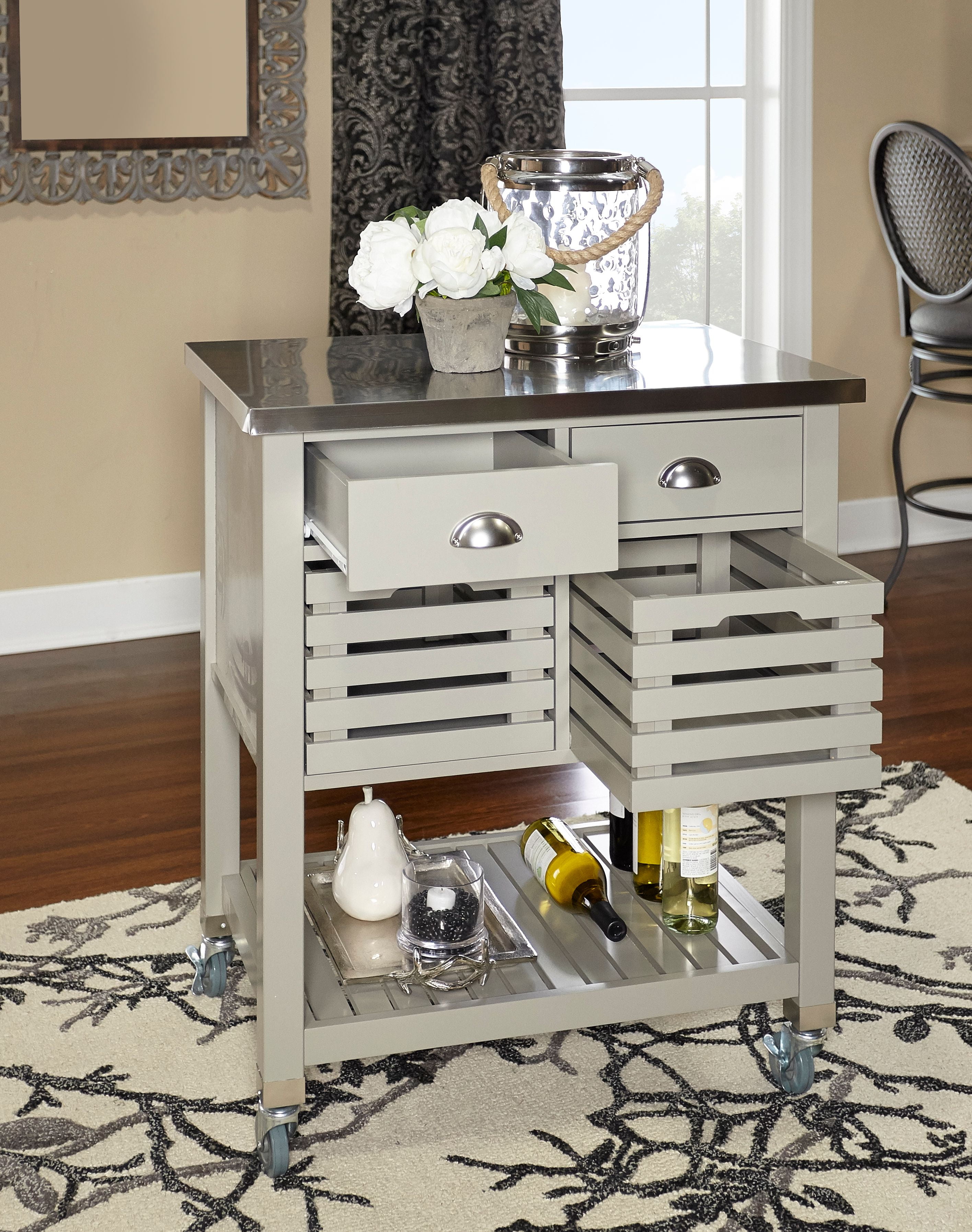 Linon Robbin Gray Wood Kitchen Cart: Castors provide for easy mobility Transitional design and style 2 drawers, 2 pull out baskets and a bottom shelf provide ample storage space Grey Finish Stainless Steel Top Pine Wood, Stainless Steel, MDF, PB Weight Limit: 275 lbs Dimensions: Shelf: 18.5″d x 23.75″w x 11″h ; Inner Drawer: 10″ x 14.625″ x 3″ ; Inner Basket: 11″ x 16″ x 9″, Counter Top: 30″w x 22″d x 1.25″thick ; 2.625″w Overhang on each side, Overall: 30″W x 22.05″D x 36.02″H Carton Dimensions: 24.41″w x 11.81″d x 34.65″h Some Assembly Required