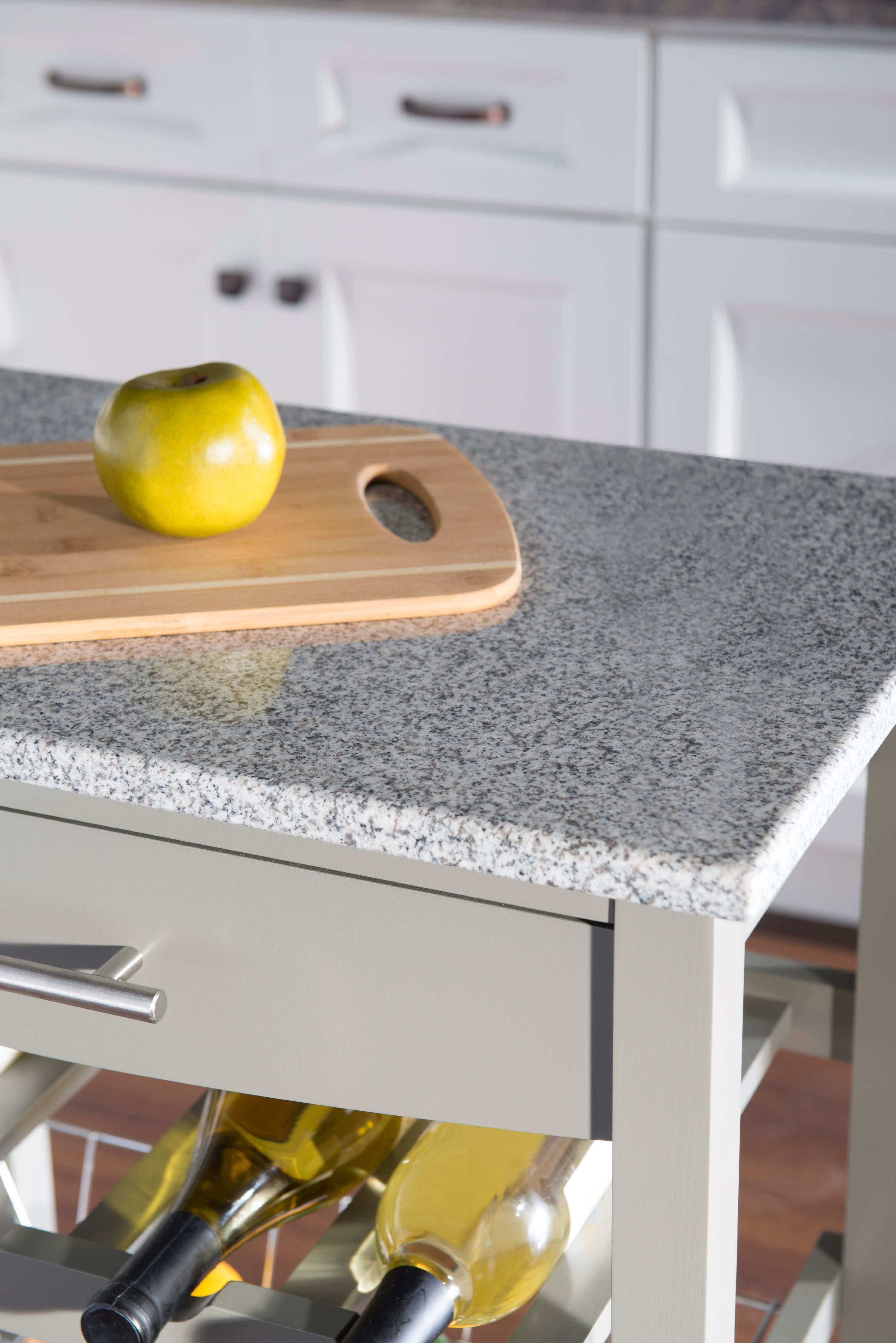Linon Roger Kitchen Island Granite Top, Gray, with Castors: Wine rack, front facing drawer, and basket for storage Durable, strong build for long lasting use. White and Grey Granite Top Gray Finish Silver Hardware Shelf Dimension: 20.75″ x 13.5″ ; Drawer Dimension: 17.38″ x 10.75″ Weight Limit: Top/Shelf Weight Limit: 150 lbs, Total Weight Limit: 300 lbs Materials: Pine Wood, Granite, Castors Dimensions: 22.83″w x 15.75″d x 33.86″h Carton Dimensions: 18.5″w x 8.86″d x 33.46″h Some Assembly Required Sku: KI090GRY01U
