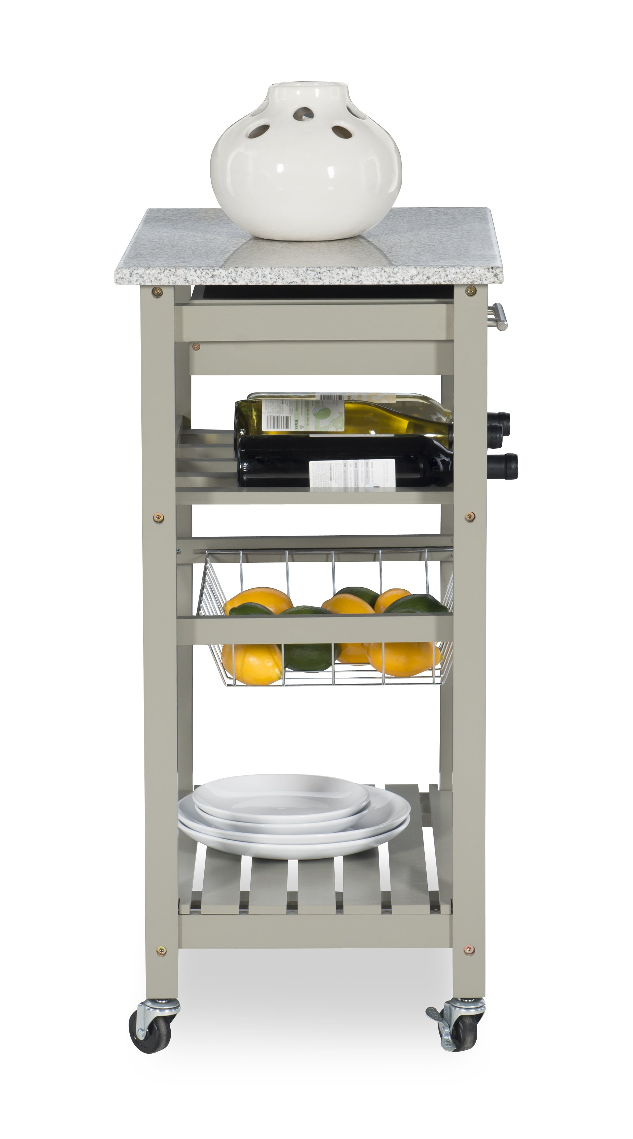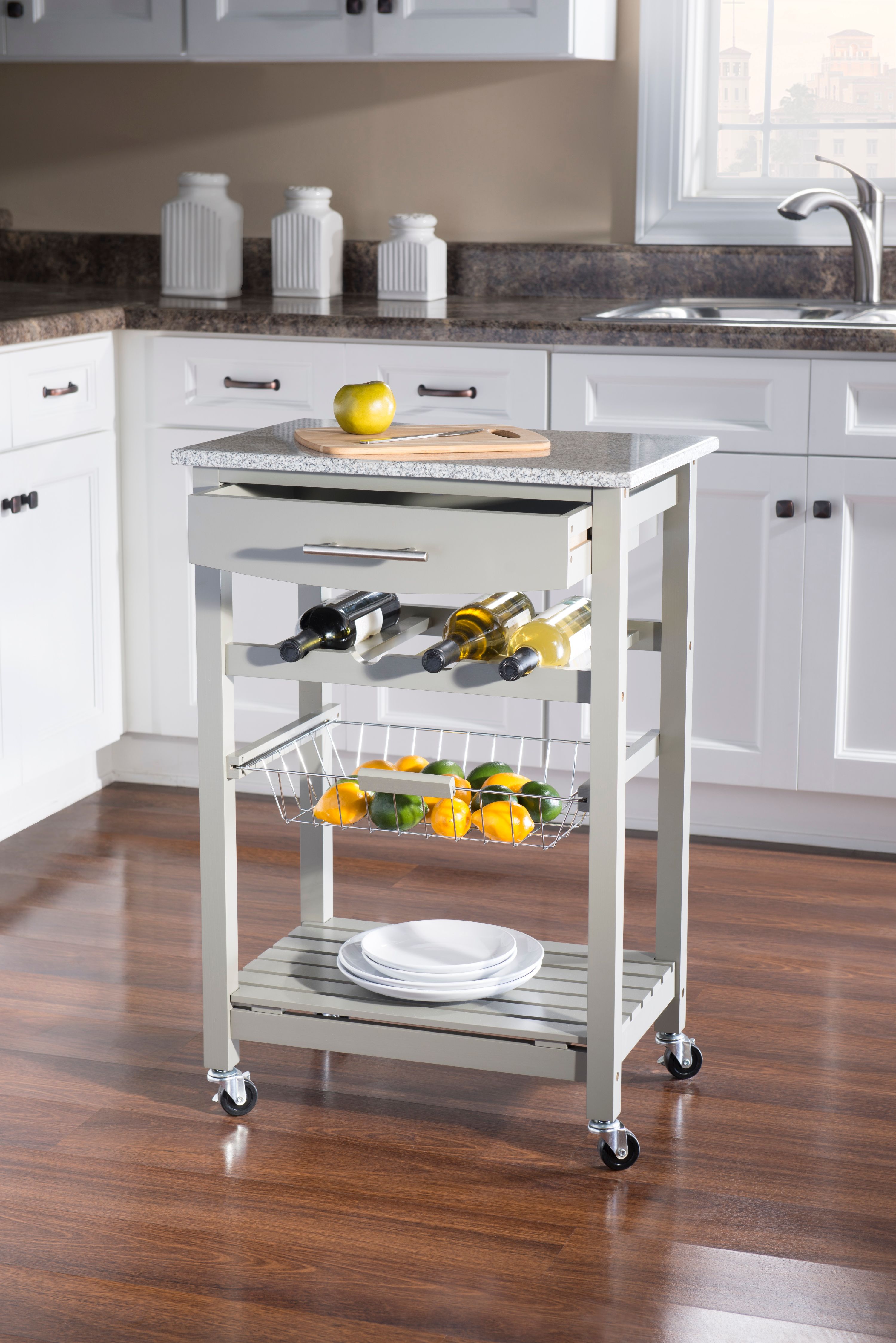 Add much needed storage and prep space to your kitchen with this lovely kitchen cart. The attached wheels make this piece easily mobile, while the wire basket and drawer provide extra storage that every cook needs. The neutral gray finish and durable granite counter top blend wonderfully into any kitchen and give you the space you need for preparation to entertain guests.