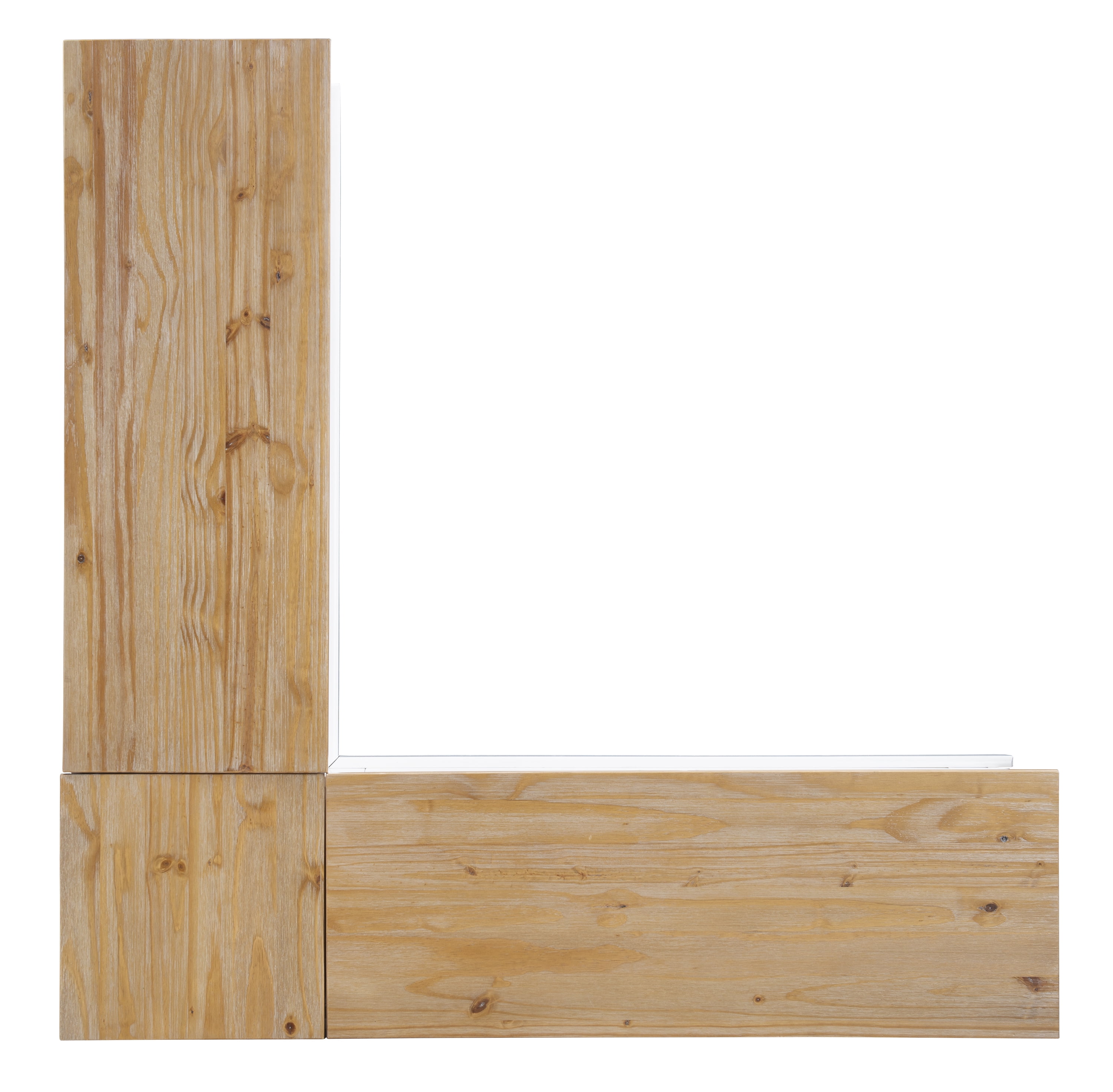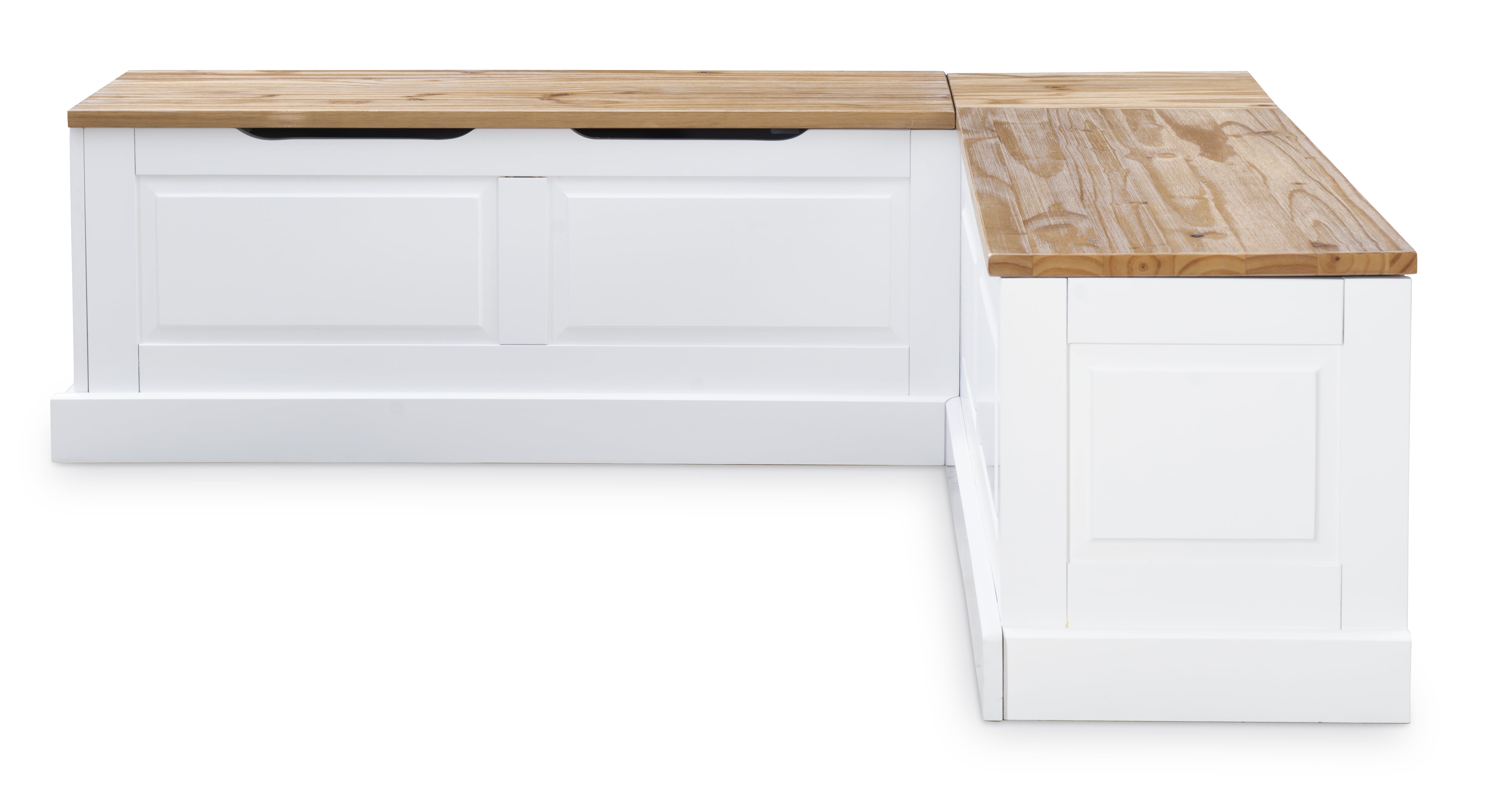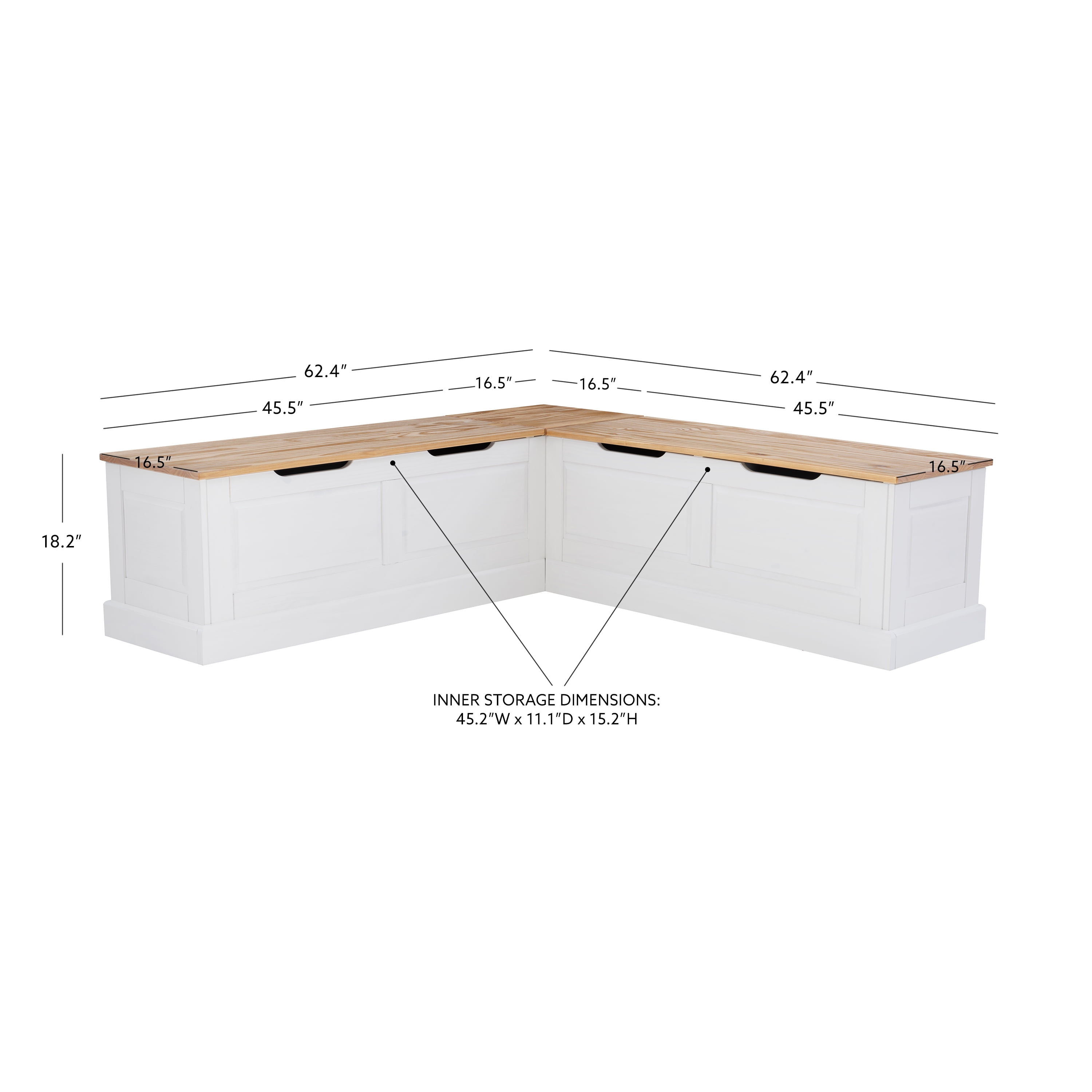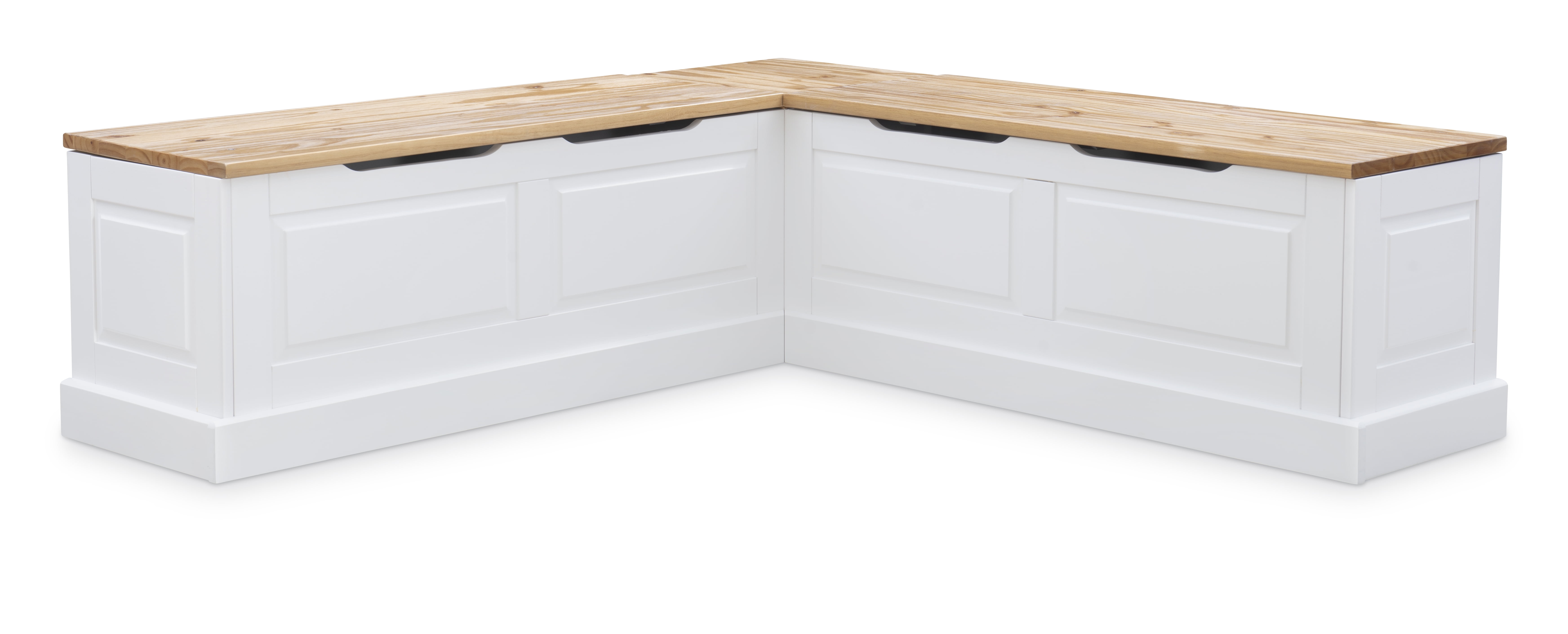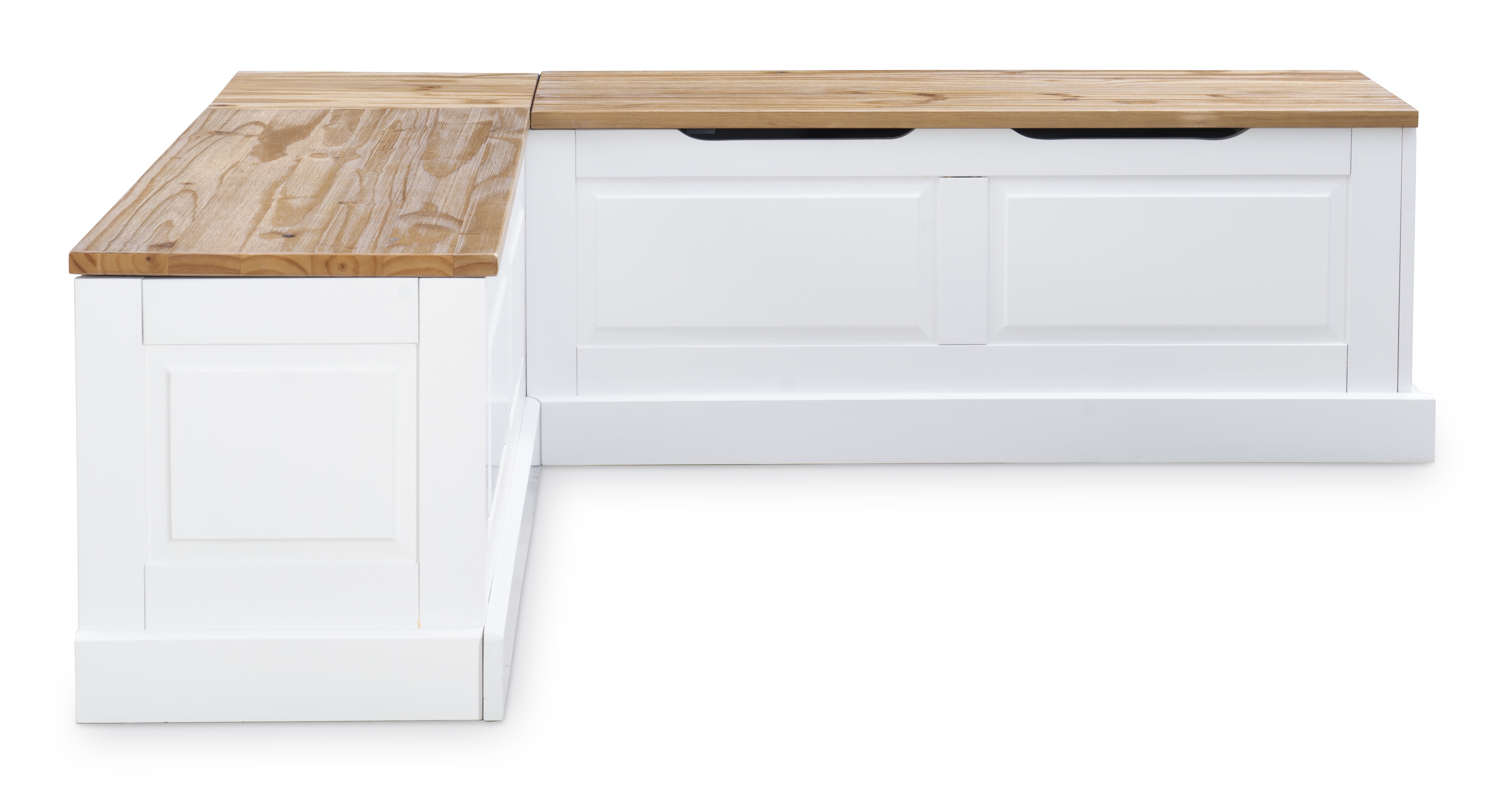 Durable Solid Pine Build: Constructed from solid pine wood for superior strength, natural beauty, and long-lasting performance in high-traffic dining areas Rich Natural Finish with UV Protection: Natural-stained seat tops with a UV-protective varnish enhance wood grain while helping prevent fading, scratches, and daily damage Space-Saving Backless Design: L-shaped, low-profile design fits snugly into corners or beneath windows, making it a perfect solution for small kitchens and breakfast nooks Concealed Storage Compartments: Lift-top bench seats with soft-close hinges reveal hidden storage space—ideal for keeping tableware, placemats, or extra blankets within reach Bold White Painted Base: A striking white base with subtle panel detailing offers clean contrast and works seamlessly with farmhouse, cottage, and transitional interiors Generous Seating Dimensions: Each side of the nook measures over 62″ long with 16.5″ depth and 18.2″ height, providing ample, comfortable seating for multiple guests