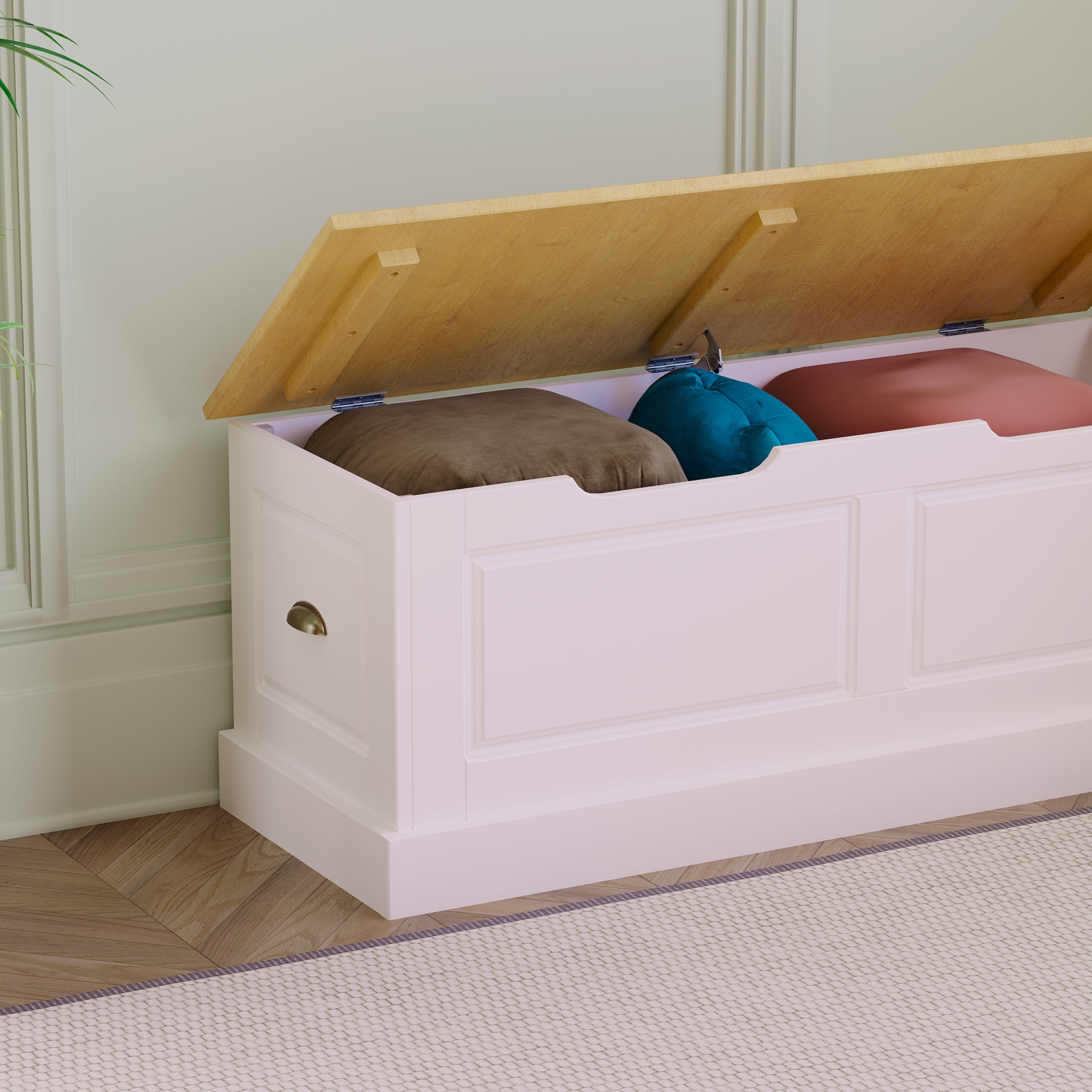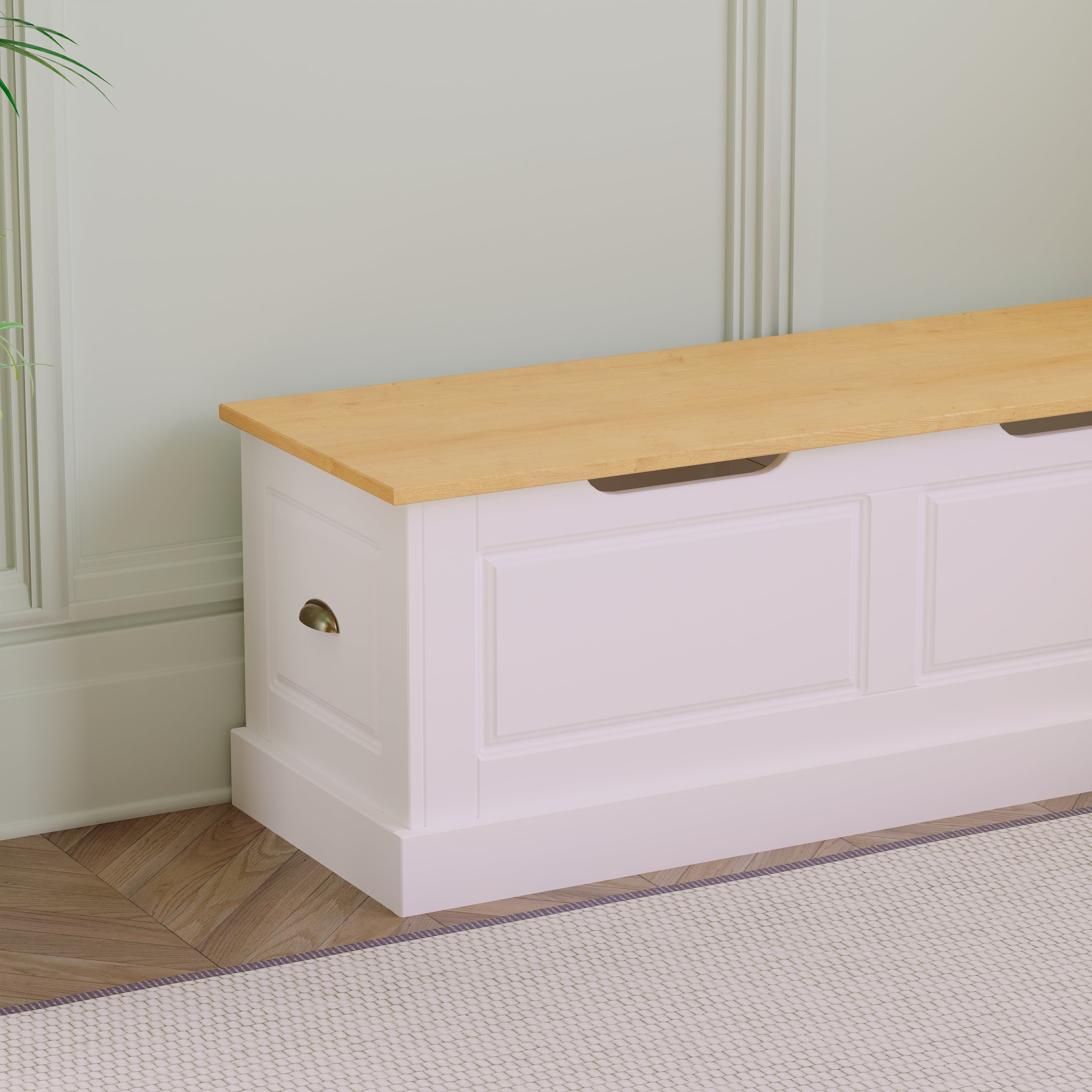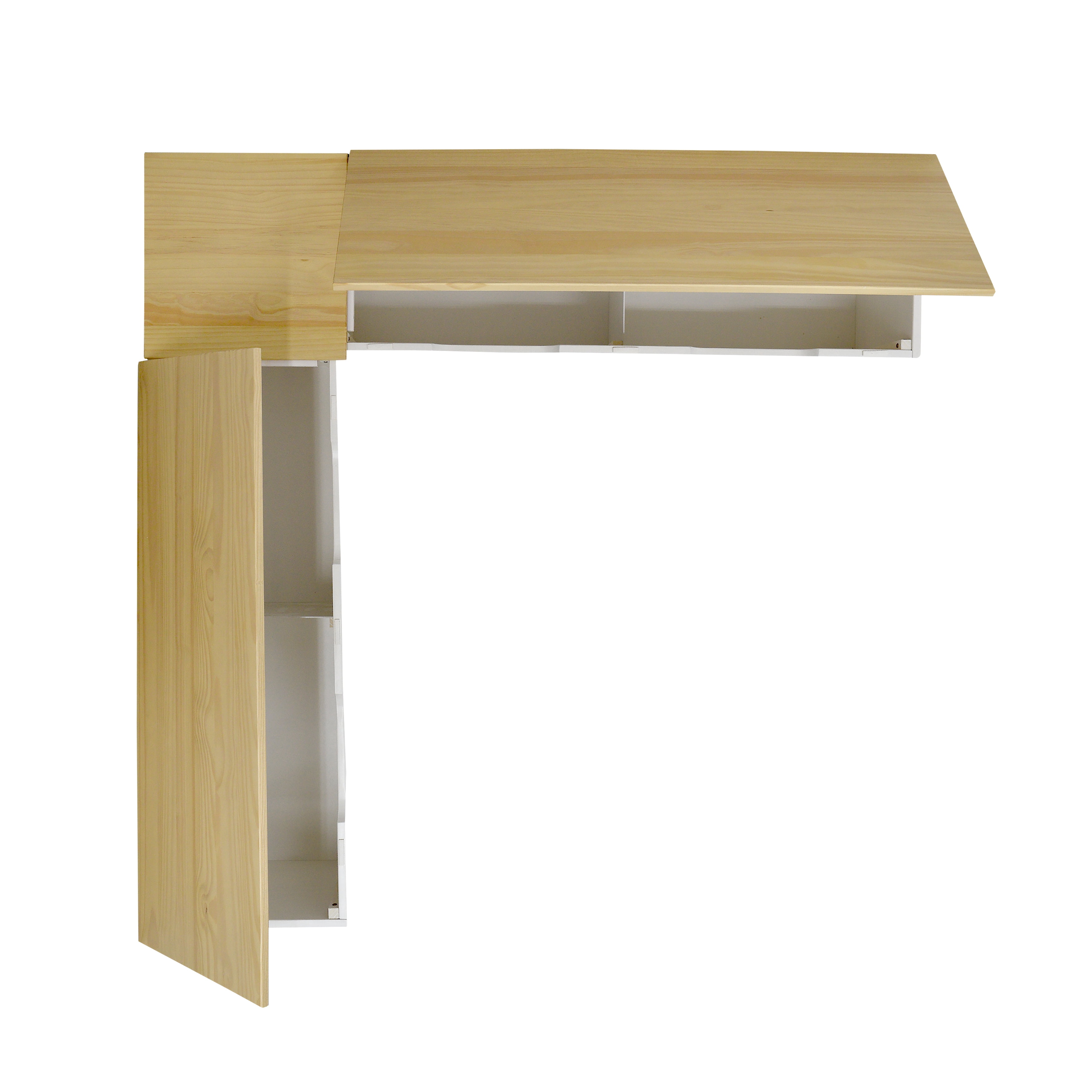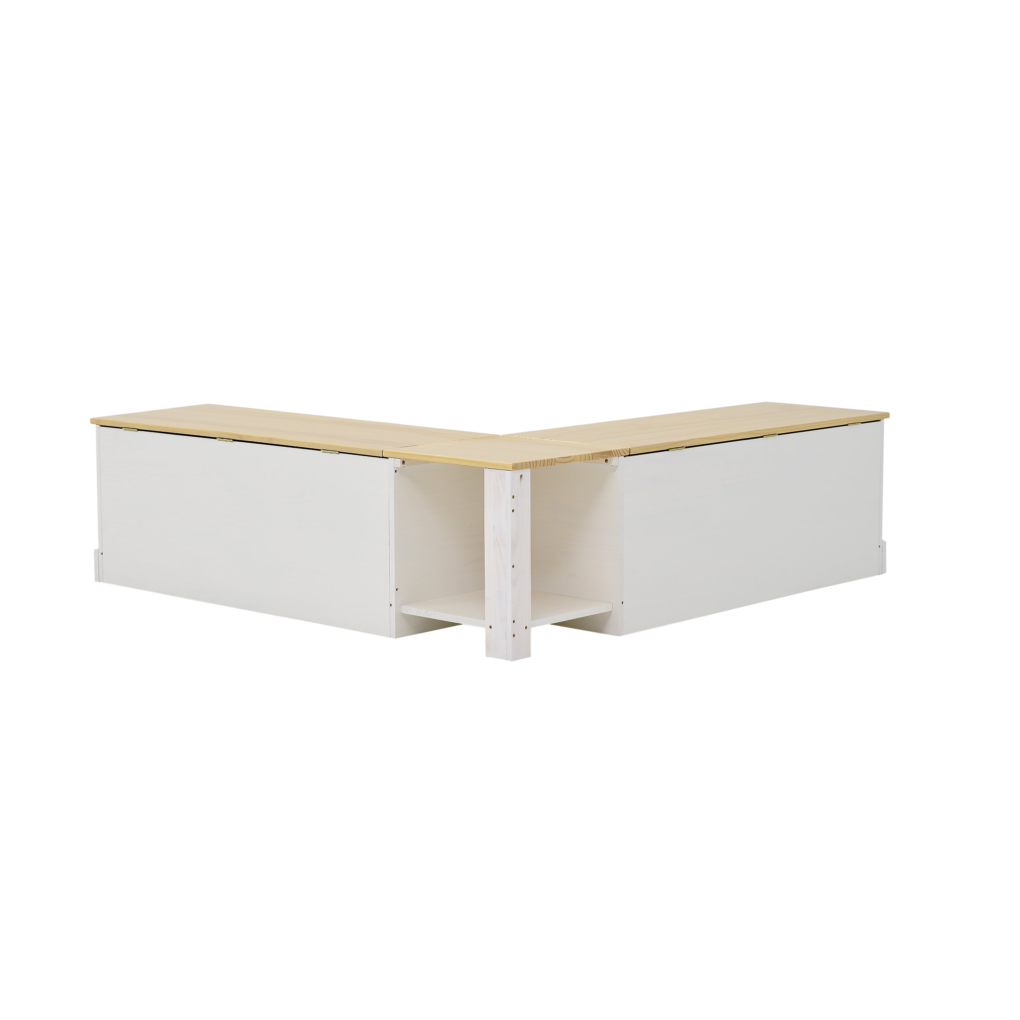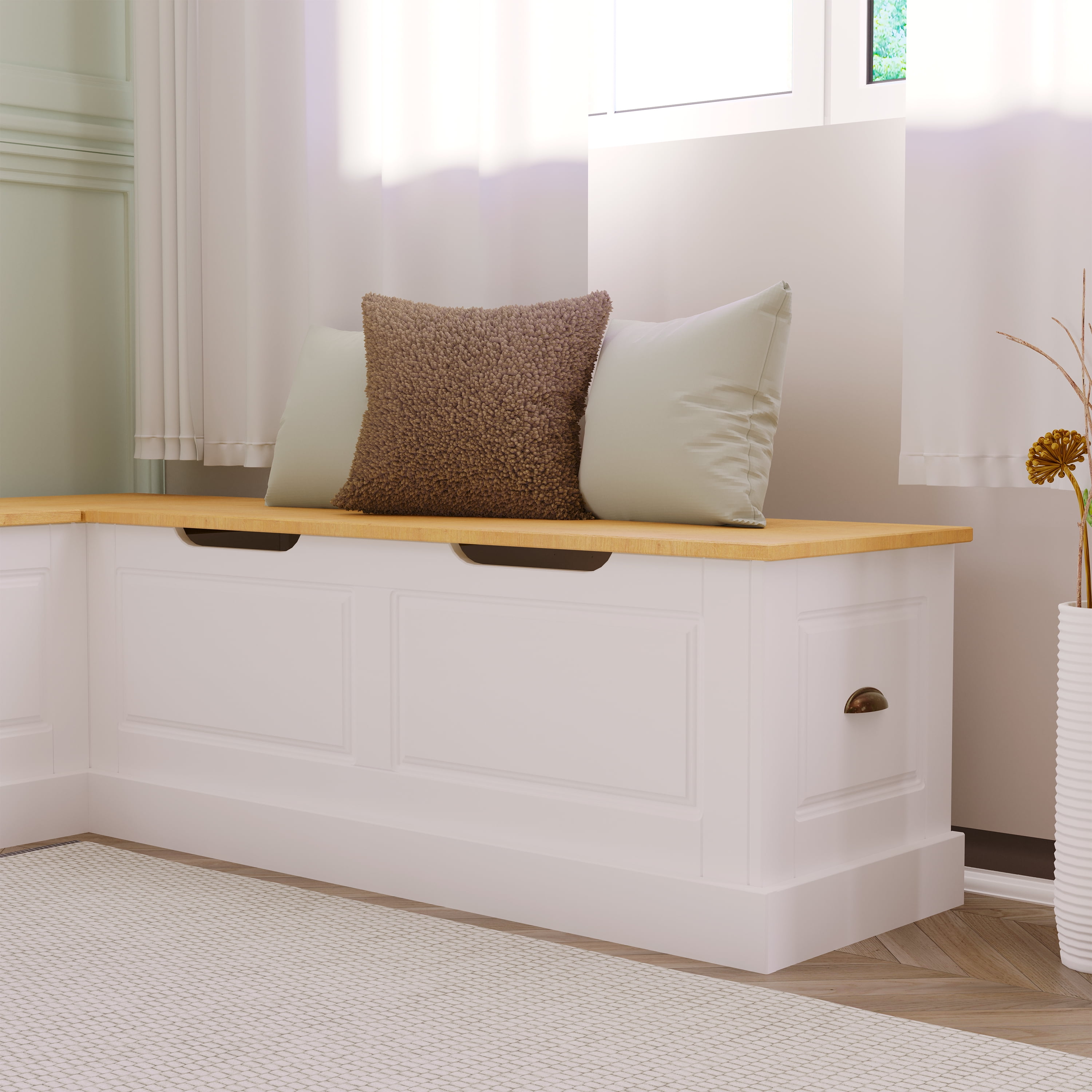 Durable Solid Pine Build: Constructed from solid pine wood for superior strength, natural beauty, and long-lasting performance in high-traffic dining areas Rich Natural Finish with UV Protection: Natural-stained seat tops with a UV-protective varnish enhance wood grain while helping prevent fading, scratches, and daily damage Space-Saving Backless Design: L-shaped, low-profile design fits snugly into corners or beneath windows, making it a perfect solution for small kitchens and breakfast nooks Concealed Storage Compartments: Lift-top bench seats with soft-close hinges reveal hidden storage space—ideal for keeping tableware, placemats, or extra blankets within reach Bold White Painted Base: A striking white base with subtle panel detailing offers clean contrast and works seamlessly with farmhouse, cottage, and transitional interiors Generous Seating Dimensions: Each side of the nook measures over 62″ long with 16.5″ depth and 18.2″ height, providing ample, comfortable seating for multiple guests