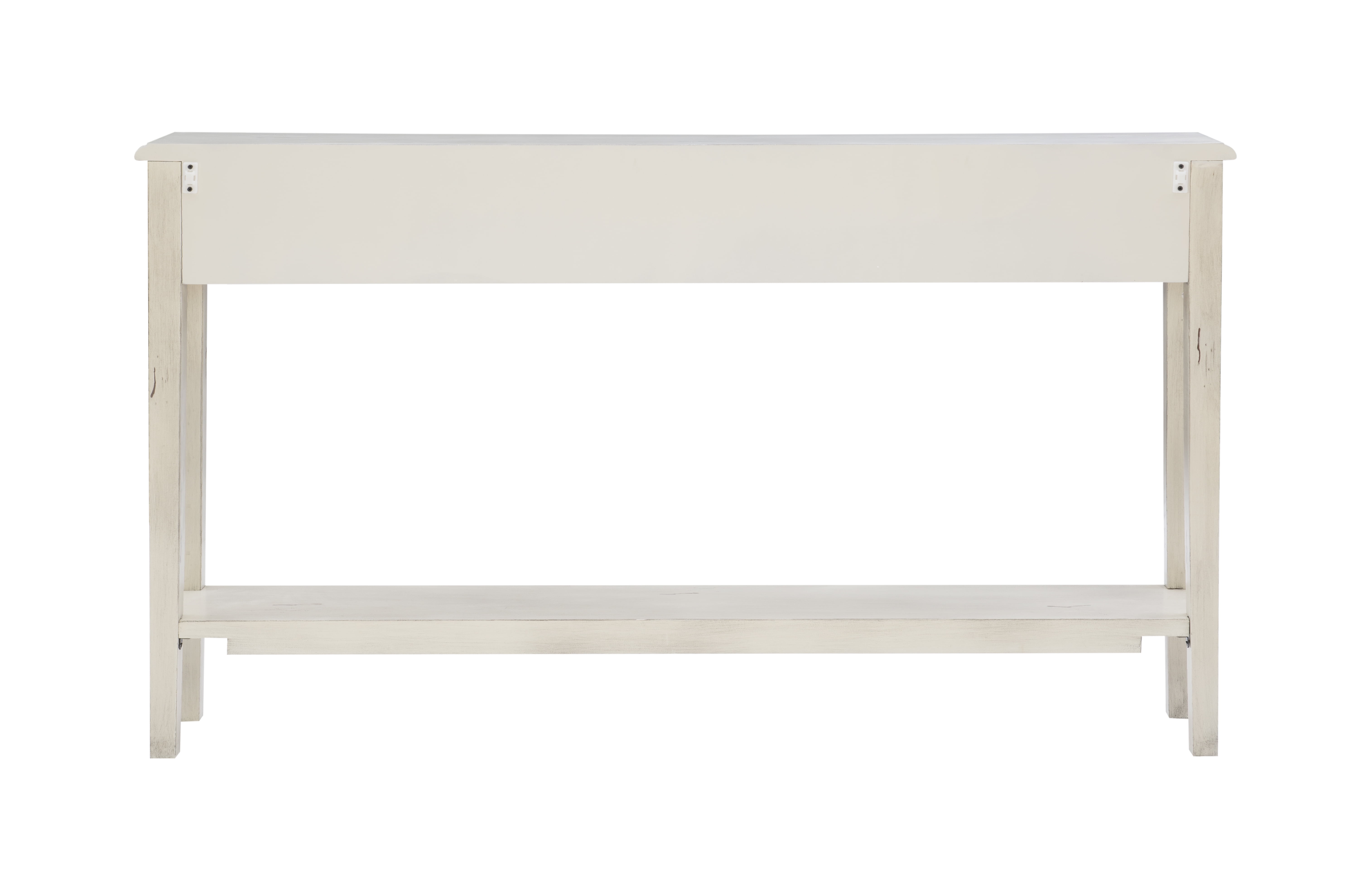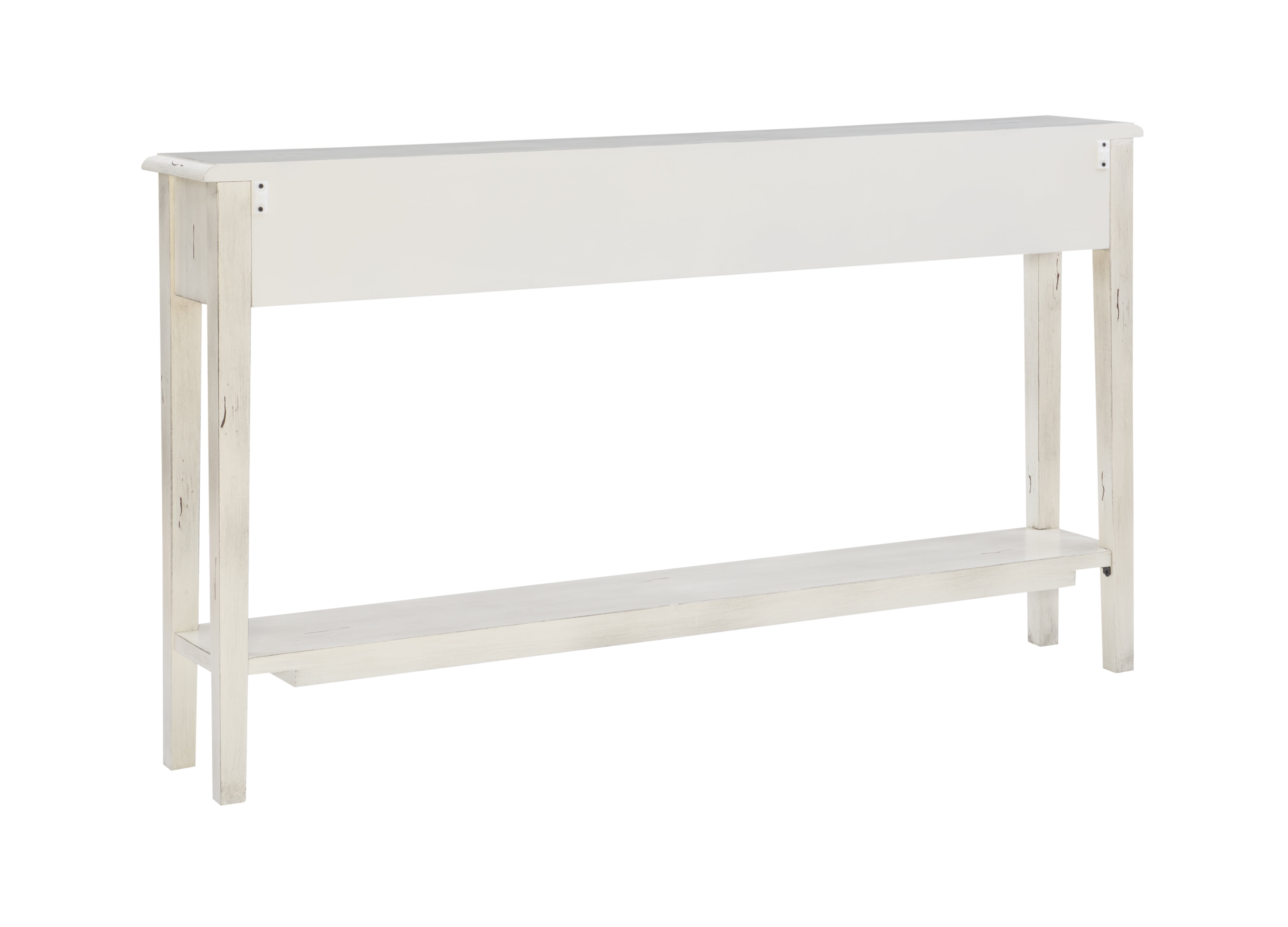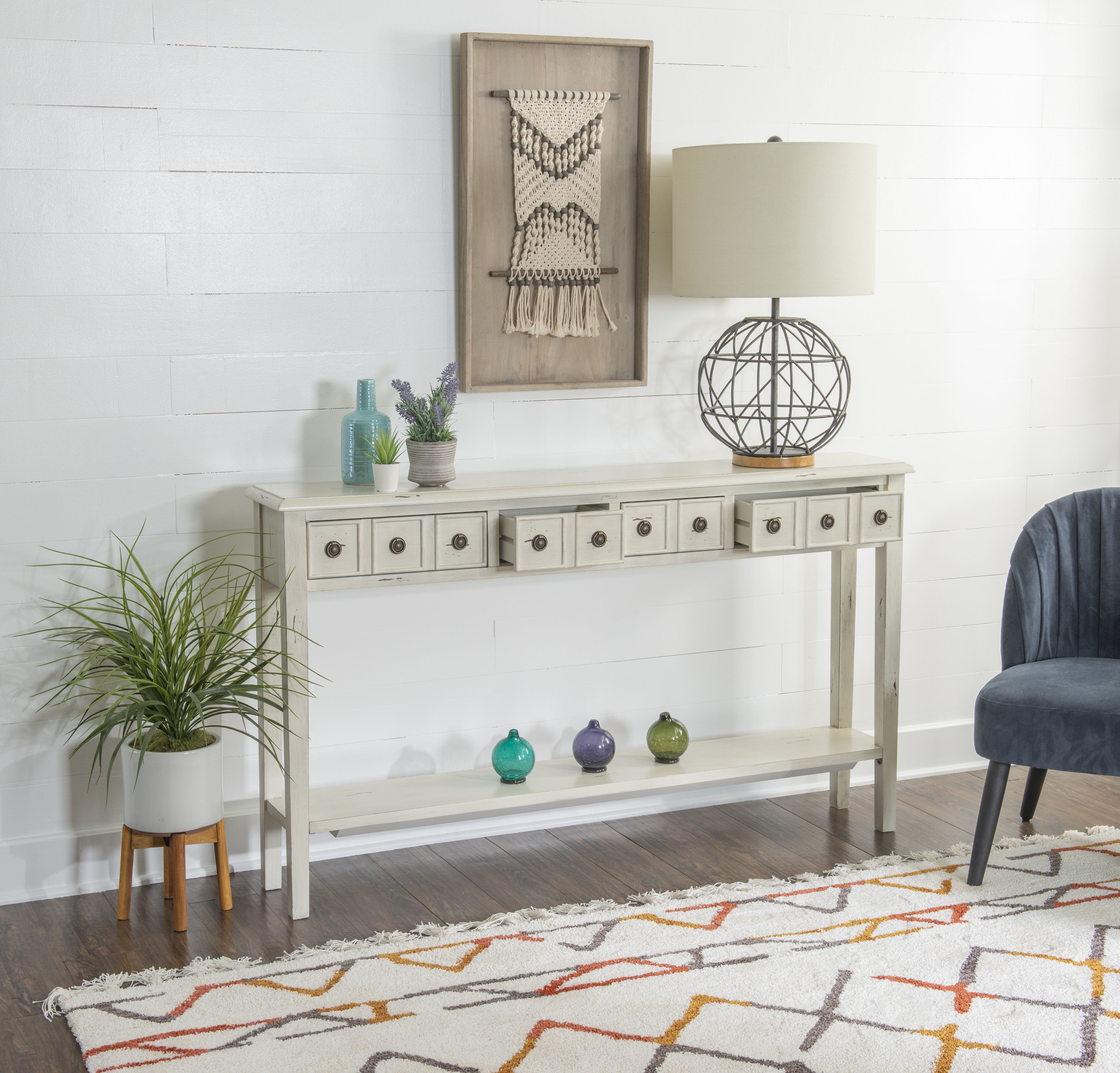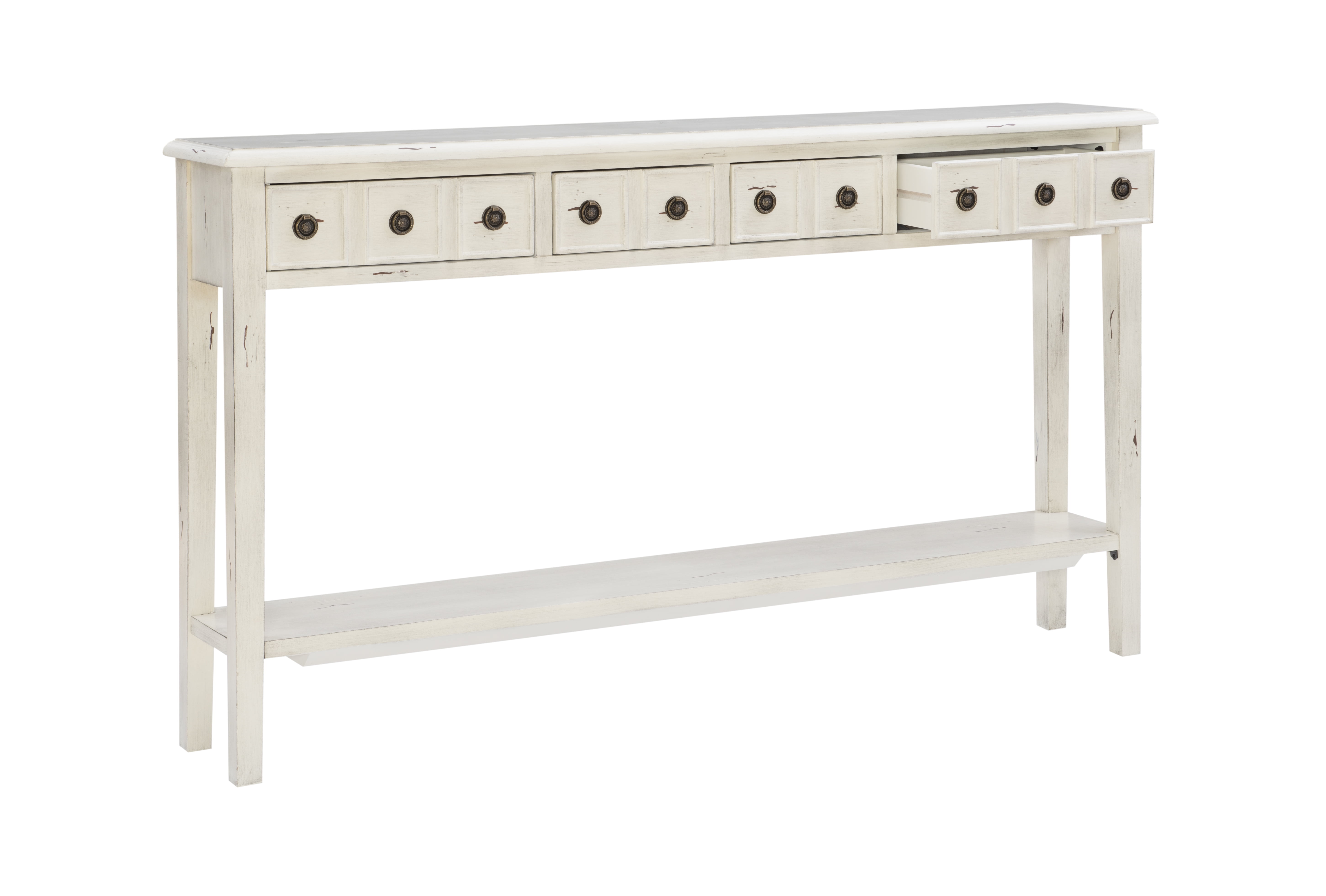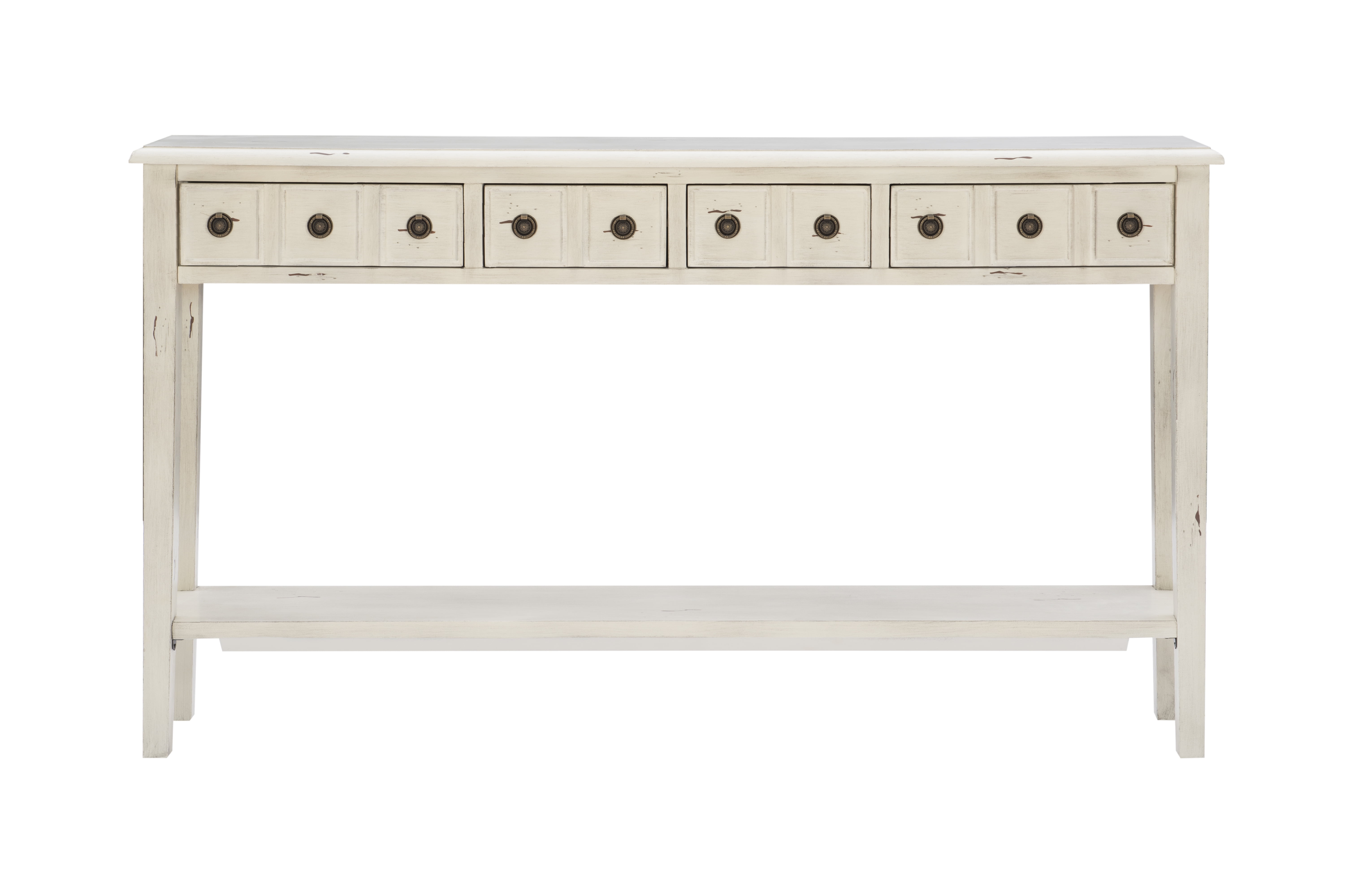 Designed with smaller spaces in mind, this slim line console serves as a stylish accent in your foyer or living room. The slender silhouette is equipped with four drawers to easily store small essentials, while a bottom shelf is perfectly sized to show off your favorite books or greenery. Round metal drawer pulls and four tapered legs add a distinctive touch to this cottage-inspired look. This item is finished with a distressed cream hue for a welcoming feel. Some assembly required. Features: Crafted from MDF and Birch Wood Distressed Cream Finish Round antique brass pulls Four drawers for closed storage Lower shelf for open storage Slimline design Specifications: Assembly Required: Some Assembly Required Product Dimensions: 60″w x 10″d x 35″h Product Weight: 75.41 lbs Weight Capacity: Top: 100 lbs, Shelf: 50 lbs Leg Dimensions: 5.5″H Drawer Dimensions: 13.75″ x 7.5″ x 3.25″, 8.63″ x 7.5″ x 3.25″