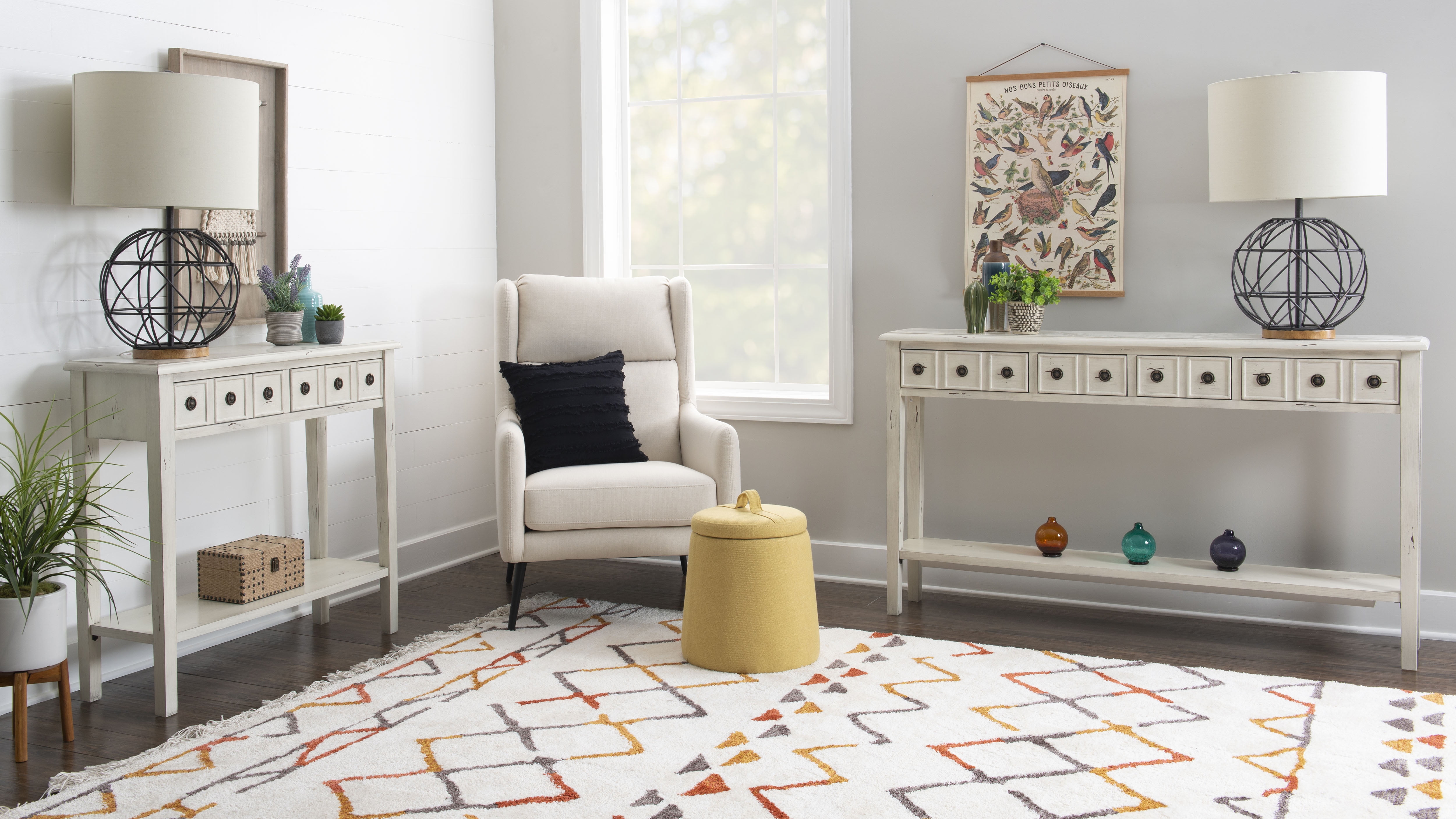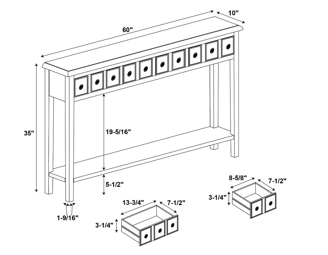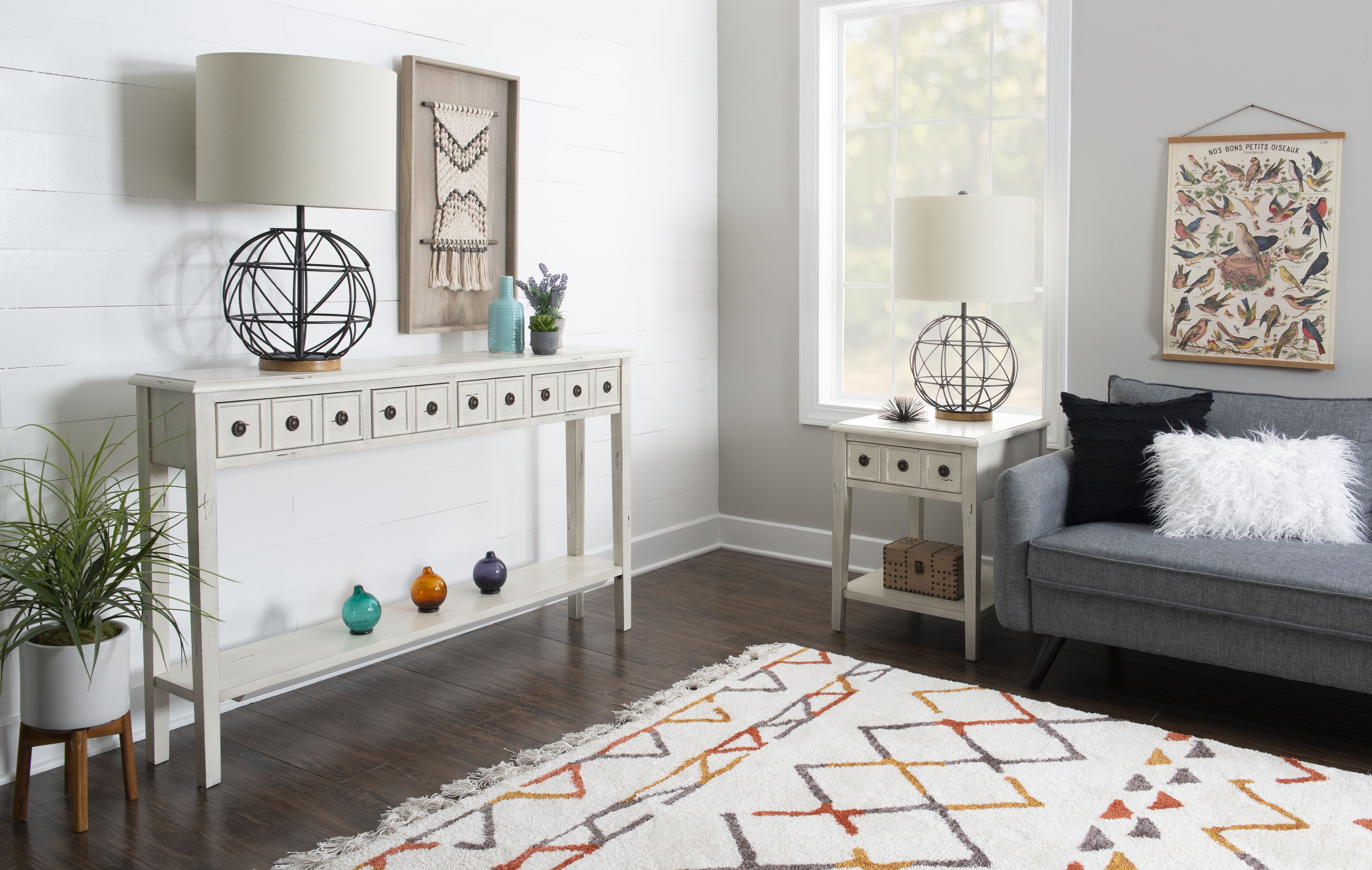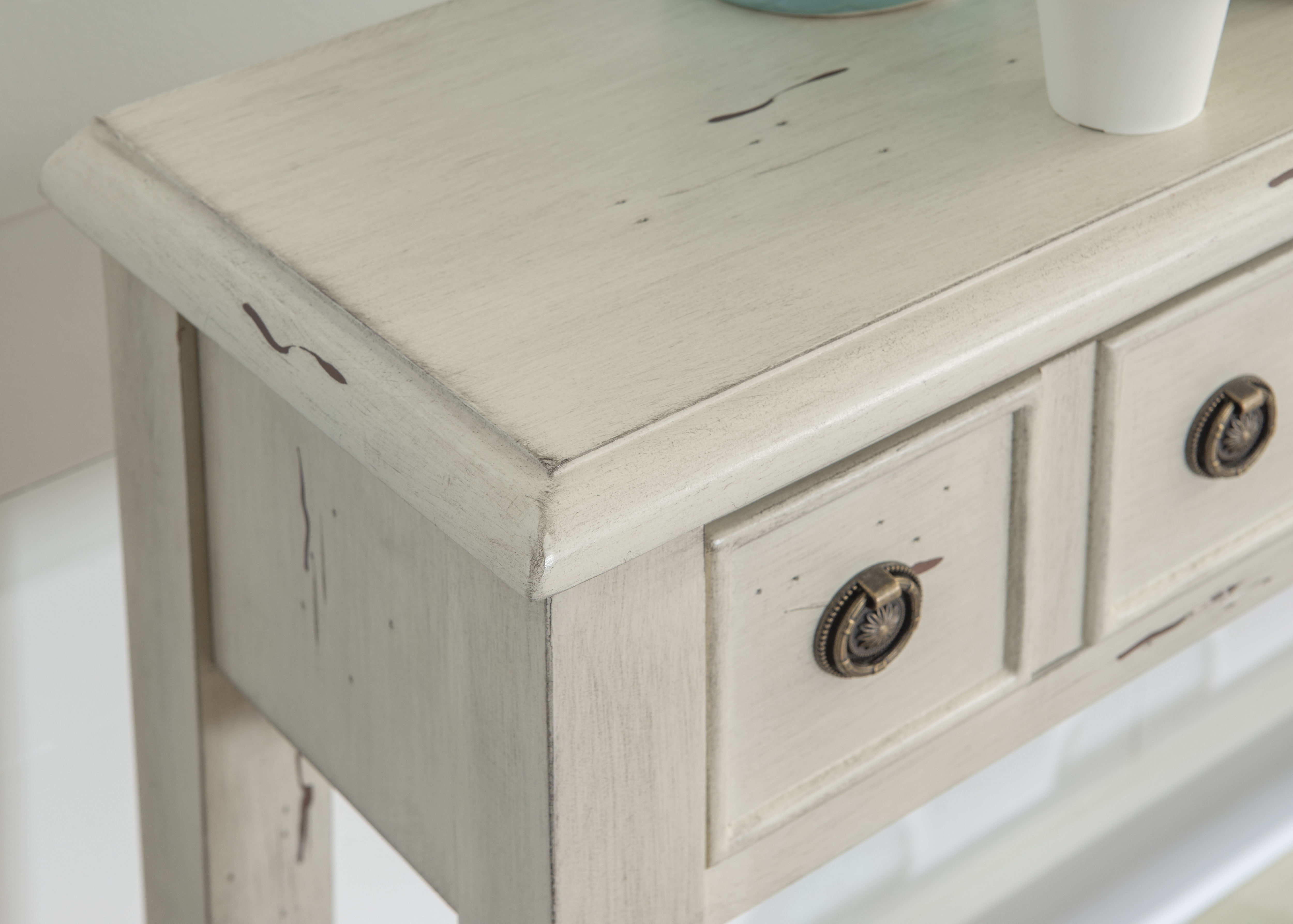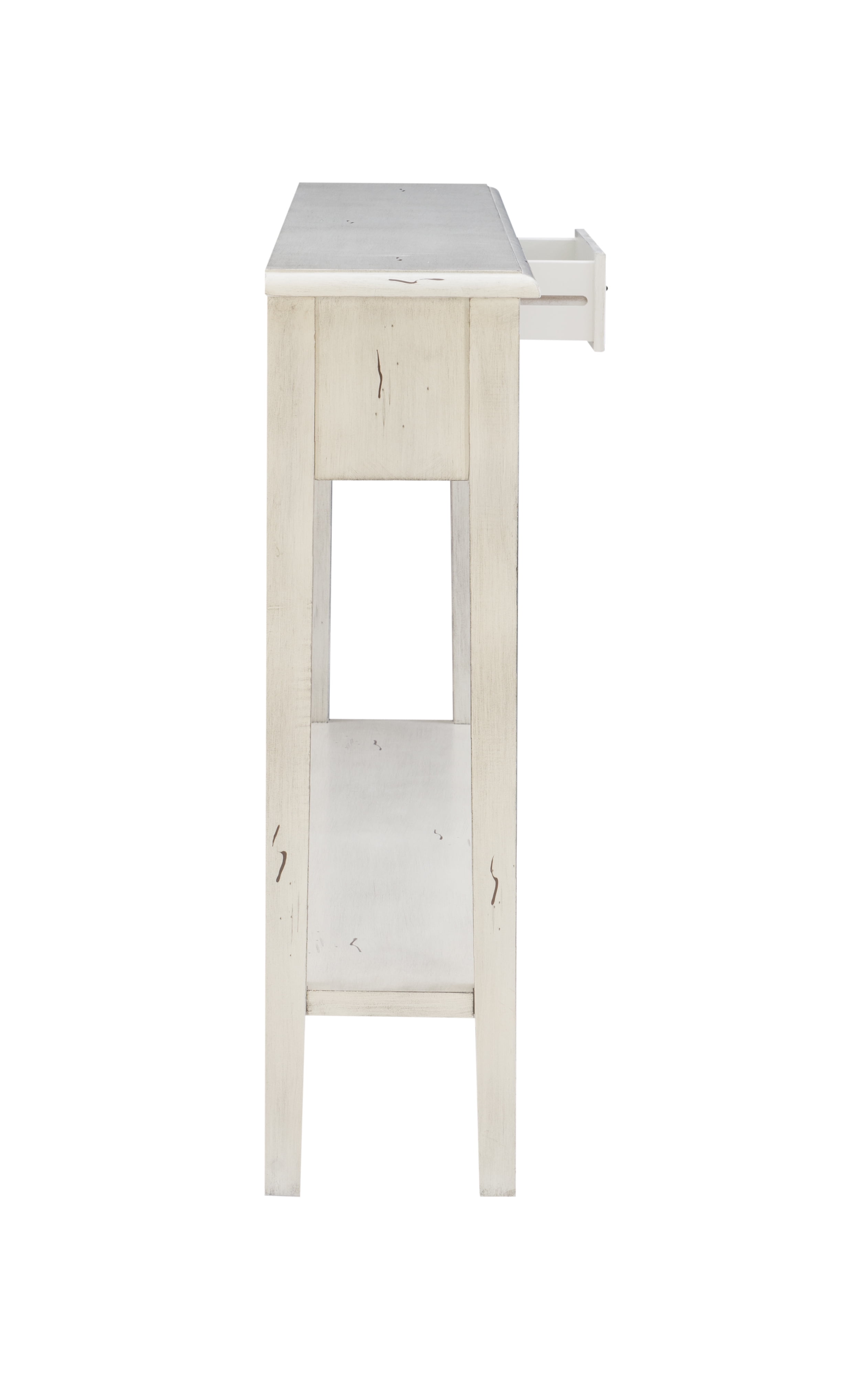 Designed with smaller spaces in mind, this slim line console serves as a stylish accent in your foyer or living room. The slender silhouette is equipped with four drawers to easily store small essentials, while a bottom shelf is perfectly sized to show off your favorite books or greenery. Round metal drawer pulls and four tapered legs add a distinctive touch to this cottage-inspired look. This item is finished with a distressed cream hue for a welcoming feel. Some assembly required. Features: Crafted from MDF and Birch Wood Distressed Cream Finish Round antique brass pulls Four drawers for closed storage Lower shelf for open storage Slimline design Specifications: Assembly Required: Some Assembly Required Product Dimensions: 60″w x 10″d x 35″h Product Weight: 75.41 lbs Weight Capacity: Top: 100 lbs, Shelf: 50 lbs Leg Dimensions: 5.5″H Drawer Dimensions: 13.75″ x 7.5″ x 3.25″, 8.63″ x 7.5″ x 3.25″