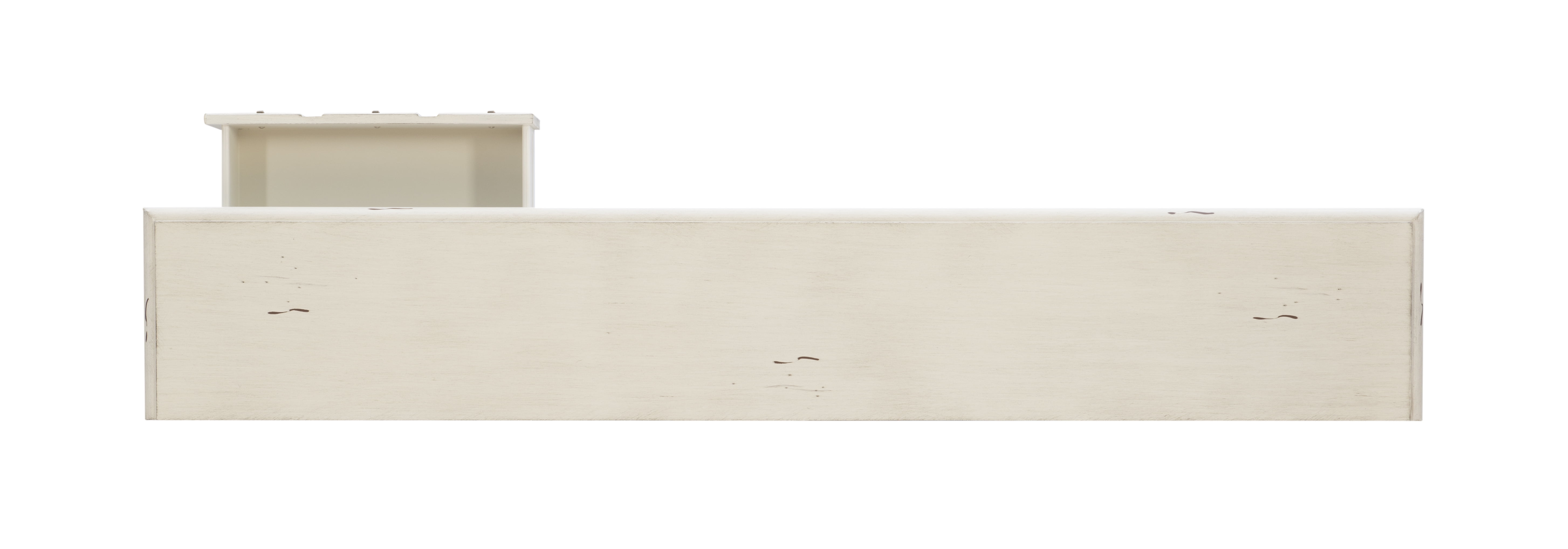 Crafted from MDF and Birch Wood Distressed Cream Finish Round antique brass pulls Four drawers for closed storage Lower shelf for open storage Slimline design