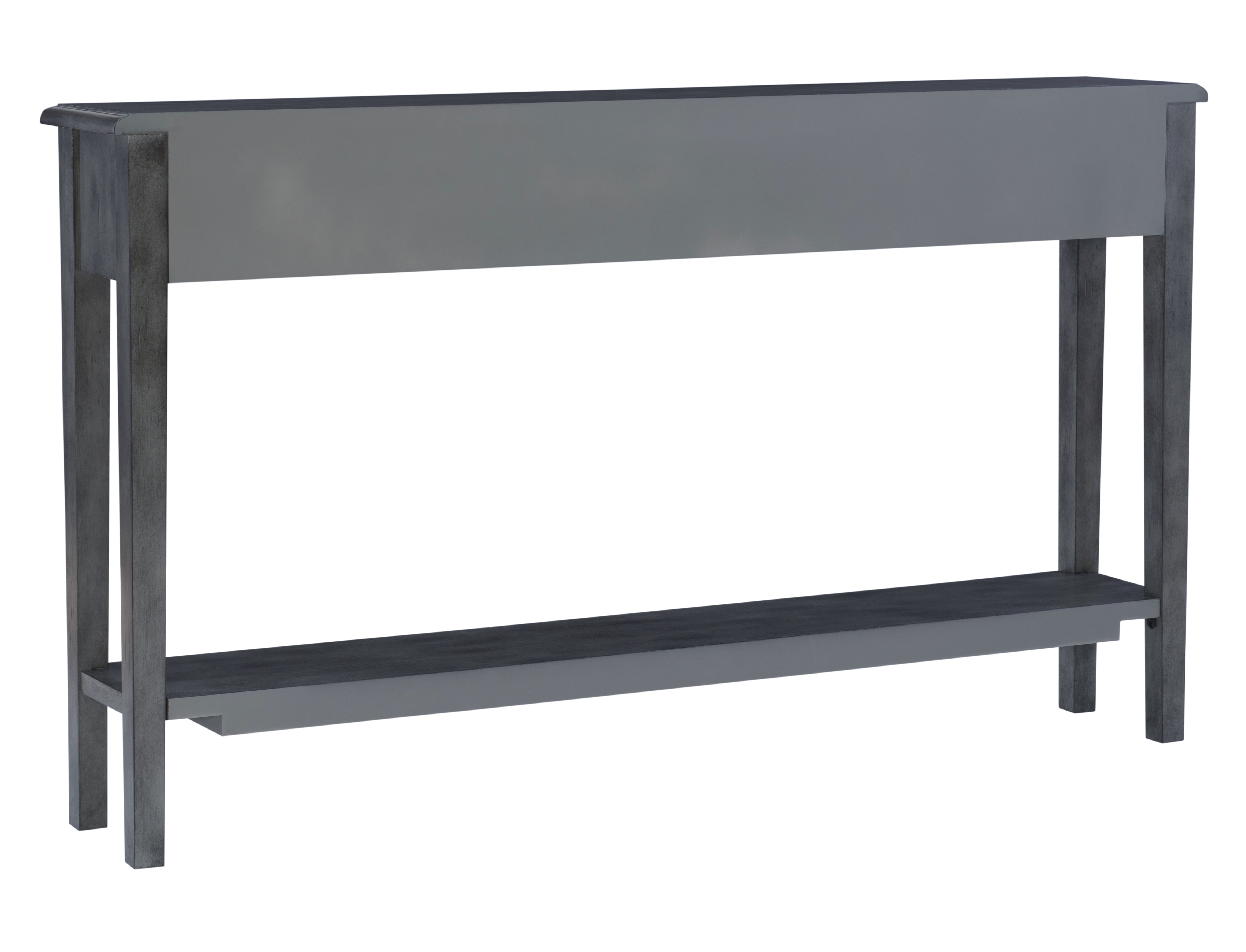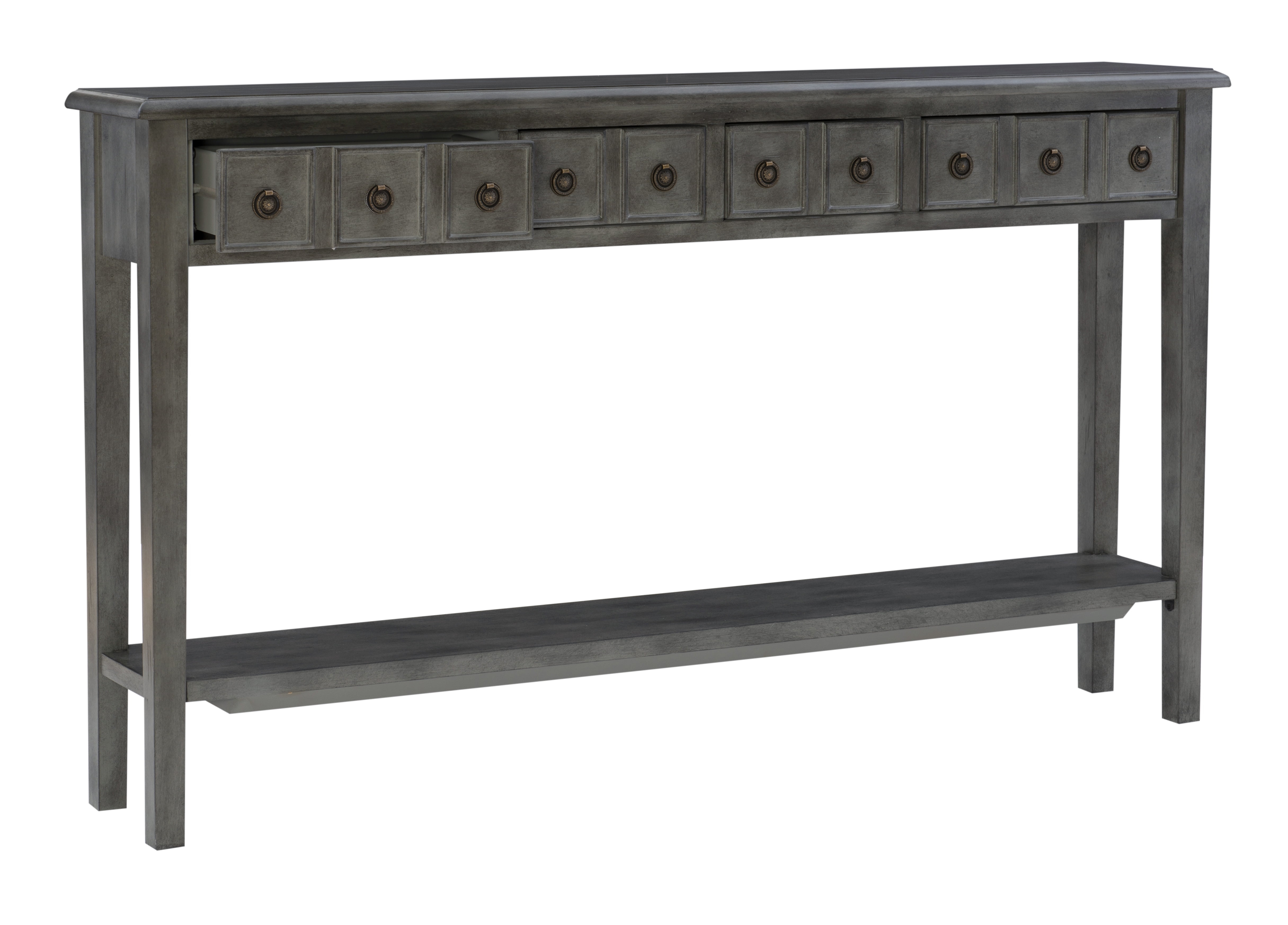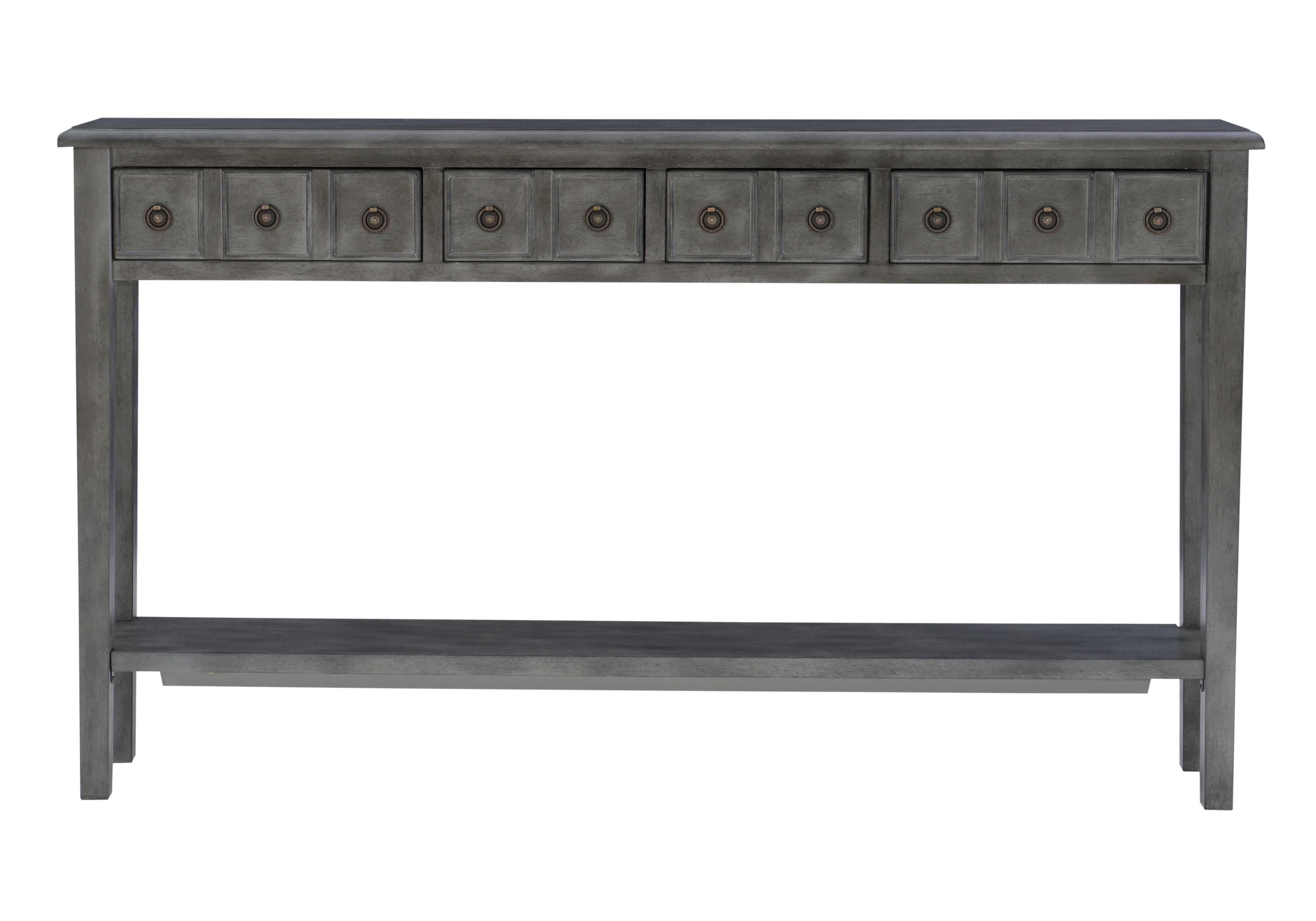 Designed with smaller spaces in mind, this slim line console serves as a stylish accent in your foyer or living room. The slender silhouette is equipped with four drawers to easily store small essentials, while a bottom shelf is perfectly sized to show off your favorite books or greenery. Round metal drawer pulls and four tapered legs add a distinctive touch to this cottage-inspired look. This item is finished with a distressed grey hue for a welcoming feel. Some assembly required. Features: Crafted from MDF and Birch Wood Distressed Gray Finish Round antique brass pulls Four drawers for closed storage Lower shelf for open storage Slimline design Specifications: Assembly Required: Some Assembly Required Product Dimensions: 60″w x 10″d x 35″h Product Weight: 75.41 lbs Weight Capacity: Top: 100 lbs, Shelf: 50 lbs Leg Dimensions: 5.5″H Drawer Dimensions: 13.75″ x 7.5″ x 3.25″, 8.63″ x 7.5″ x 3.25″