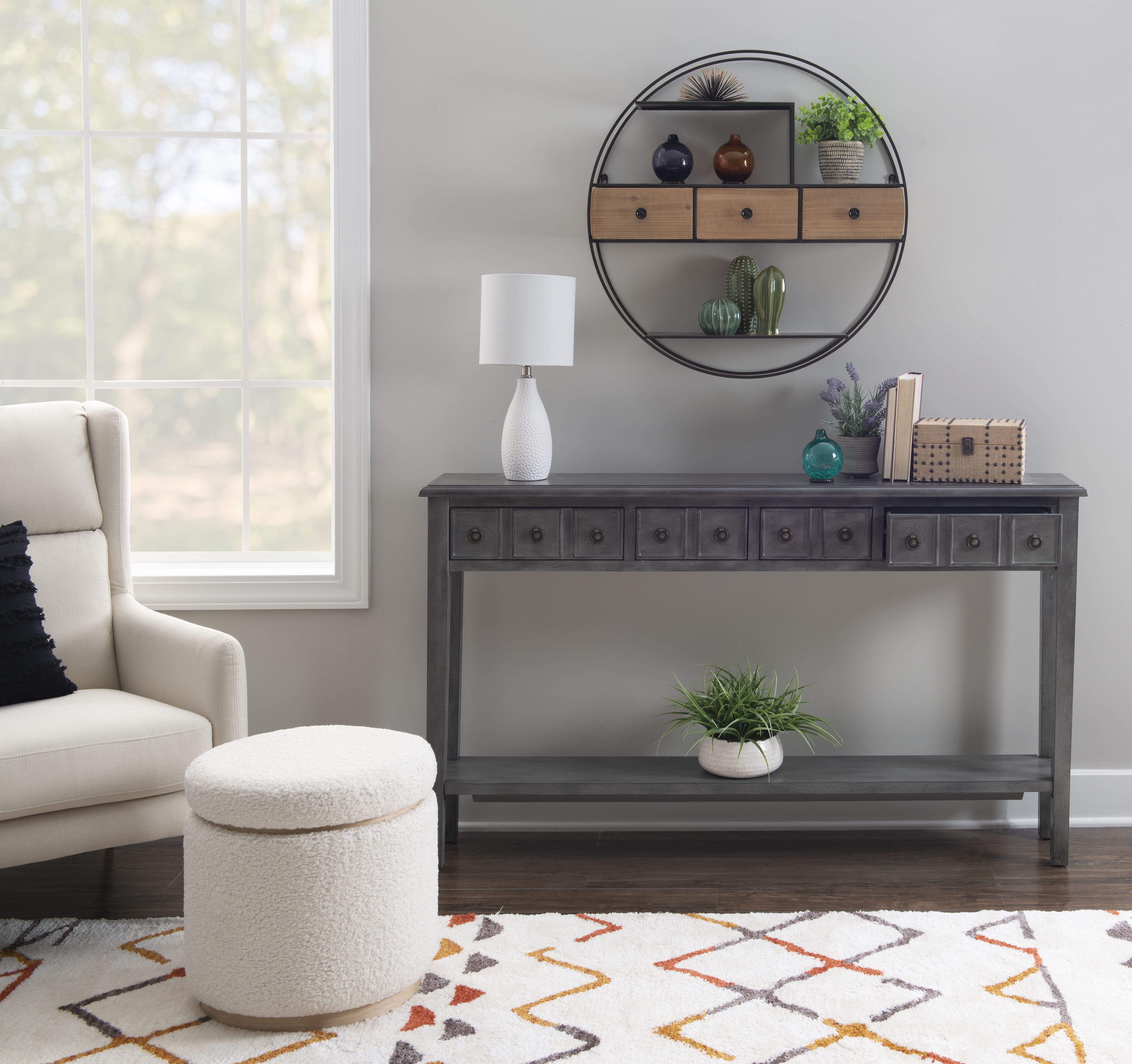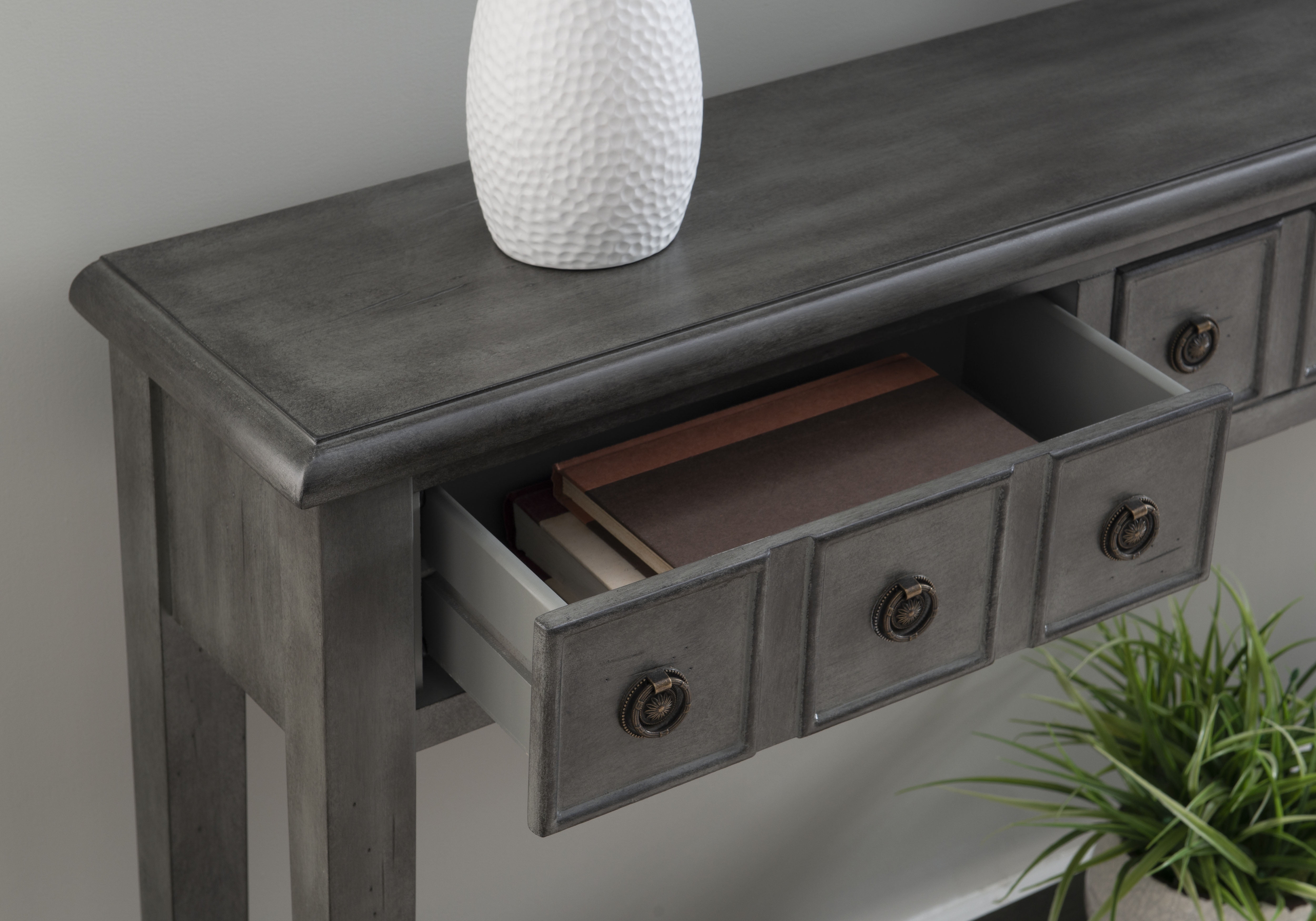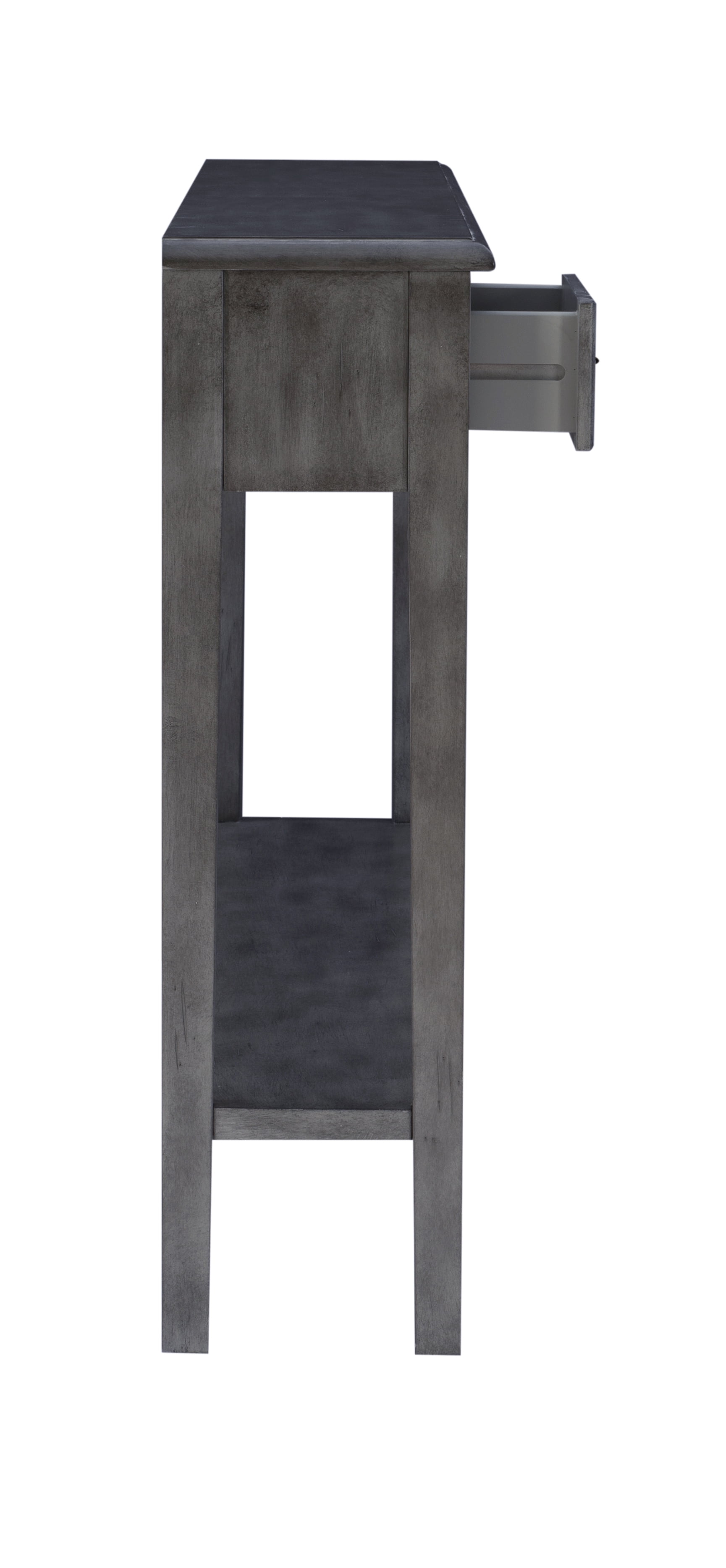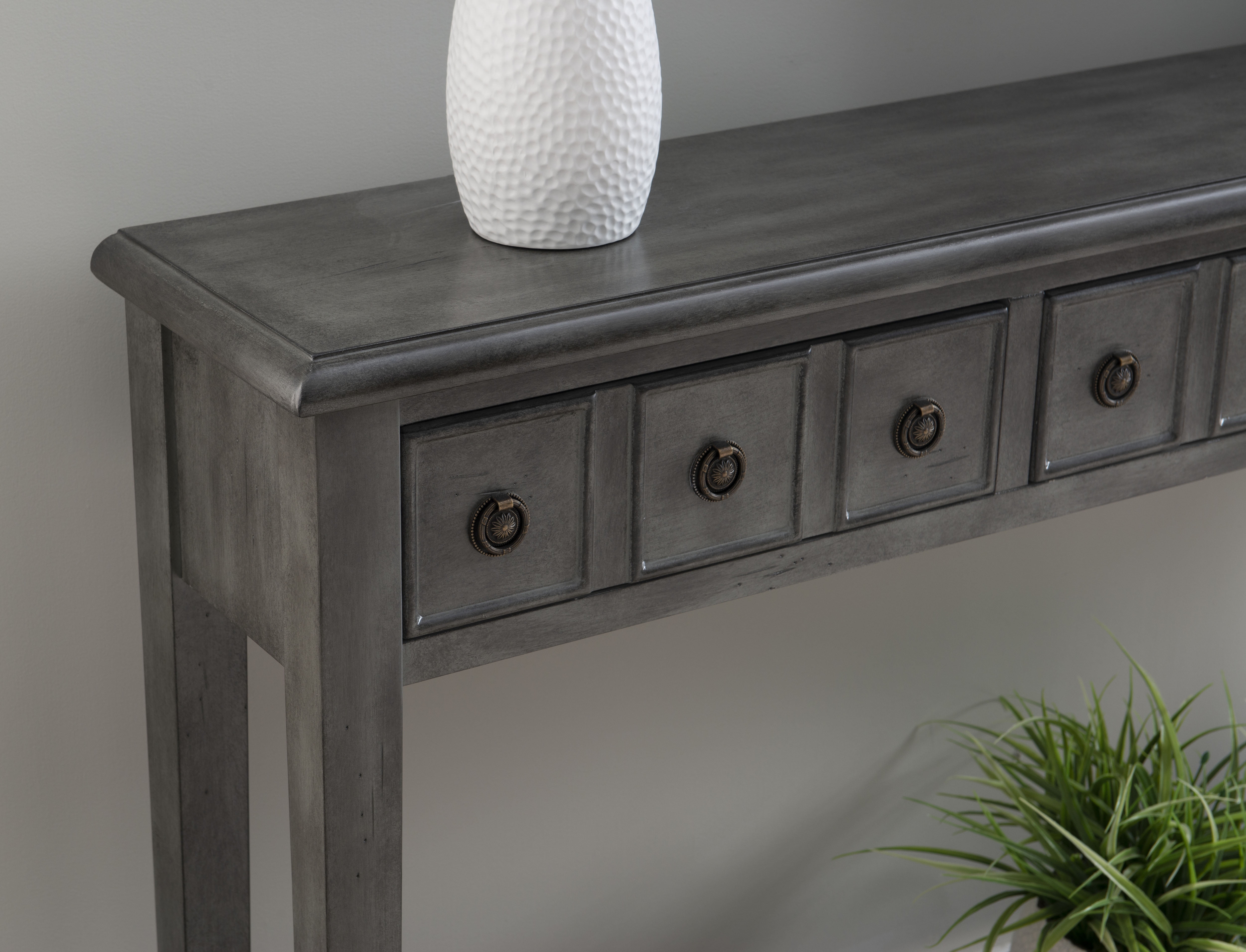 Designed with smaller spaces in mind, this slim line console serves as a stylish accent in your foyer or living room. The slender silhouette is equipped with four drawers to easily store small essentials, while a bottom shelf is perfectly sized to show off your favorite books or greenery. Round metal drawer pulls and four tapered legs add a distinctive touch to this cottage-inspired look. This item is finished with a distressed grey hue for a welcoming feel. Some assembly required. Features: Crafted from MDF and Birch Wood Distressed Gray Finish Round antique brass pulls Four drawers for closed storage Lower shelf for open storage Slimline design Specifications: Assembly Required: Some Assembly Required Product Dimensions: 60″w x 10″d x 35″h Product Weight: 75.41 lbs Weight Capacity: Top: 100 lbs, Shelf: 50 lbs Leg Dimensions: 5.5″H Drawer Dimensions: 13.75″ x 7.5″ x 3.25″, 8.63″ x 7.5″ x 3.25″