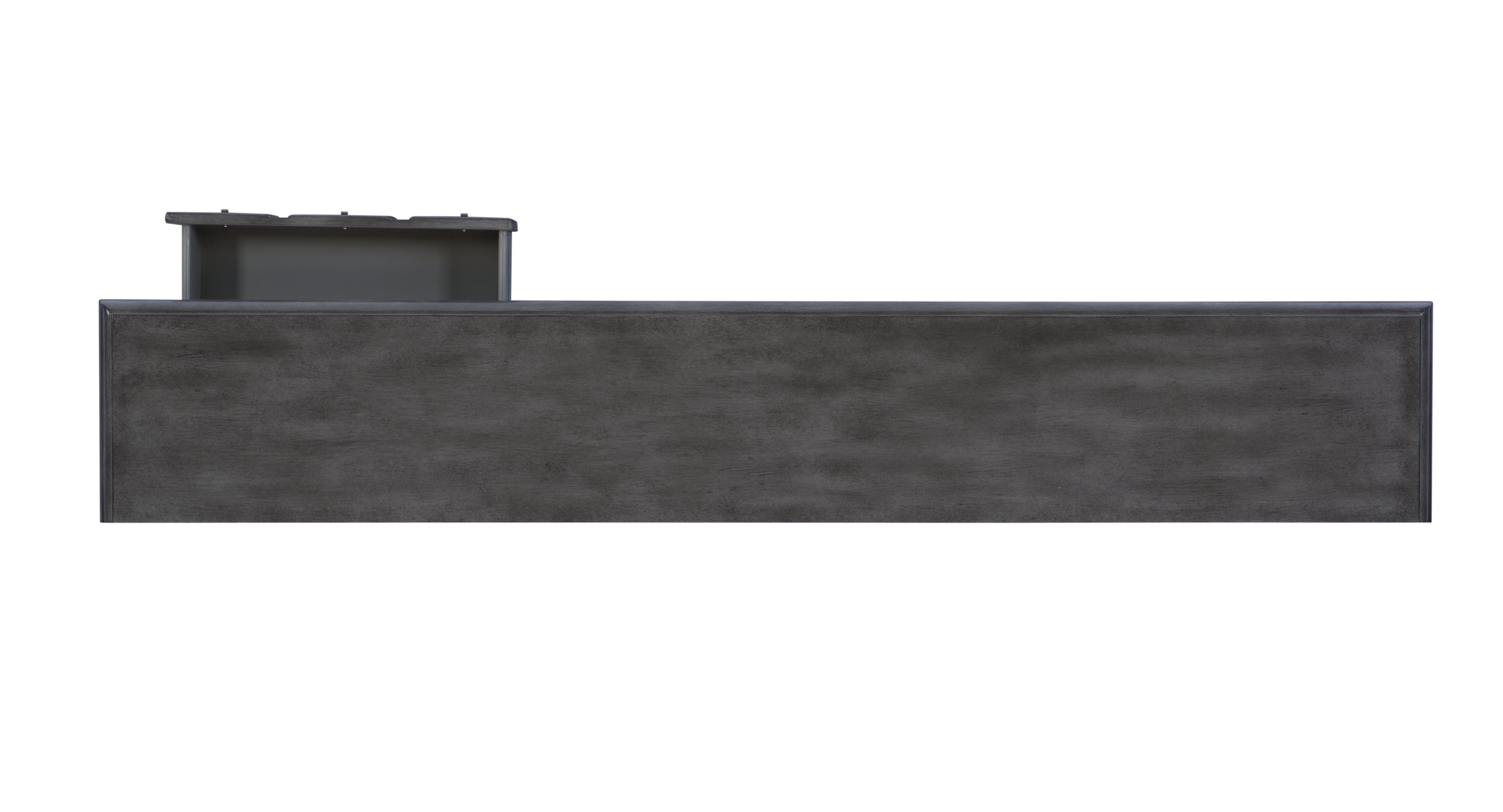 Crafted from MDF and Birch Wood Distressed Gray Finish Round antique brass pulls Four drawers for closed storage Lower shelf for open storage Slimline design