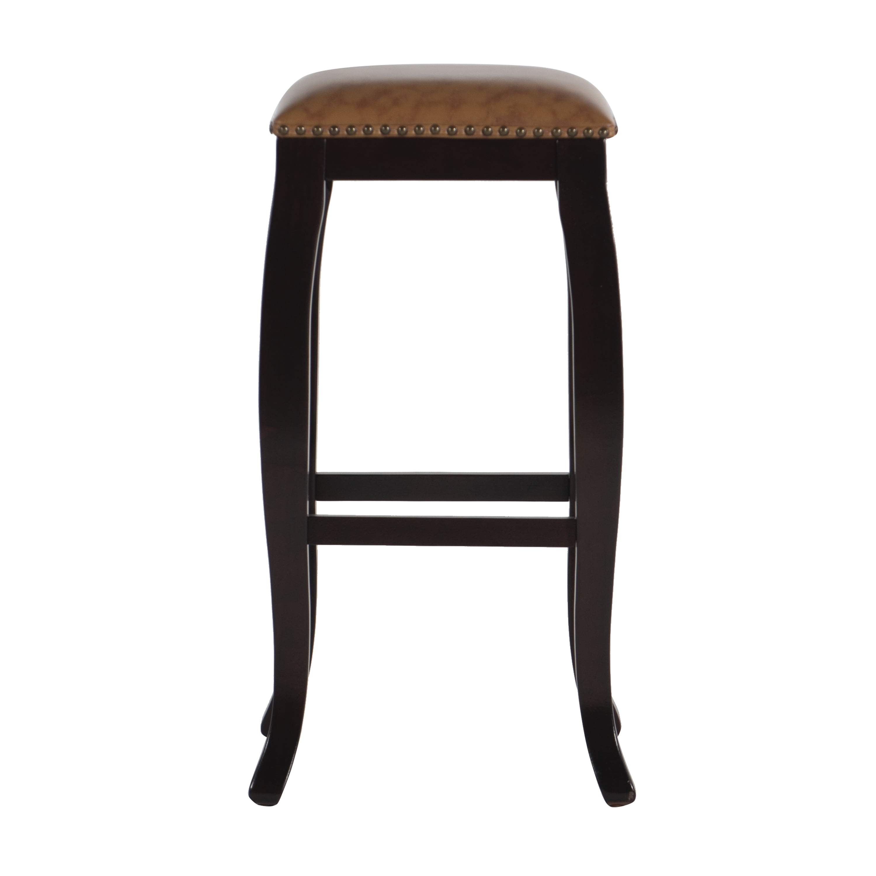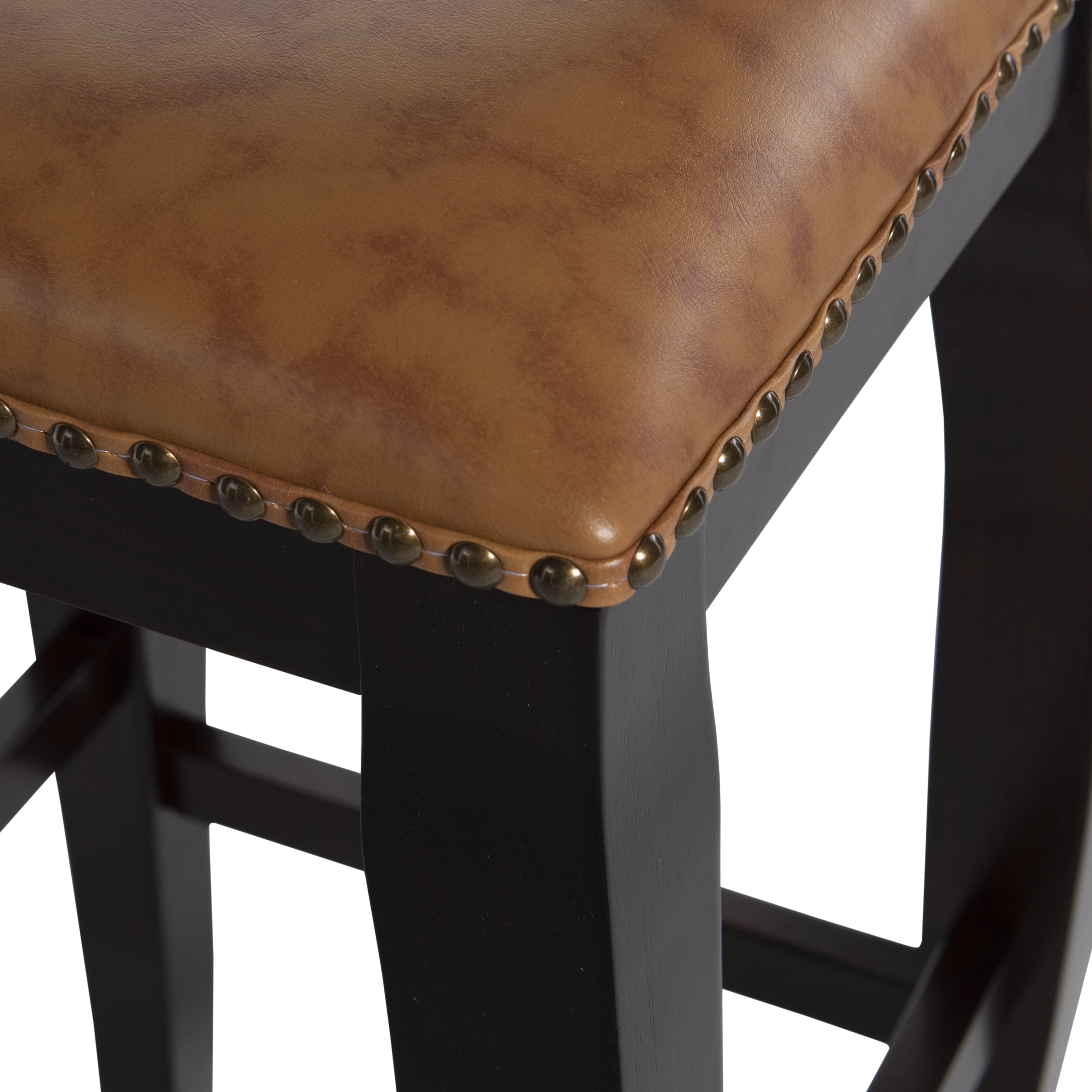 Wenge finish Caramel PU top Sleek curved legs Antique bronze nail head accents Seat dimensions 30in seat height 14.17in x 14.17in x 2.17in Four foot rails provide stability and comfort For indoor use only Square