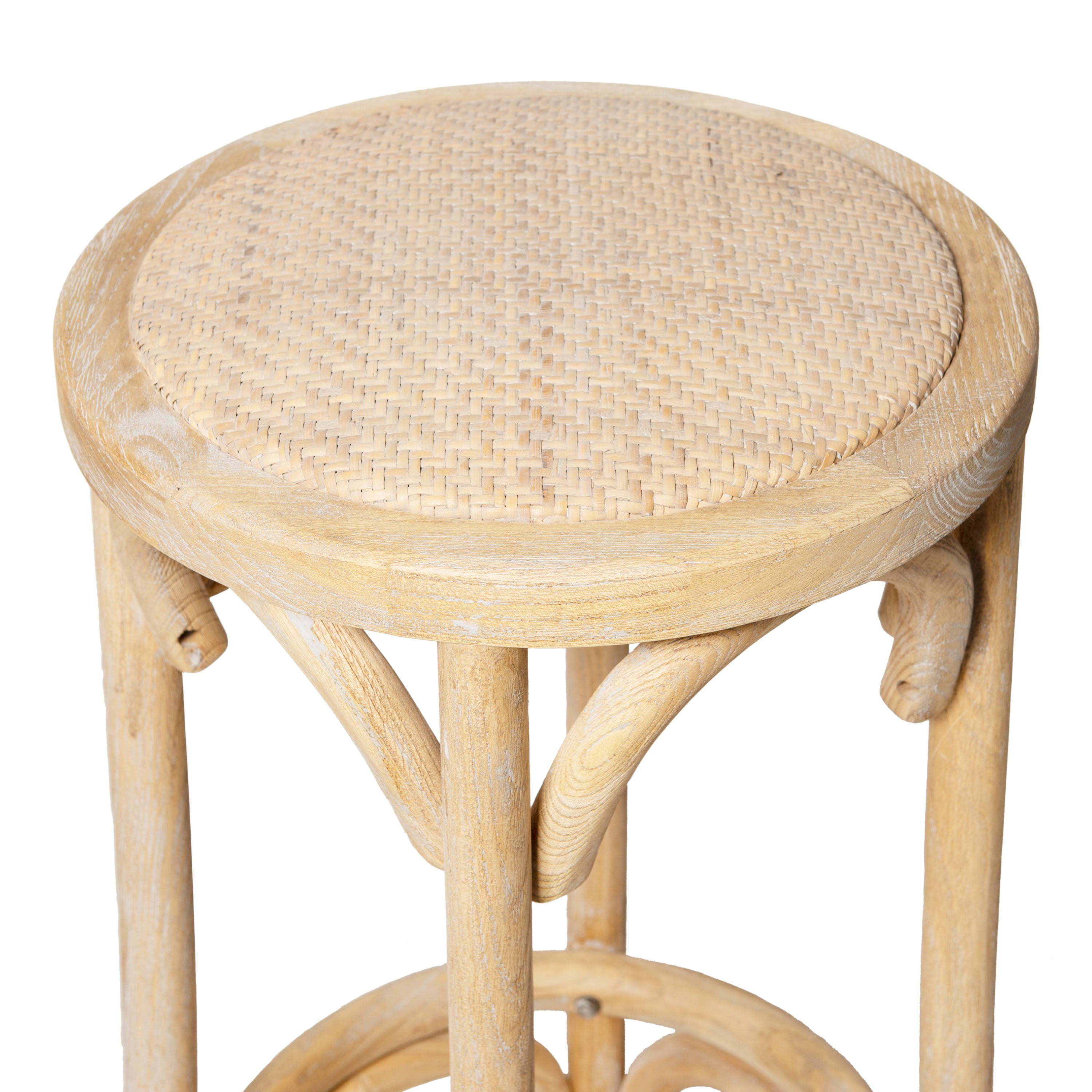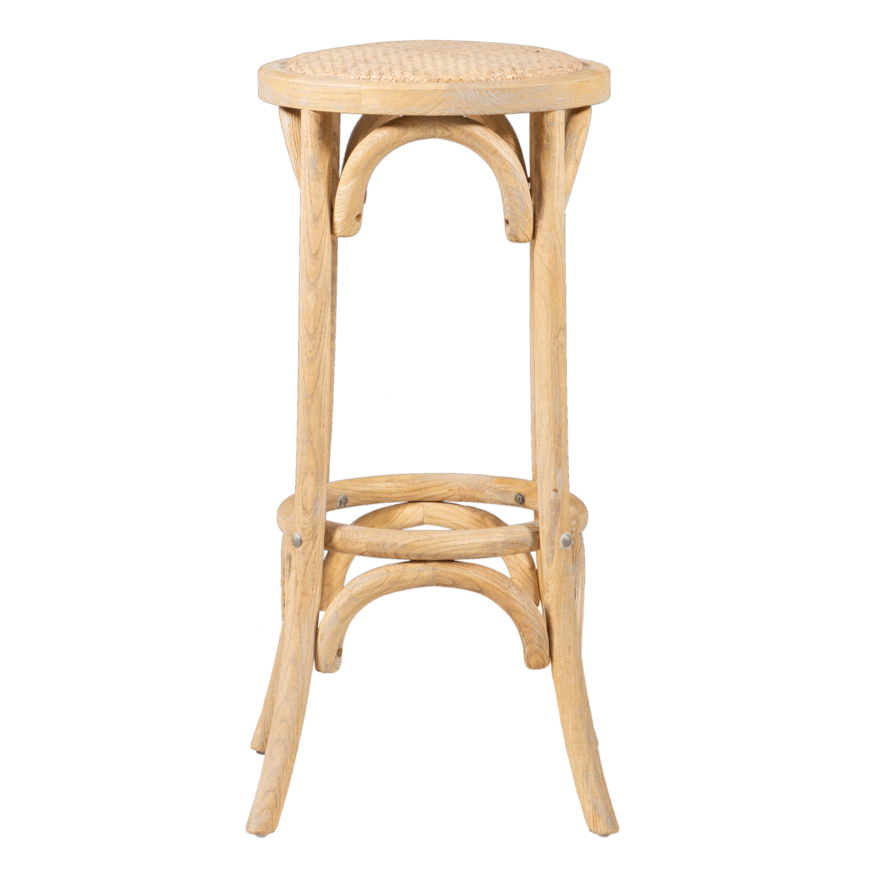 Rounded Backless Seat Bar Stool Natural Wood Finish Natural fiber seat Floor to Footrest: 12″, Floor to Bottom of Seat: 28.875″, Floor to Top of Seat: 30″ Assembled Dimensions: 14.5″ w x 14.5″ d x 30″ h Weight Capacity: 275 lbs. Fully Assembly Ships in 1 box