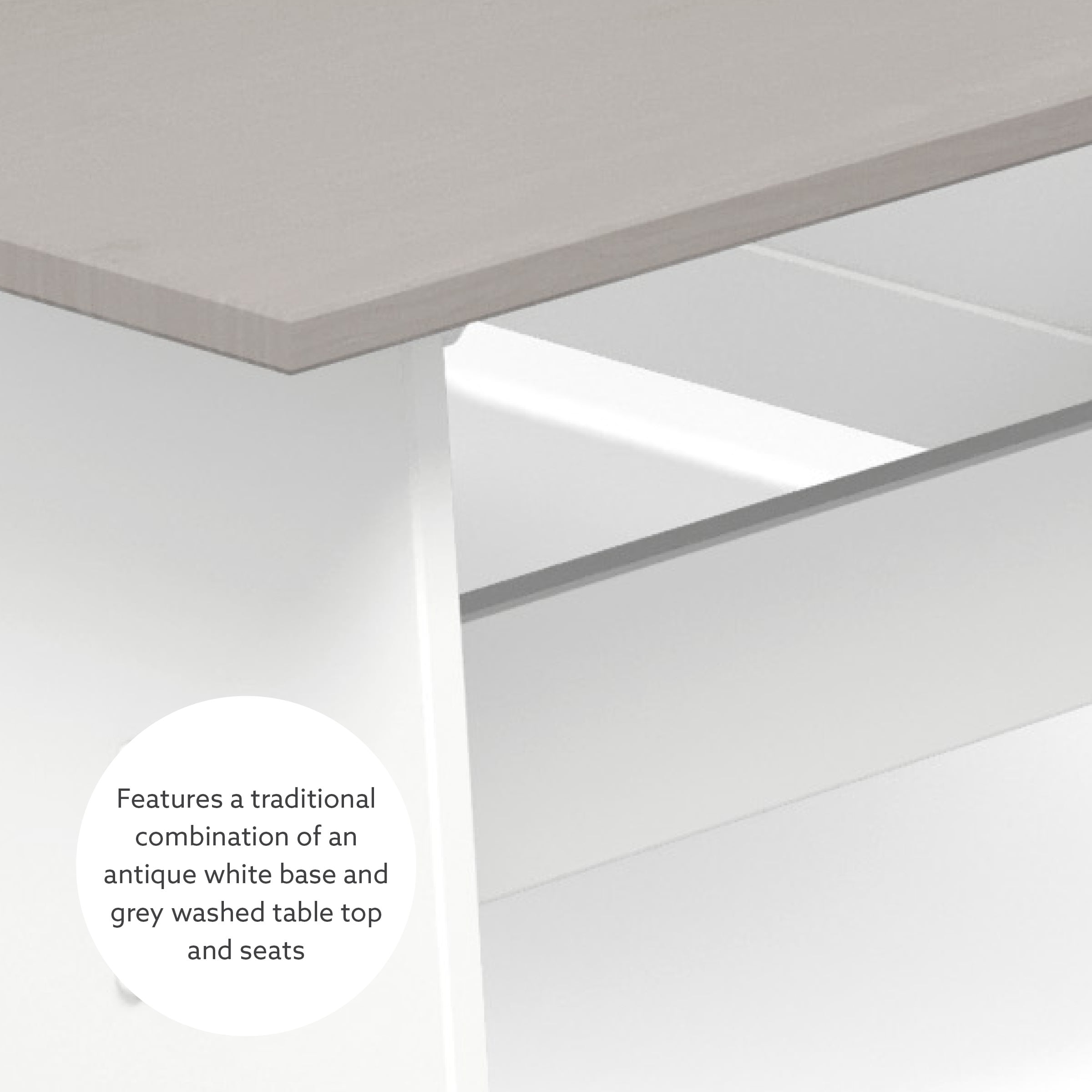 Complete 3-Piece Corner Dining Set: Includes one rectangular table, one two-seater bench, and one L-shaped corner bench—perfect for maximizing seating and functionality in kitchens, apartments, or compact dining areas. Solid Pine Wood Tops with Grey Finish: The table and bench tops are made from solid pine, offering superior strength and a beautiful, natural woodgrain look that adds warmth and rustic character to your home. Integrated Hidden Storage in Corner Benches: Both ends of the corner bench lift to reveal generous storage compartments—ideal for keeping linens, cookbooks, or toys neatly tucked away and easily accessible. Fresh Black Painted Frame: The durable MDF frames are painted in a crisp black finish that brightens the space and creates a clean, modern contrast to the grey wood tops. Easy to maintain and built to last. Comfortably Seats Up to 5 People: Designed for everyday use, this set provides ample seating for up to five—perfect for casual meals, homework sessions, or evening board games with family and friends. Flexible, Reversible Configuration: The corner bench can be assembled in either a right- or left-facing layout, giving you the flexibility to fit your specific space and floor plan with ease.