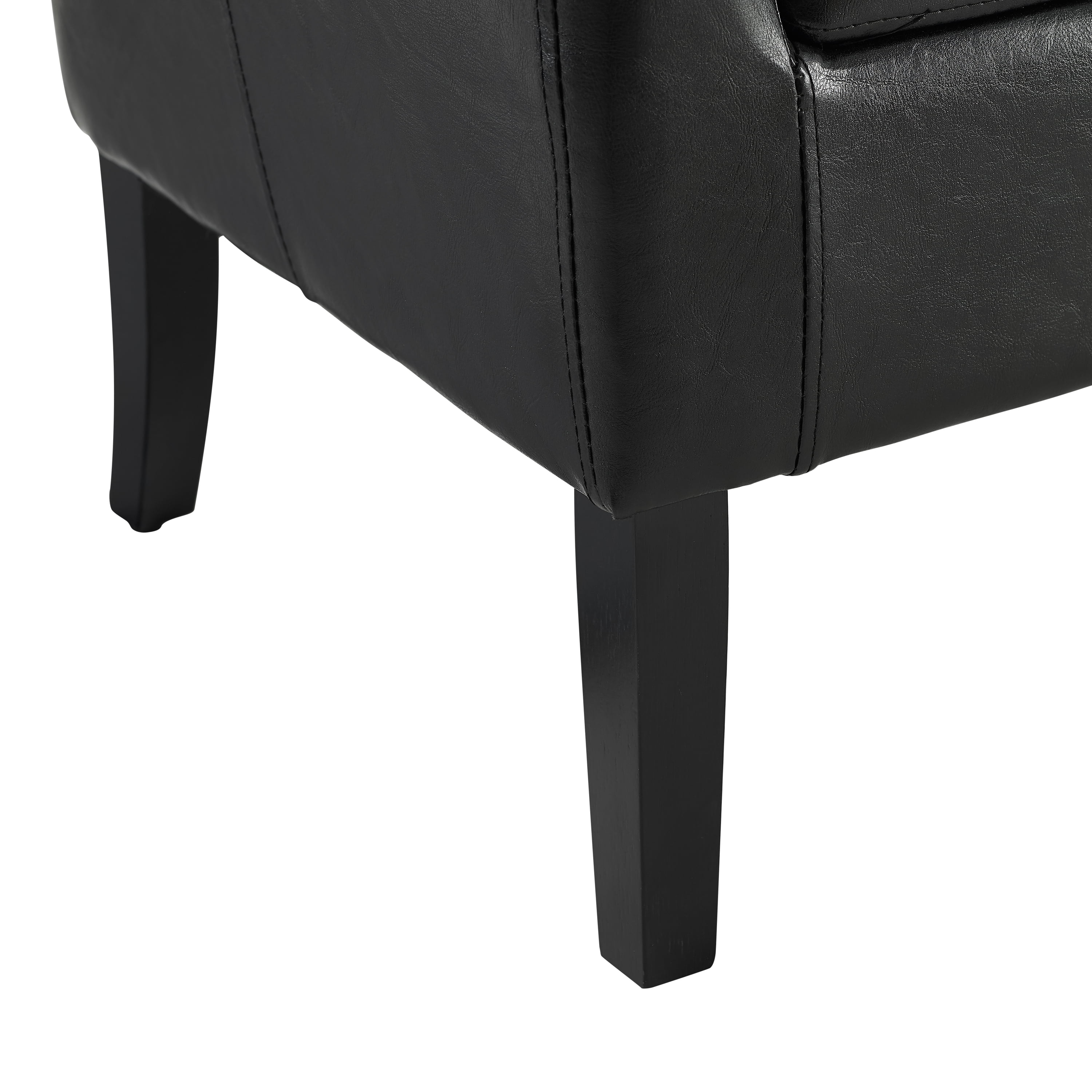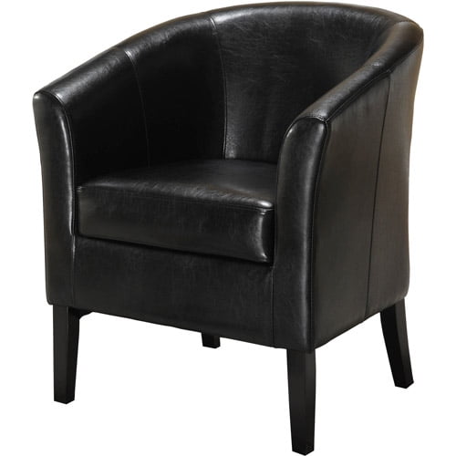 This faux leather club chair delivers a perfect balance of retro style and modern comfort. The enveloping barrel-back silhouette provides natural support, while plush cushioning creates an inviting perch for lingering moments of relaxation. Tightly wrapped in sleek black faux leather, the sculpted curves exude an understated elegance that seamlessly complements both contemporary and old-timey interiors. The design is grounded by tapered black wooden legs, adding a refined touch with a subtle nod to midcentury form. Every detail, from the tailored stitching to the supportive frame, is crafted for lasting style and comfort. Features: Crafted from Rubberwood, Plywood, Foam, and Fabric Barrel-back silhouette. The curved, wraparound backrest provides natural support while creating an inviting, cocoon-like feel. This classic design presents a lounge-worthy seat that is both elegant and ergonomic Thick foam padding on the seat and backrest delivers a cozy yet supportive sit, perfect for long lounging sessions. The well-balanced cushioning prevents sagging, ensuring durability and comfort over time Smooth, high-quality faux leather upholstery presents a sophisticated look with durability easy maintenance. Resistant to spills and everyday wear, it provides a polished aesthetic without the headaches of real leather Tapered wooden legs. Sturdy, black wooden legs provide a refined contrast to the seat while enhancing stability and support. Their midcentury-inspired design adds a vintage feel while ensuring reliable durability Precision stitching reinforces the upholstery while adding a subtle, cultivated accent that enhances the chair‚Äôs sleek appearance The fusion of midcentury and contemporary influences allows this chair to seamlessly fit into a variety of decor styles. Whether placed in a chic lounge, modern office, or cozy living room, it will fit the bill just right Designed for hassle-free setup, this chair arrives partially assembled, requiring only the attachment of the legs. You’ll be lounging within minutes Built for stability, the 4-legged base provides excellent balance and support for up to 300 lbs. This durable construction gives peace of mind, accommodating a wide range of users while maintaining a sleek, stylish profile Designed for Residential Use Only. Crafted with the needs of your home in mind, this item is ideal for personal spaces where comfort and style come first. It‚Äôs not intended for commercial or heavy-duty environments Specifications: Assembly Required: Some Assembly Required Product Dimensions: 28.25″w x 25.5″d x 33″h Product Weight: 29.77 lbs Seat Height: 19.75″ Seat Dimensions: 18.5″ x 18″ x 5.88″ Weight Capacity: 300 lbs