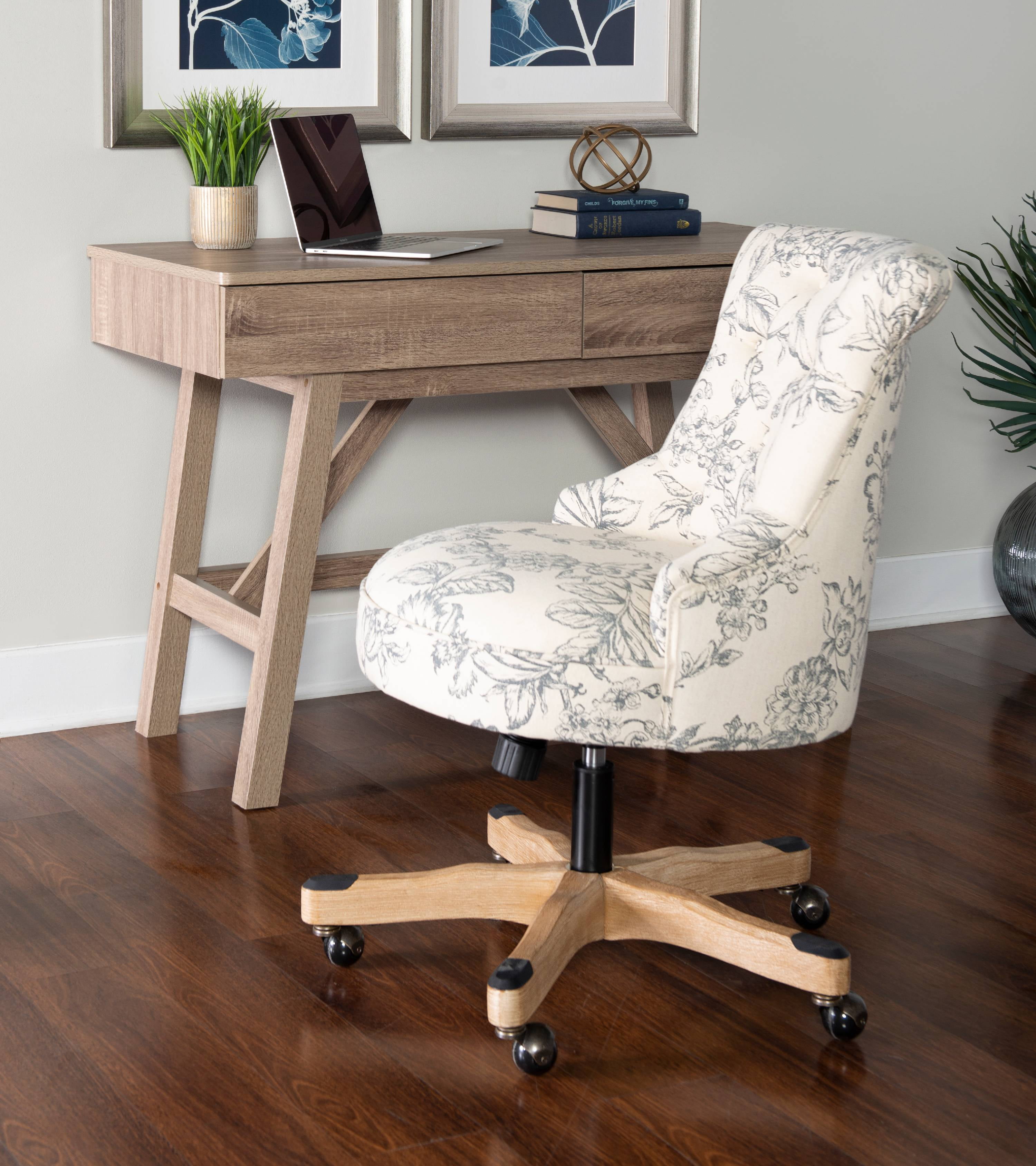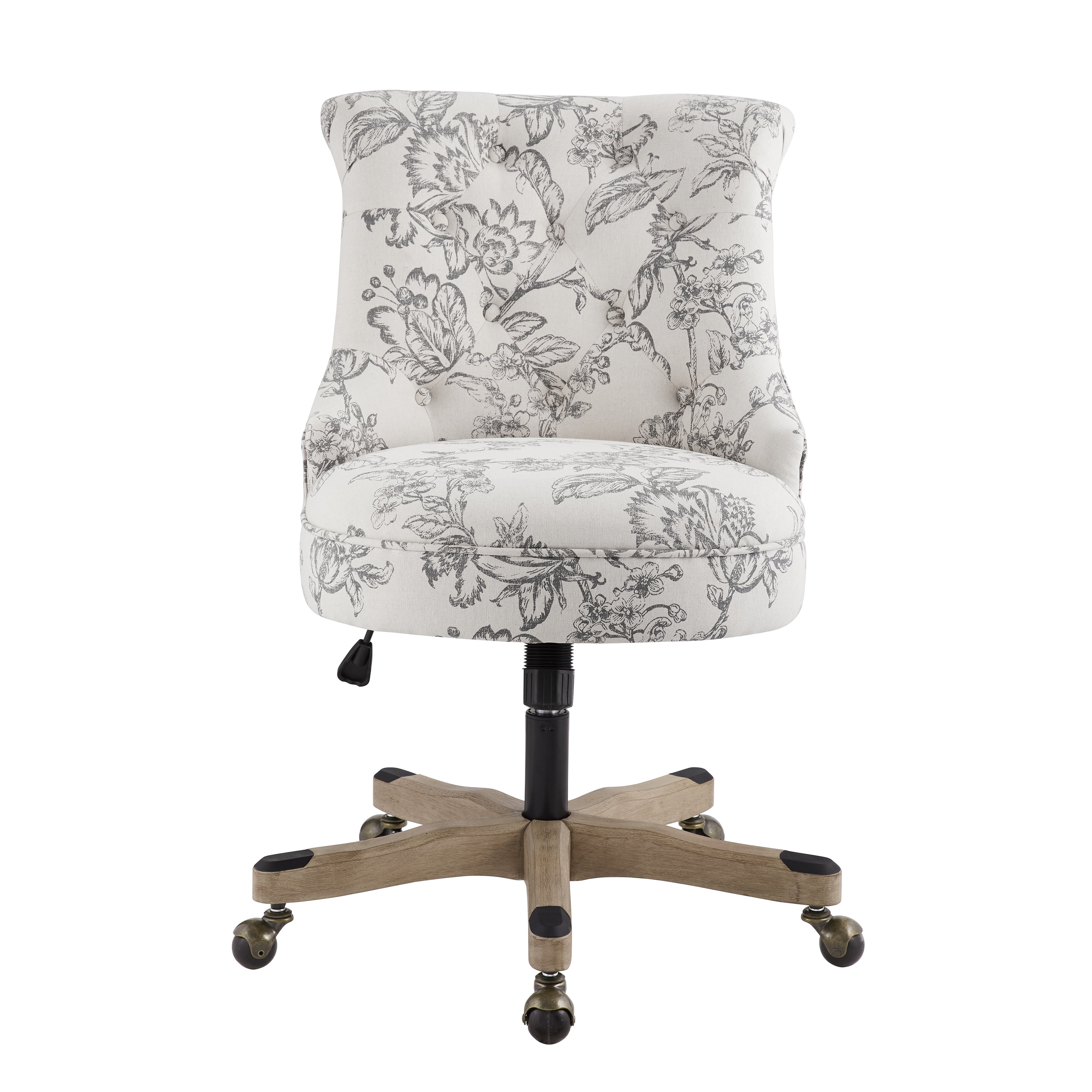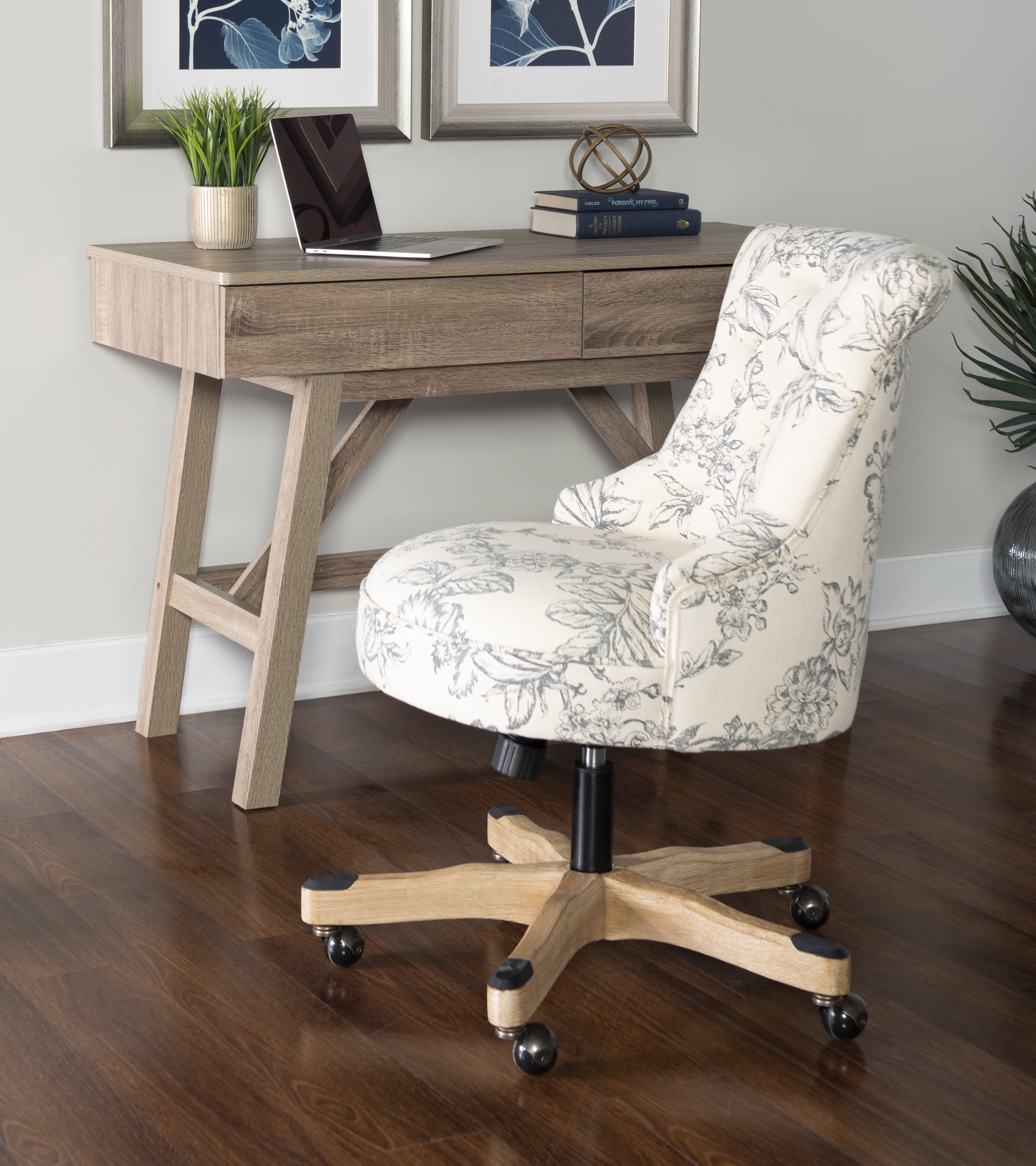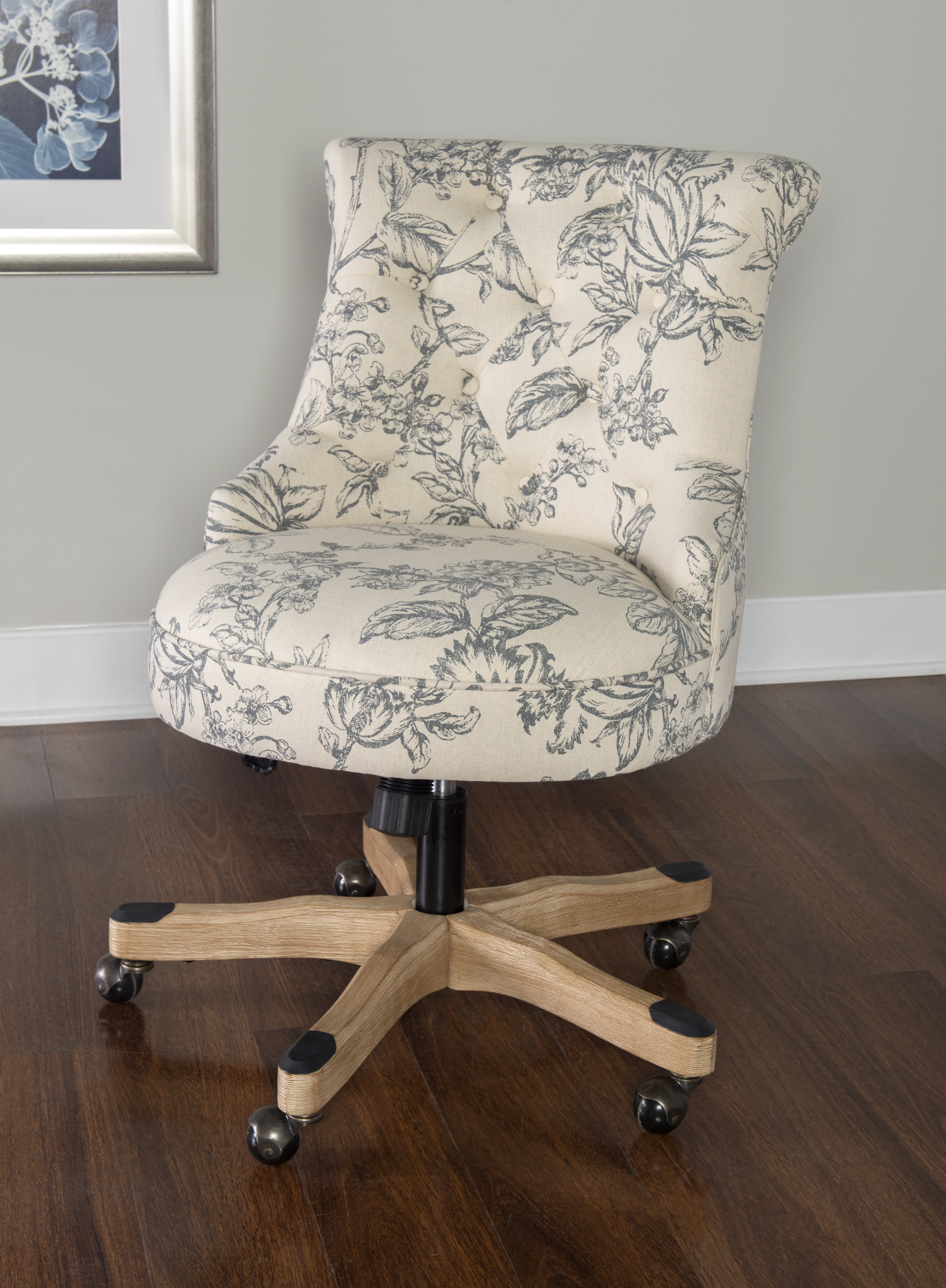 Stylish and comfortable option for office seating Button tufted back in a floral printed linen fabric Metal casters Natural wood base Easy clean 100 percent polyester fabric in a rich floral pattern Adjustable seat height 19-23in adjustable range Gas lift mechanism and casters with bifma standard Adjustable tilt tension for custom comfort Ships in 1 box