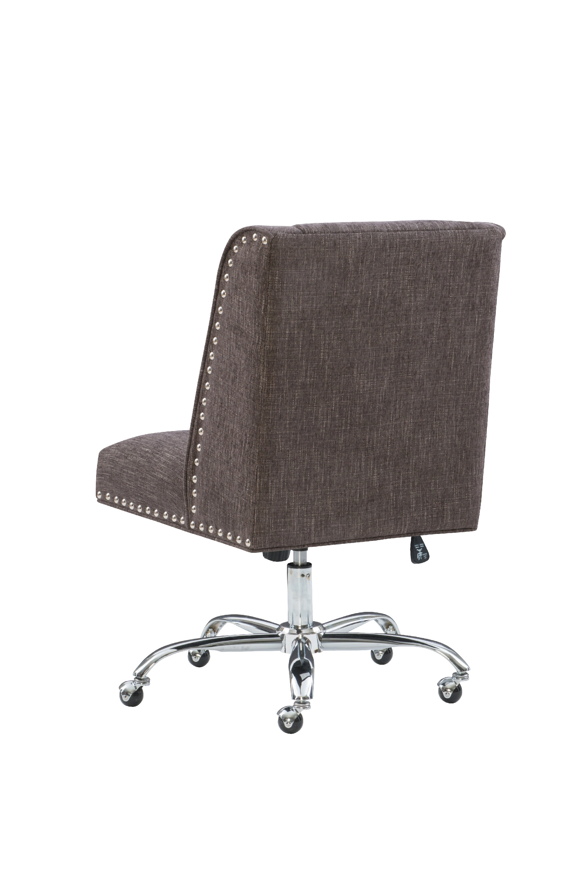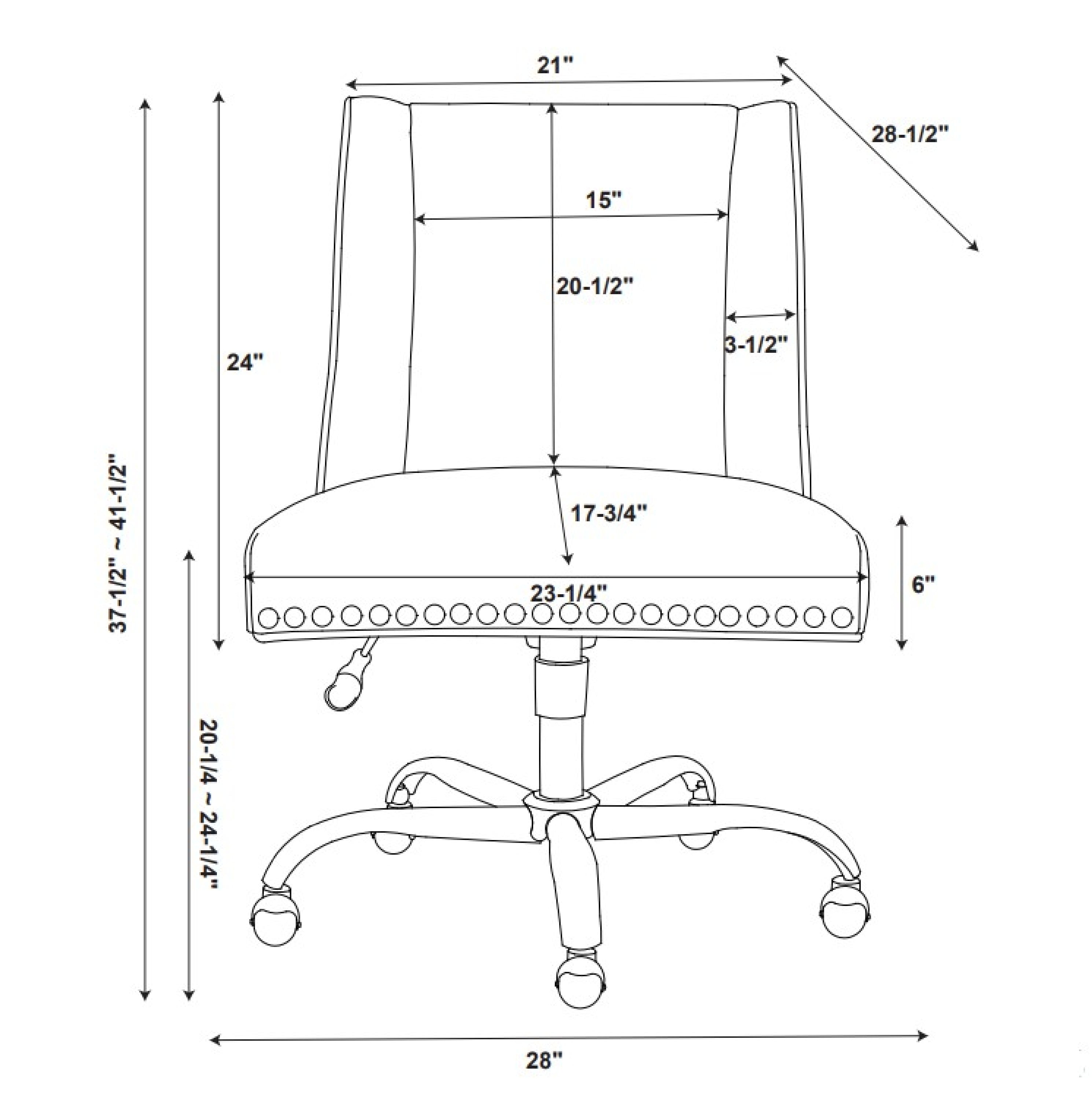 Linon Sisemore Task Chair with Adjustable Height & Swivel, 275 lb. Capacity, Multiple Colors and Patterns A stylish and comfortable option for office seating Plush seat and back Silver Nailheads Chrome base and metal casters Durable fabric upholstery Gas lift, mechanism, and casters with BIFMA Standard Seat dimensions: 23.25″ x 17.75″ Adjustable seat height 20.25″ – 24.25″ Weight Limit: 275 lbs Assembled Dimensions: 28″ W x 28.5″ D x 37.5-41.5″ H Ships in 1 box
