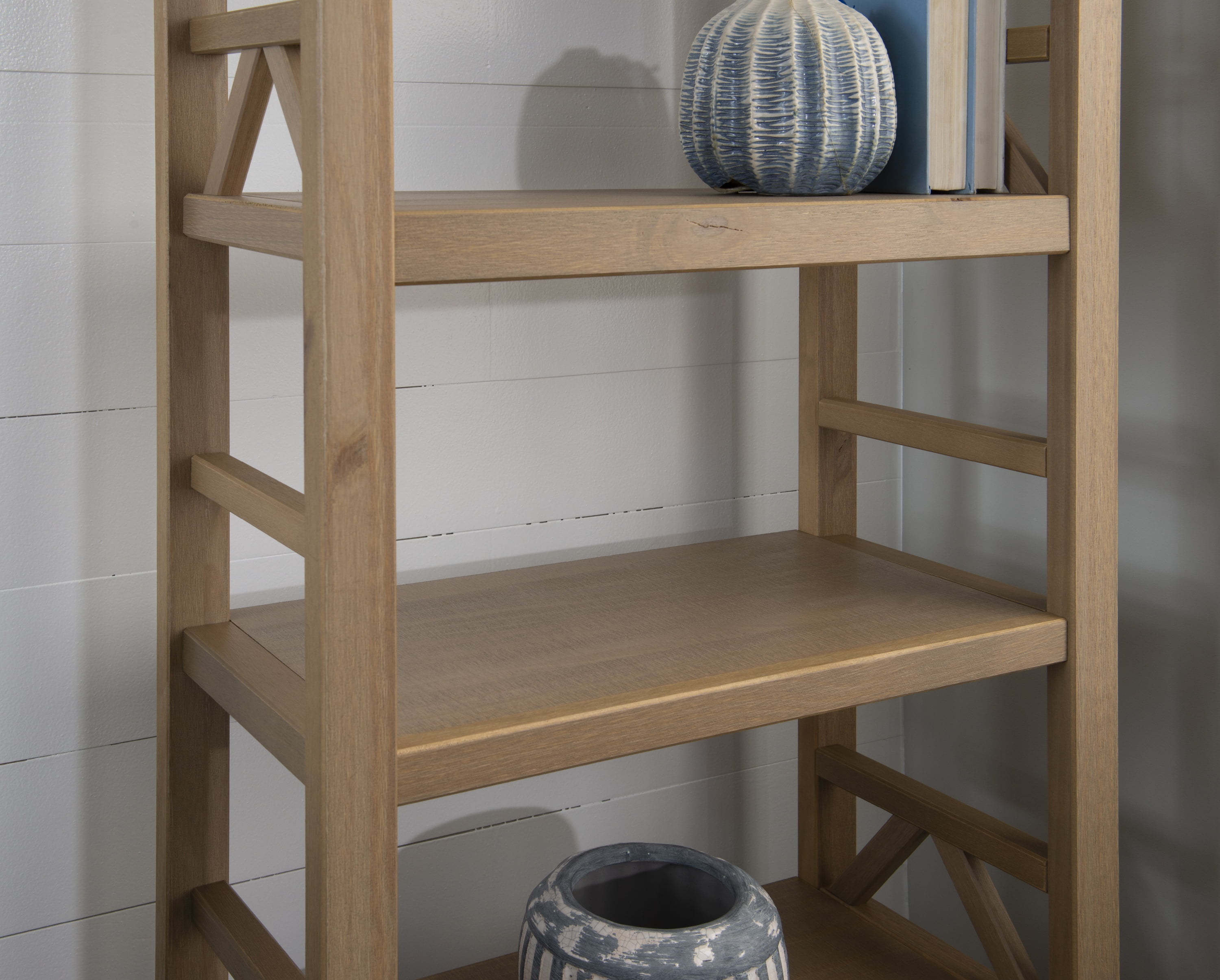 Color: Natural Bullet Feature 3: 4 spacious shelves Bullet Feature 2: Simple yet eye-catching design Bullet Feature 1: Driftwood finish Bullet Feature 6: Top dimensions 24in x 12.25in shelves 19in x 11in x 11.5in Bullet Feature 5: Will easily complement your homes decor. Bullet Feature 4: Provides ample storage space Weight (lbs.): 28.67 lb Length (in.): 12.2 Width (in.): 23.22 Height (in.): 54.45