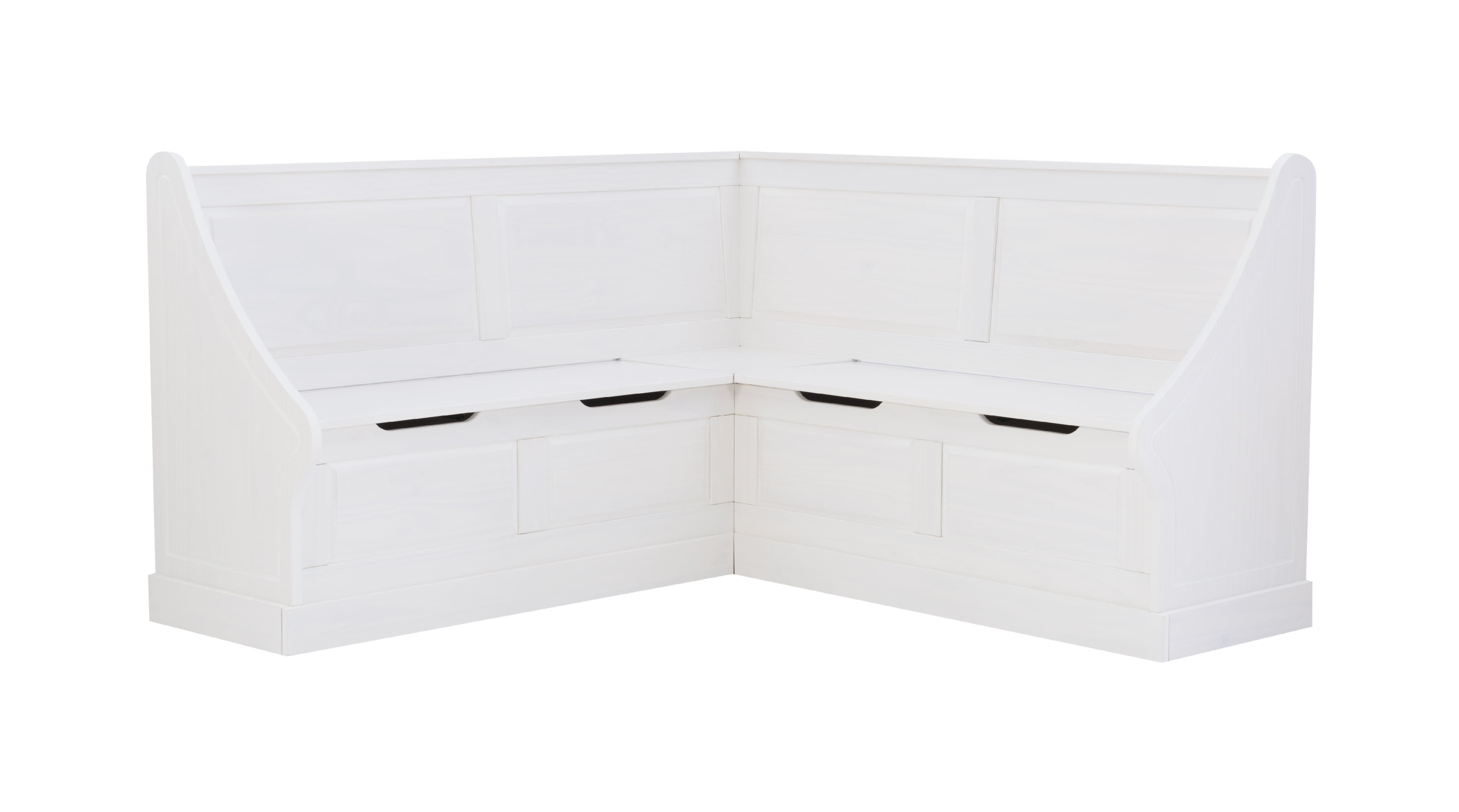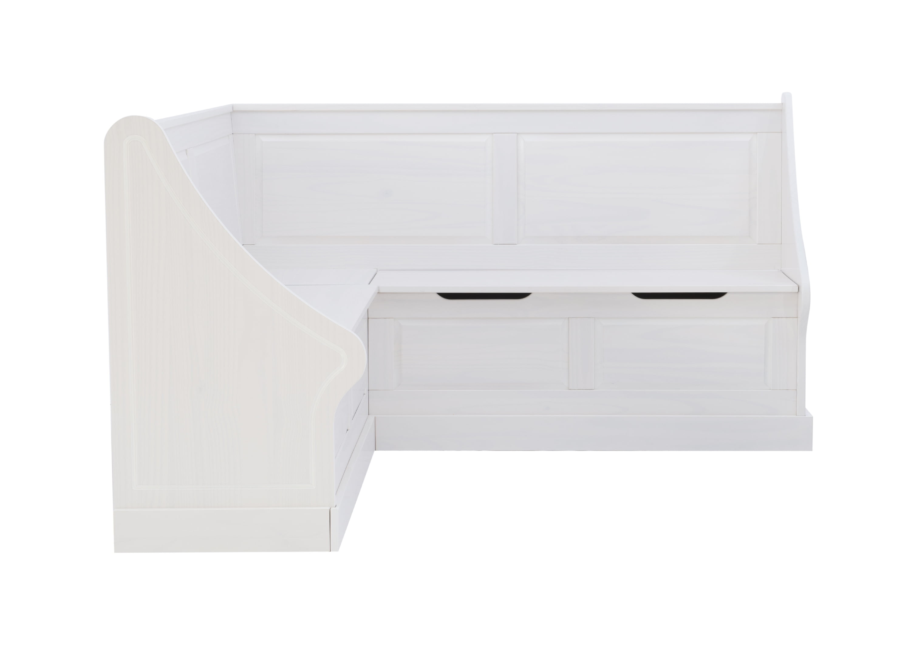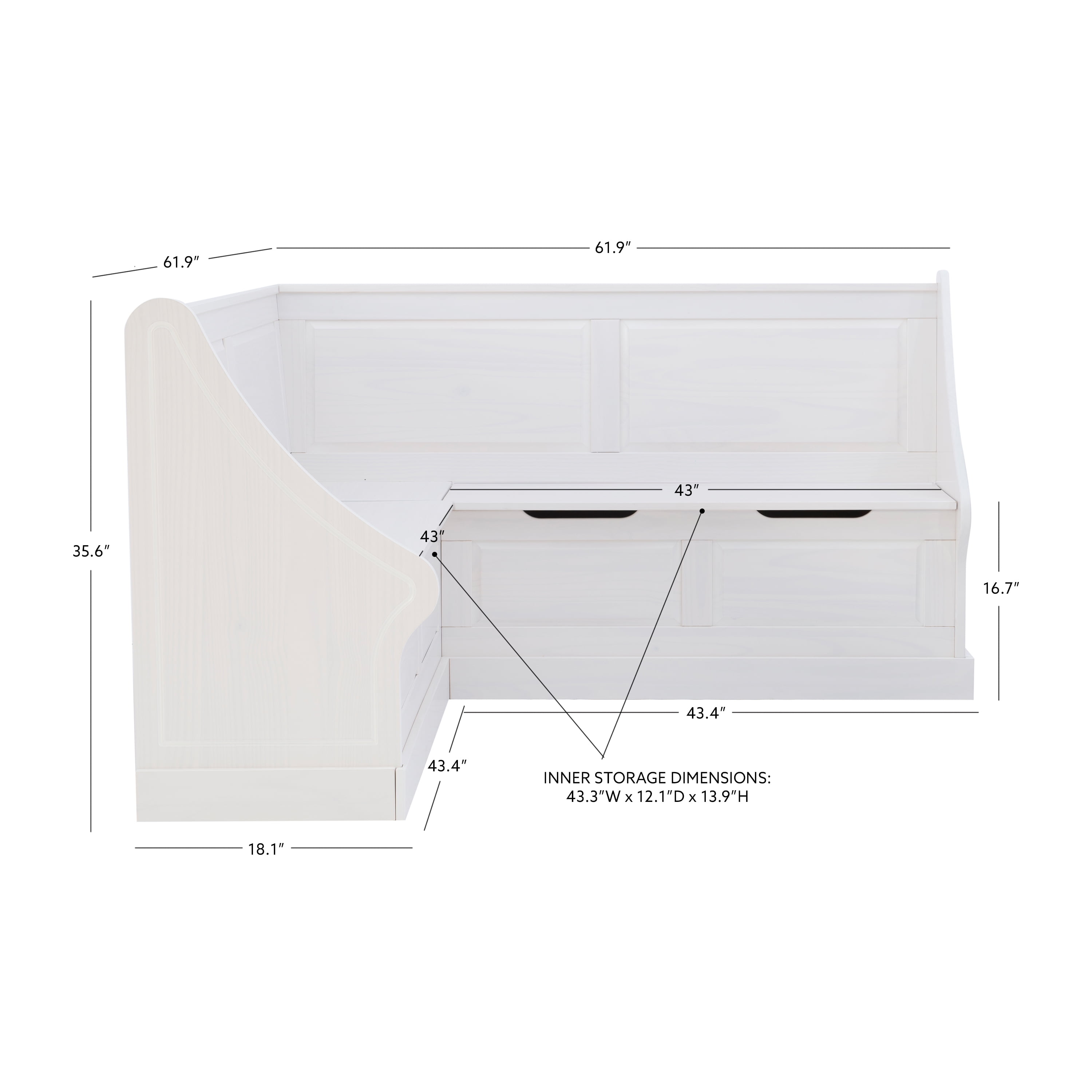 Cottage-Inspired Corner Design: Soft white finish and paneled backrests create a built-in look with farmhouse charm—perfect for kitchens, dining alcoves, or breakfast nooks. Solid Pine Wood Construction: Built from durable solid pine, this L-shaped bench provides long-lasting stability and rustic character in a space-smart silhouette. Hidden Storage with Soft-Close Hinges: Lift-up bench seats reveal roomy storage compartments—ideal for tucking away cookbooks, linens, or seasonal decor. High-Back Comfort + Wraparound Seating: The tall backrests and L-shape design offer supportive, tucked-in seating that accommodates multiple guests in compact spaces. Easy-Access Cutout Handles: Cutout bench handles make lifting lids smooth and snag-free while keeping the design clean and functional. Multi-Use Functionality: Use as a breakfast nook, reading bench, or mudroom storage—this piece supports up to 600 lbs. and adapts to your changing needs.