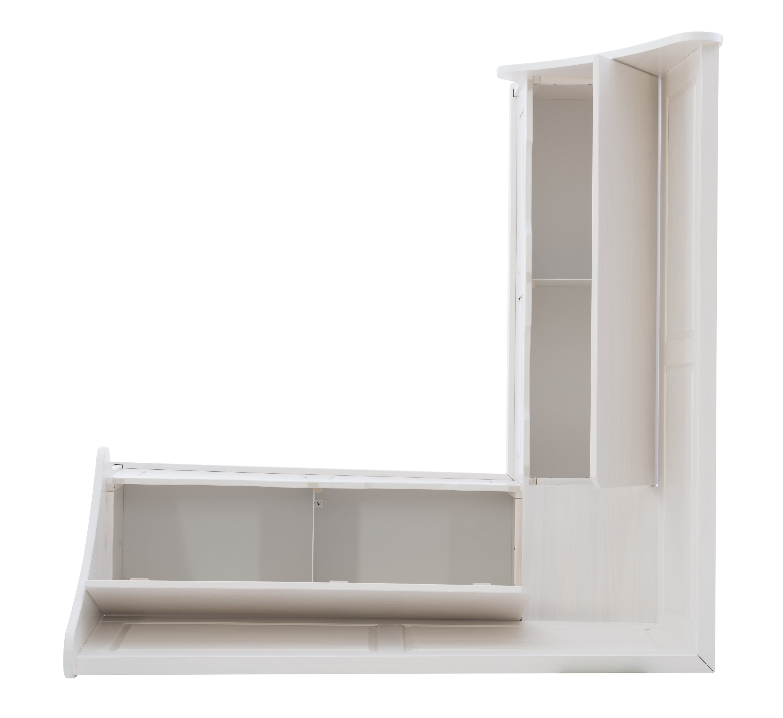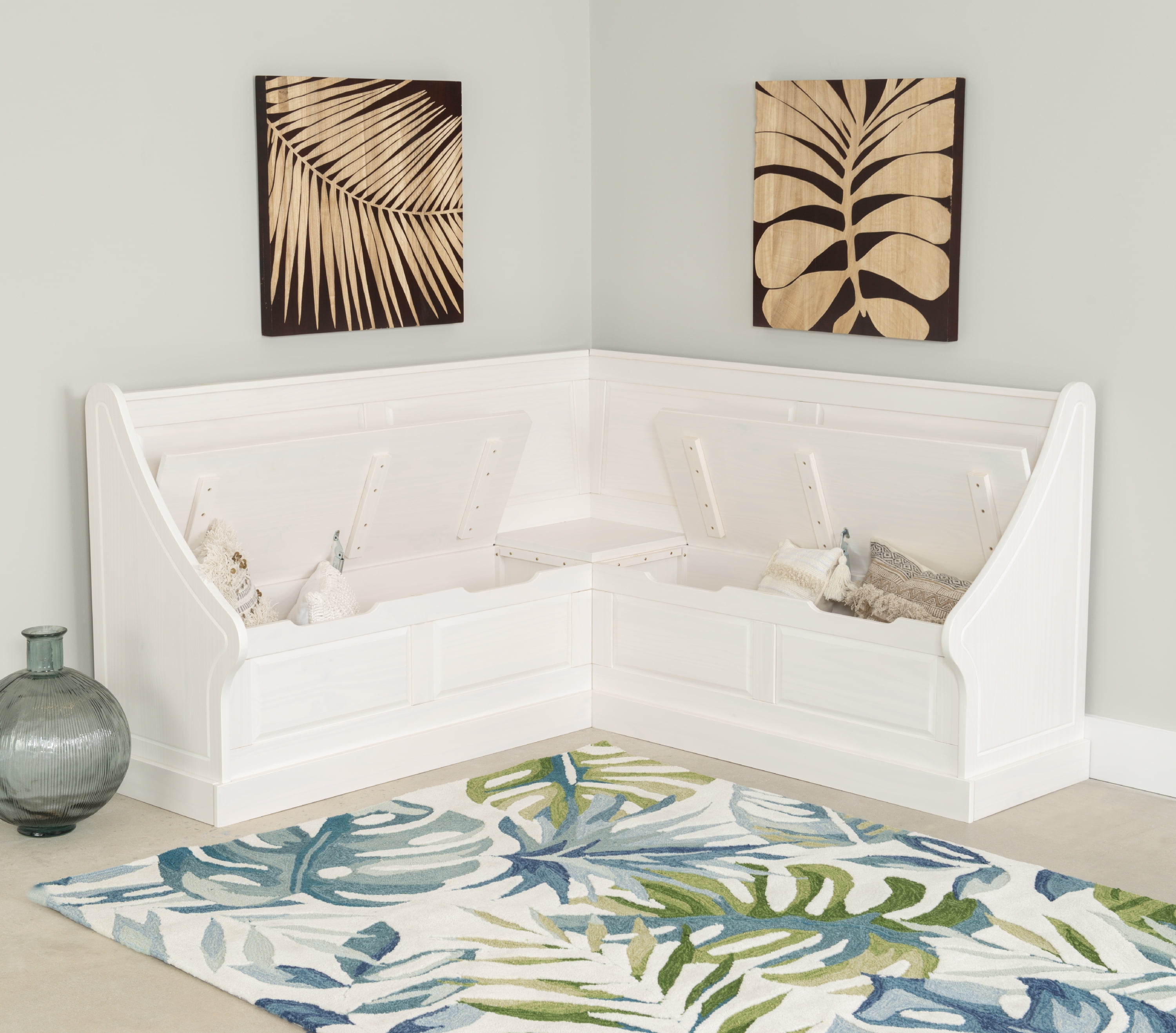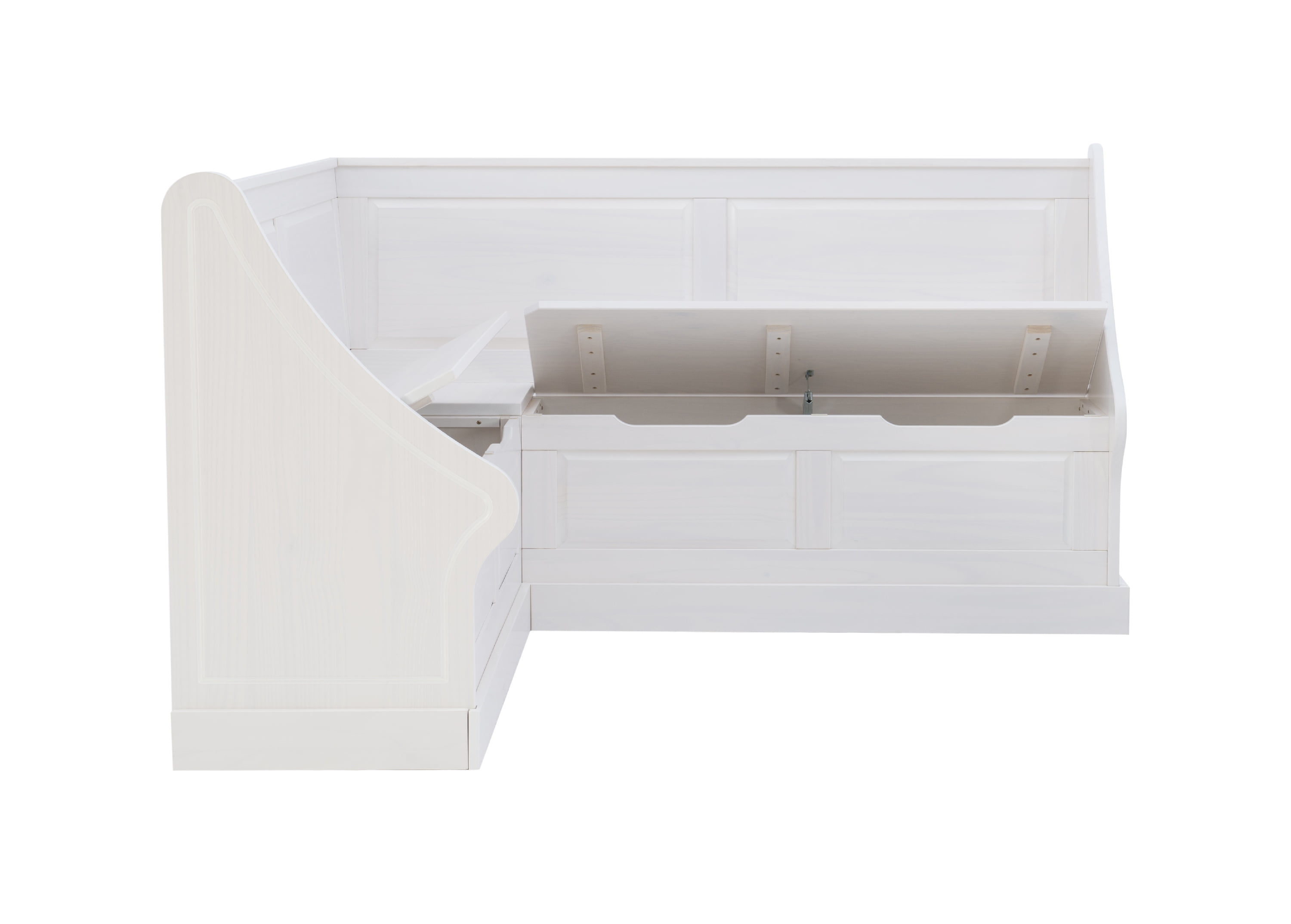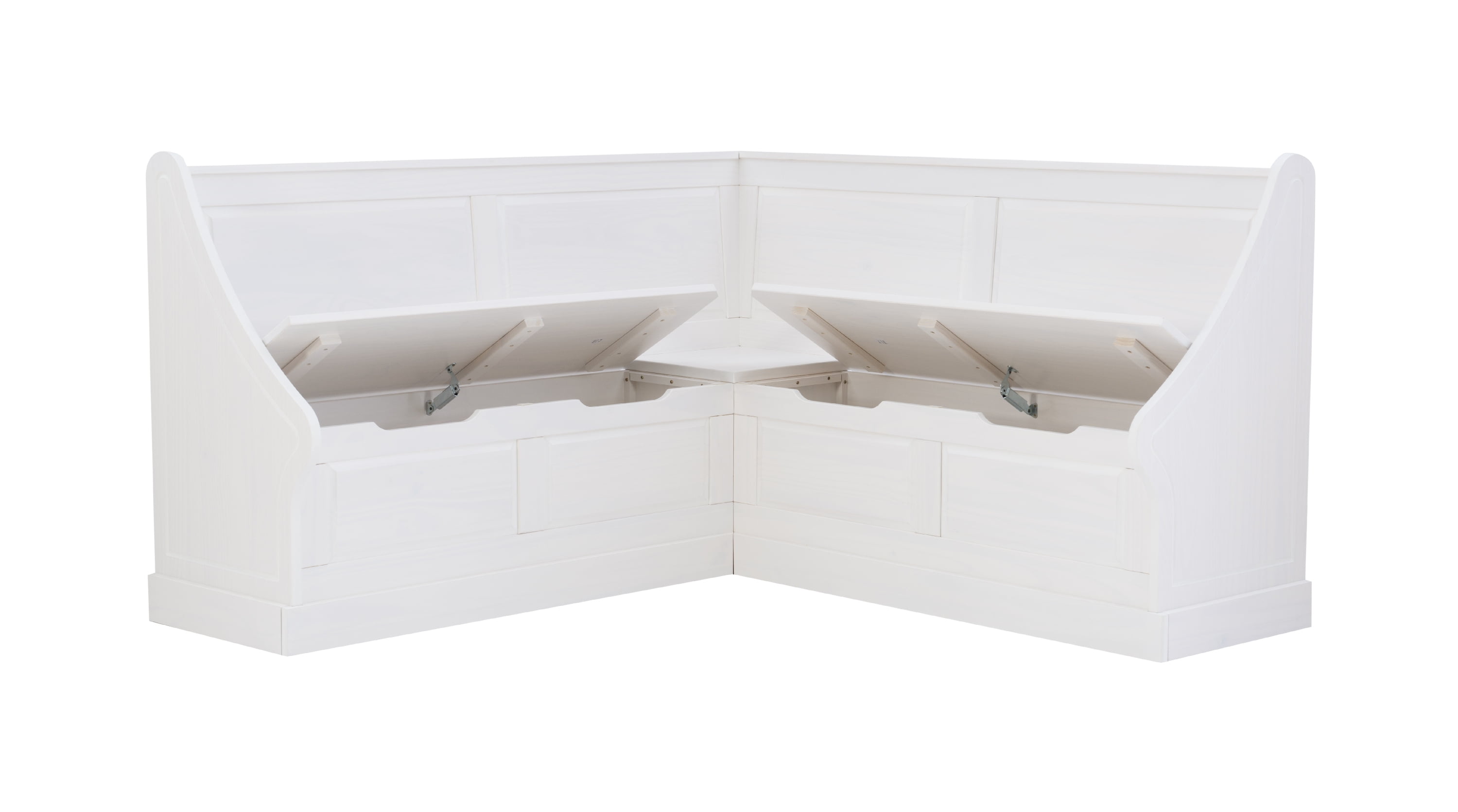 Cottage-Inspired Corner Design: Soft white finish and paneled backrests create a built-in look with farmhouse charm—perfect for kitchens, dining alcoves, or breakfast nooks. Solid Pine Wood Construction: Built from durable solid pine, this L-shaped bench provides long-lasting stability and rustic character in a space-smart silhouette. Hidden Storage with Soft-Close Hinges: Lift-up bench seats reveal roomy storage compartments—ideal for tucking away cookbooks, linens, or seasonal decor. High-Back Comfort + Wraparound Seating: The tall backrests and L-shape design offer supportive, tucked-in seating that accommodates multiple guests in compact spaces. Easy-Access Cutout Handles: Cutout bench handles make lifting lids smooth and snag-free while keeping the design clean and functional. Multi-Use Functionality: Use as a breakfast nook, reading bench, or mudroom storage—this piece supports up to 600 lbs. and adapts to your changing needs.
