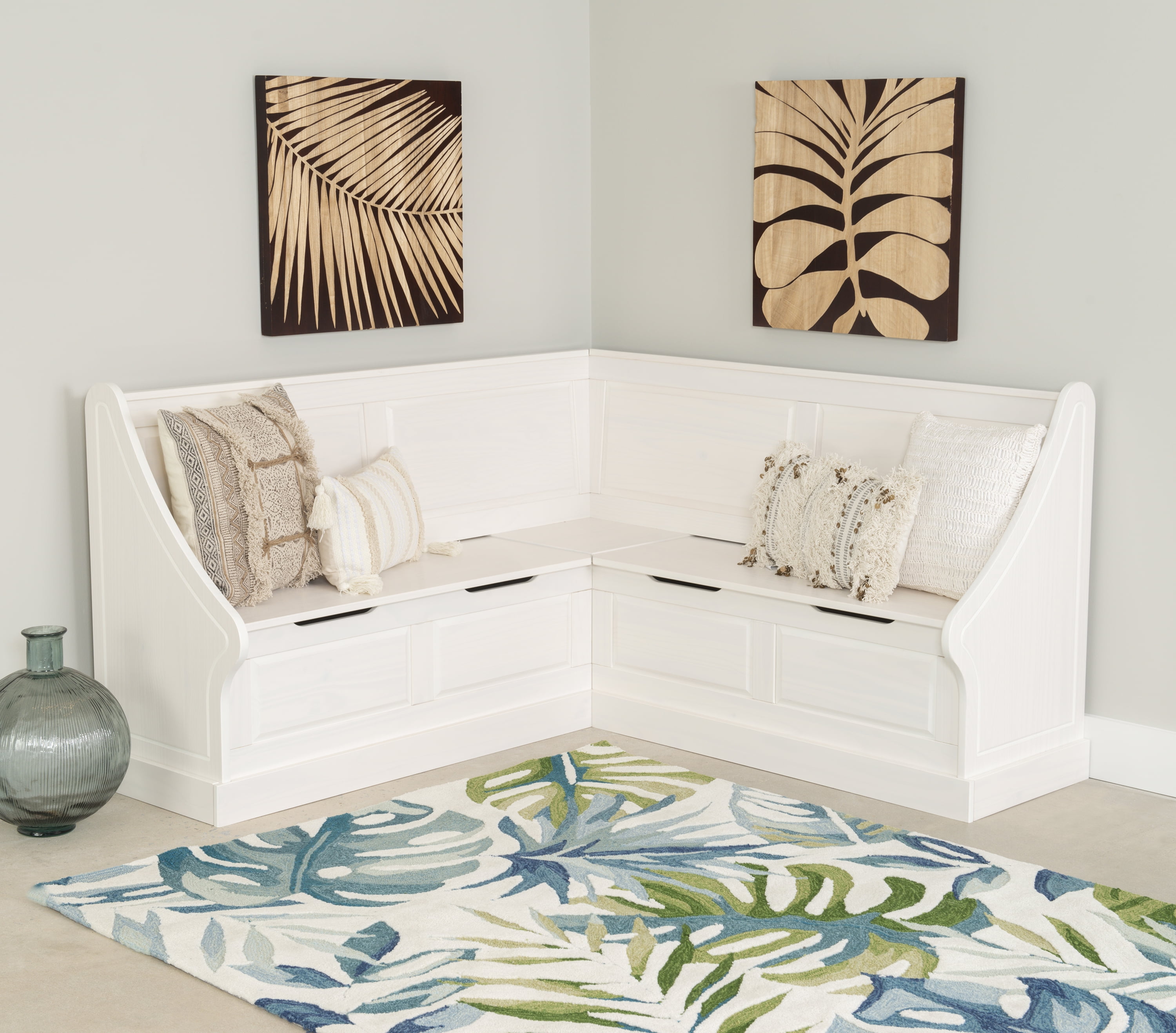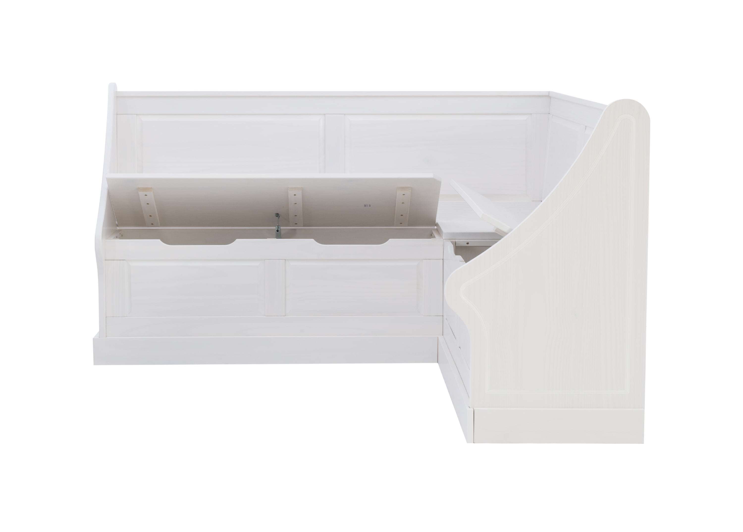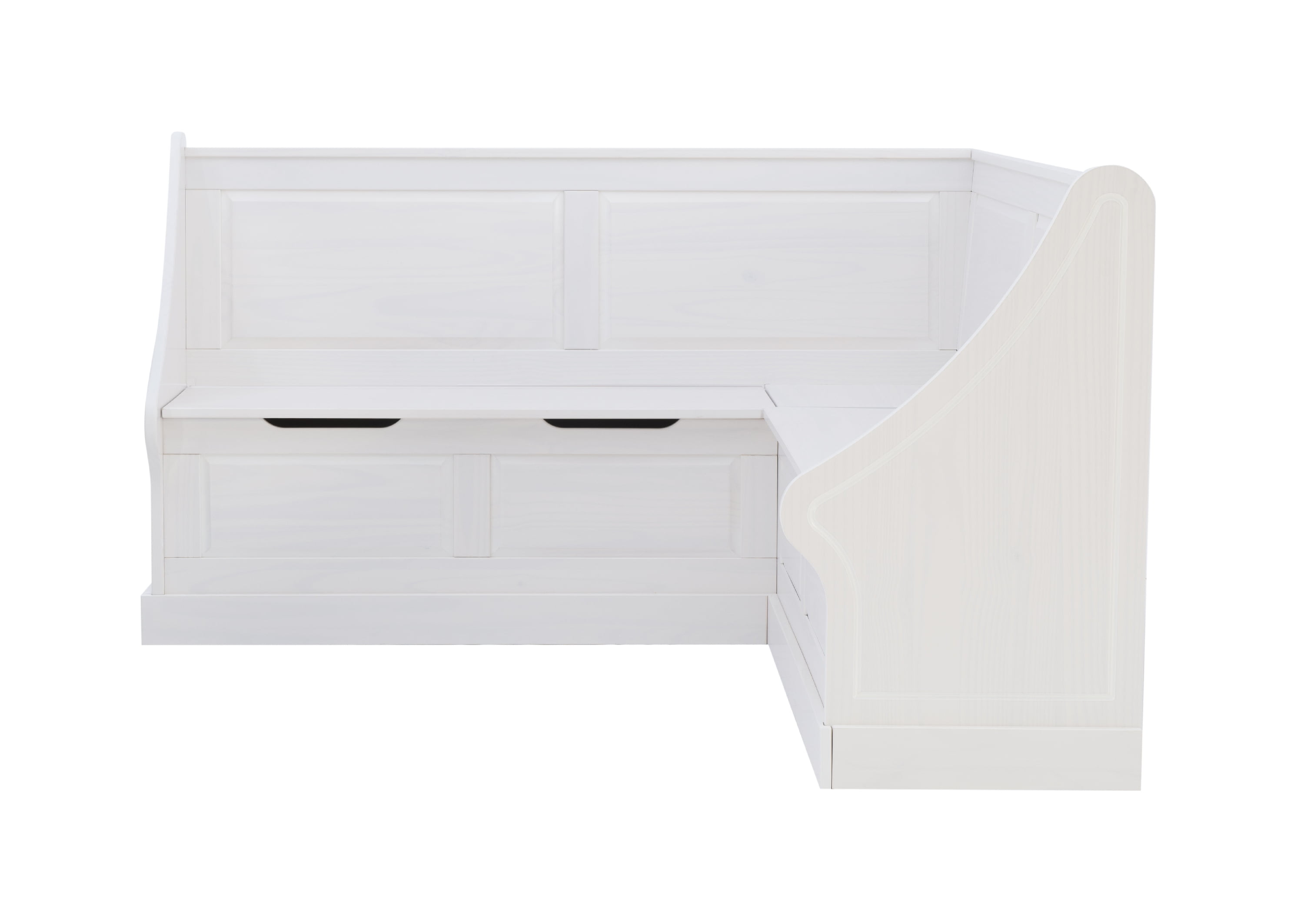 Add cozy style and useful seating to your kitchen with the Linon Tobin White Casual Corner Nook. Made from strong solid pine and finished in soft white paint, this L-shaped bench brings classic cottage charm to your home—without needing any built-in furniture. It has a paneled back, smooth curved edges, and tall backrests that give it a built-in look, but it’s made to fit easily into small spaces. Whether you’re having breakfast with family, a quick dinner, or relaxing with a cup of coffee, this nook is the perfect spot to enjoy it all. The Tobin Nook is built for everyday life. The bench seats lift up to reveal hidden storage space—great for holding tablecloths, games, or other items. Soft-close hinges and cutout handles make it easy and safe to use. The sturdy bench can hold up to 600 pounds, so it’s strong enough for daily use. With its mix of storage, comfort, and farmhouse style, this corner bench can work as a dining spot, reading nook, or even a smart storage bench in your entryway.