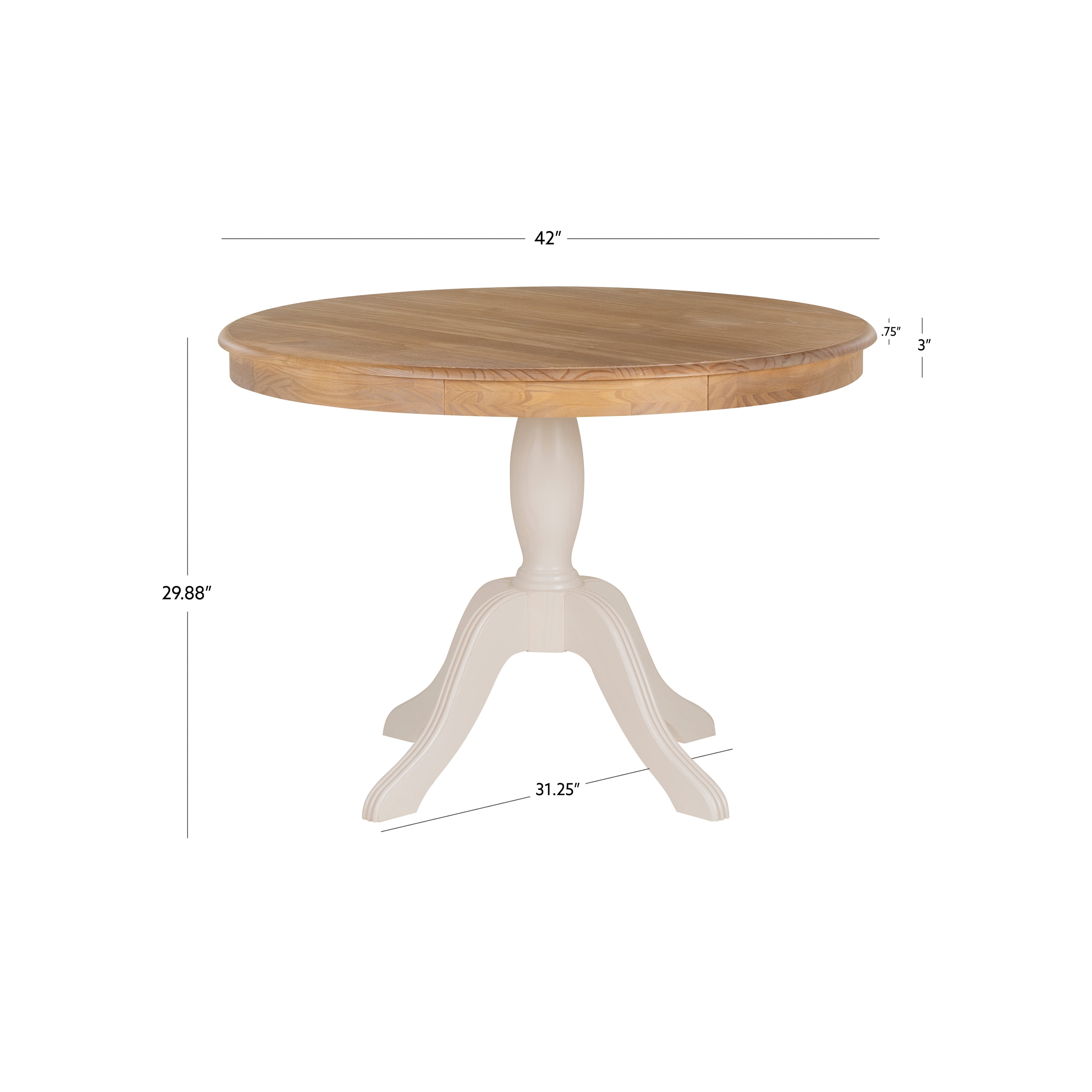 Tobin Pedestal Dining Table, Natural And White A Round Casual Dining Table Cuts Out Corners, Creating A Cozier, More Intimate Space Where Everyone Can See Everyone At The Table. This Classic 42 Inch Round Table Is Sized Right For Eat-In Kitchens Or Petite Dining Areas. Farmhouse Styling That Fits Comfortably In That Corner Breakfast Nook Area. A Beefy Pedestal In White Is Offset With A Solid Pine Top In A Natural, Light Brown Stain. Casual Dining Never Looked So Good. Perfect For Corner In Your Kitchen To Provide Additional Seating Solid Pine Table Top And Pedestal Seats Four Adults Comfortably Table Top Is 42″ In Diameter Table Top Measures 30″ From The Floor Weight Tested To 220 Lbs Two Tone Farmhouse Style Assembly Required – Finish Color: Natural/White – Product Height: 30 – Item Depth: 41.88 – Item Width: 41.88 – Assembled Size: 41.88 x 41.88 x 30 – Finish Family: White – Weight Limits / Lbs: 220