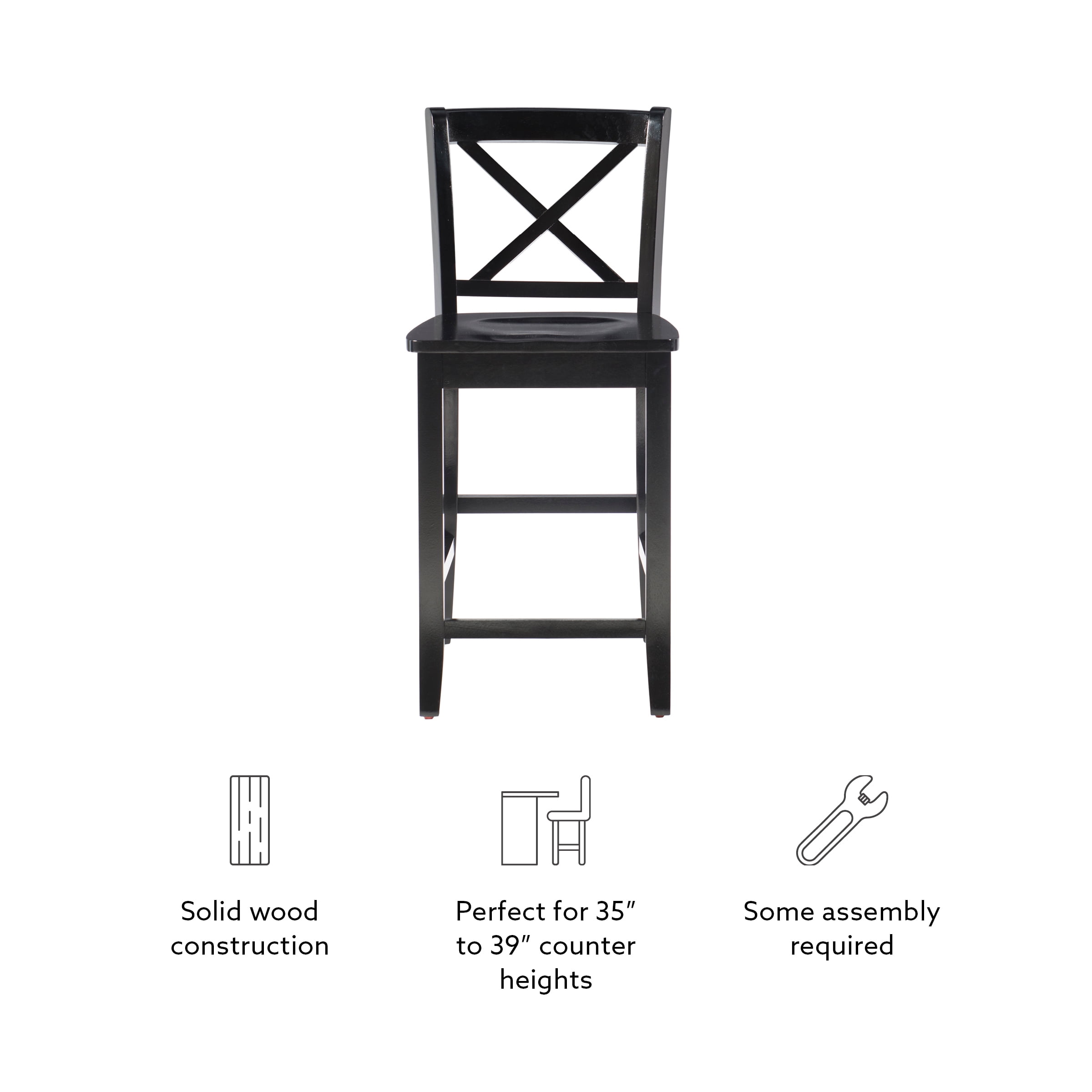 Sturdy solid rubberwood construction Black wood painted finish compliments a range of décor styles Easy care, simply wipe clean with a damp cloth Classic x back design Comfortable shaped wood seat Backrest and footrests provide proper support making the stool comfortable for long periods of time Suitable with counter heights of 35in to 39in Buy two or more to make a beautiful design statement in your home You will need one stool for every 30″ of horizontal counter space Easy to assembly, instructions included 275 lb weight limit Condition: New