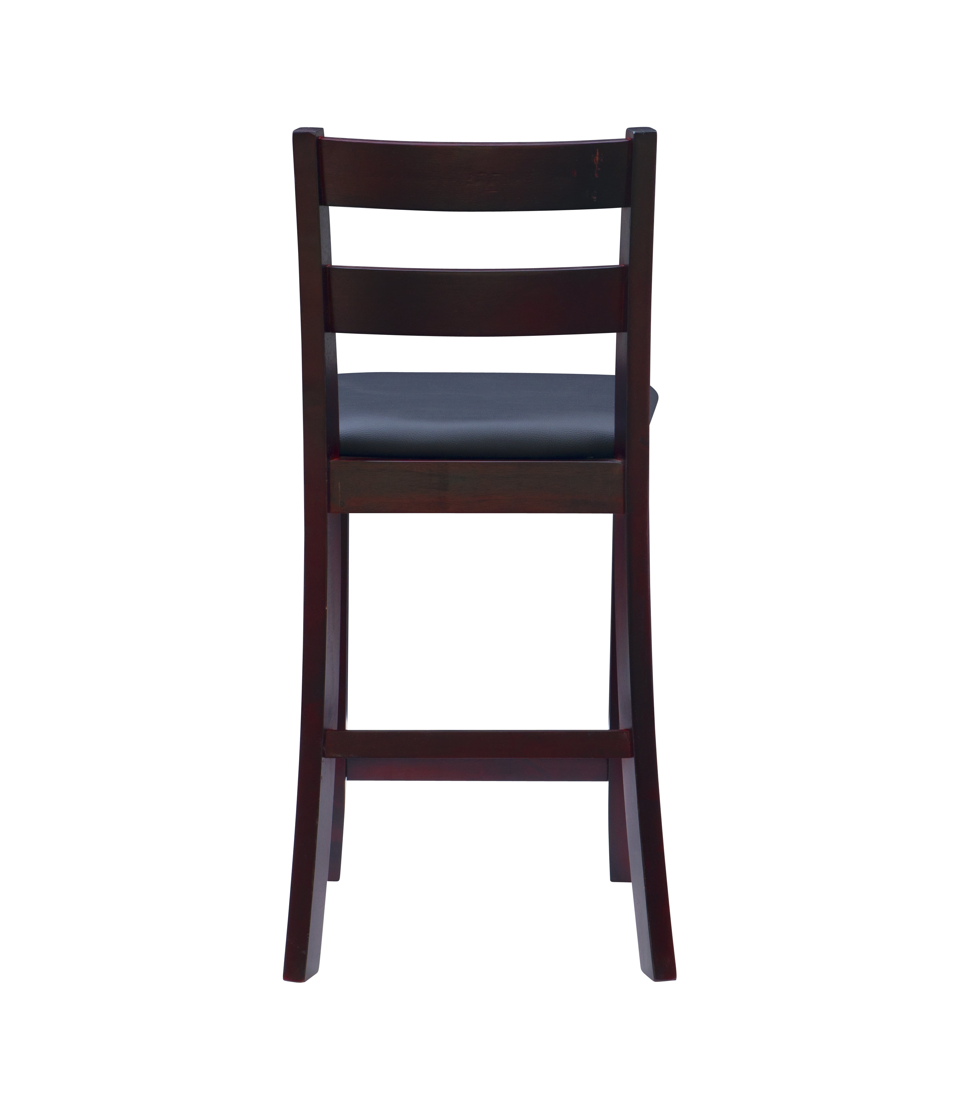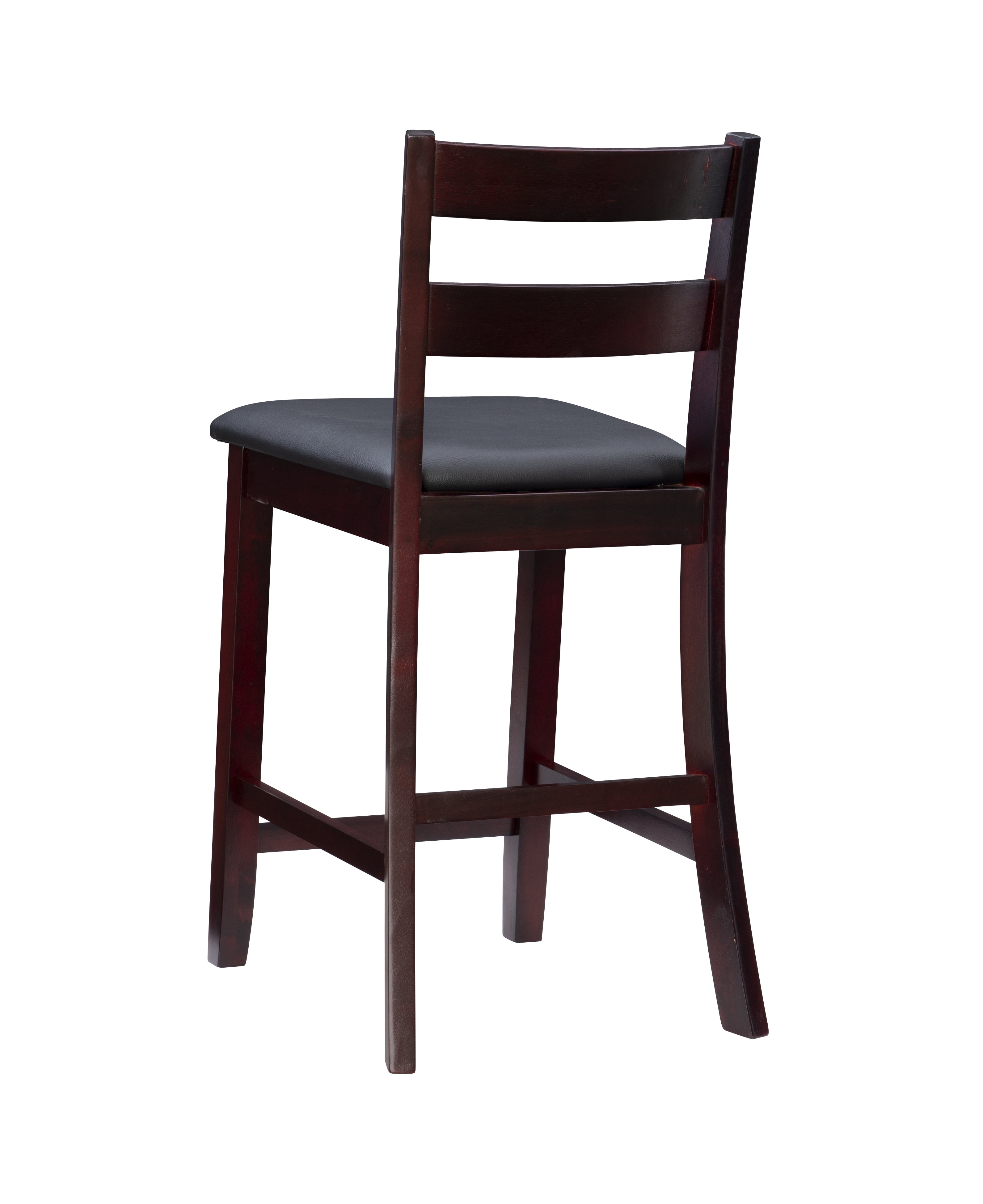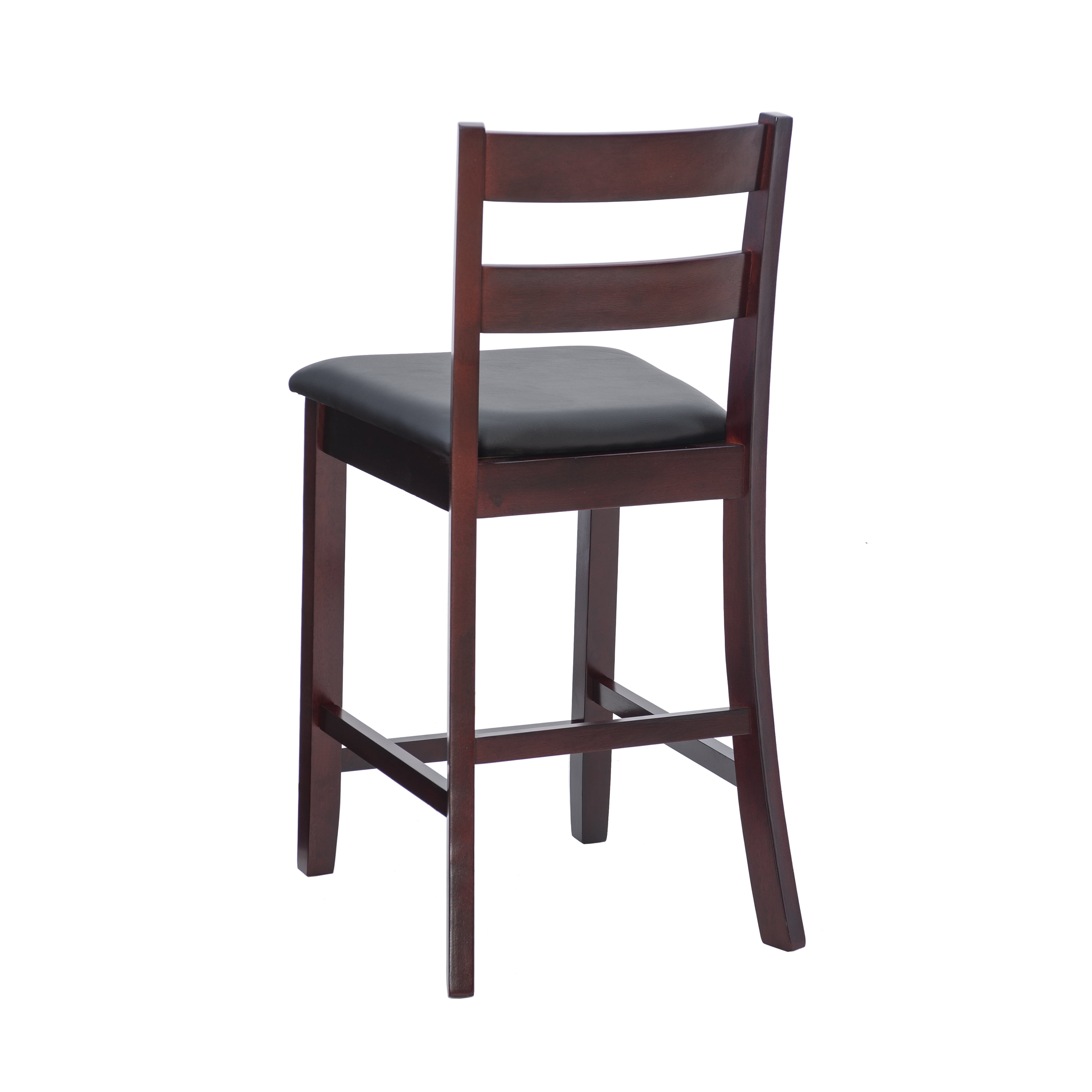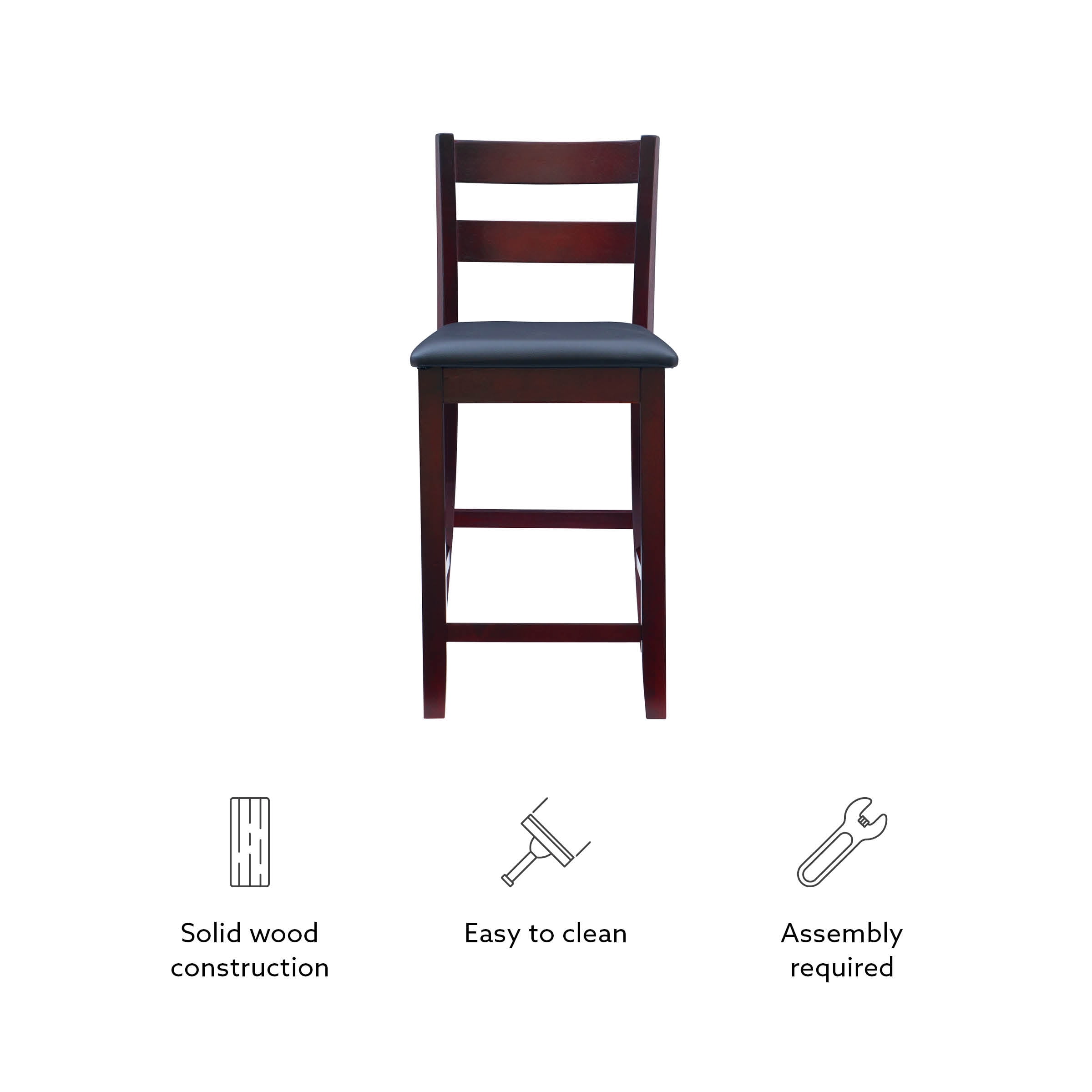 Sturdy solid rubberwood construction Dark merlot stained wood compliments a range of décor styles Easy care, simply wipe clean with a damp cloth Elegant ladder back design Padded seat covered in black faux leather is easy care, simply wipe clean with a damp cloth Backrest and footrests provide proper support making the stool comfortable for long periods of time Suitable with counter heights of 35in to 39in Buy two or more to make a beautiful design statement in your home You will need one stool for every 30″ of horizontal counter space Easy to assembly, instructions included 350 lb weight limit Condition: New