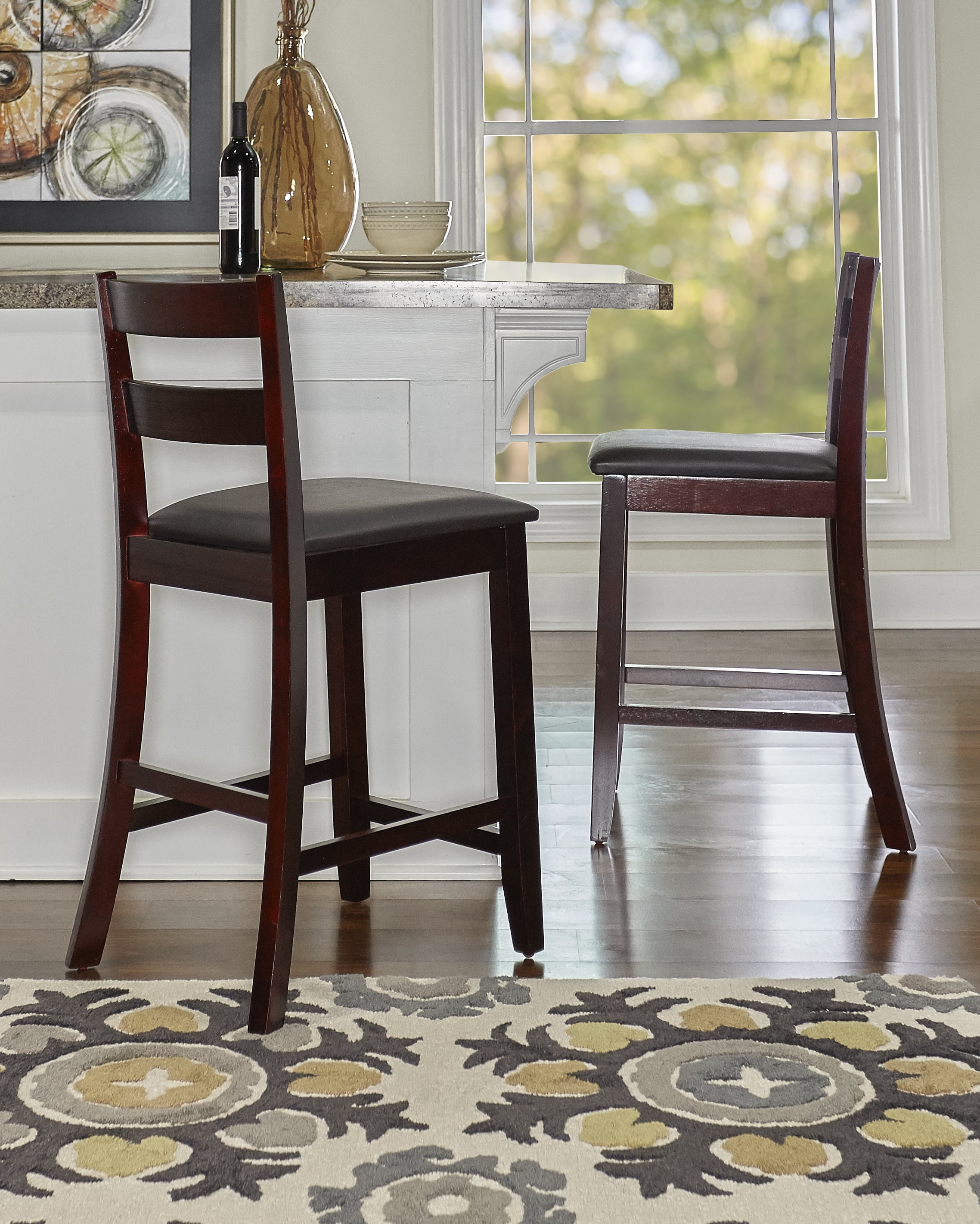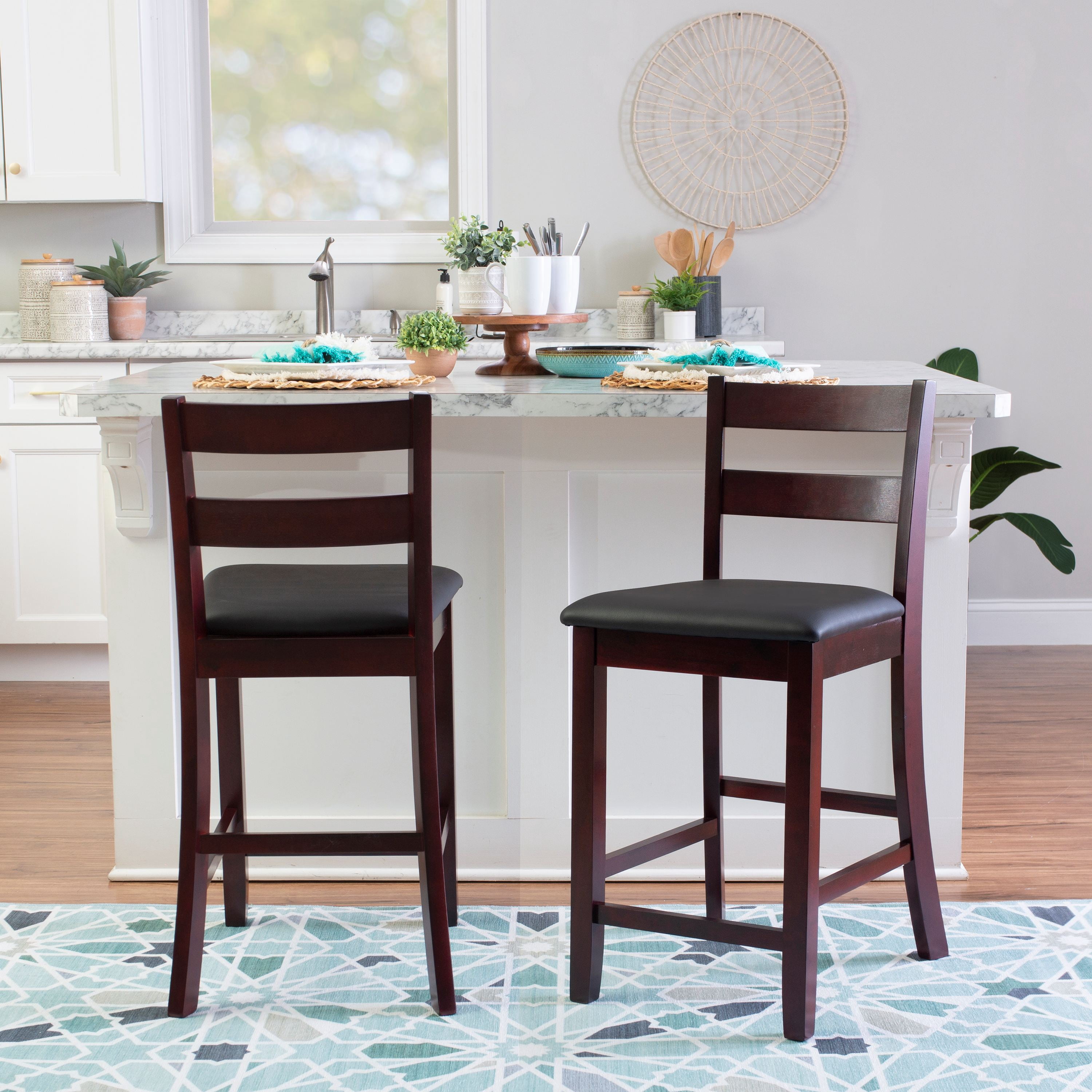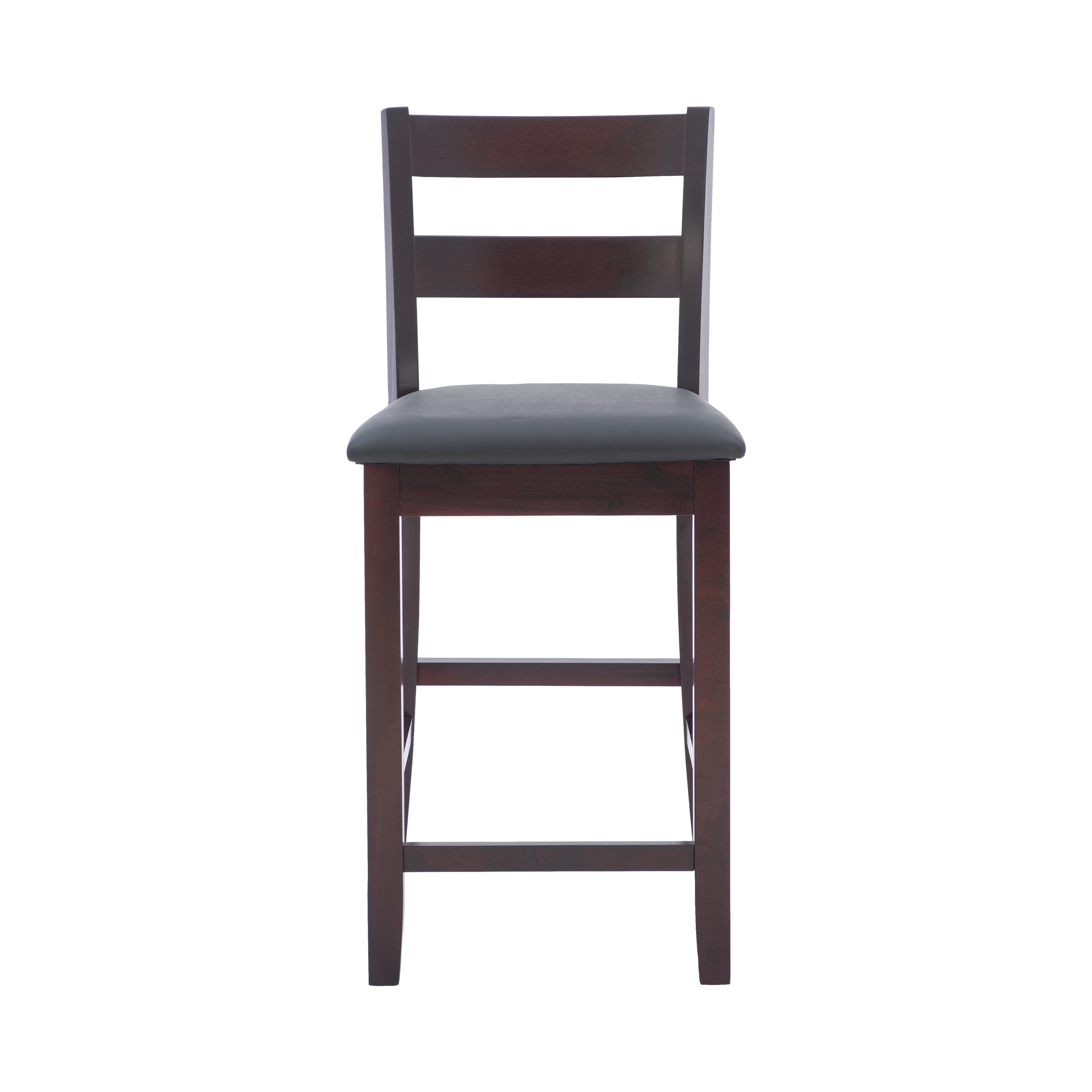Sturdy solid rubberwood construction Dark merlot stained wood compliments a range of décor styles Easy care, simply wipe clean with a damp cloth Elegant ladder back design Padded seat covered in black faux leather is easy care, simply wipe clean with a damp cloth Backrest and footrests provide proper support making the stool comfortable for long periods of time Suitable with counter heights of 35in to 39in Buy two or more to make a beautiful design statement in your home You will need one stool for every 30″ of horizontal counter space Easy to assembly, instructions included 350 lb weight limit Condition: New