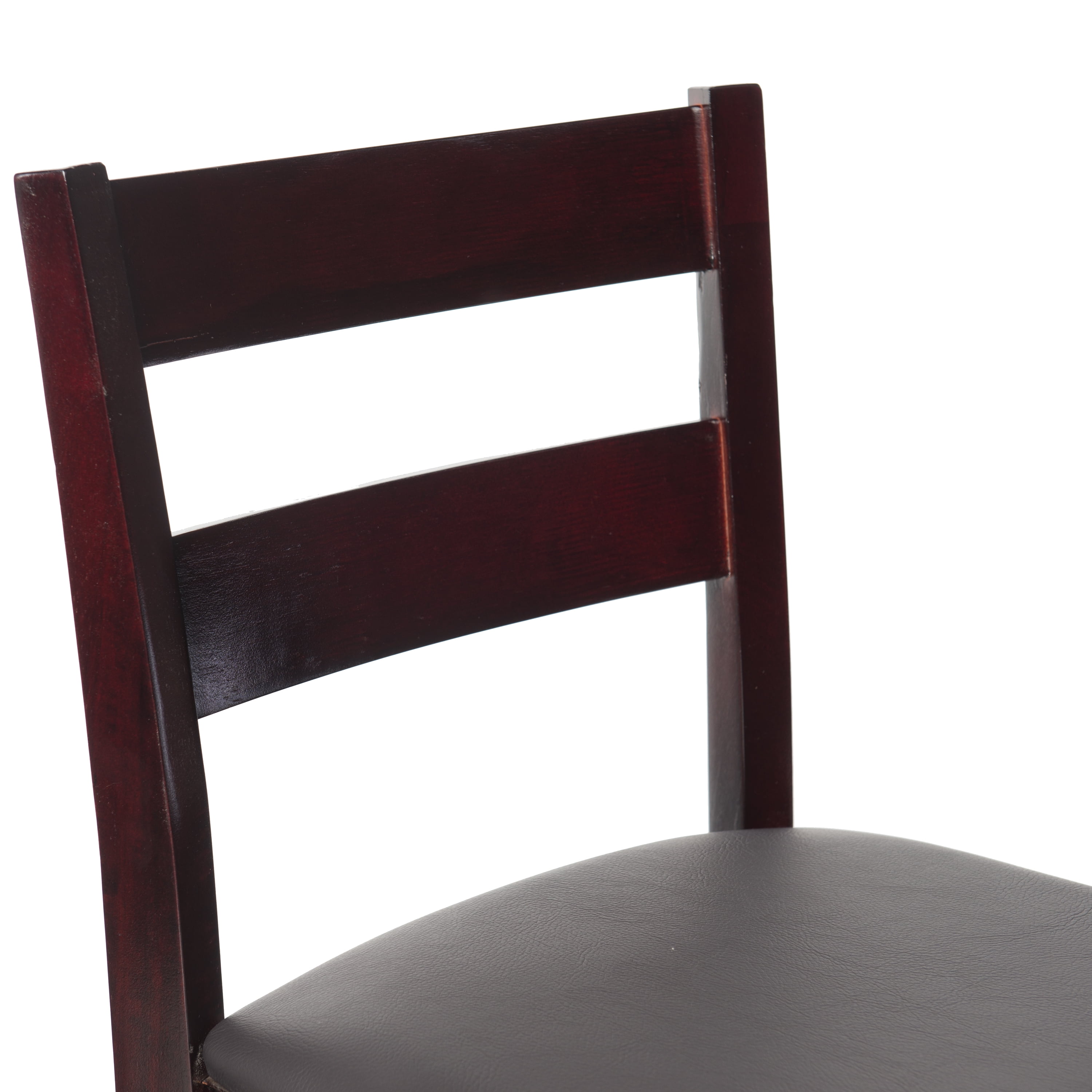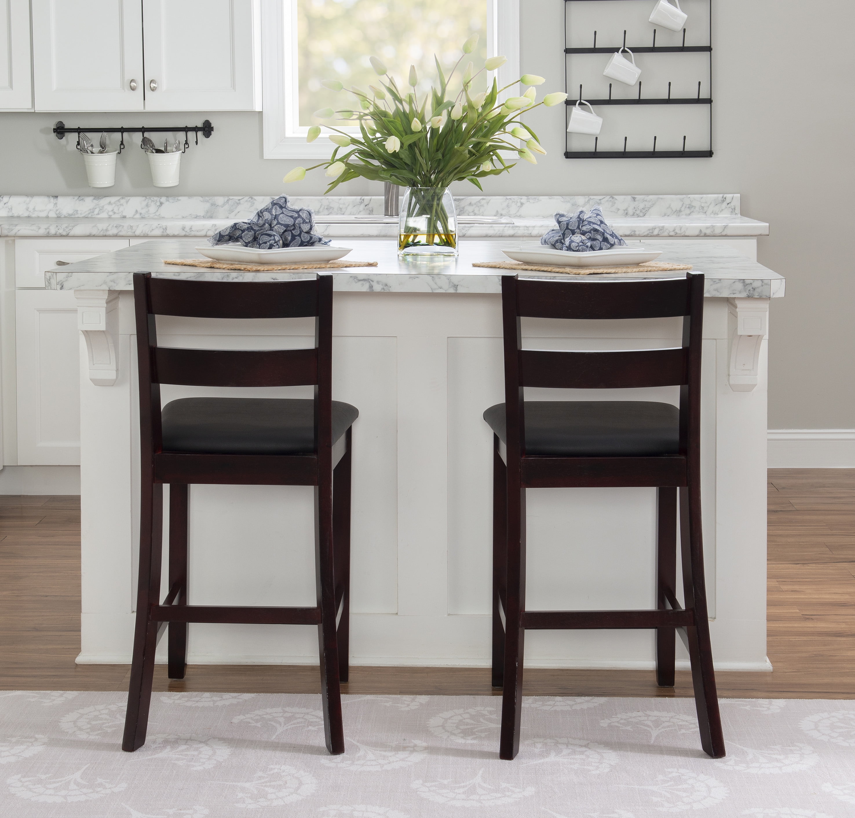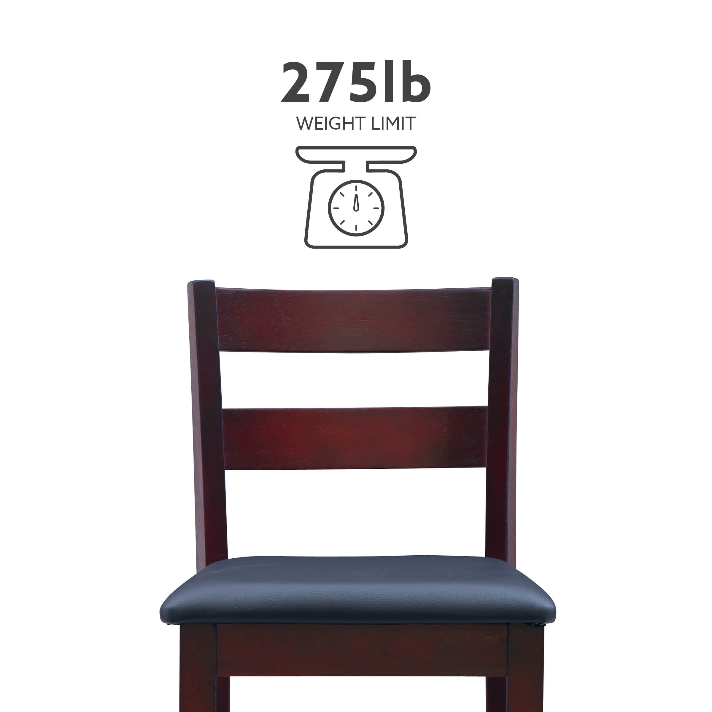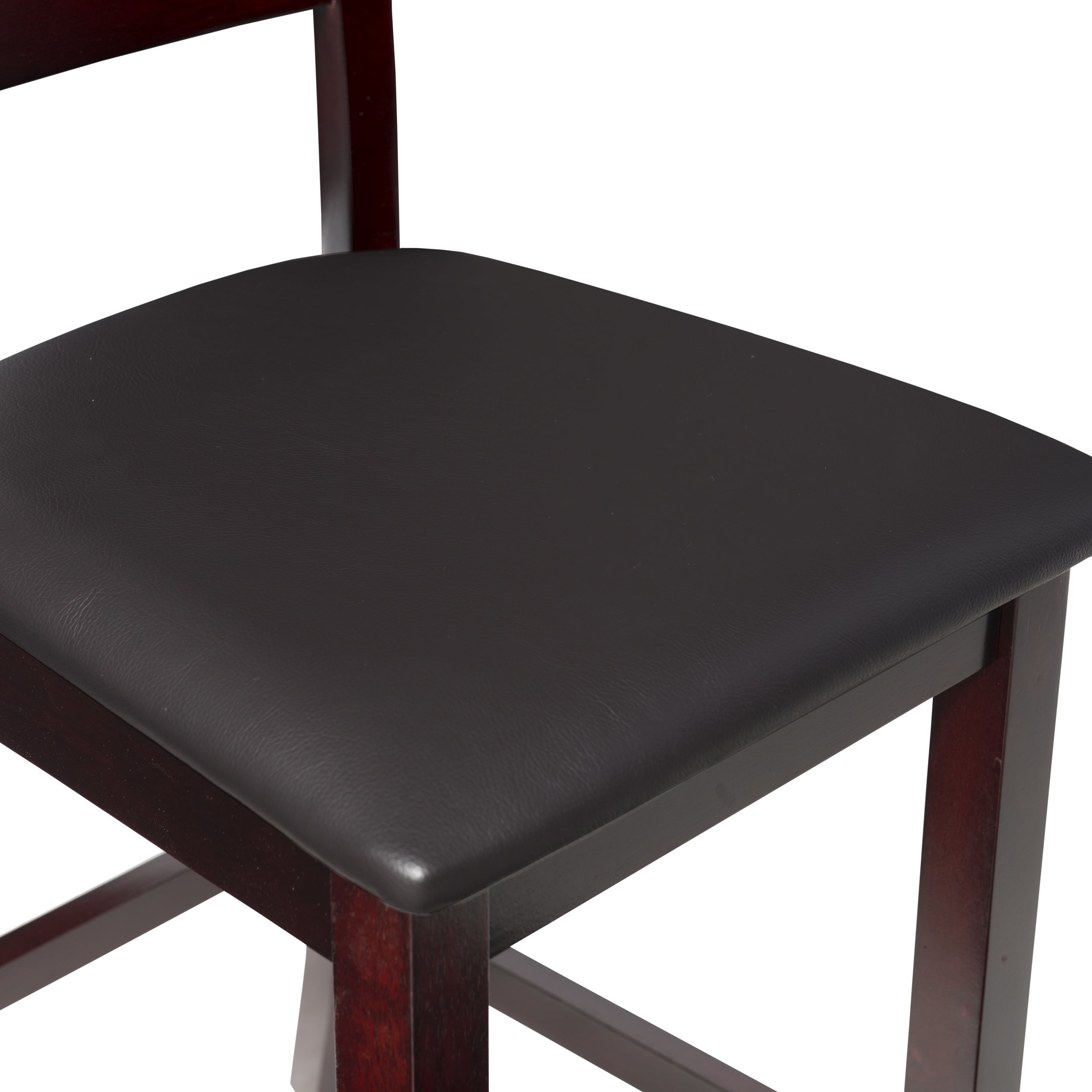 Sturdy solid rubberwood construction Dark merlot stained wood compliments a range of décor styles Easy care, simply wipe clean with a damp cloth Elegant ladder back design Padded seat covered in black faux leather is easy care, simply wipe clean with a damp cloth Backrest and footrests provide proper support making the stool comfortable for long periods of time Suitable with counter heights of 35in to 39in Buy two or more to make a beautiful design statement in your home You will need one stool for every 30″ of horizontal counter space Easy to assembly, instructions included 350 lb weight limit Condition: New