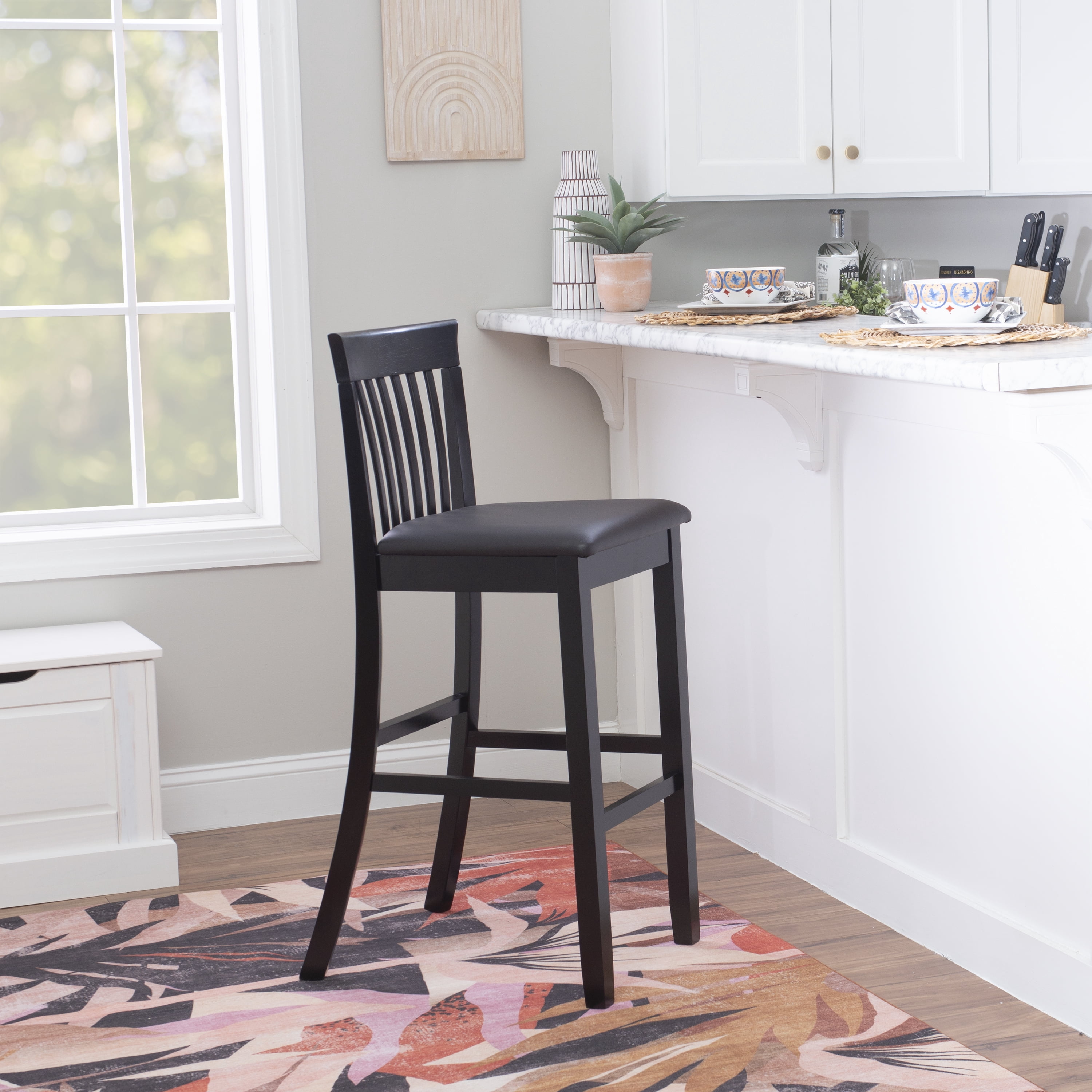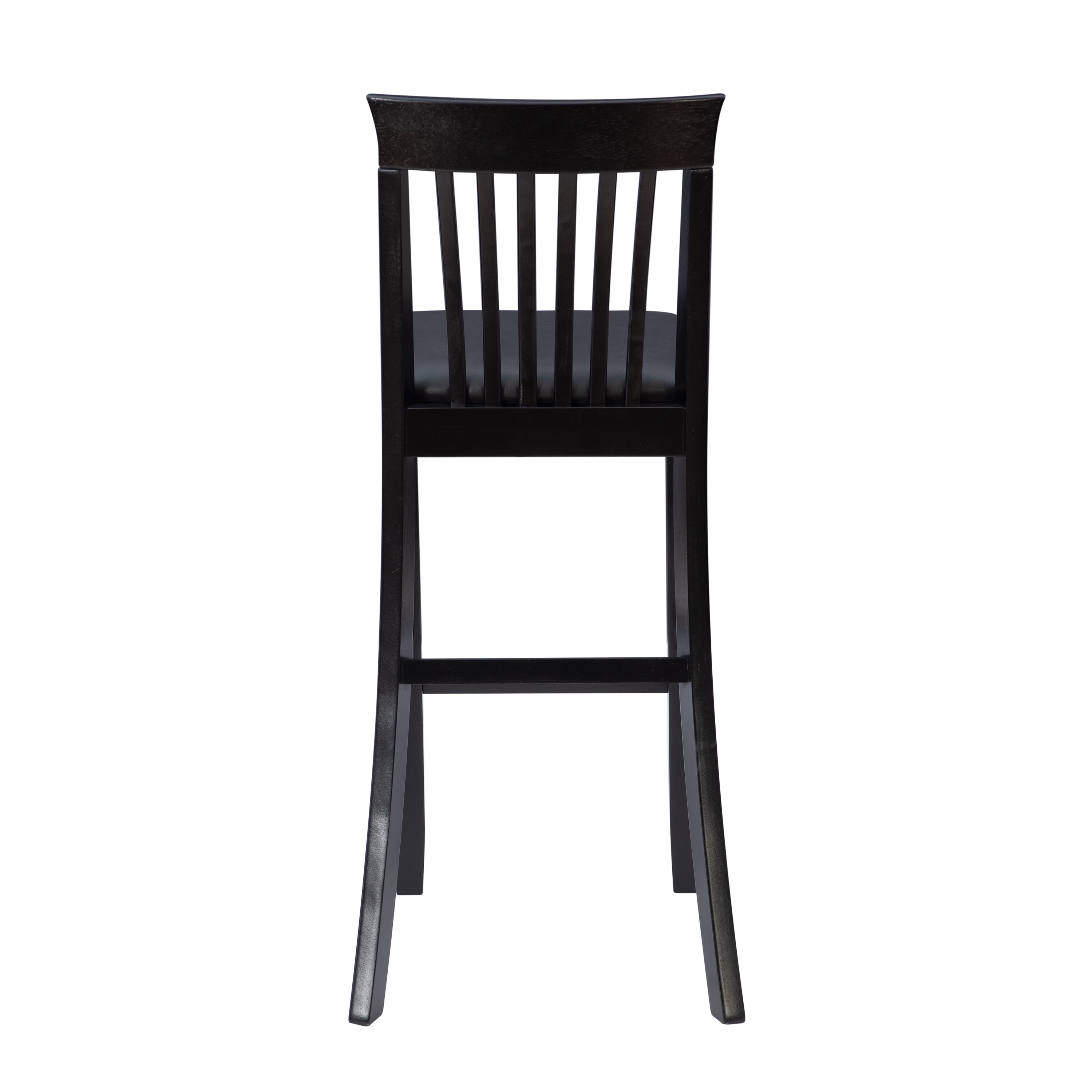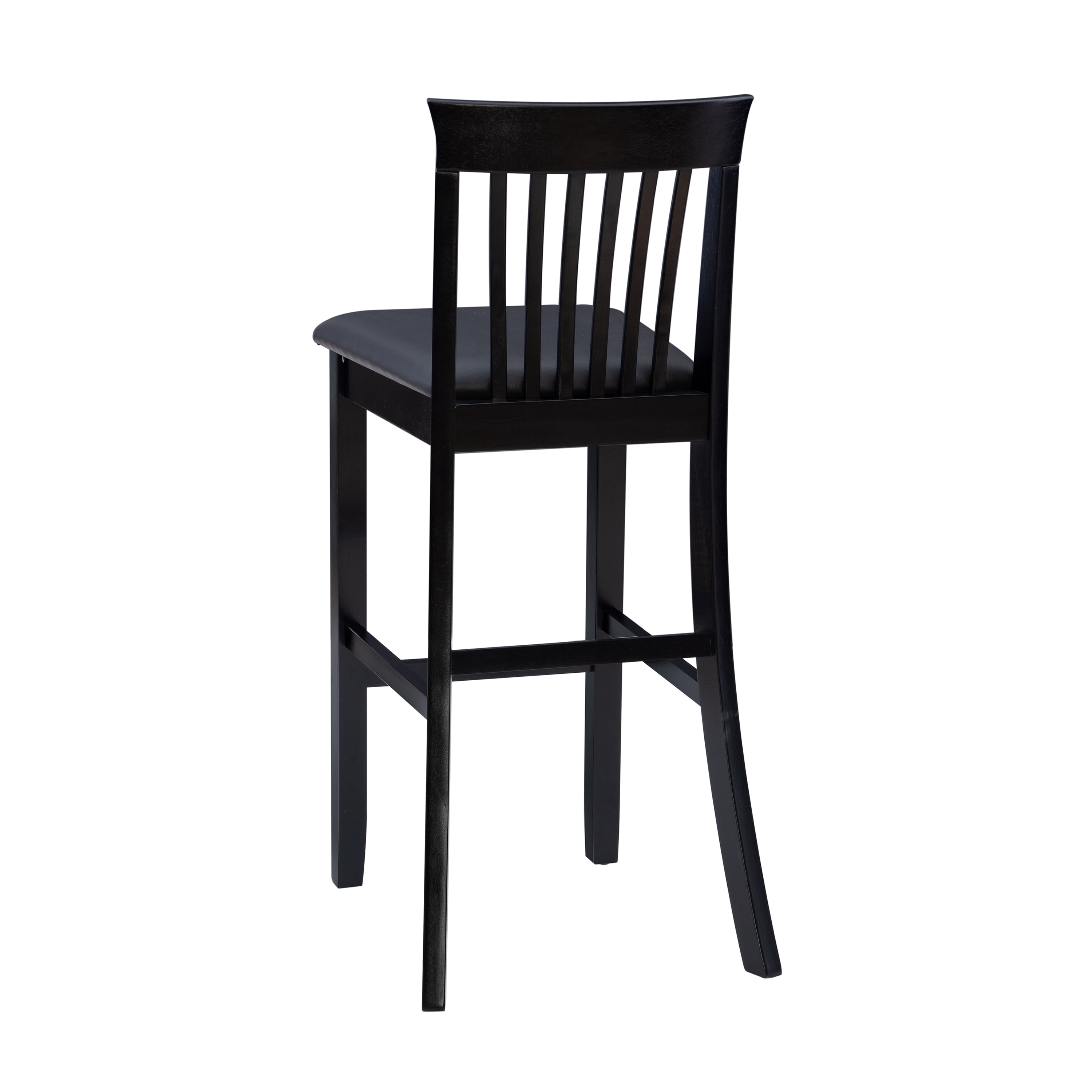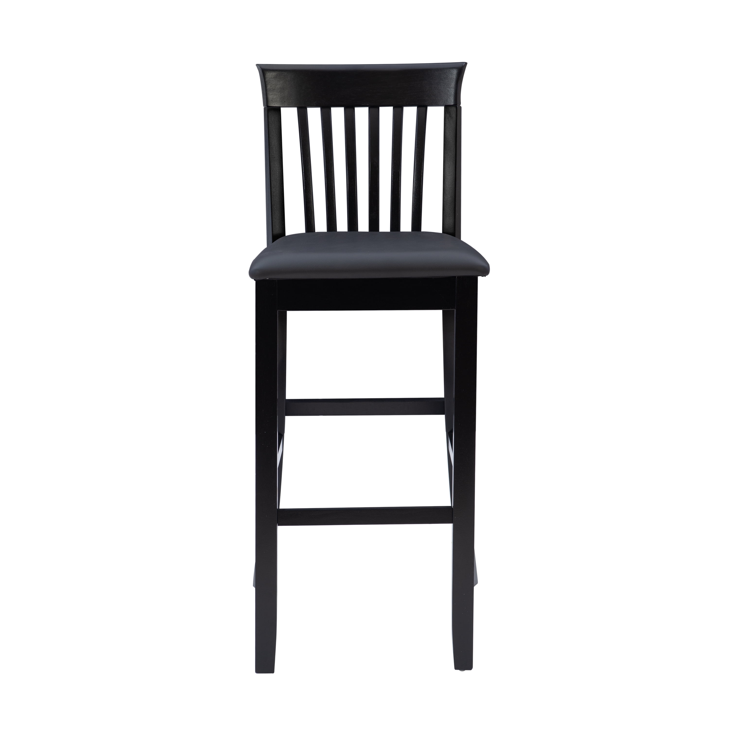 Sturdy solid rubberwood construction Black wood painted finish compliments a range of décor styles Easy care, simply wipe clean with a damp cloth Classic mission slat back design Padded seat covered in black faux leather is easy care, simply wipe clean with a damp cloth Backrest and footrests provide proper support making the stool comfortable for long periods of time Suitable with bar heights of 41in to 43in Buy two or more to make a beautiful design statement in your home You will need one stool for every 30″ of horizontal counter space Easy to assembly, instructions included 275 lb weight limit Condition: New