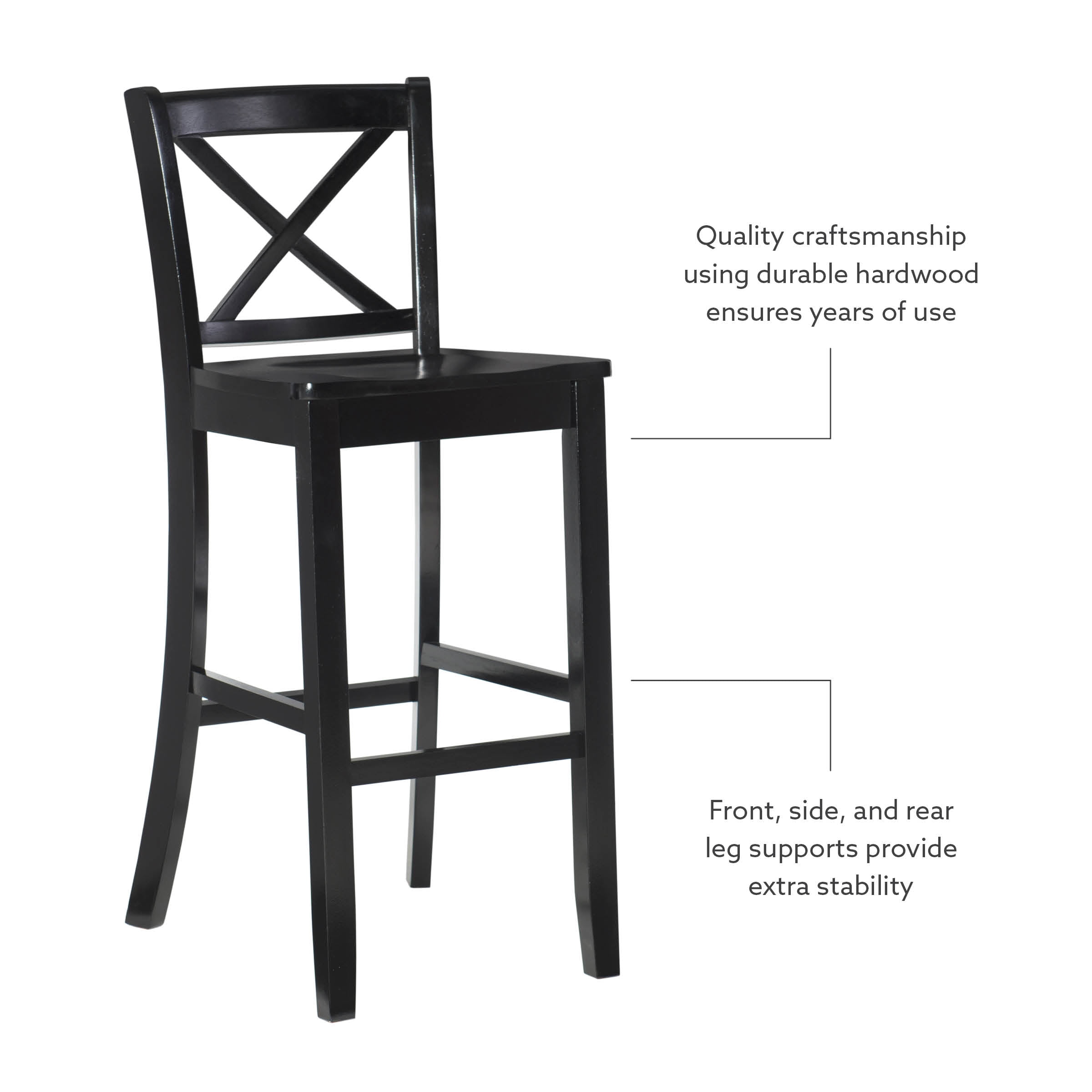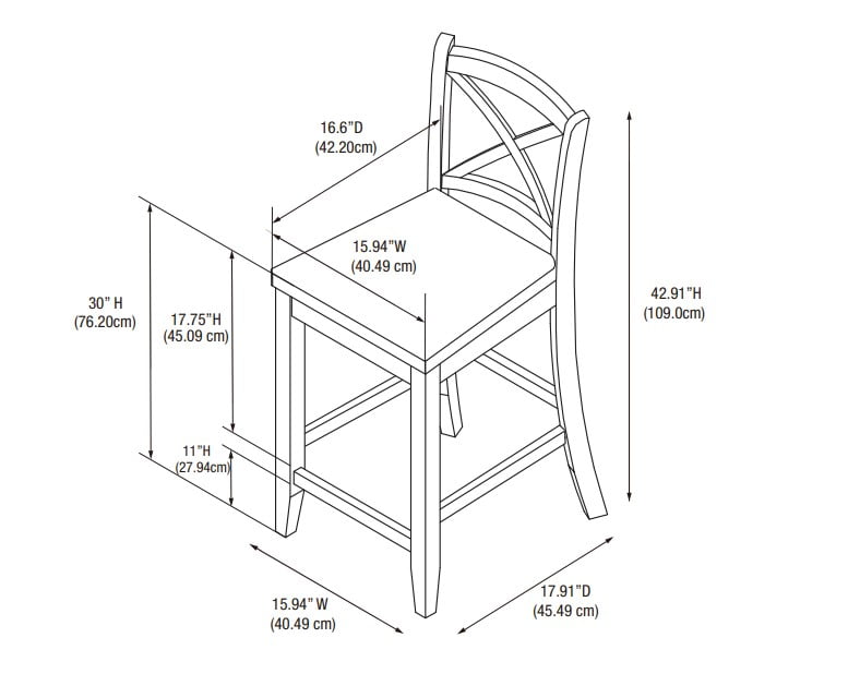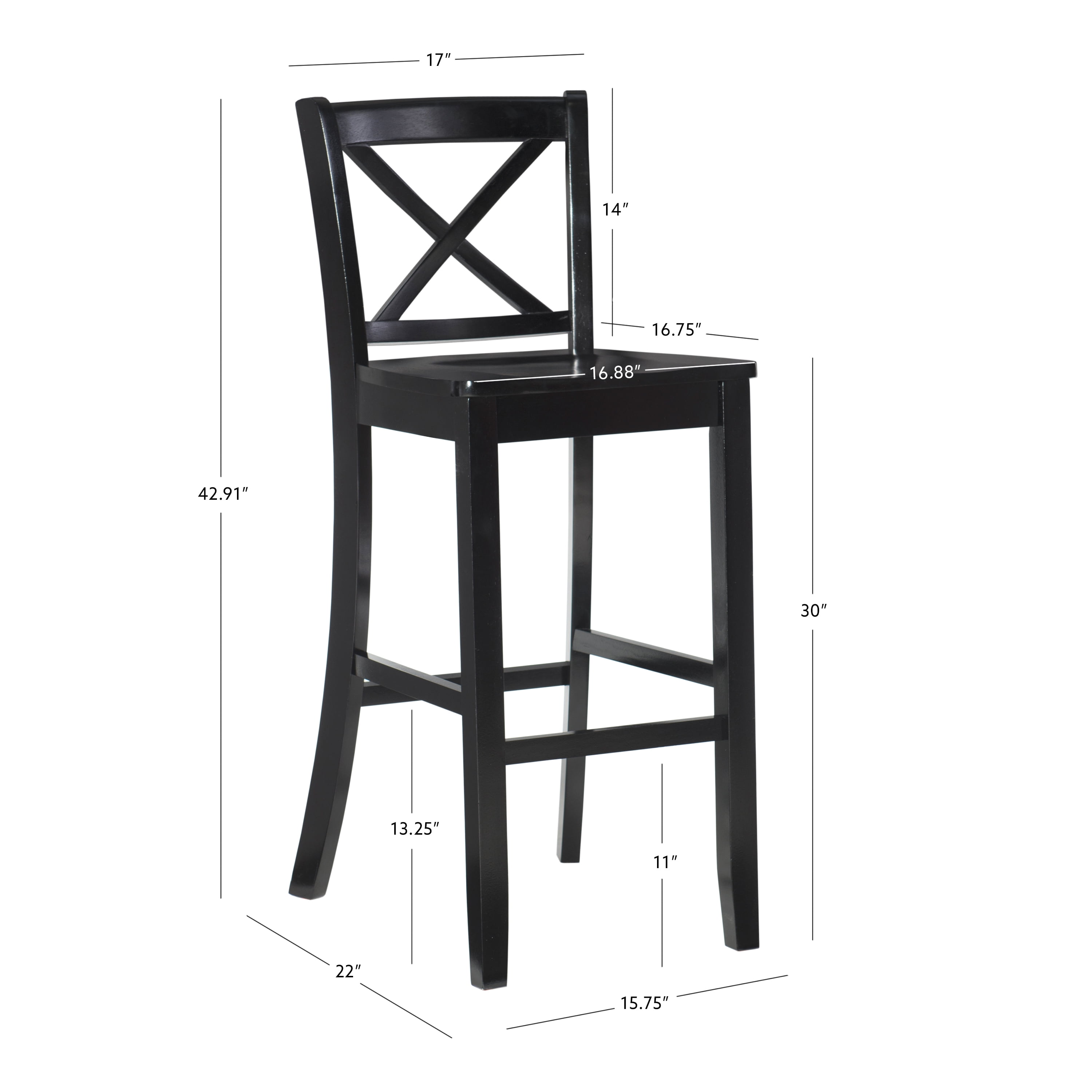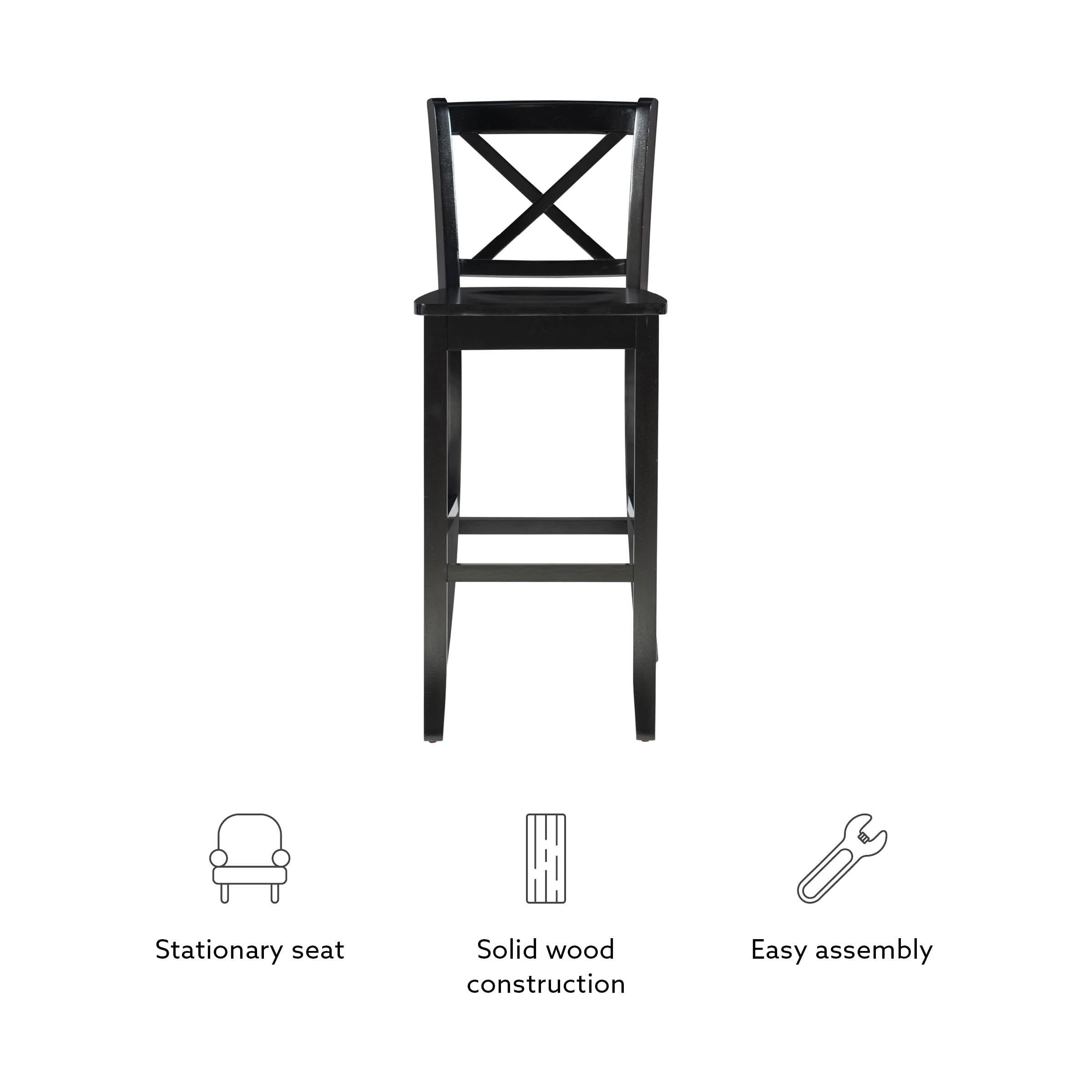 Sturdy solid rubberwood construction Black wood painted finish compliments a range of décor styles Easy care, simply wipe clean with a damp cloth Classic x back design Comfortable shaped wood seat Backrest and footrests provide proper support making the stool comfortable for long periods of time Suitable with bar heights of 41in to 43in Buy two or more to make a beautiful design statement in your home You will need one stool for every 30″ of horizontal counter space Easy to assembly, instructions included 275 lb weight limit Condition: New