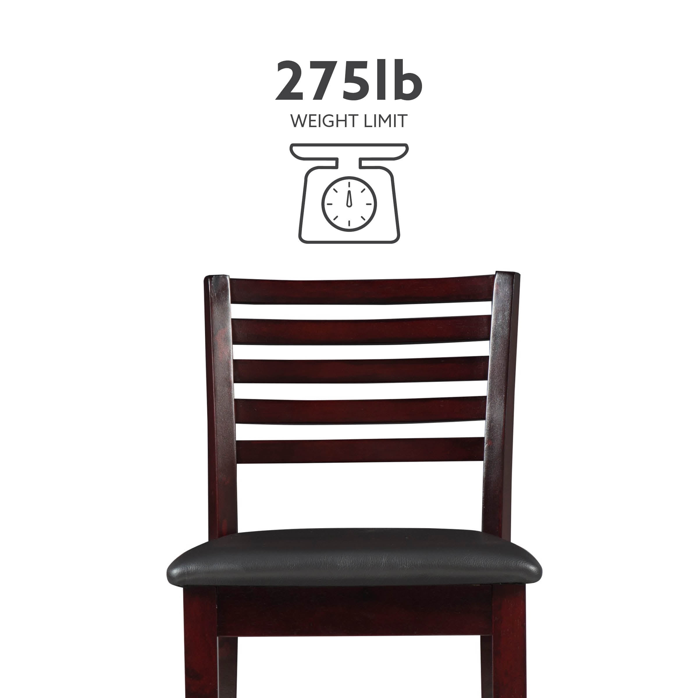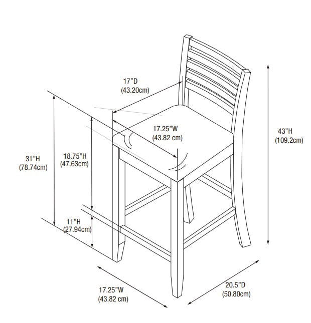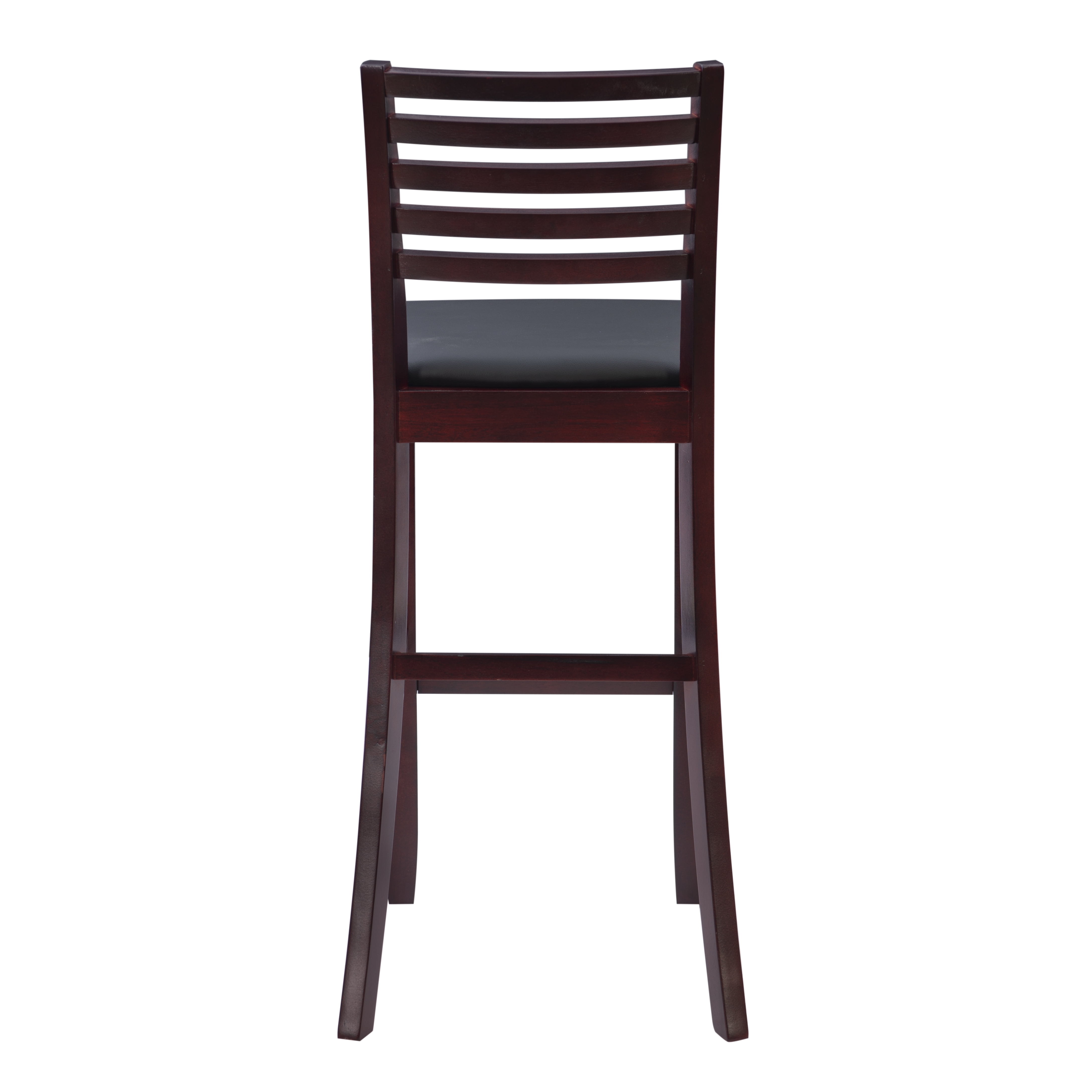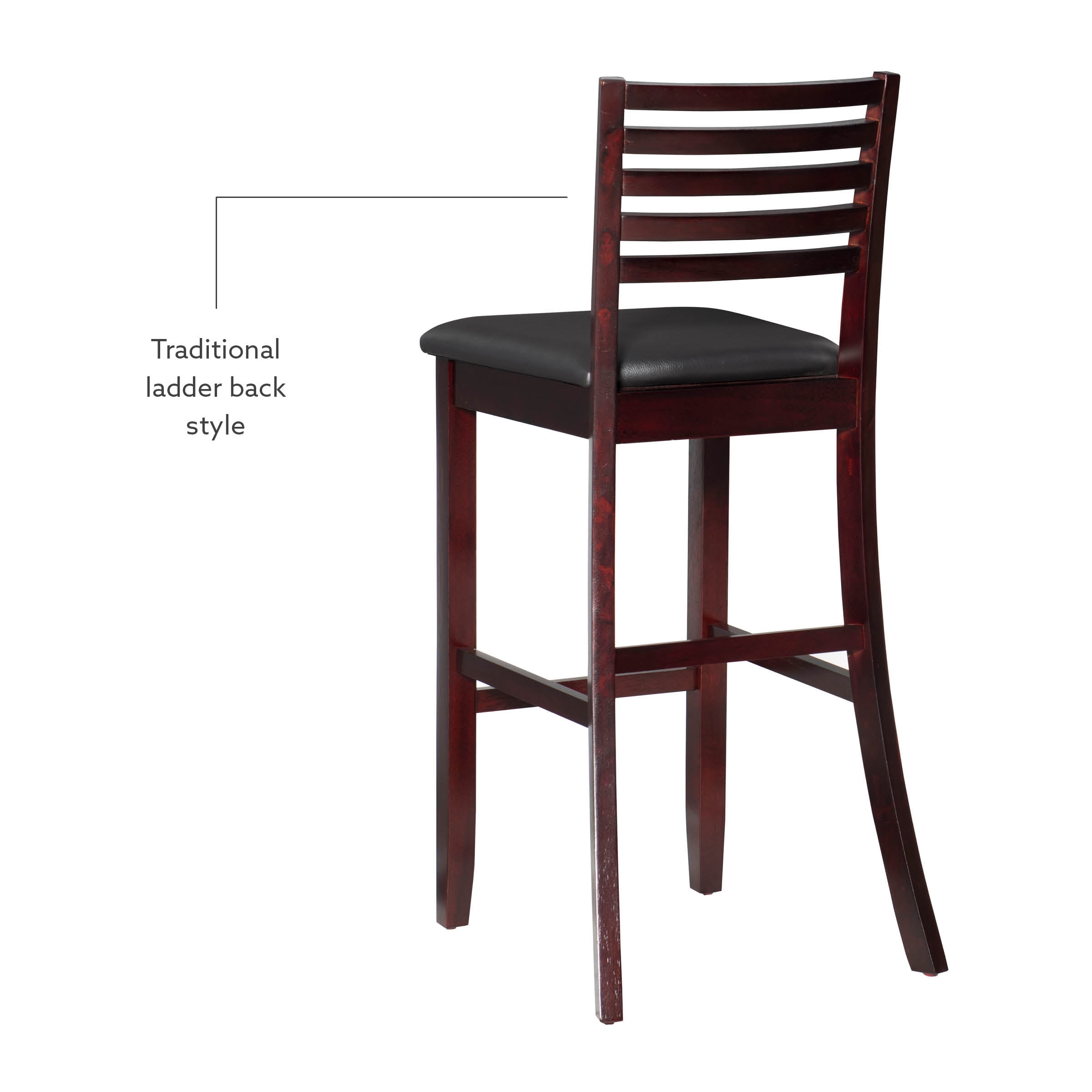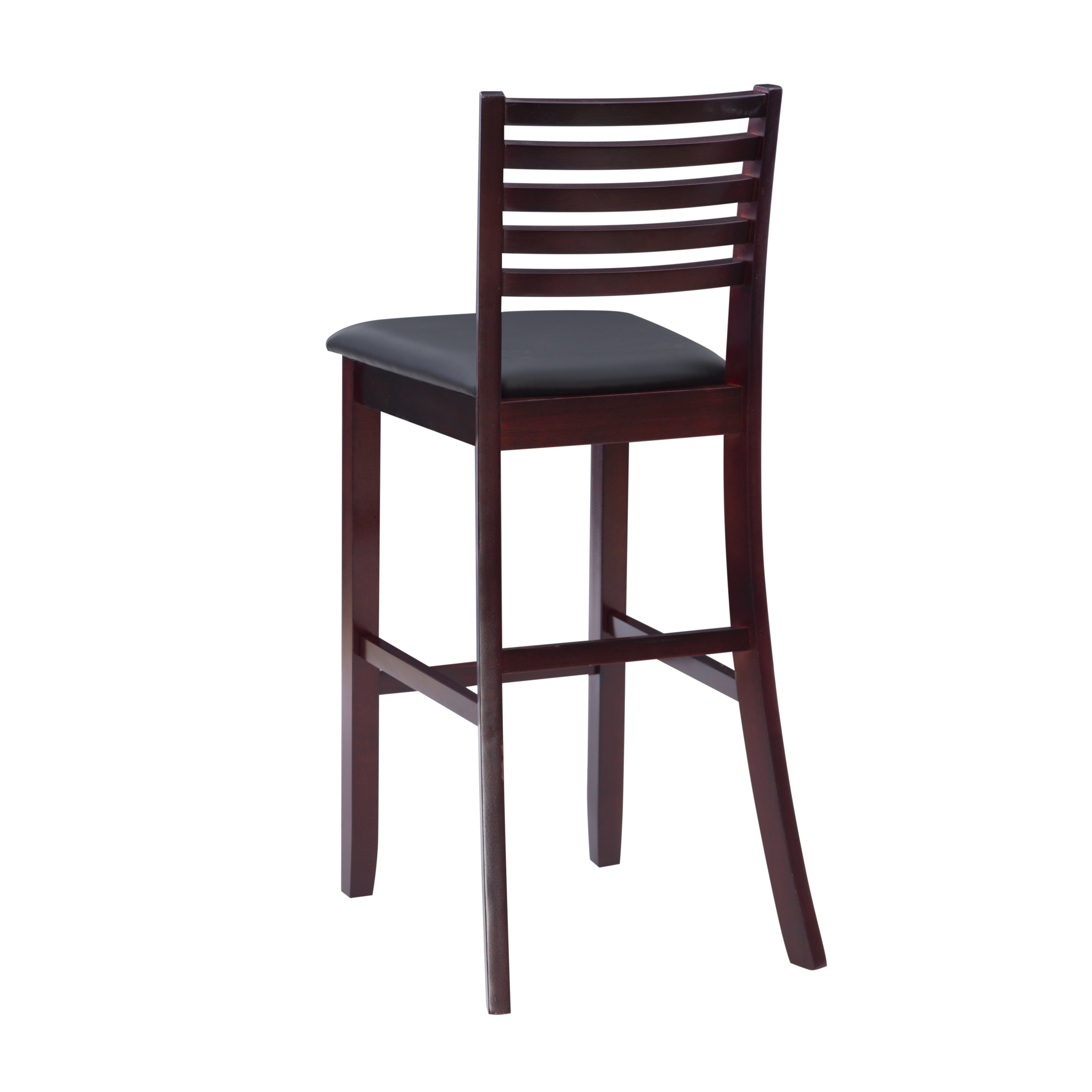 Crafted from Rubberwood, Bentwood, Hardwood, Plywood Dark Brown Faux Leather Upholstery (83% Polyurethane, 17% Polyester) Dark merlot stained wood compliments a range of décor styles Sturdy solid rubberwood construction and quality craftsmanship Bar Height Padded seat covered in black faux leather is easy care, simply wipe clean with a damp cloth Modern updated ladder back design Backrest and footrests provide proper support making the stool comfortable for long periods of time Suitable with bar heights of 41″ to 43″ Buy two or more to make a beautiful design statement in your home You will need one stool for every 30″ of horizontal counter space Condition: New