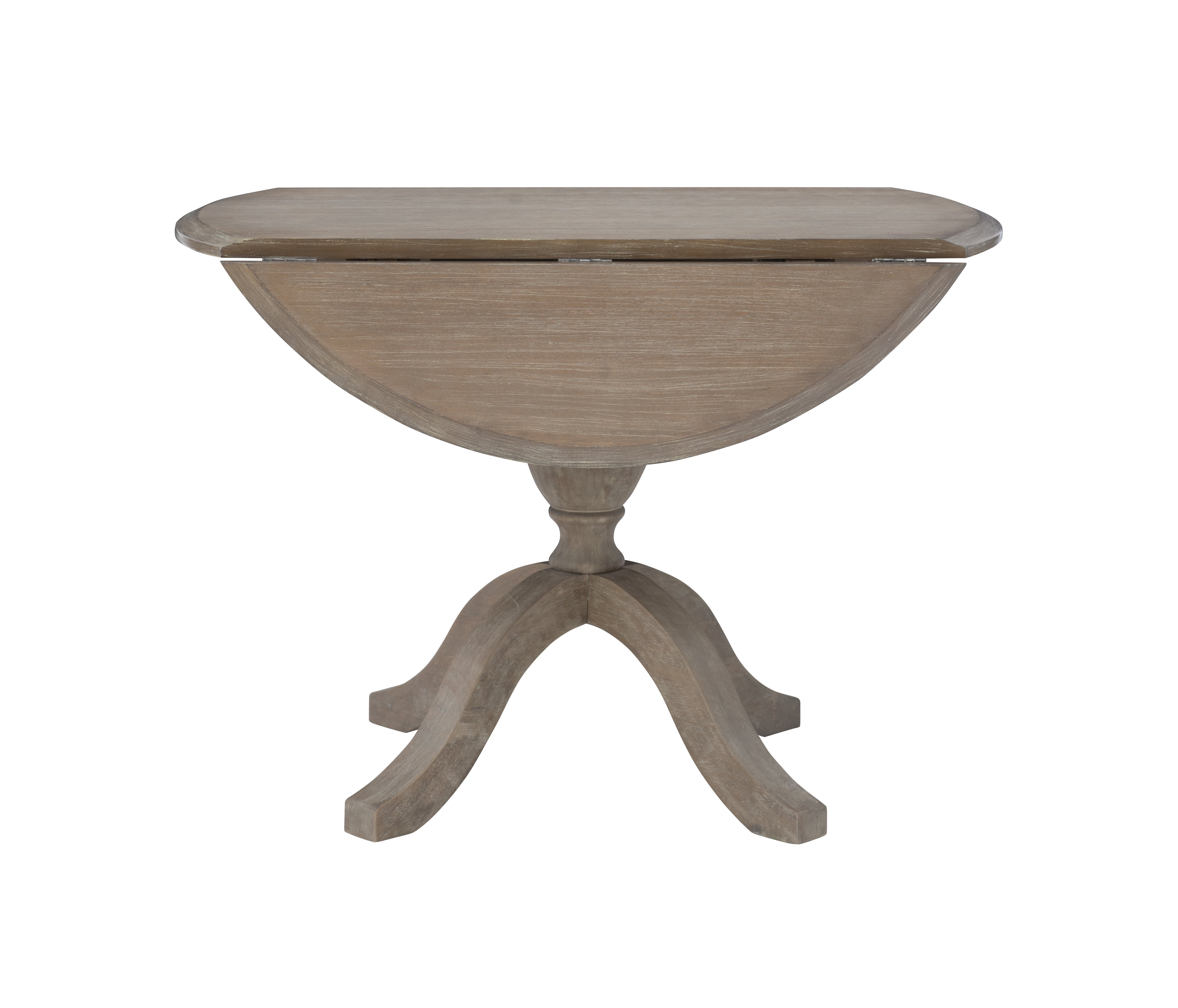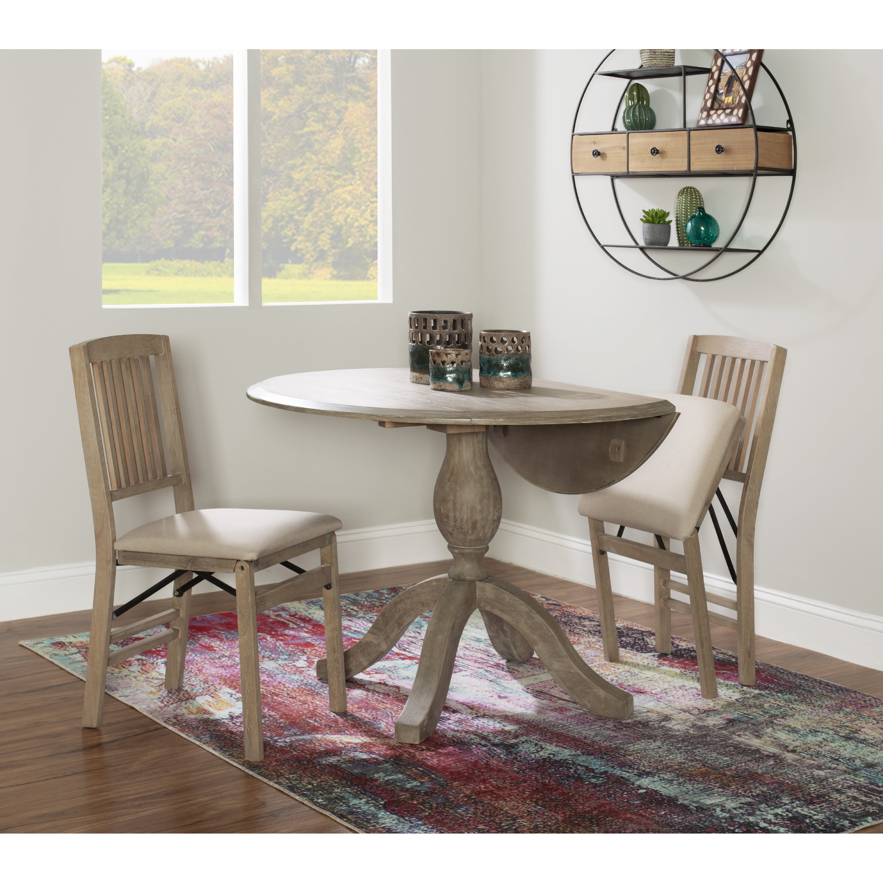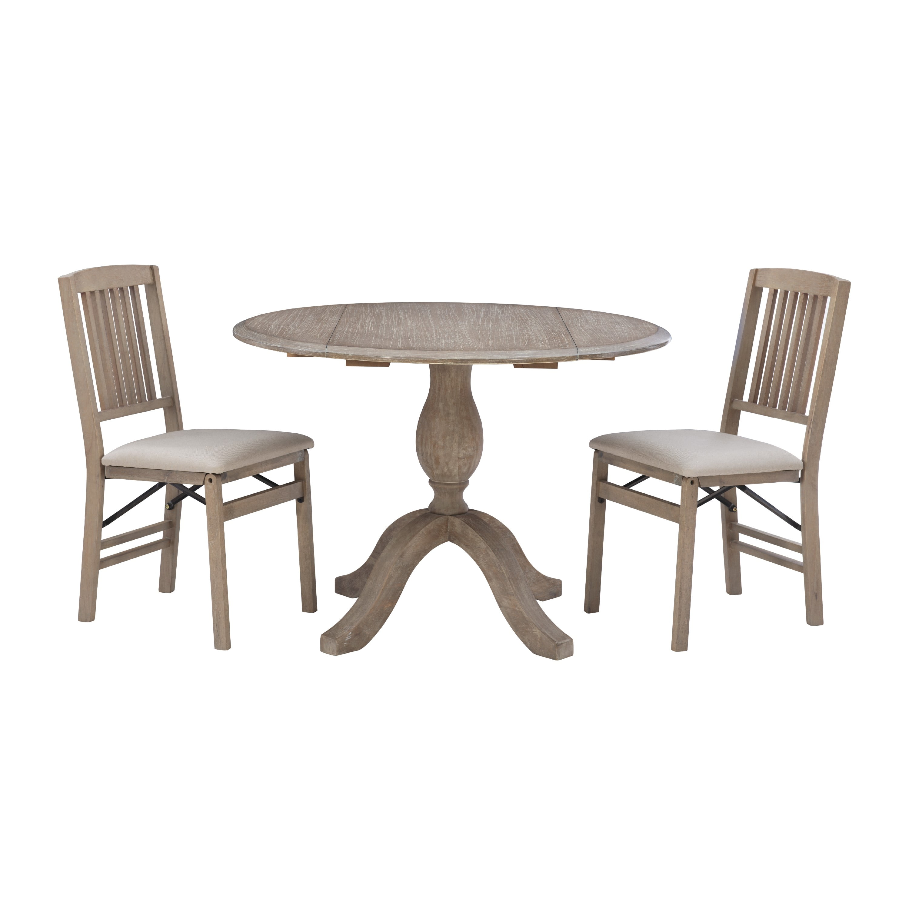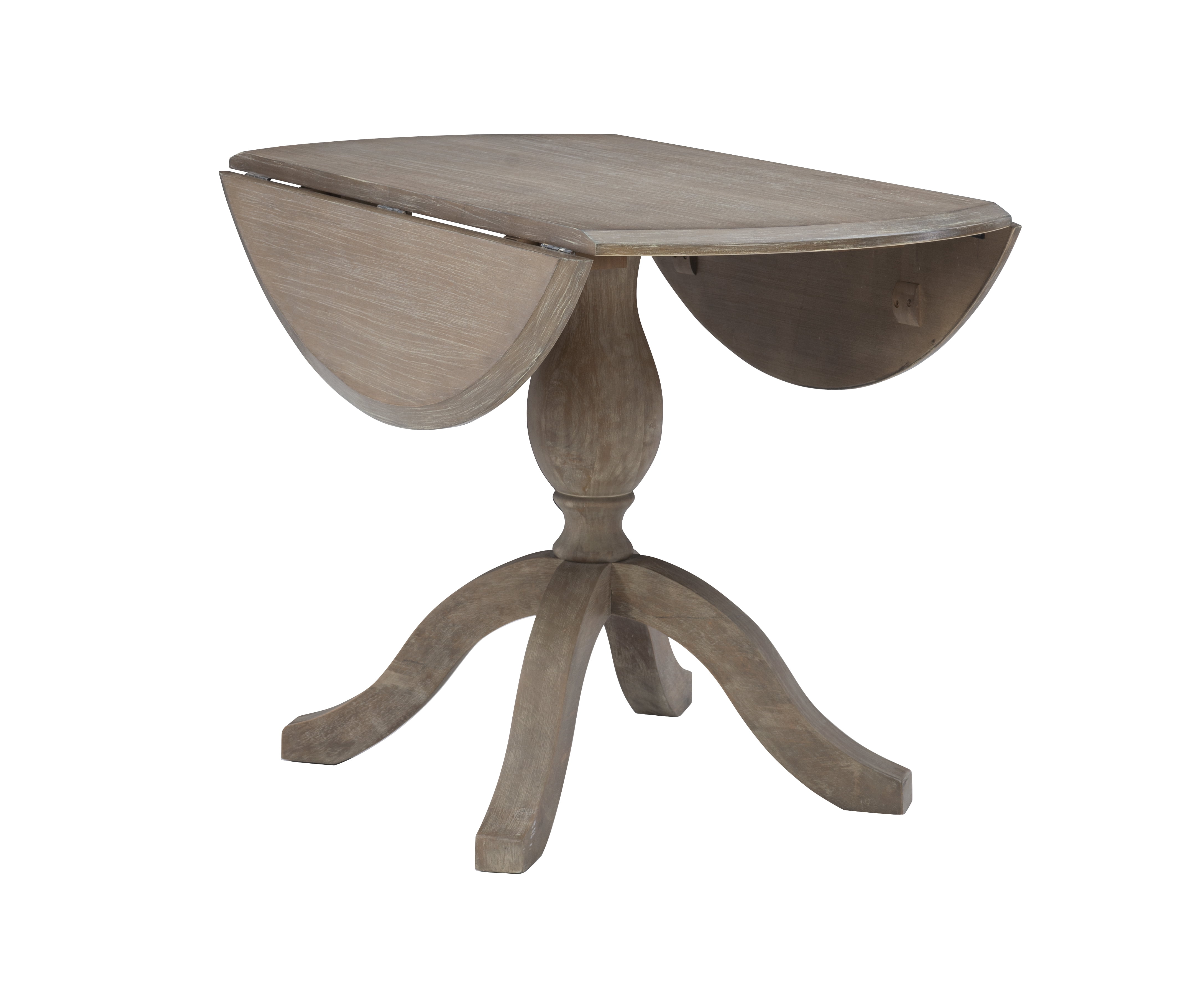 Assembled Size (W x D x H): 42 x 42 x 30 inches Assembled Weight(Lbs): 33.08 Rustic Grey Wash Finish: A rustic grey wash finish features a lacquer coating giving it a subtle sheen that accents the clean transitional design cues and helps to protect it against the elements. IDEAL FOR SMALL SPACES: With compact dimensions of 42″ W x 30″ H this drop-leaf dining table is perfect for apartments condos and cozy dining areas making it a stylish and functional solution for space-conscious living. Versatile Drop-Leaf Design: Easily adjust the table size to fit your space! Extend it to 48 inches for family meals or fold down both leaves to 30 inches for a compact space-saving solution. Seats Up to Four Comfortably: Designed to accommodate up to four people this versatile dining table is ideal for everyday meals casual gatherings or cozy family dinners. Solid Rubberwood Construction: The frame and legs are constructed with solid rubberwood and metal supports giving it a sturdy base that supports weights of up to 100 lbs. Matching X-Back Chairs: Pair this table with matching X-back chairs (sold separately) that fit perfectly under the table and ship in sets of two. Perfect for Multi-Purpose Use: Whether used as a dining table a workspace or a stylish accent table this piece adapts effortlessly to your needs making it a practical and stylish addition to any home. Some Assembly Required: The table arrives with some assembly needed. Simply attach the folding leaves to the tabletop then attach the legs using the included hex bolts and washers only a Phillips head screwdriver is required.