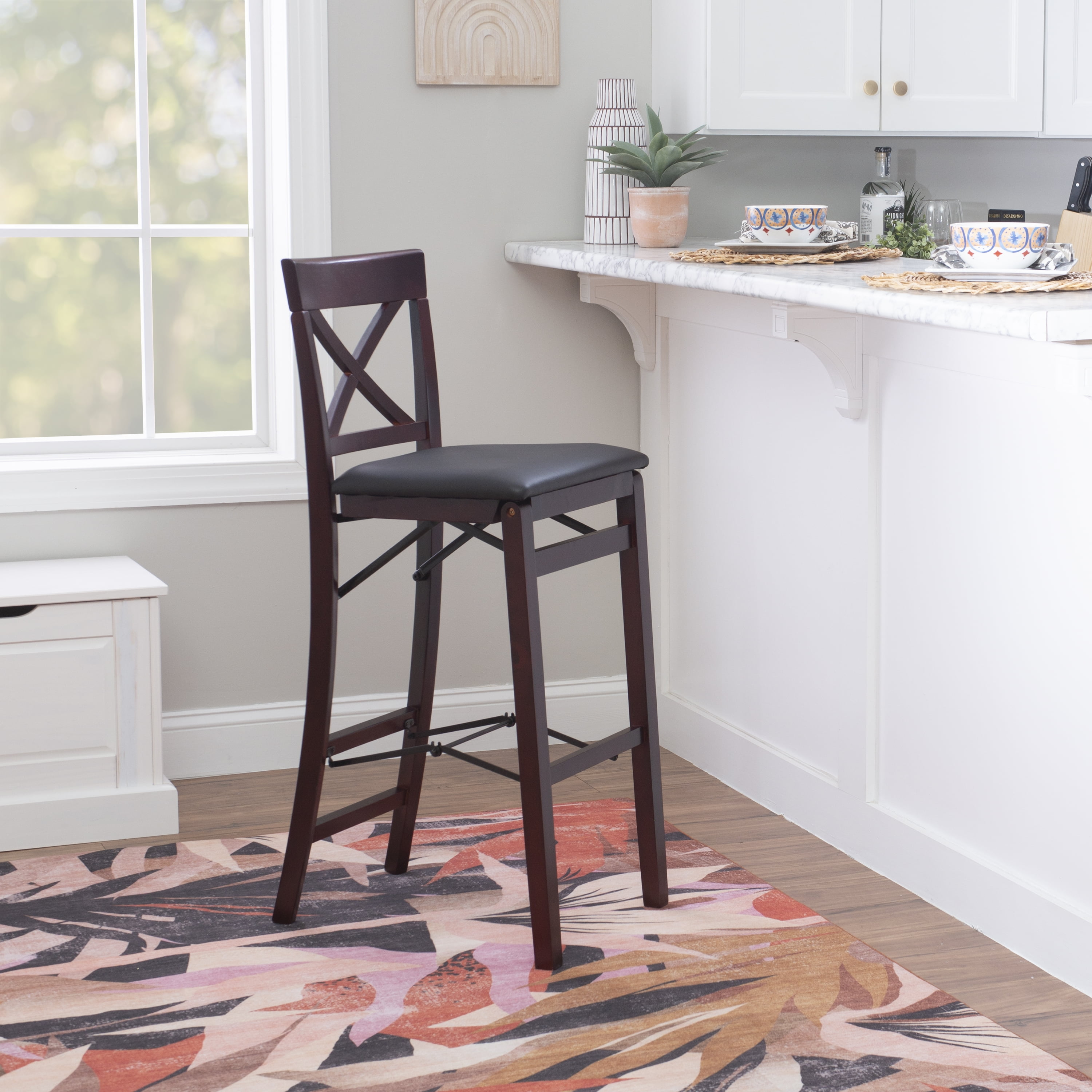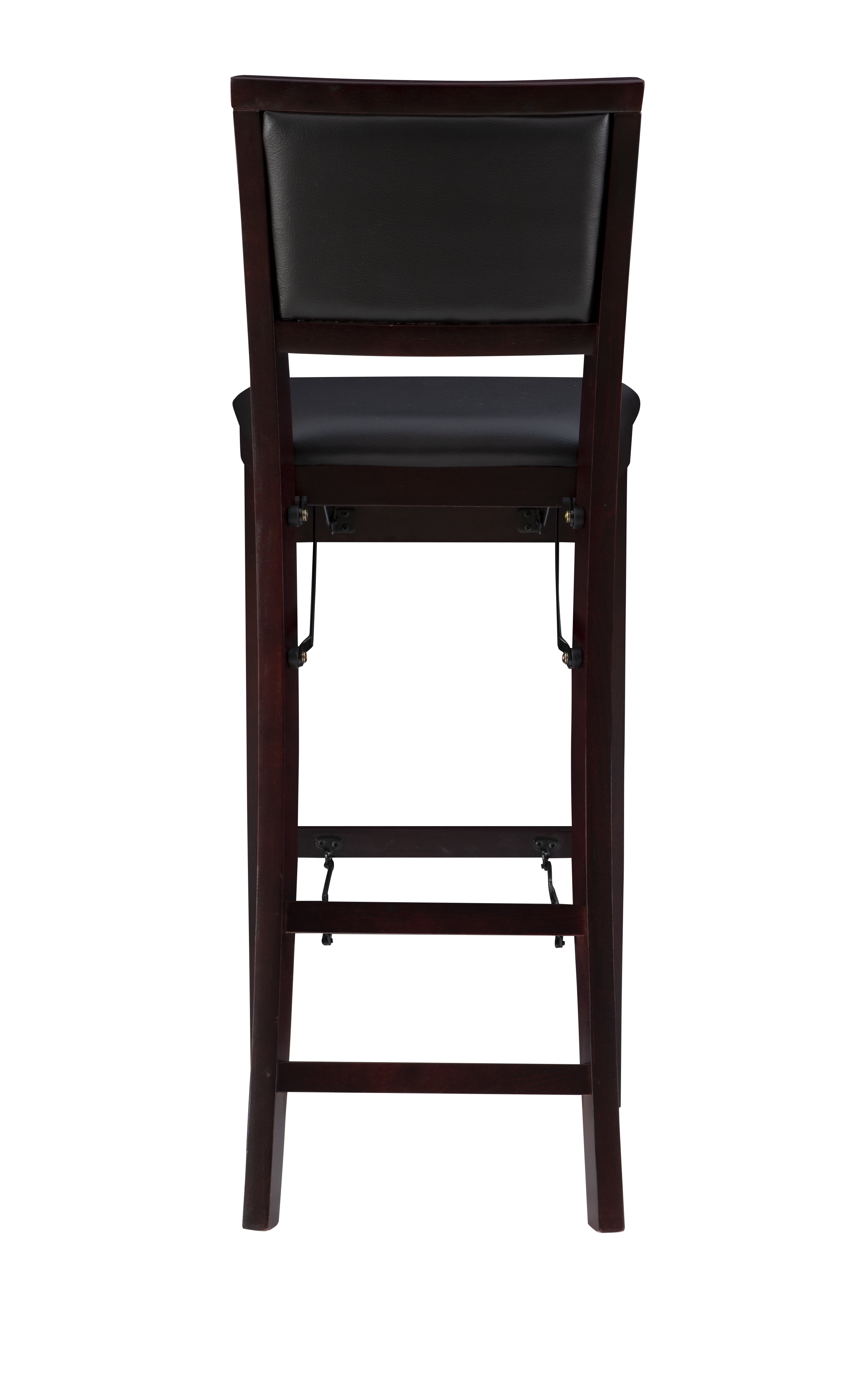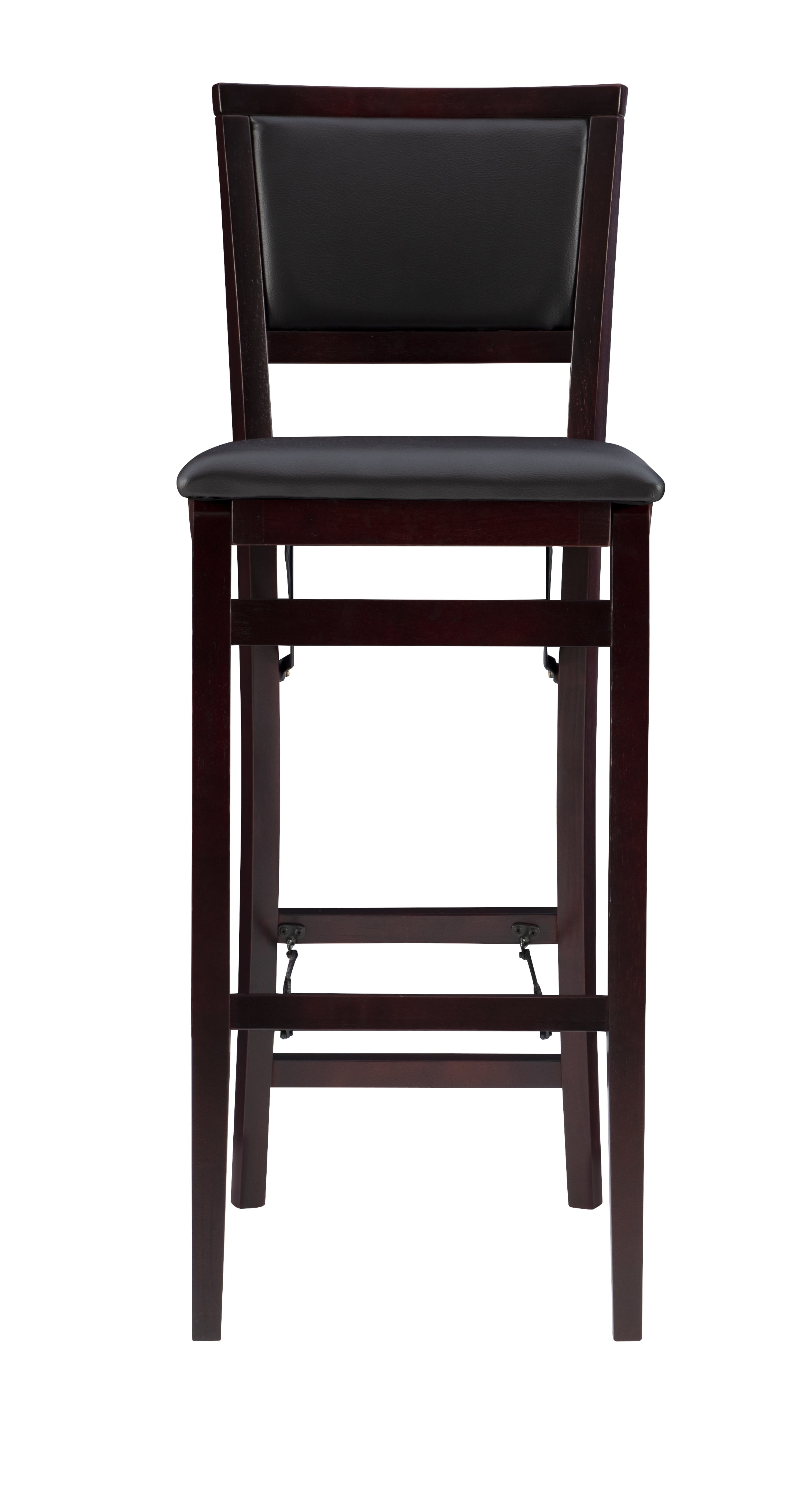 Stylish seating with the convenience of a folding bar stool. This folding stool adds an extra dash of elegance for dining or entertaining. The wood frames feature a classic Padded Back and a wipe clean, dark brown faux leather padded seat with the appearance of leather, and a rich Merlot finish. Front and rear supports provide extra stability. The space saving stool fold for easy set up and storage. No assembly required. Features: Crafted from Rubberwood, Bentwood, Foam and Fabric Merlot Finish Dark Brown Faux Leather Upholstery (83% Polyurethane, 17% Polyester) Folds for easy set up and storage Front and rear supports provide extra stability Folded Dims: 17″W x 8″D x 43″H Bar Height Specifications: Assembly Required: Fully Assembled Product Dimensions: 17″w x 20″d x 43″h Product Weight: 19.85 lbs Seat Height: 30″ Seat Dimensions: 15.35″ x 16.93″ x 1.77″ Weight Capacity: 300 lbs