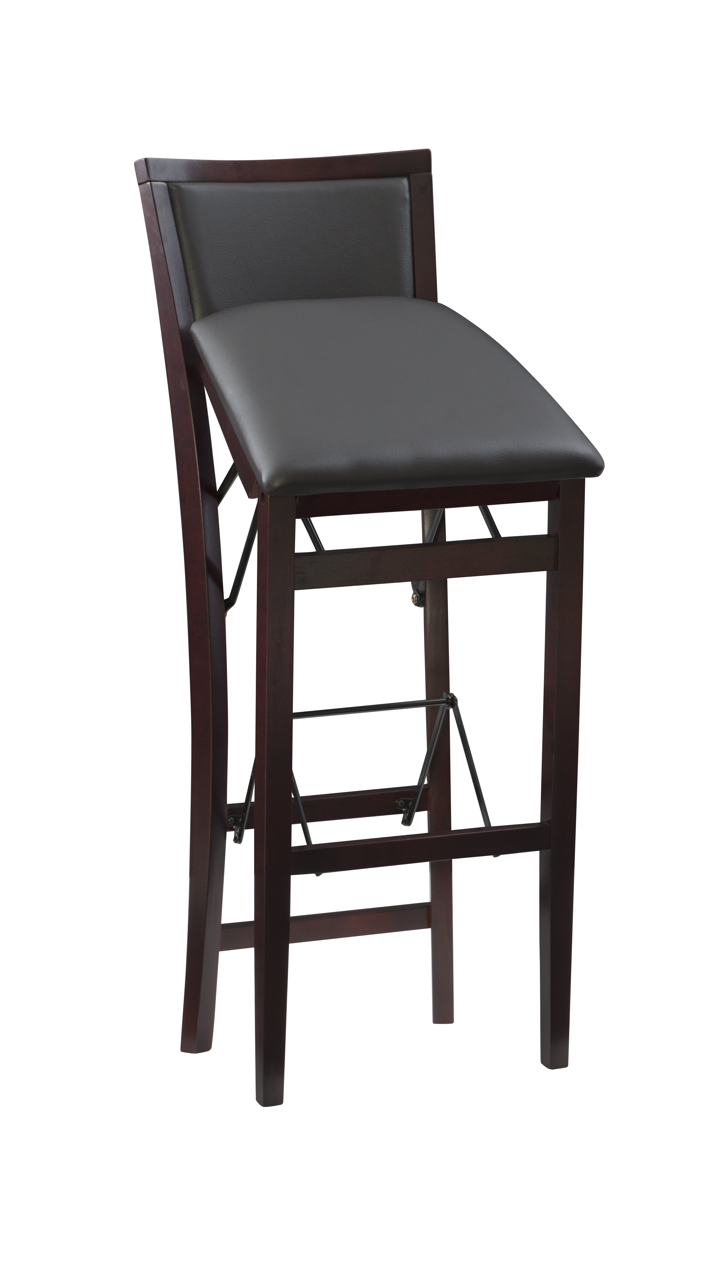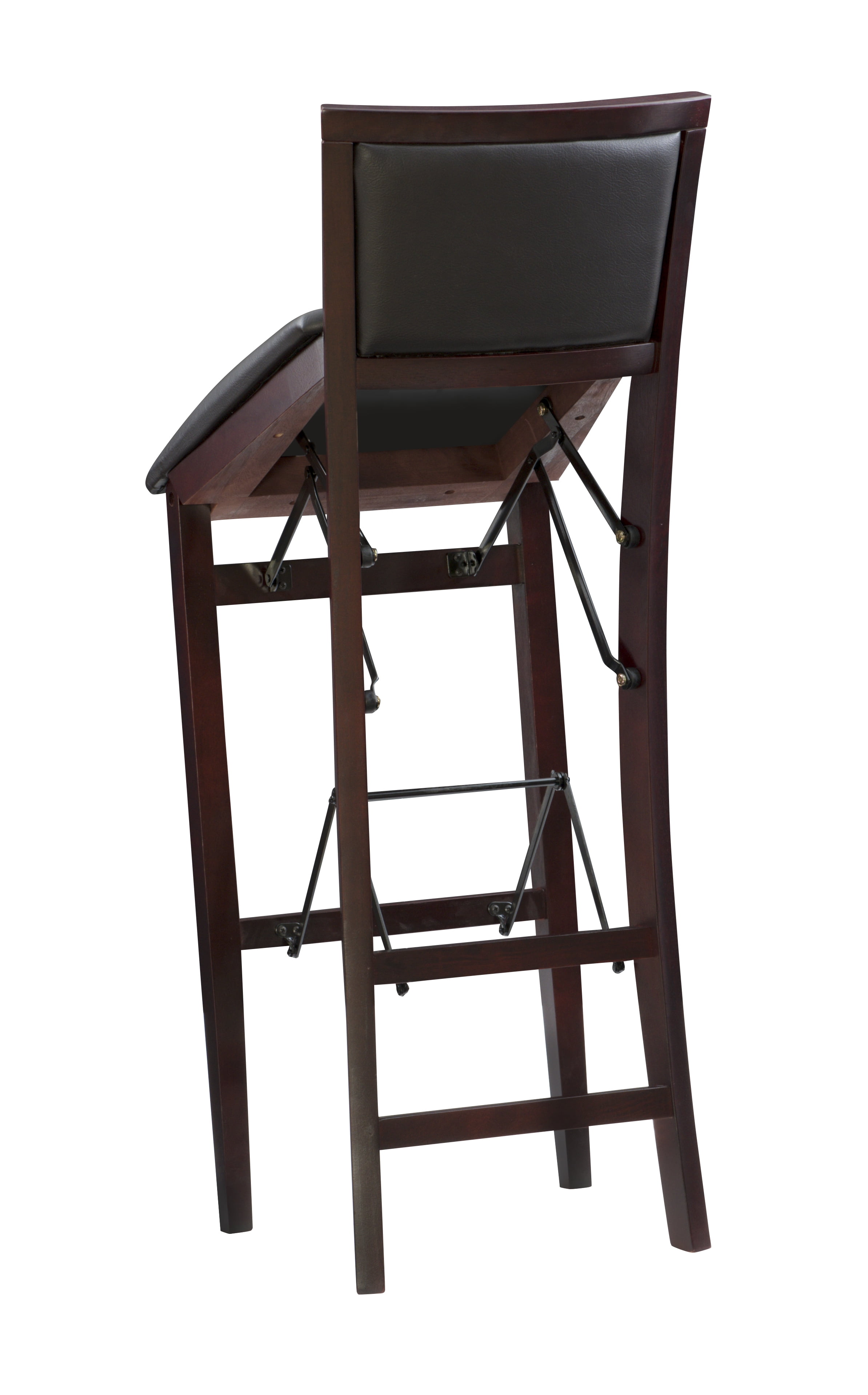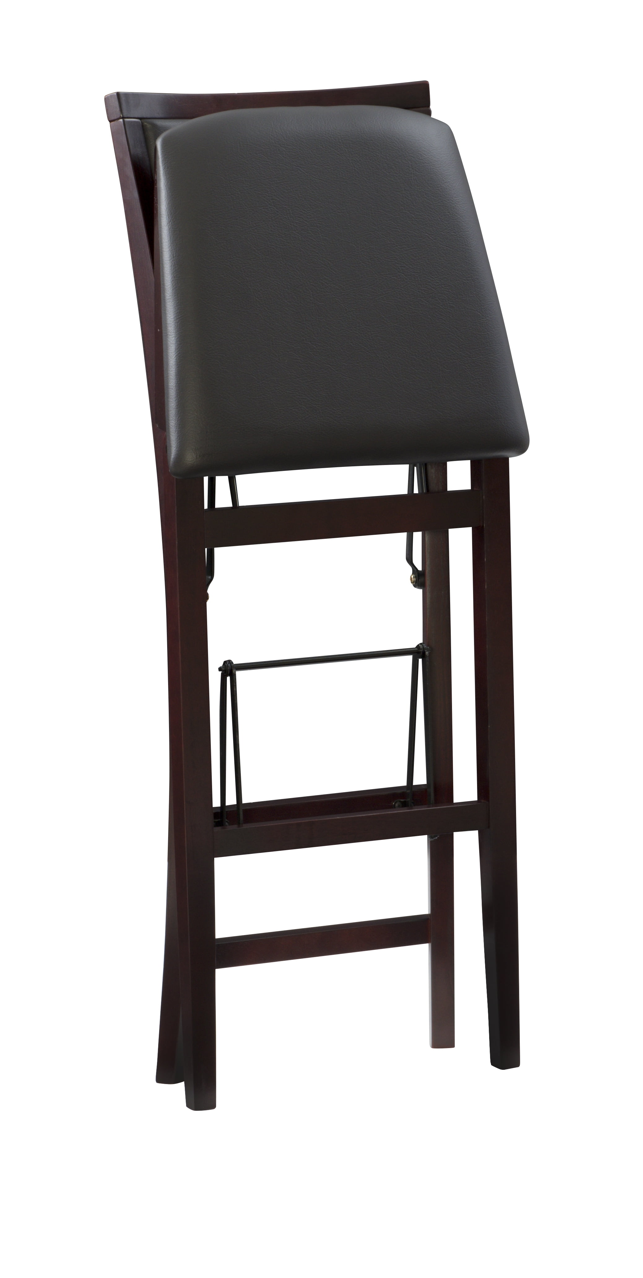 Crafted from Rubberwood, Bentwood, Foam and Fabric Merlot Finish Dark Brown Faux Leather Upholstery (83% Polyurethane, 17% Polyester) Folds for easy set up and storage Front and rear supports provide extra stability Folded Dims: 17″W x 8″D x 43″H Bar Height