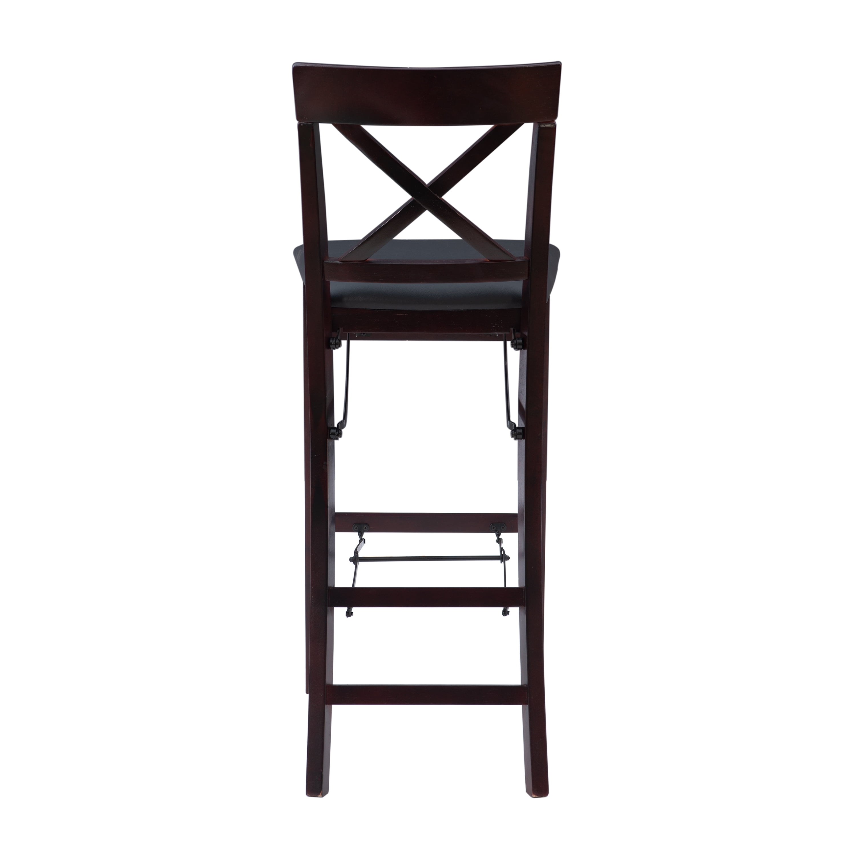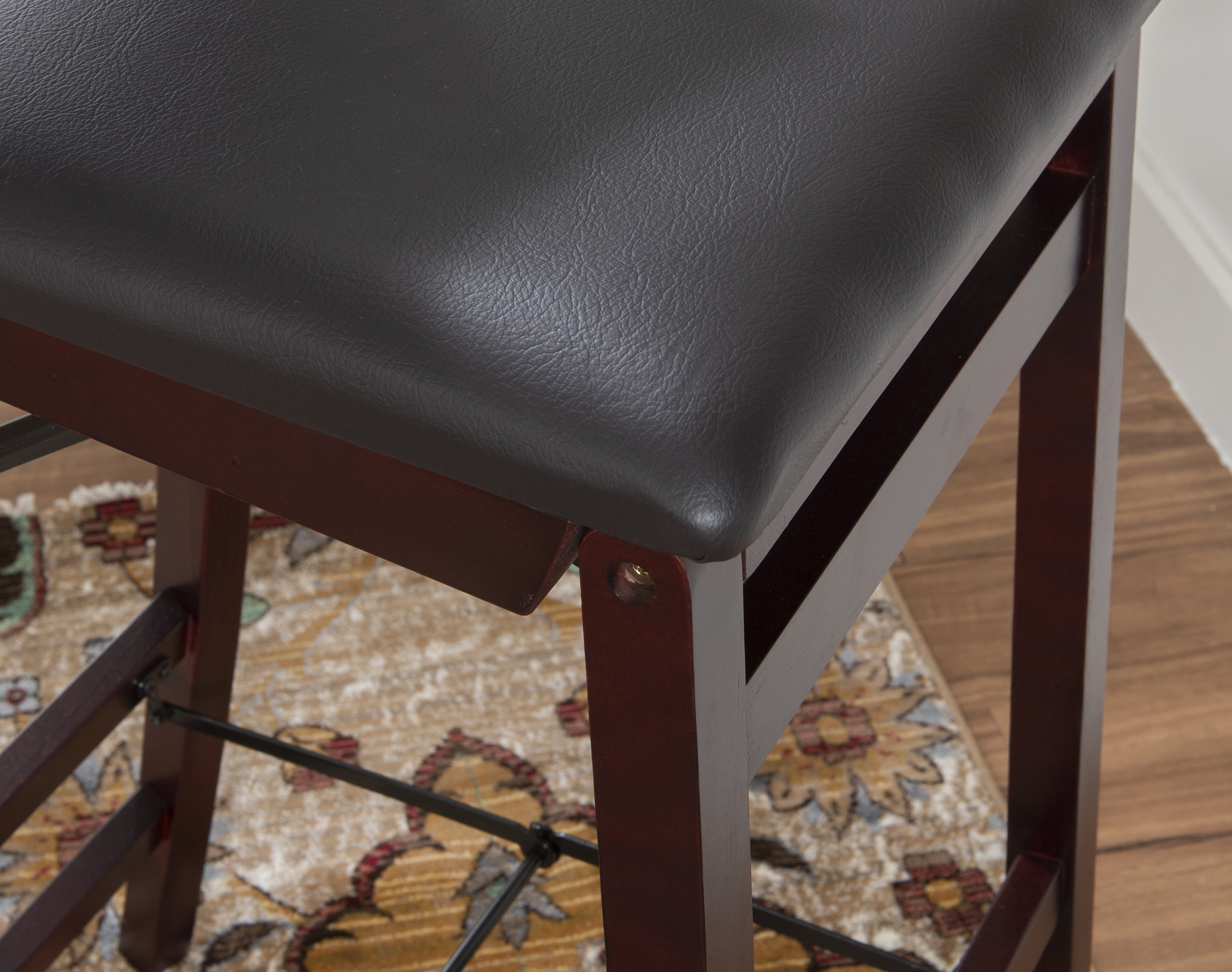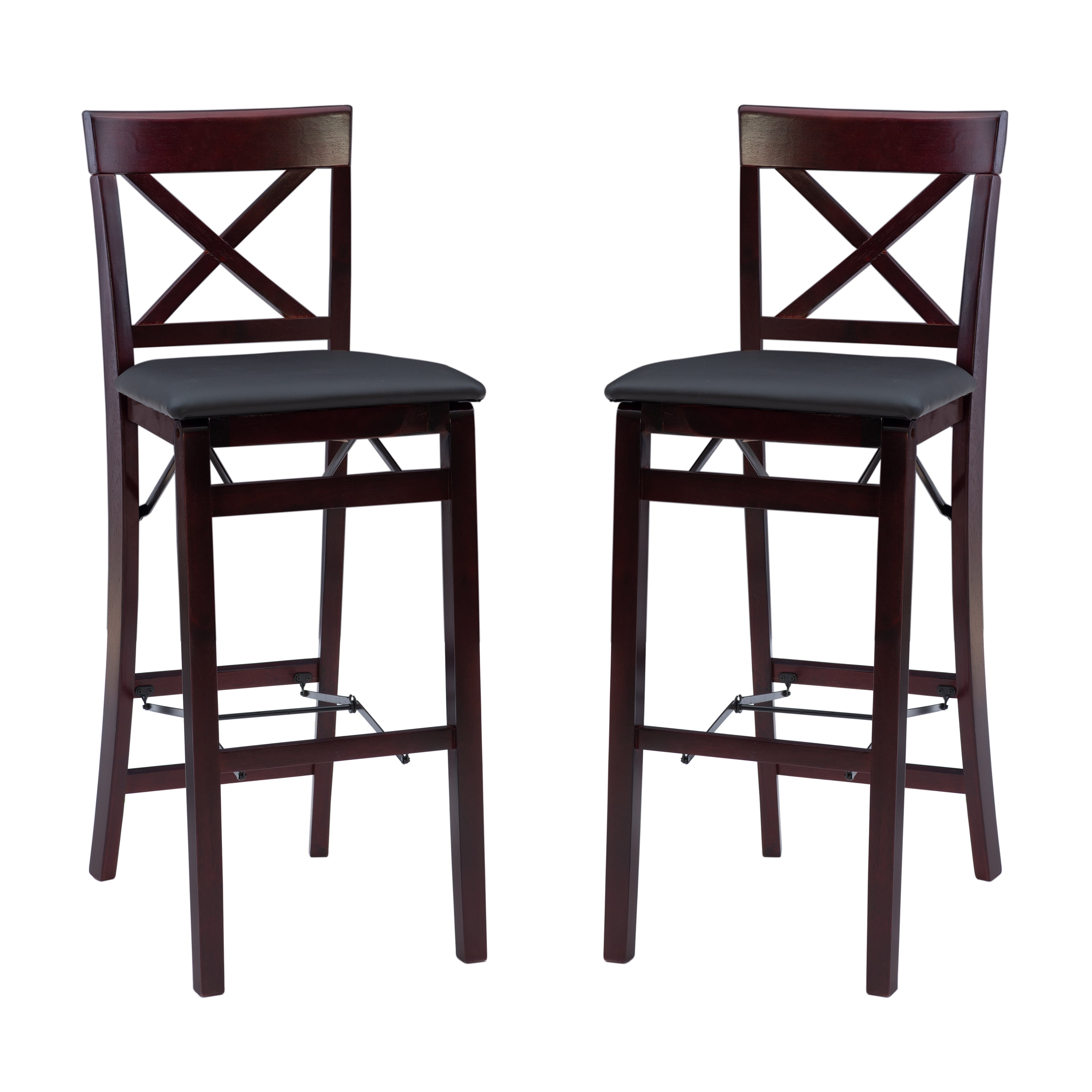 Crafted from Rubberwood, Bentwood, Foam and Fabric Merlot Finish Dark Brown Faux Leather Upholstery (83% Polyurethane, 17% Polyester) Folds for easy set up and storage Front and rear supports provide extra stability Folded Dims: 17″W x 8″D x 43″H Bar Height