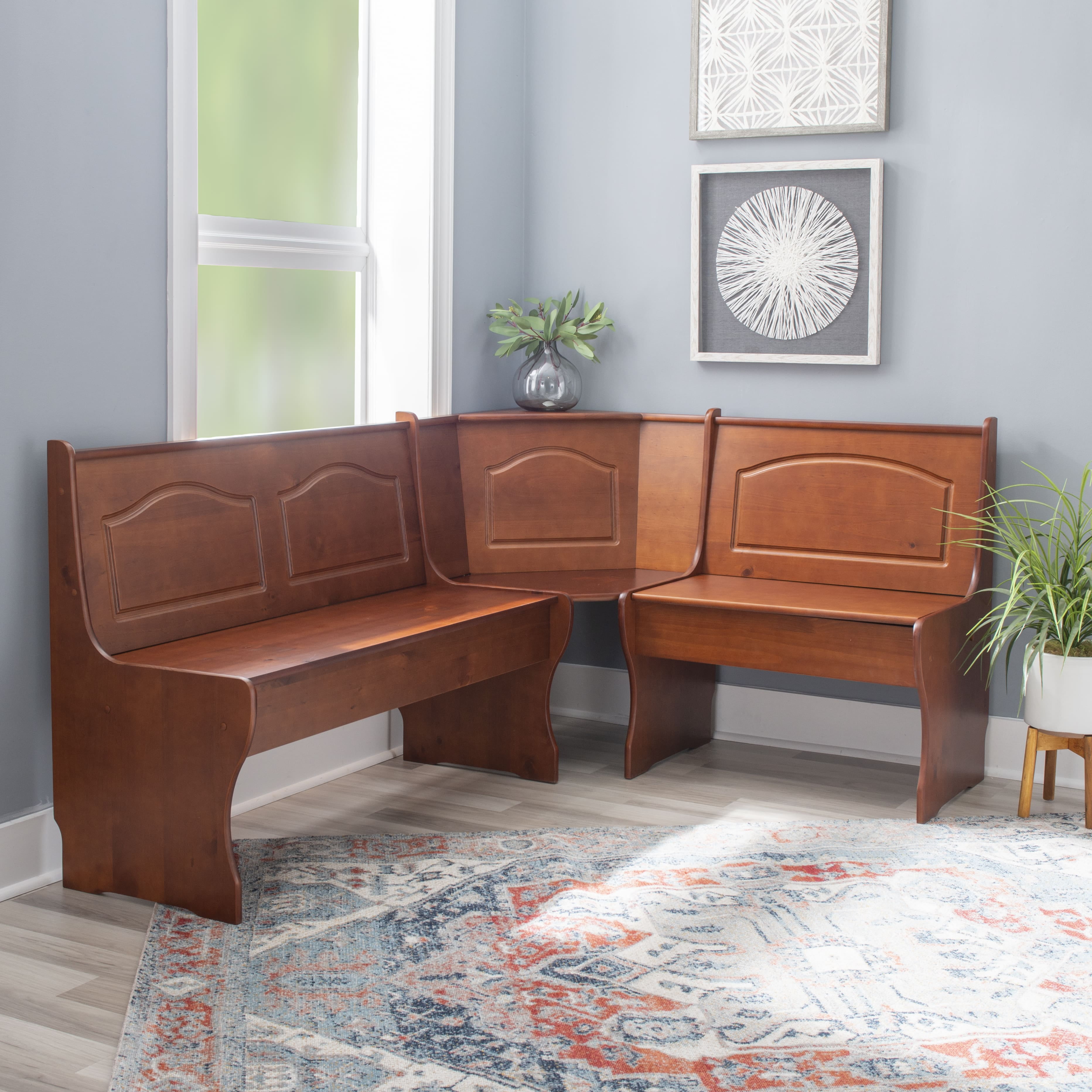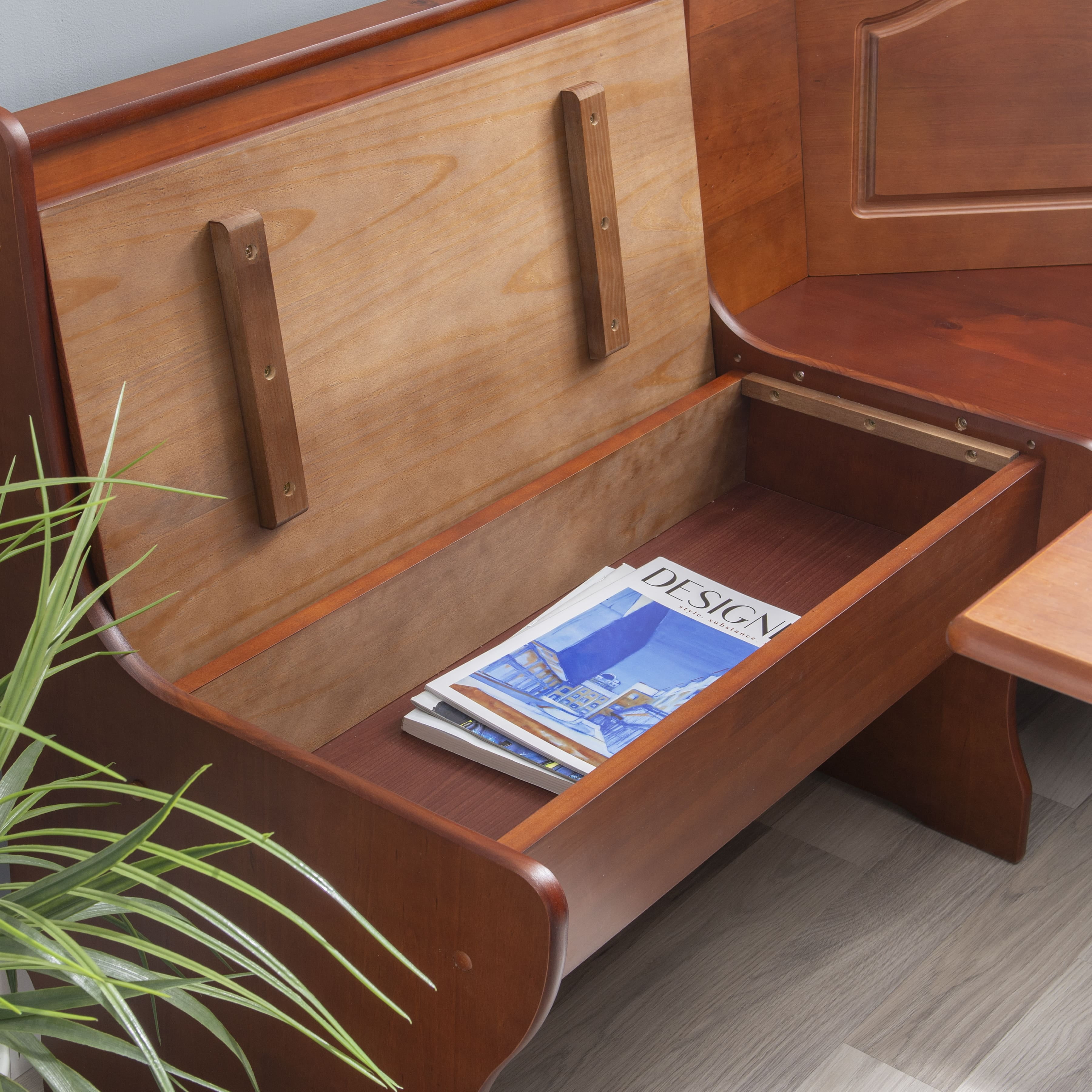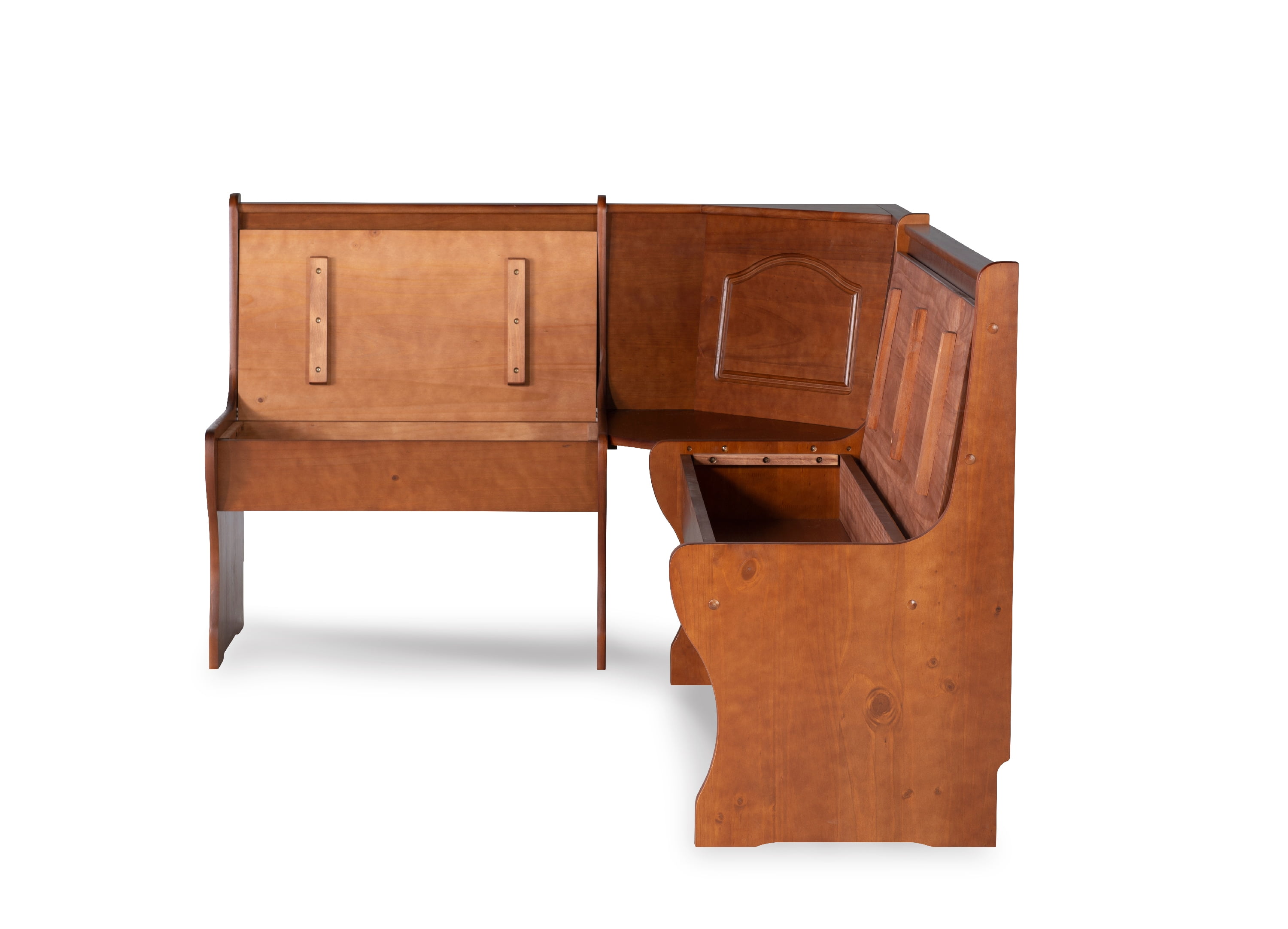 Smart L-Shaped Footprint: Seats up to 3 while maximizing corner space—ideal for kitchens, apartments, or breakfast nooks with limited square footage. Built-In Bench Storage: Hidden compartments beneath each seat offer a clutter-free solution for stashing dining linens, toys, or everyday must-haves. Crafted to Last: Made from solid pine and durable MDF to stand up to daily use in busy family spaces. Rich Walnut Brown Finish: A golden stain that highlights the wood’s natural grain for a warm, rustic look that complements farmhouse, transitional, and traditional decor. Flexible, Reversible Design: The corner setup can be assembled to the left or right, adapting easily to your kitchen or dining room layout. Multifunctional Style: Works as a dining booth, mudroom bench, casual workspace, or hangout spot—tailored for modern living.