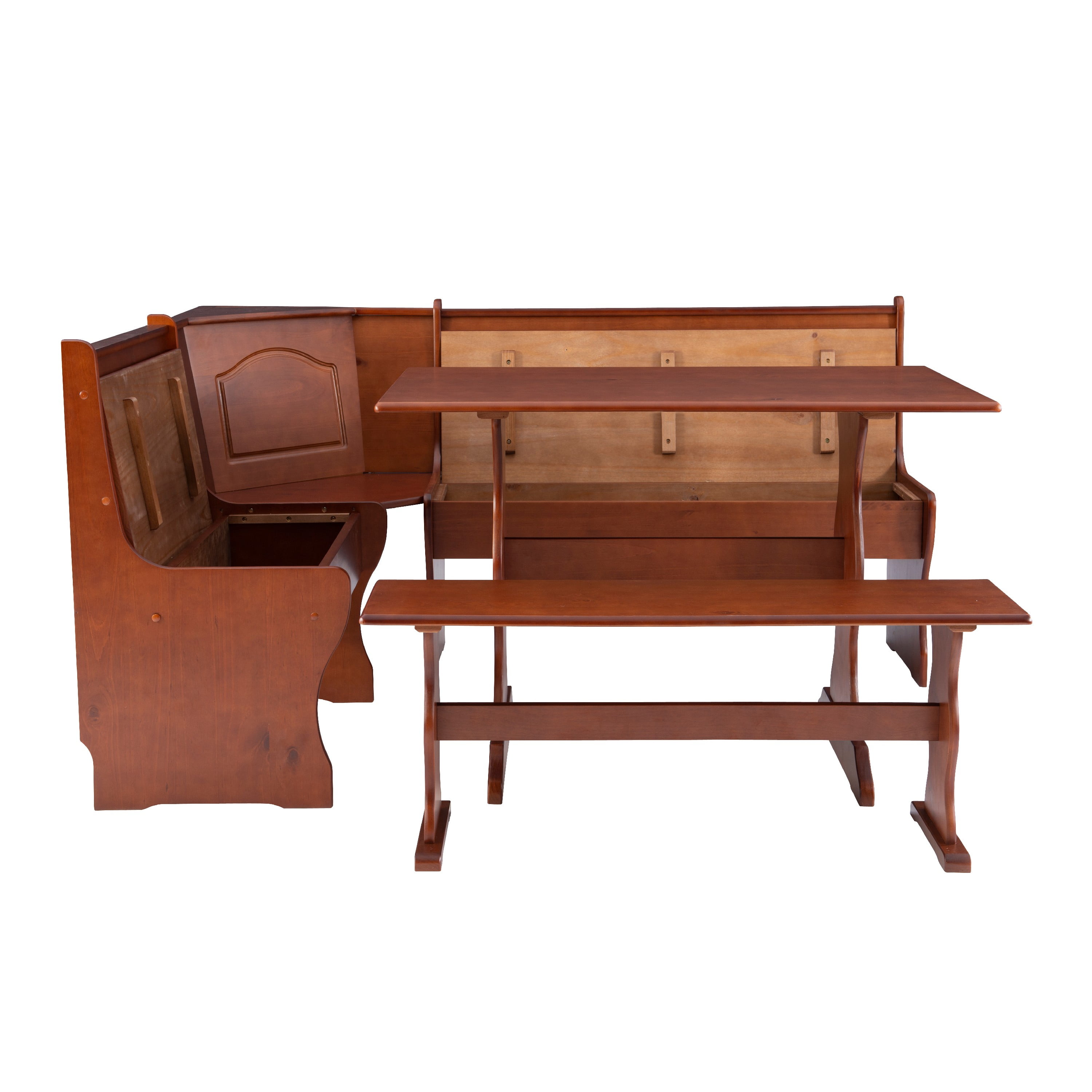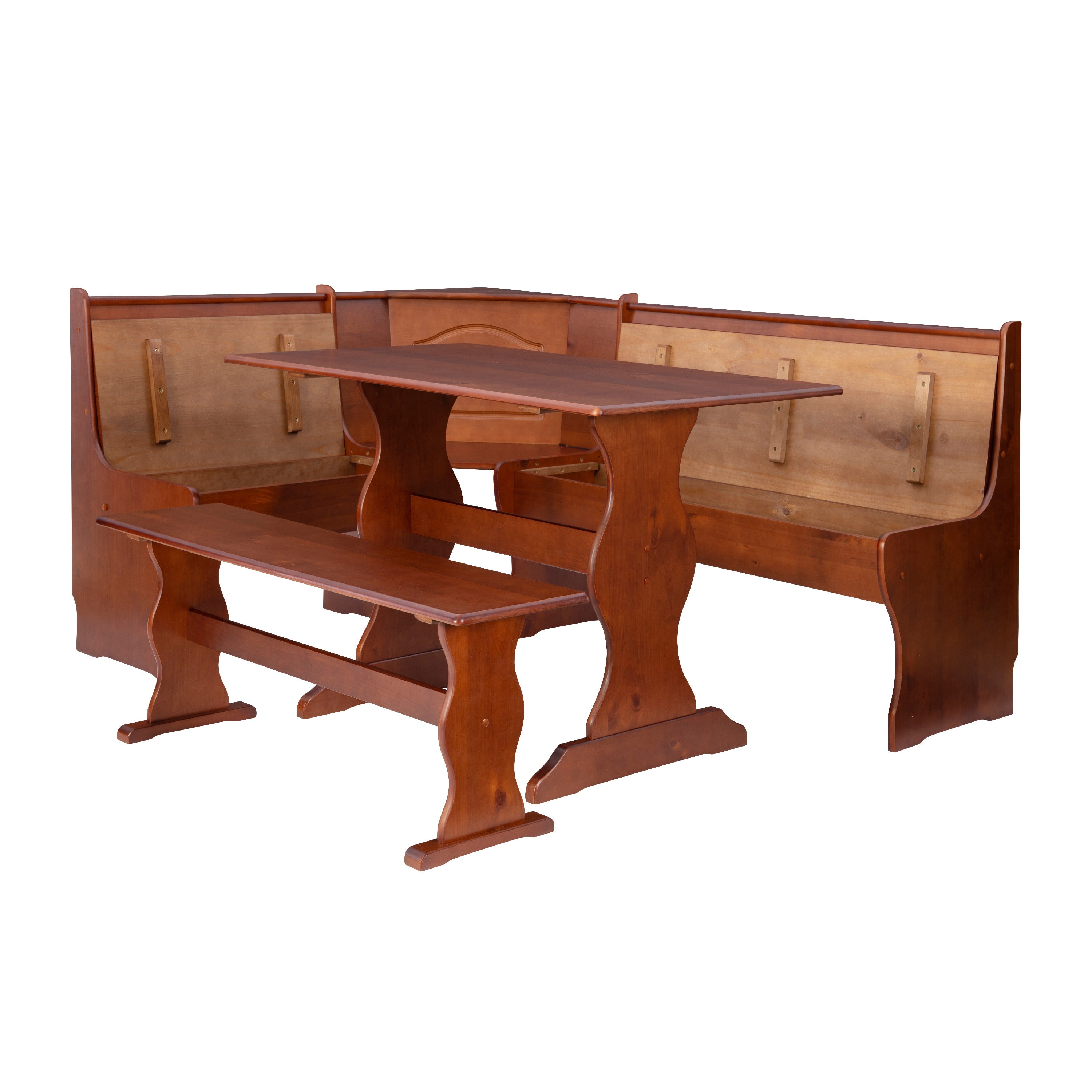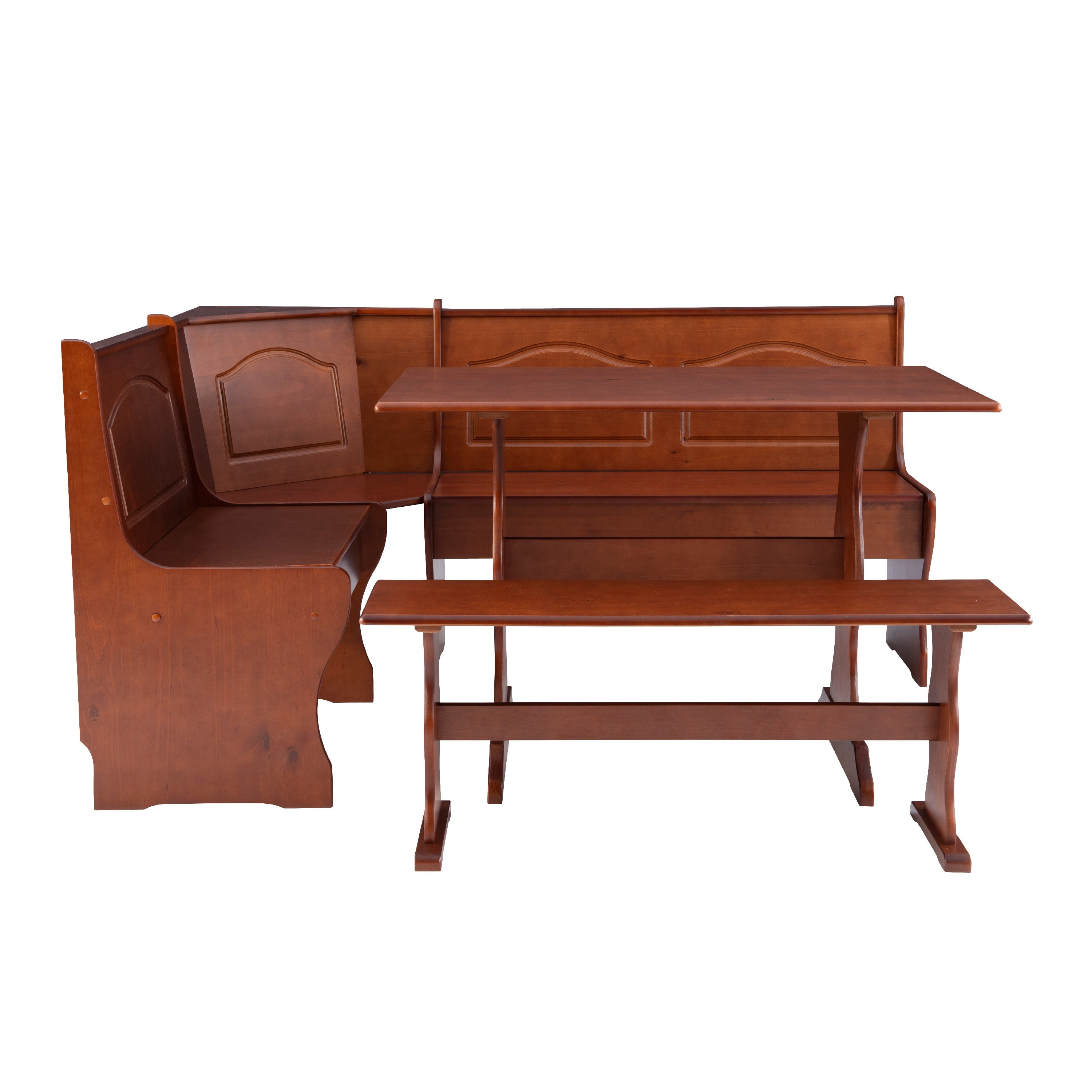 Create the look and feel of a built-in dining nook at a fraction of the cost with this charming dining set. Carved with simple, traditional design and finished in rich walnut, this set easily complements any home with its warm tones and classic appeal. Define a breakfast nook your spacious kitchen or transform an empty corner in an open concept floor plan with this four piece set.