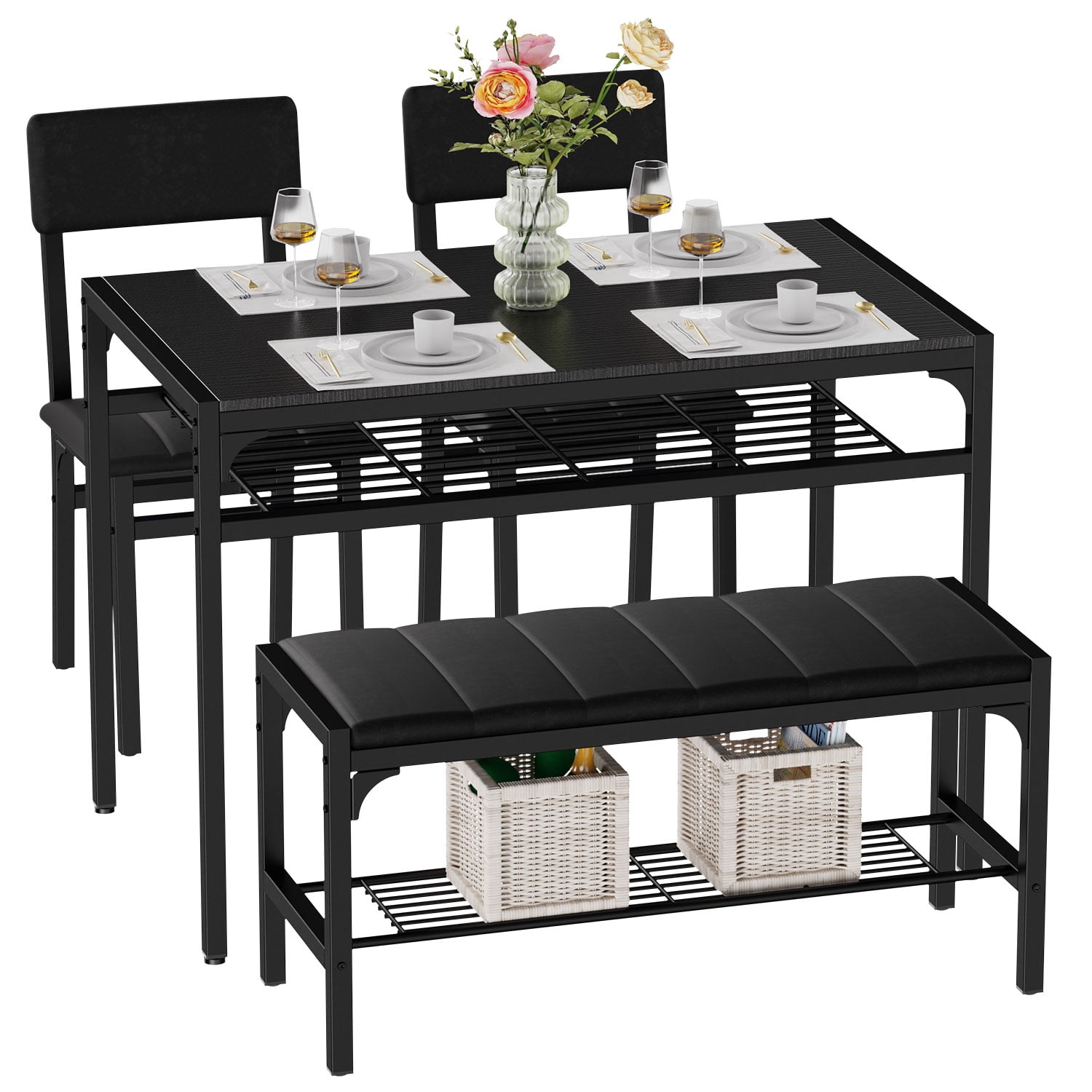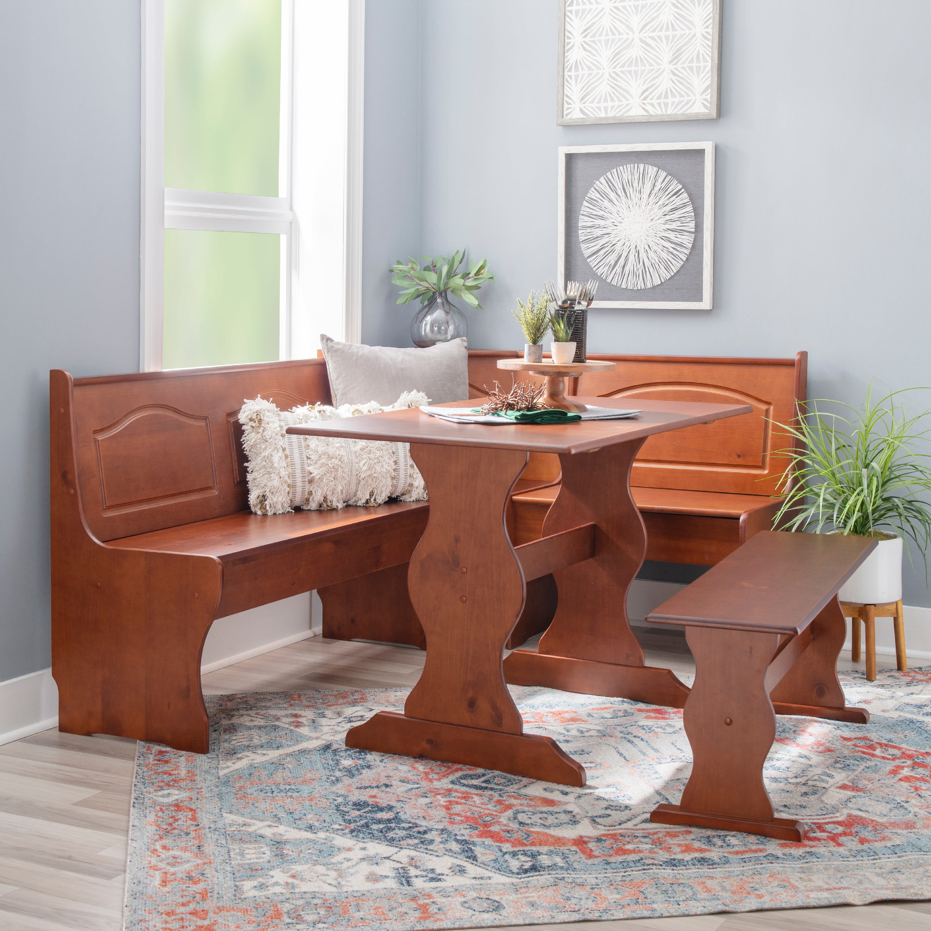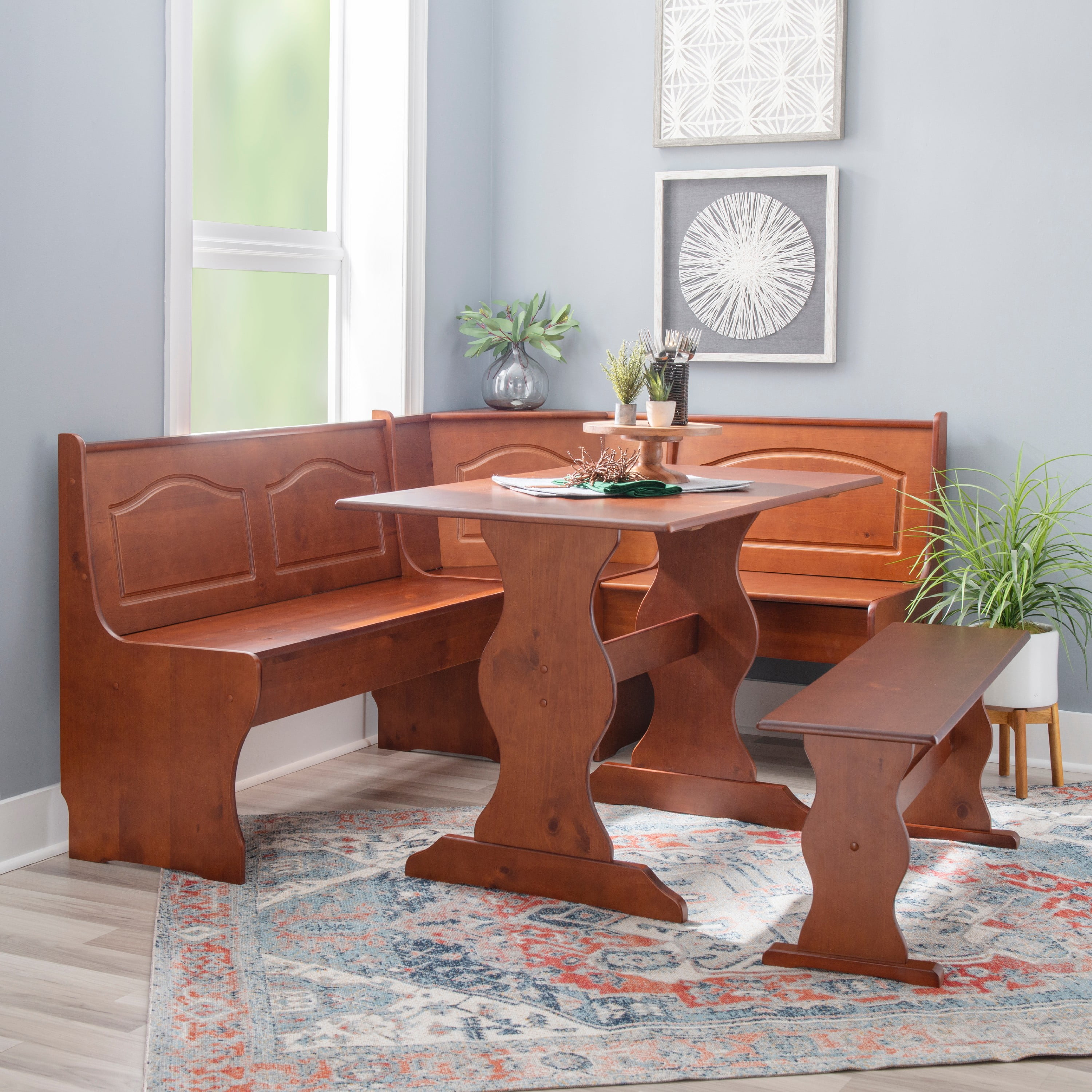 Create the look and feel of a built-in dining nook at a fraction of the cost with this charming dining set. Carved with simple, traditional design and finished in rich walnut, this set easily complements any home with its warm tones and classic appeal. Define a breakfast nook your spacious kitchen or transform an empty corner in an open concept floor plan with this four piece set.