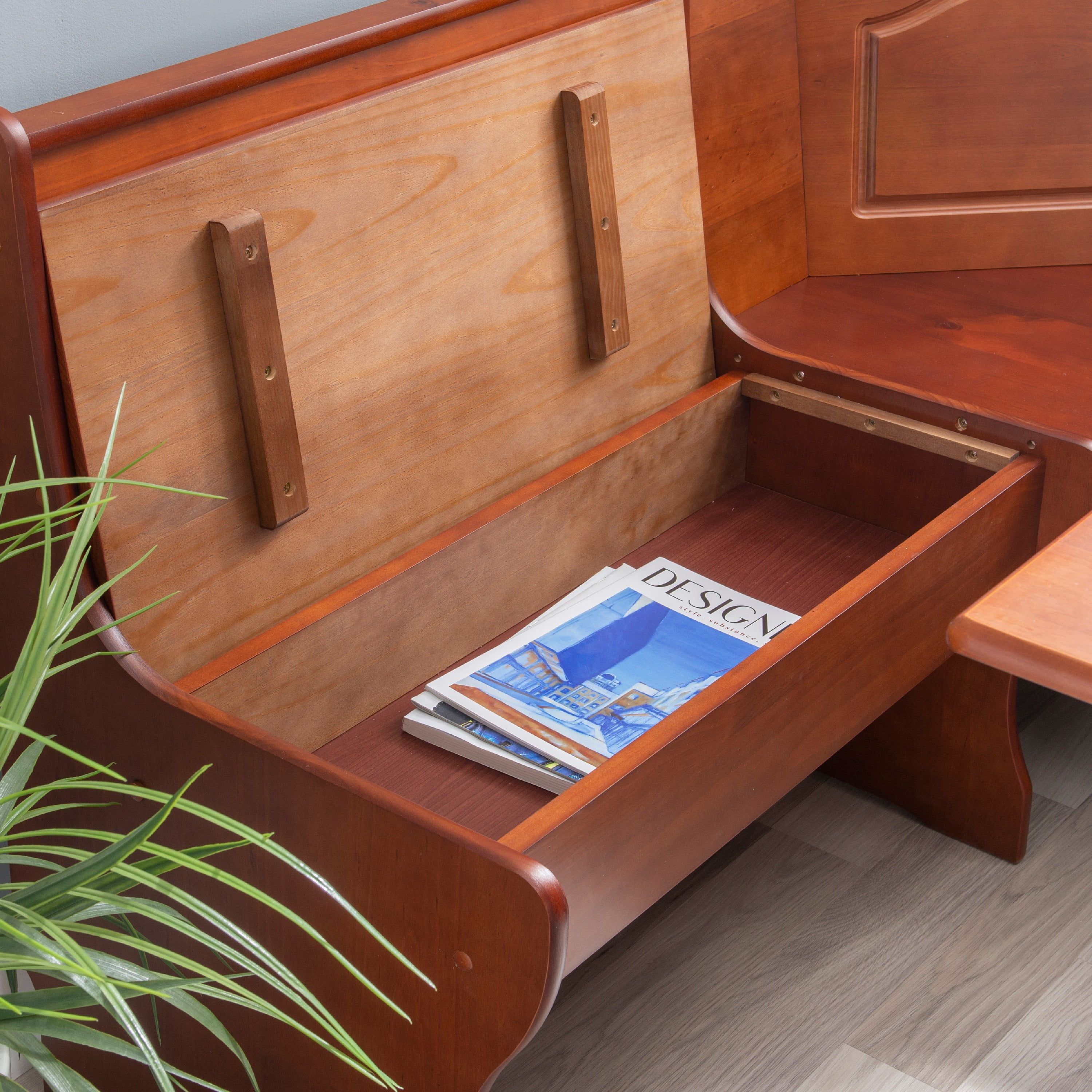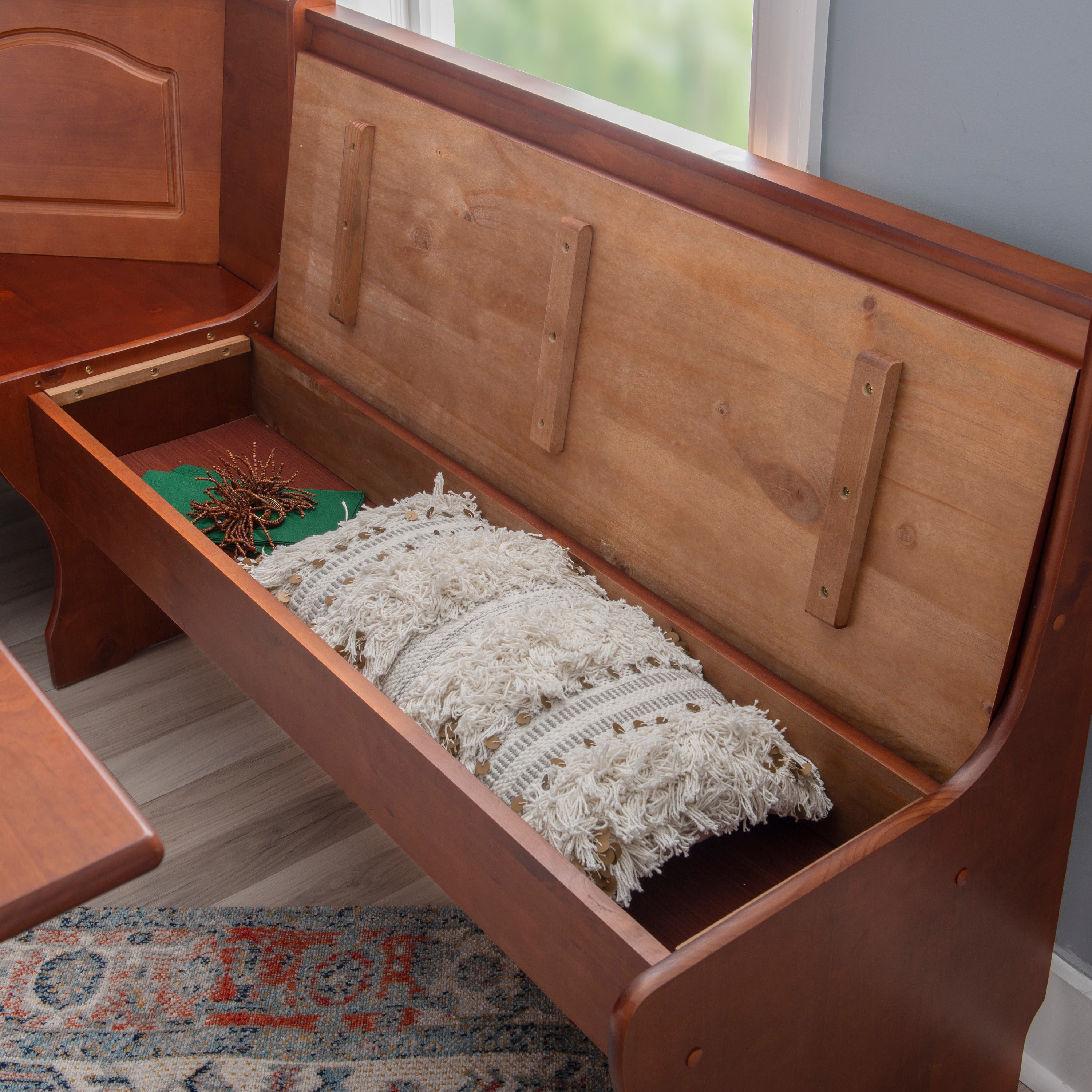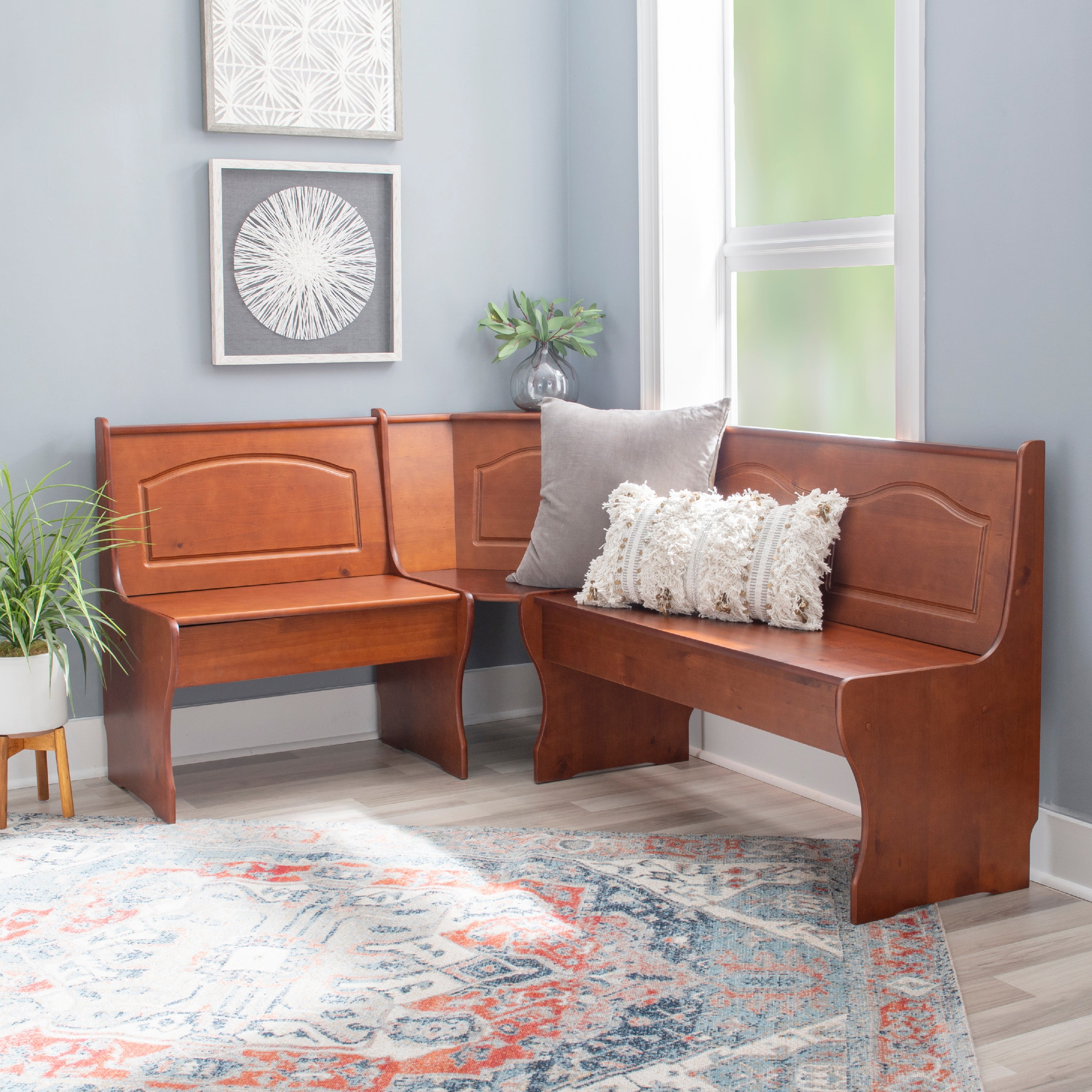 Walnut finish Complete indoor breakfast nook set seats 5 people comfortably You determine direction of corner unit during nook assembly Under seat storage Easy to assemble Seat Dimensions: 17.75″ Seat Height, Single Side: 27.5″ x 14.75″, Double Side: 43.2″ x 14.75″, Bench: 43.3″ x 12″ Interior Dimensions: Single Side – 27.5″x10.6″x4.7″, Double Side – 43.2″x10.6″x4.7″ Weight Limit: Assembled Dimensions: 67.5″w x 51.5″d x 33.86″h Ships in 3 boxes Seats 5-6 Comfortably