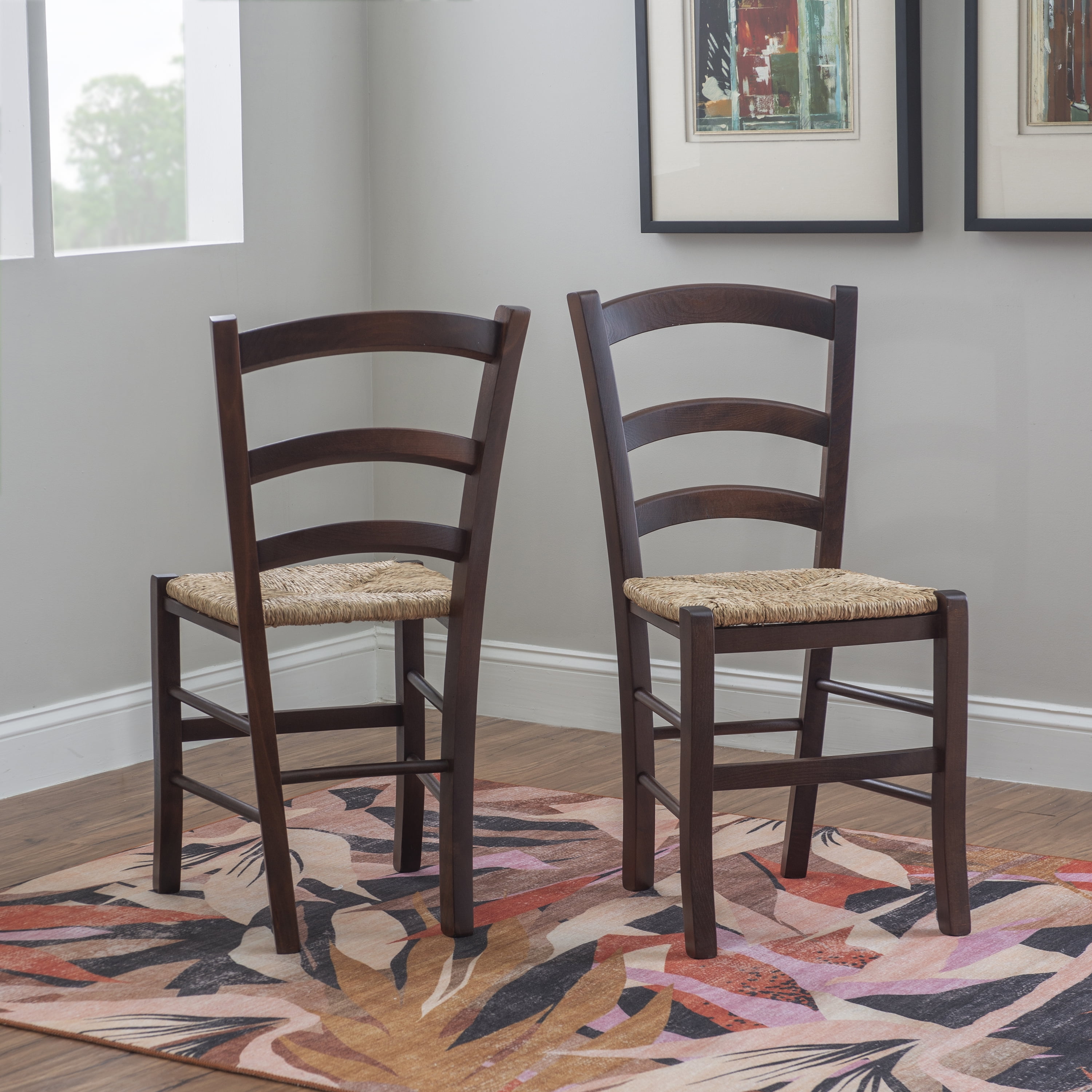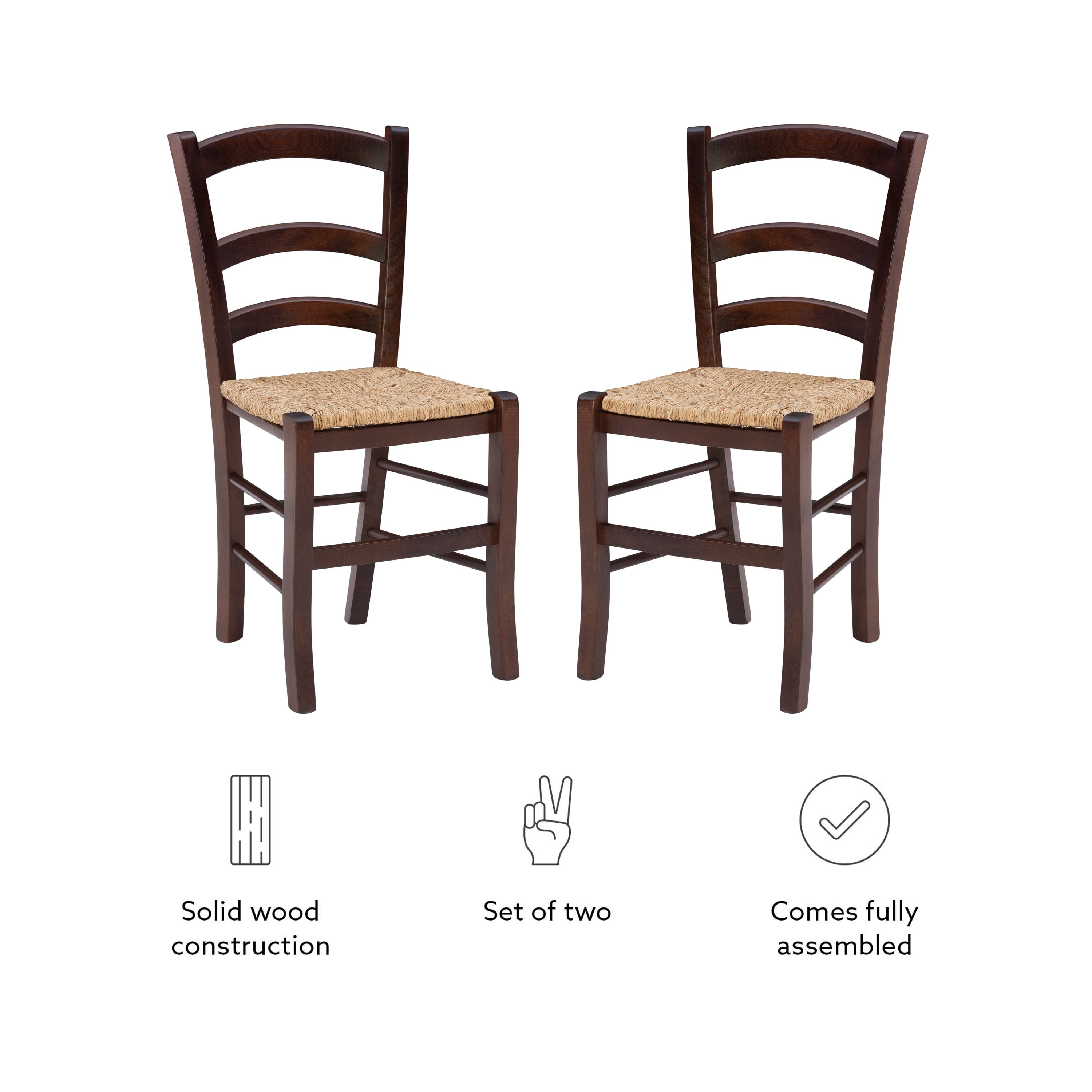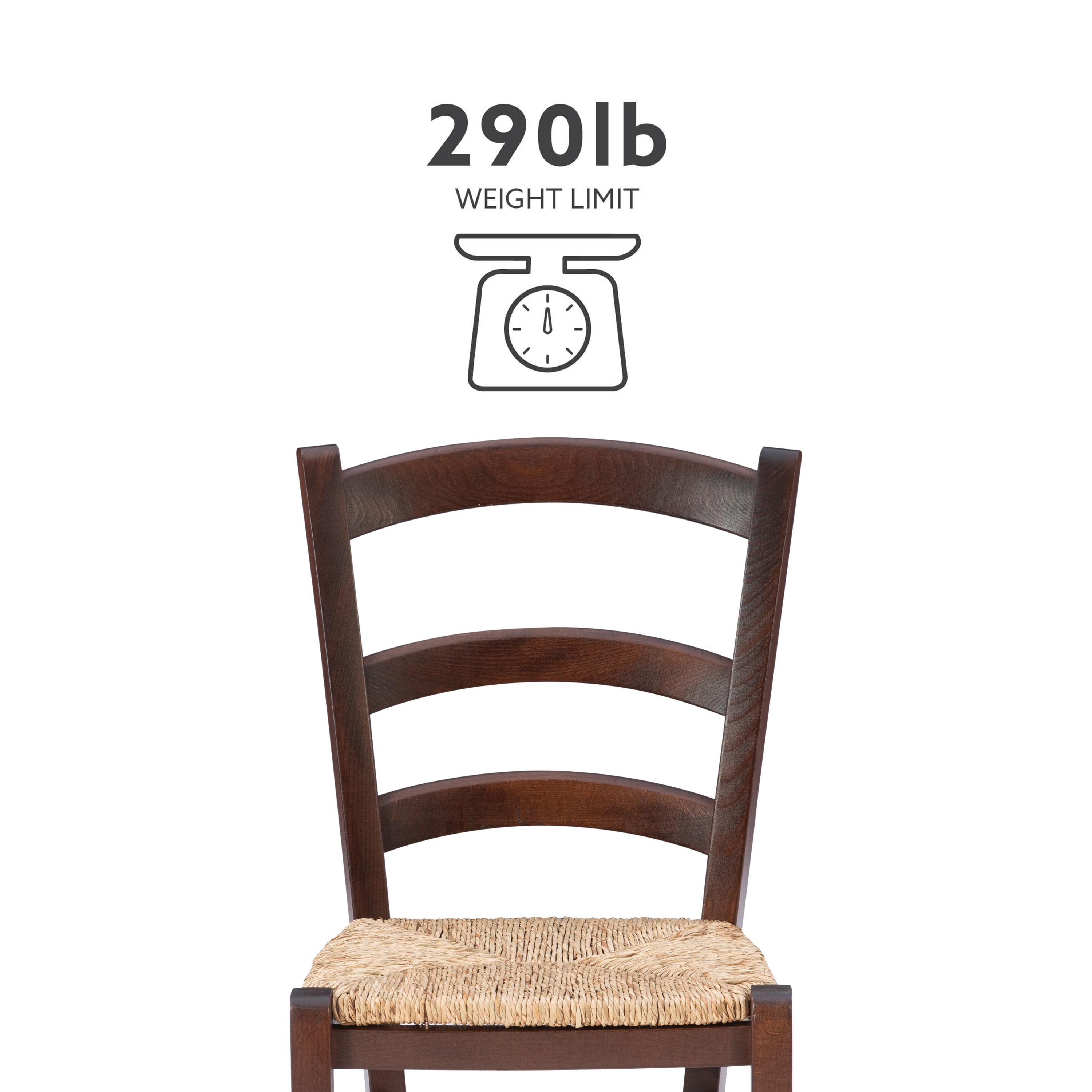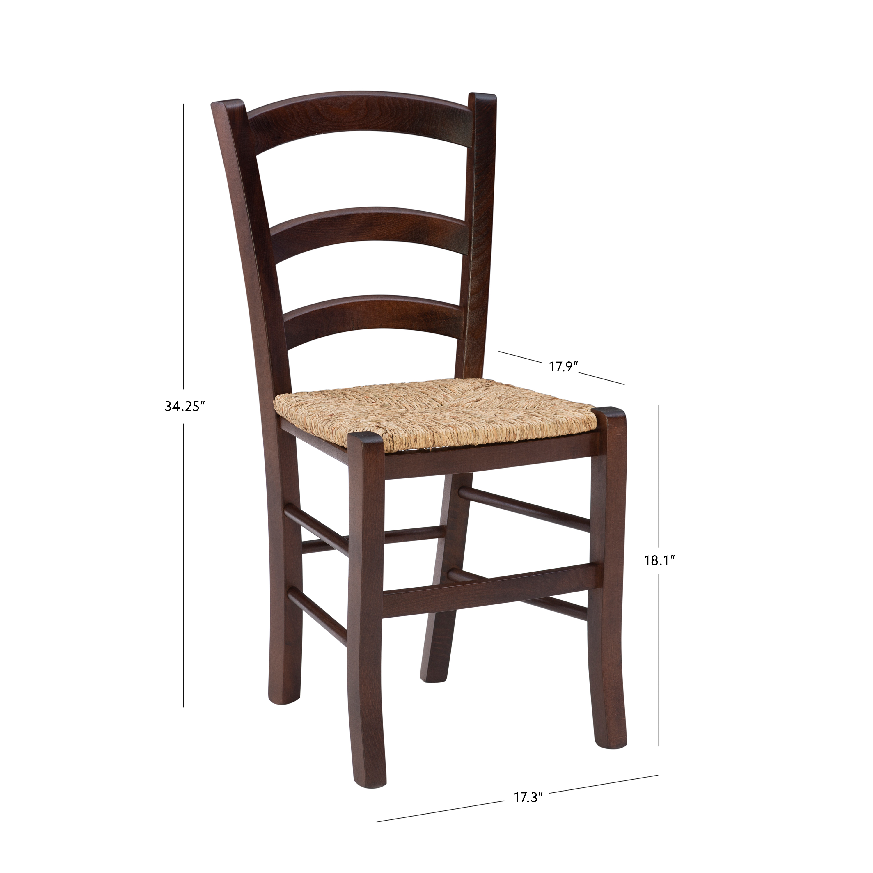 Arrives in a set of two Solid beechwood construction provides stability and durability Classic ladder back evokes a traditional farmhouse aesthetic Dark walnut finish pairs well in a variety of settings Armless profile allows for easily tucking into a table for extra floor space Fully assembled Seat Height: 18.11 Weight Limit: 290 lbs. Assembled Dimensions: 17.32″ W x 17.91″ D x 34.25″ H Ships in 1 box For indoor use only