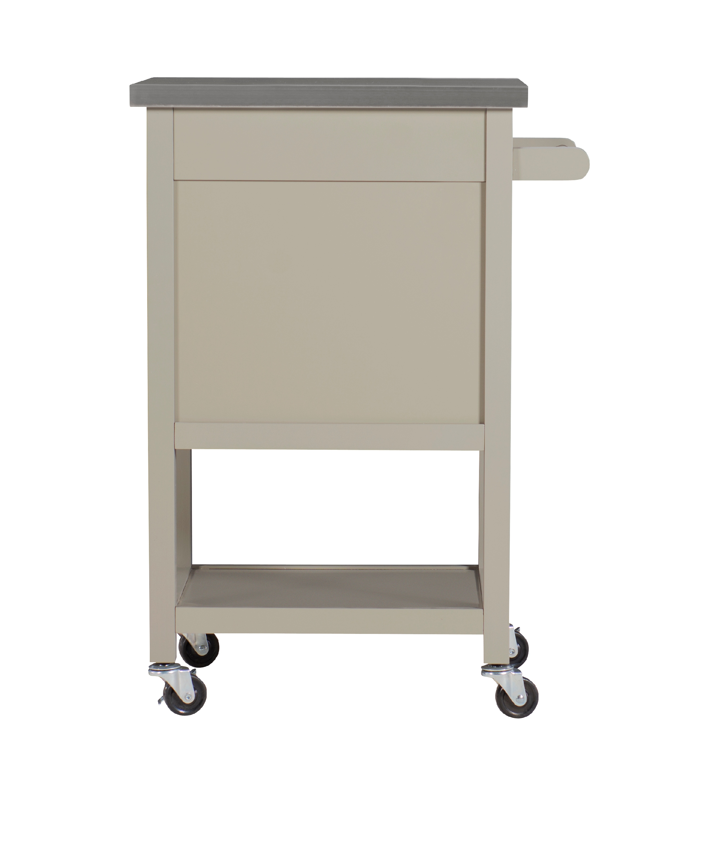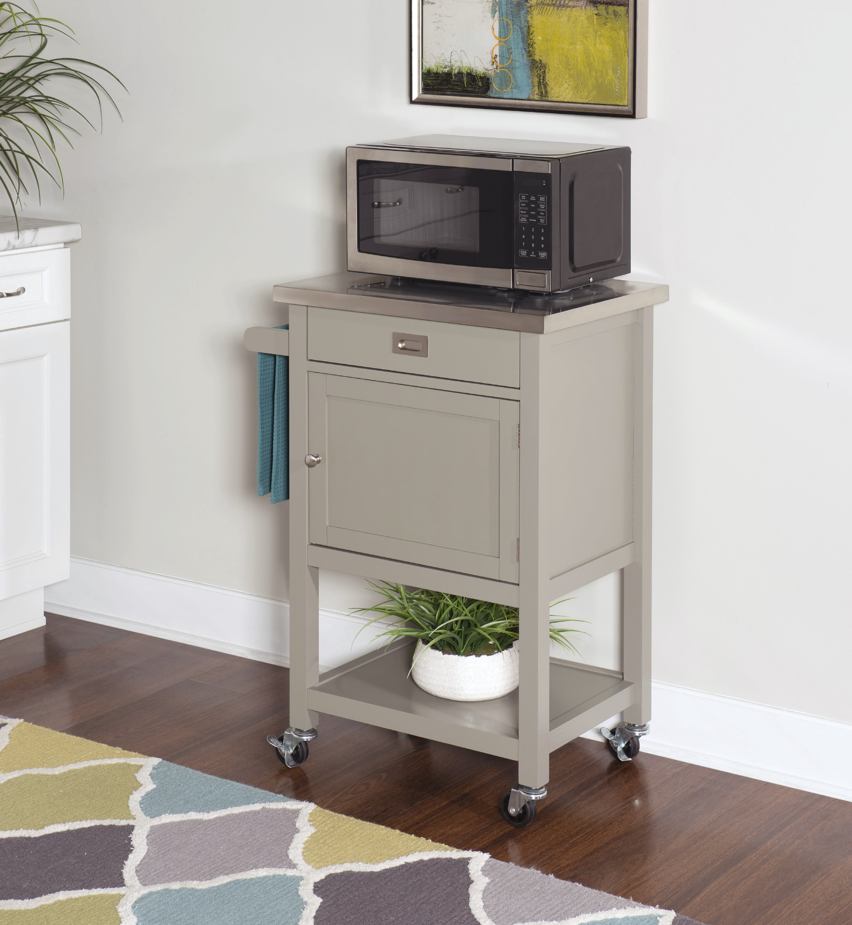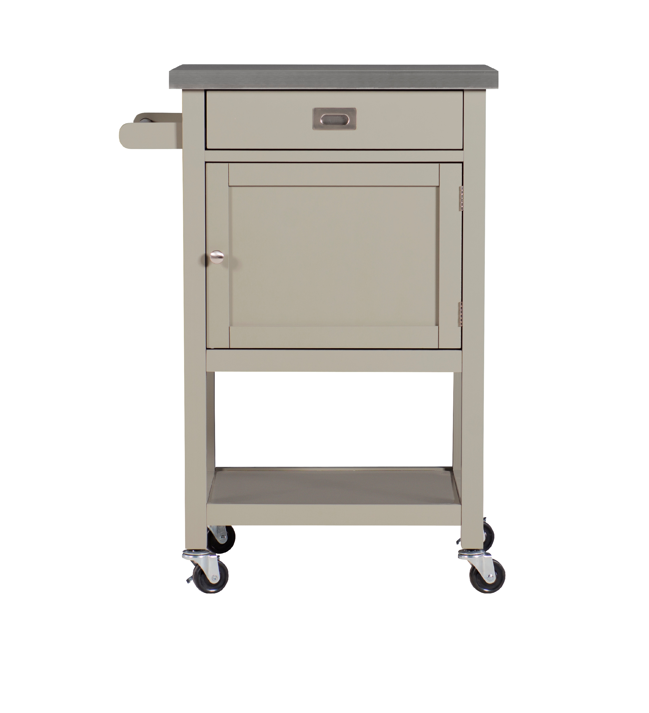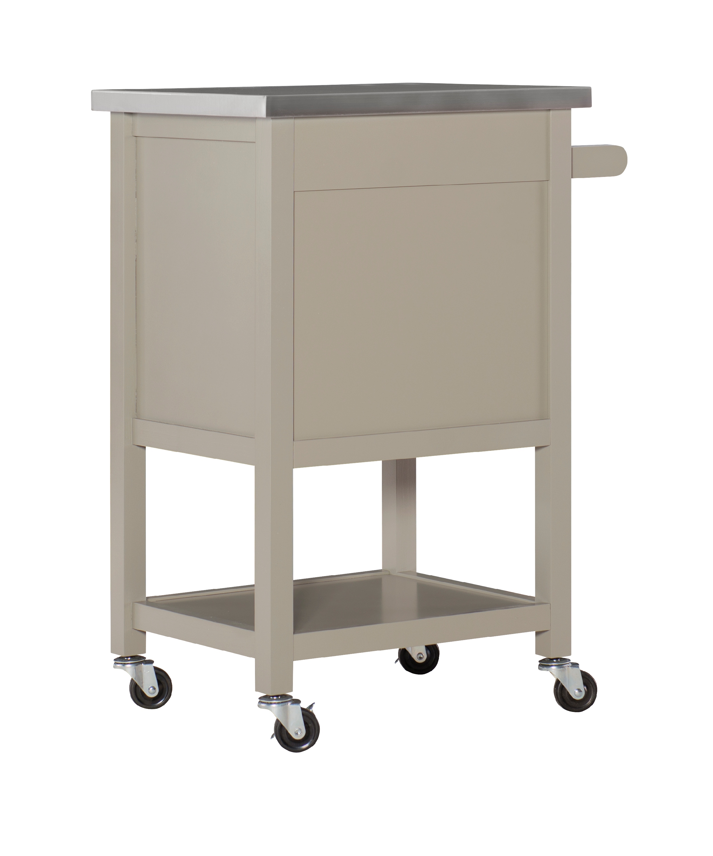 Simple, durable design with a gray finish, with stainless steel metal handles and hardware Easy to clean, food-safe stainless steel top. Convenient storage including top drawer, enclosed cabinet, bottom shelf, and towel bar Smooth-rolling, secure locking casters Efficient mobile storage or serving in any room Sturdy wood frame Assembly required Assembled Dimensions: 22-25.5″ W x 18″ D x 36″ H Ships in 1 box Product Weight: 41.01 lbs.