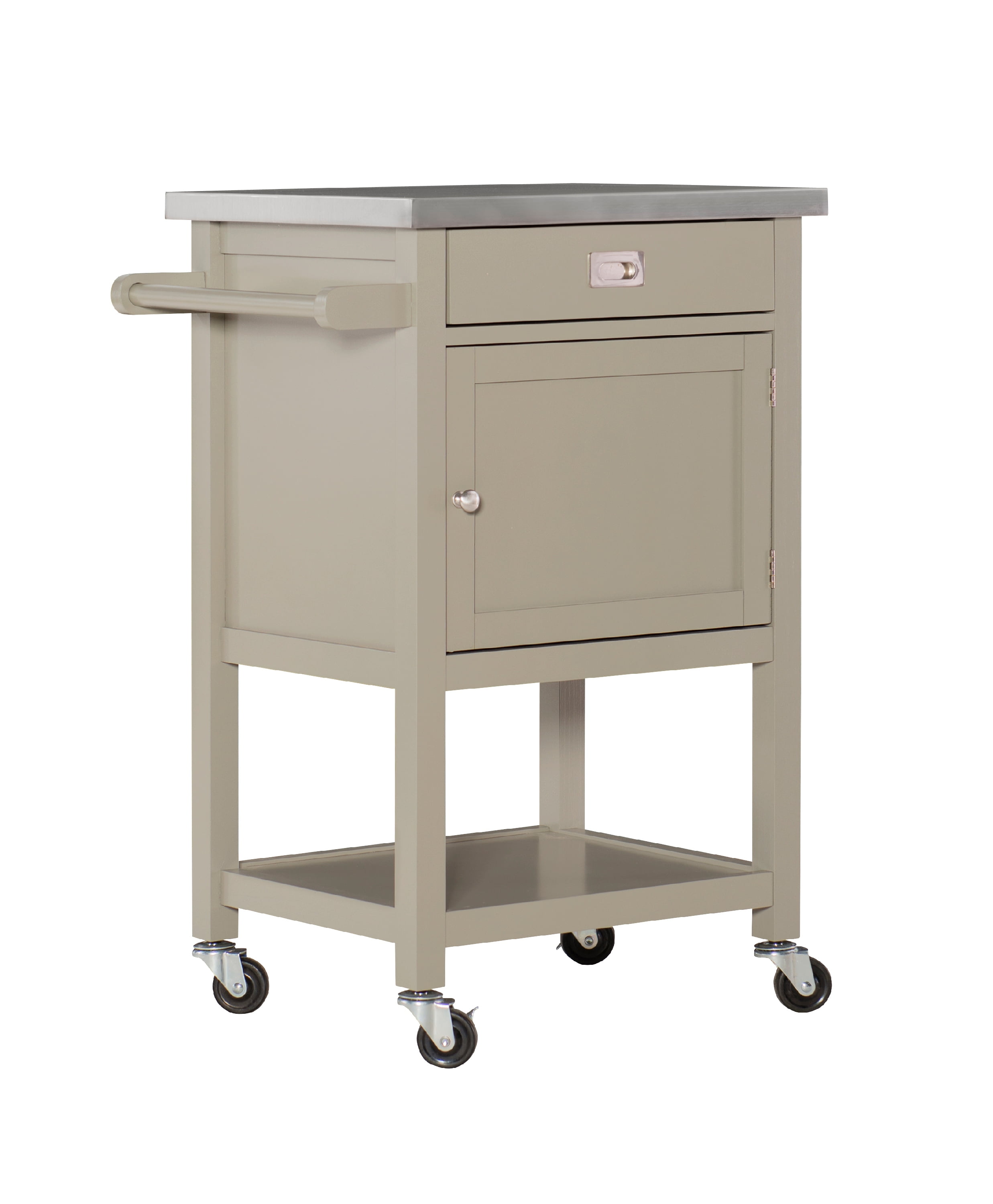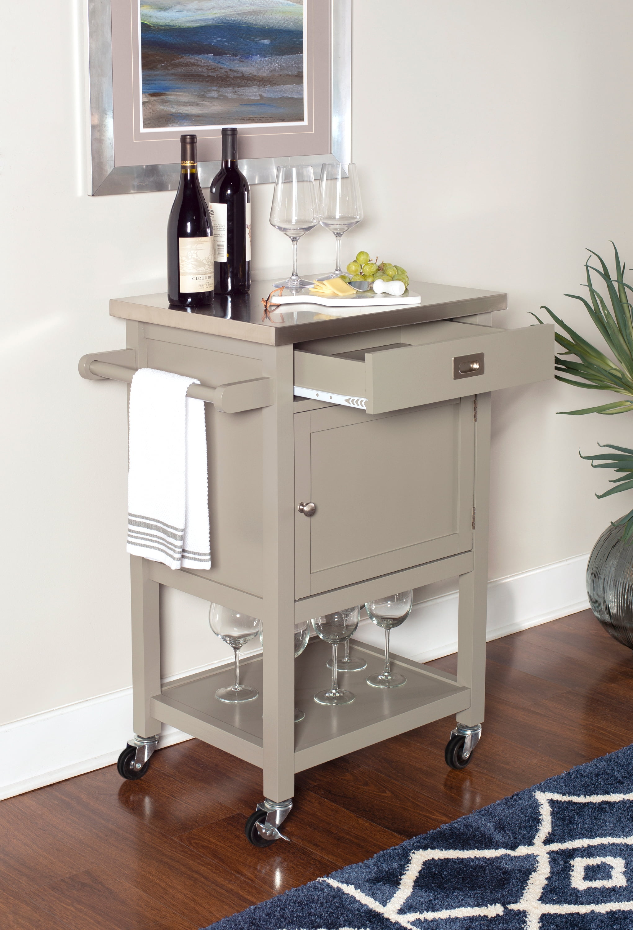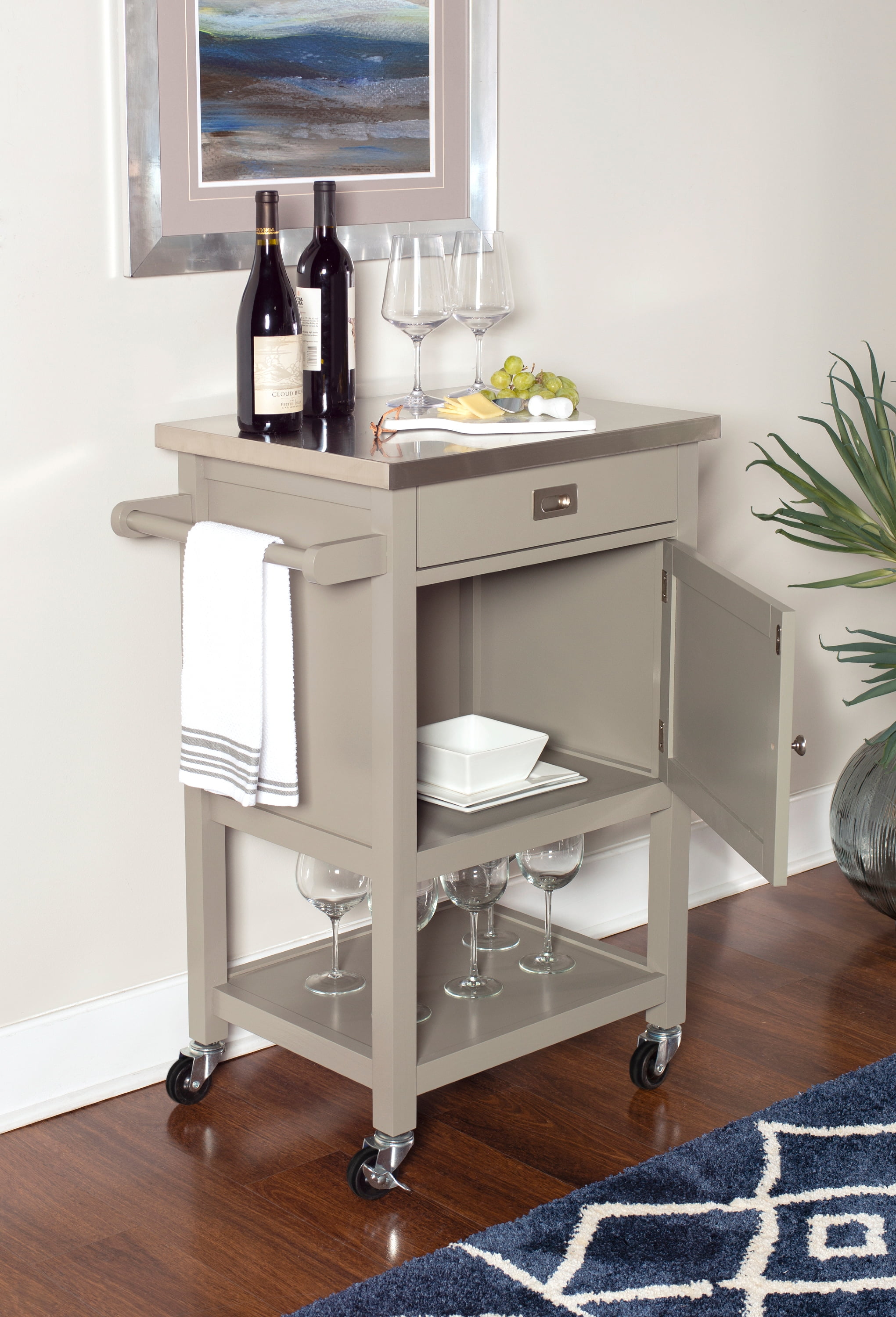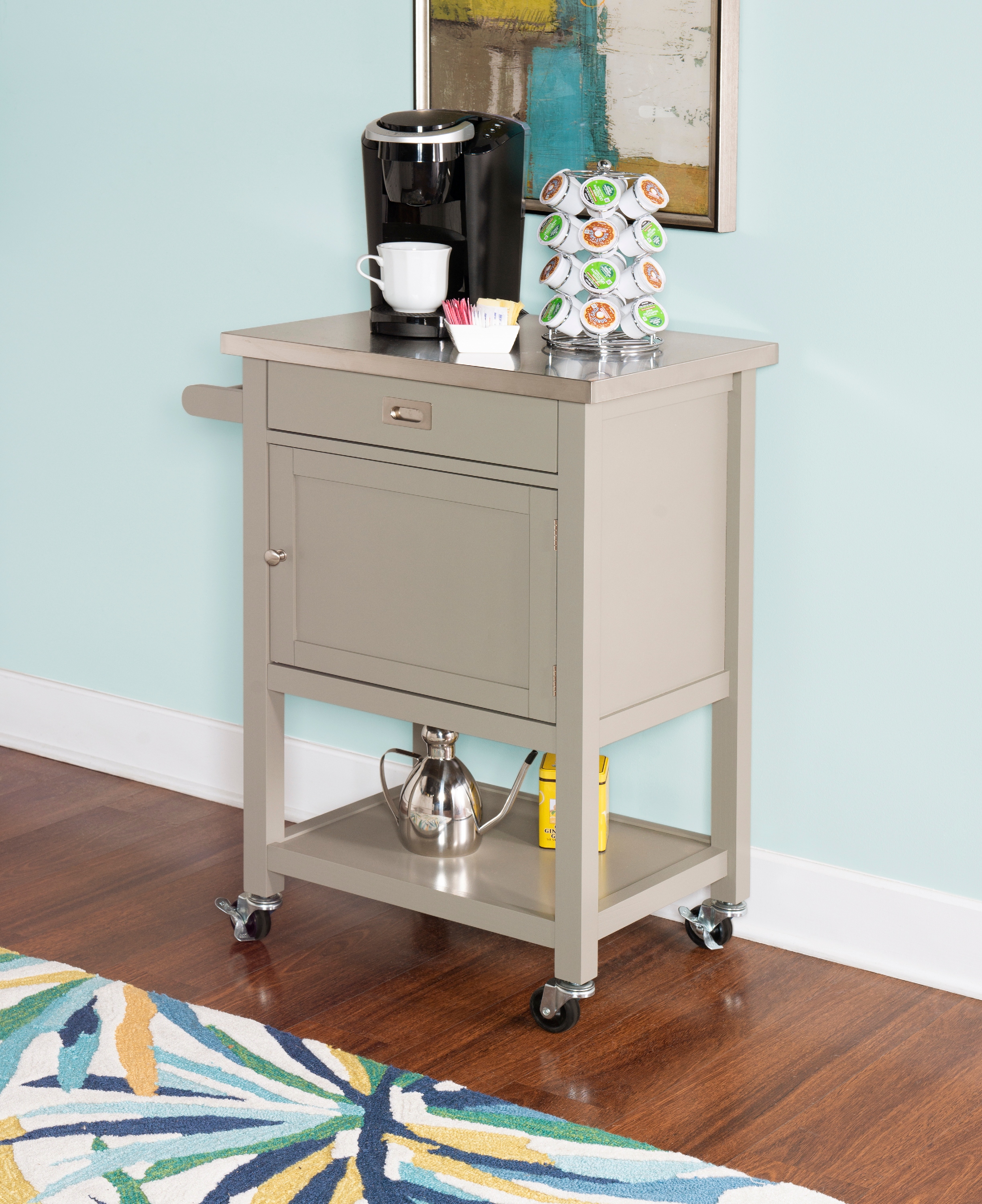 Simple, durable design with a gray finish, with stainless steel metal handles and hardware Easy to clean, food-safe stainless steel top. Convenient storage including top drawer, enclosed cabinet, bottom shelf, and towel bar Smooth-rolling, secure locking casters Efficient mobile storage or serving in any room Sturdy wood frame Assembly required Assembled Dimensions: 22-25.5″ W x 18″ D x 36″ H Ships in 1 box Product Weight: 41.01 lbs.