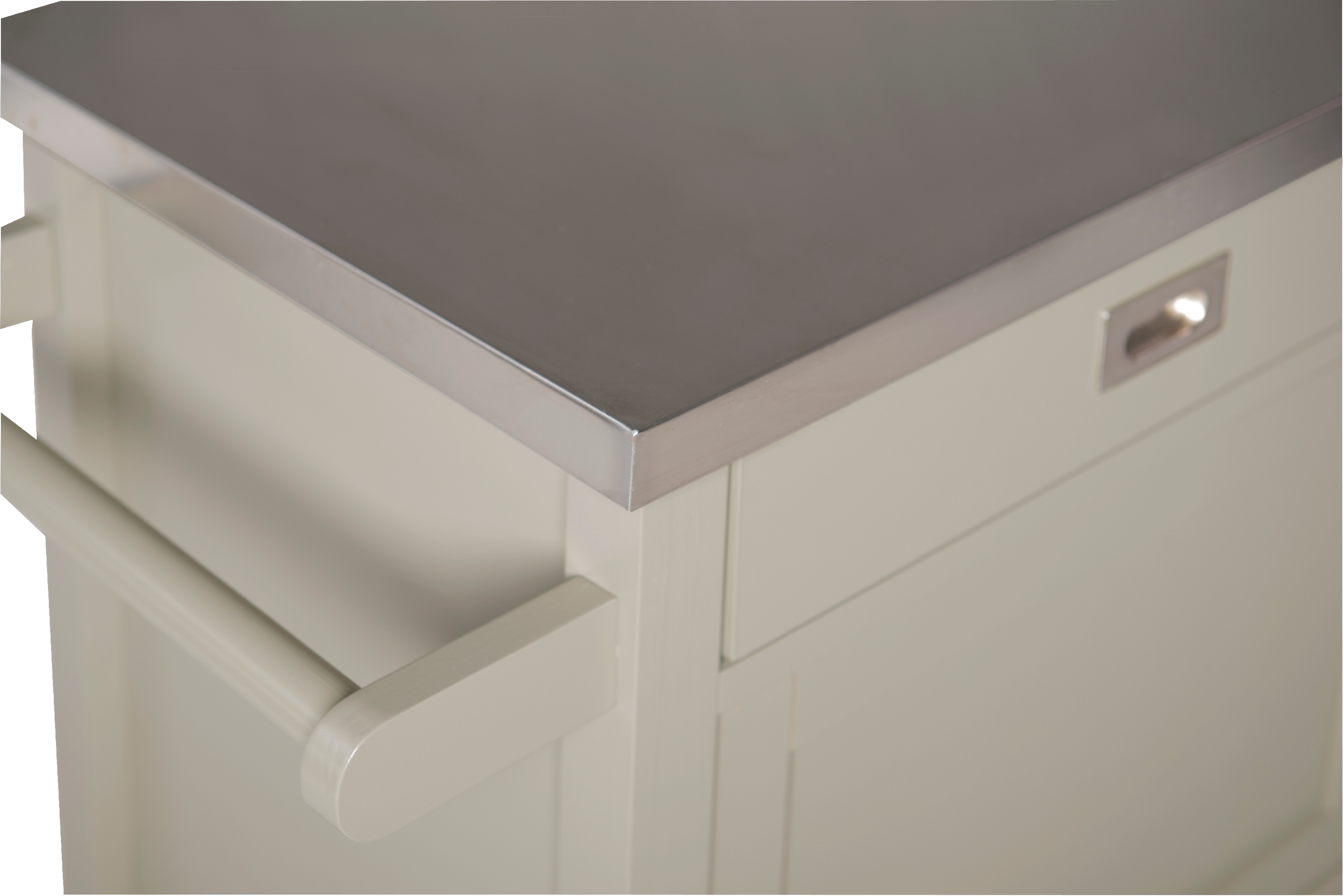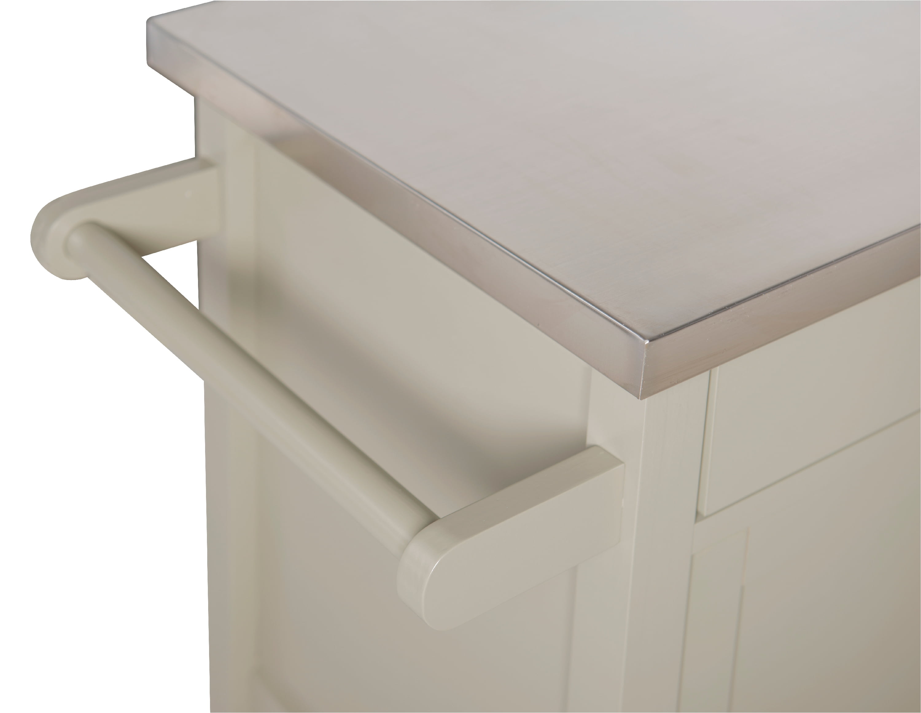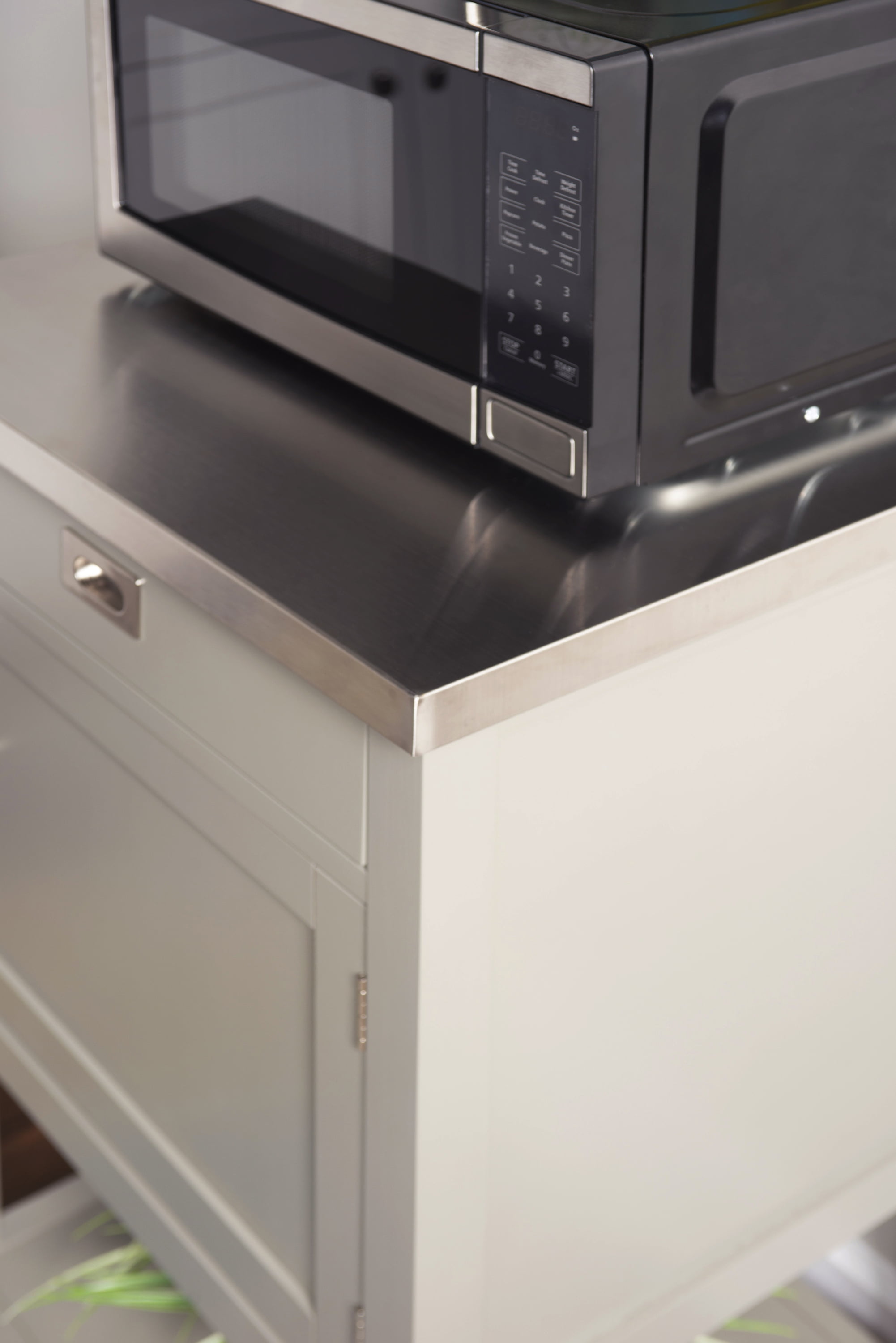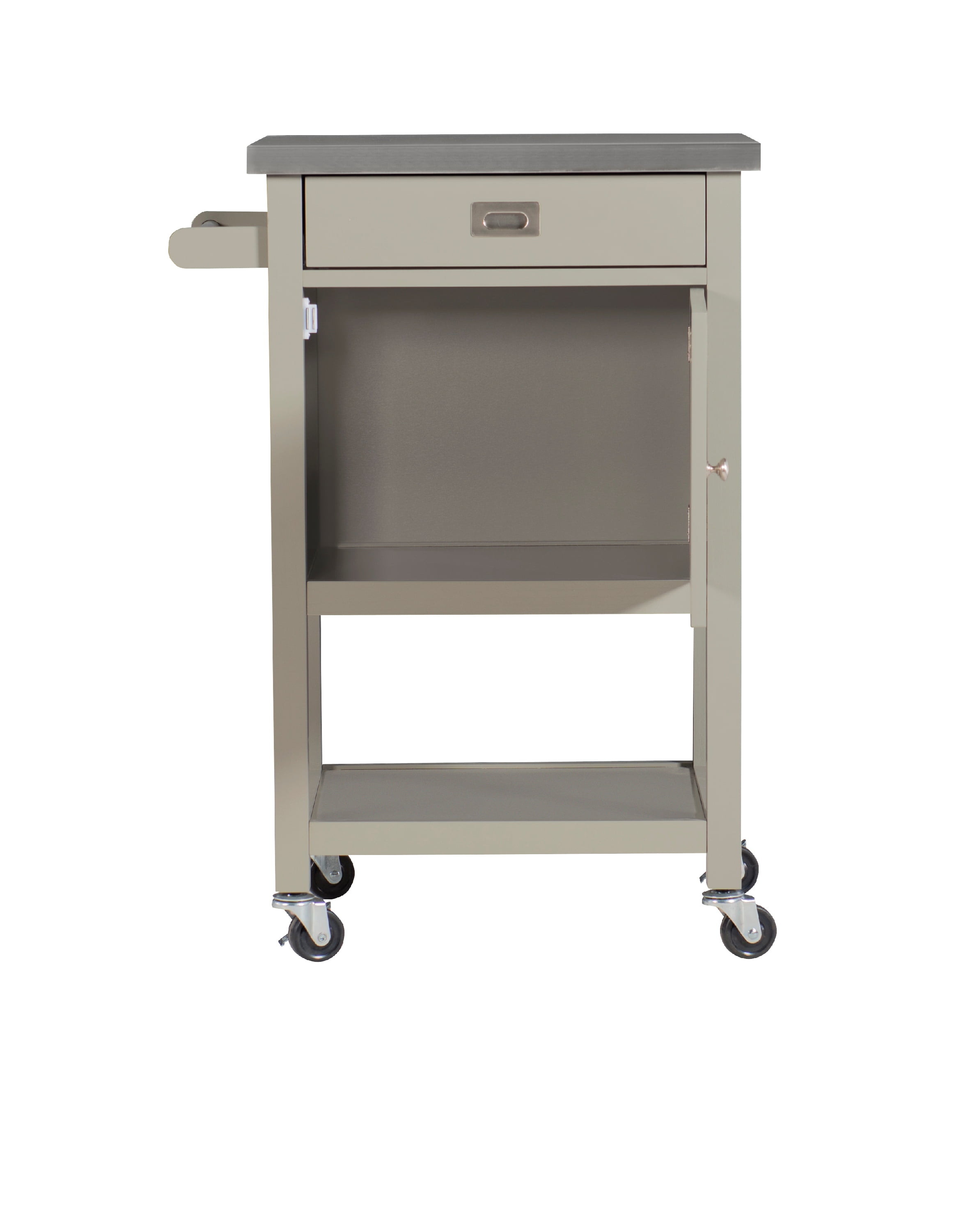 Simple, durable design with a gray finish, with stainless steel metal handles and hardware Easy to clean, food-safe stainless steel top. Convenient storage including top drawer, enclosed cabinet, bottom shelf, and towel bar Smooth-rolling, secure locking casters Efficient mobile storage or serving in any room Sturdy wood frame Assembly required Assembled Dimensions: 22-25.5″ W x 18″ D x 36″ H Ships in 1 box Product Weight: 41.01 lbs.