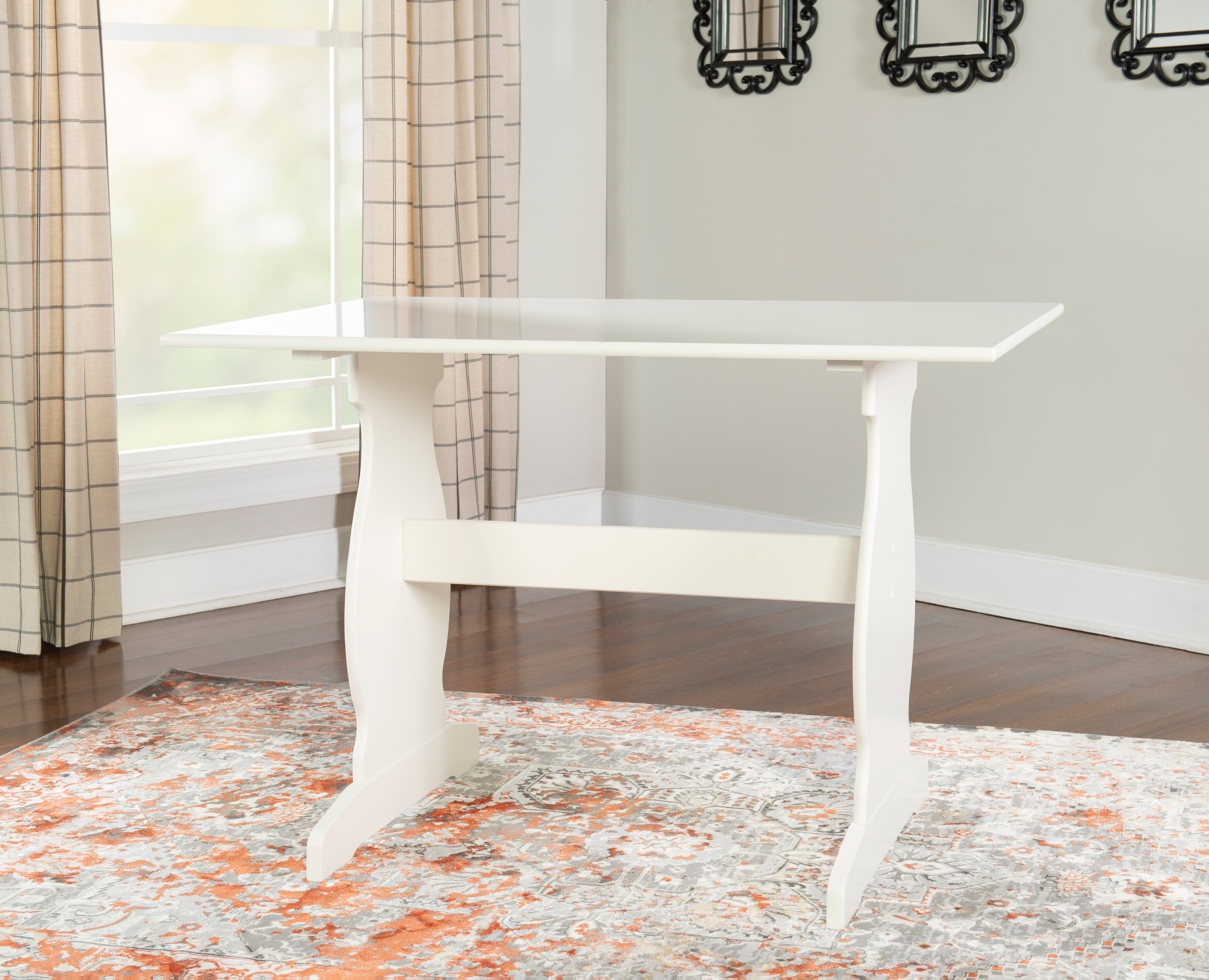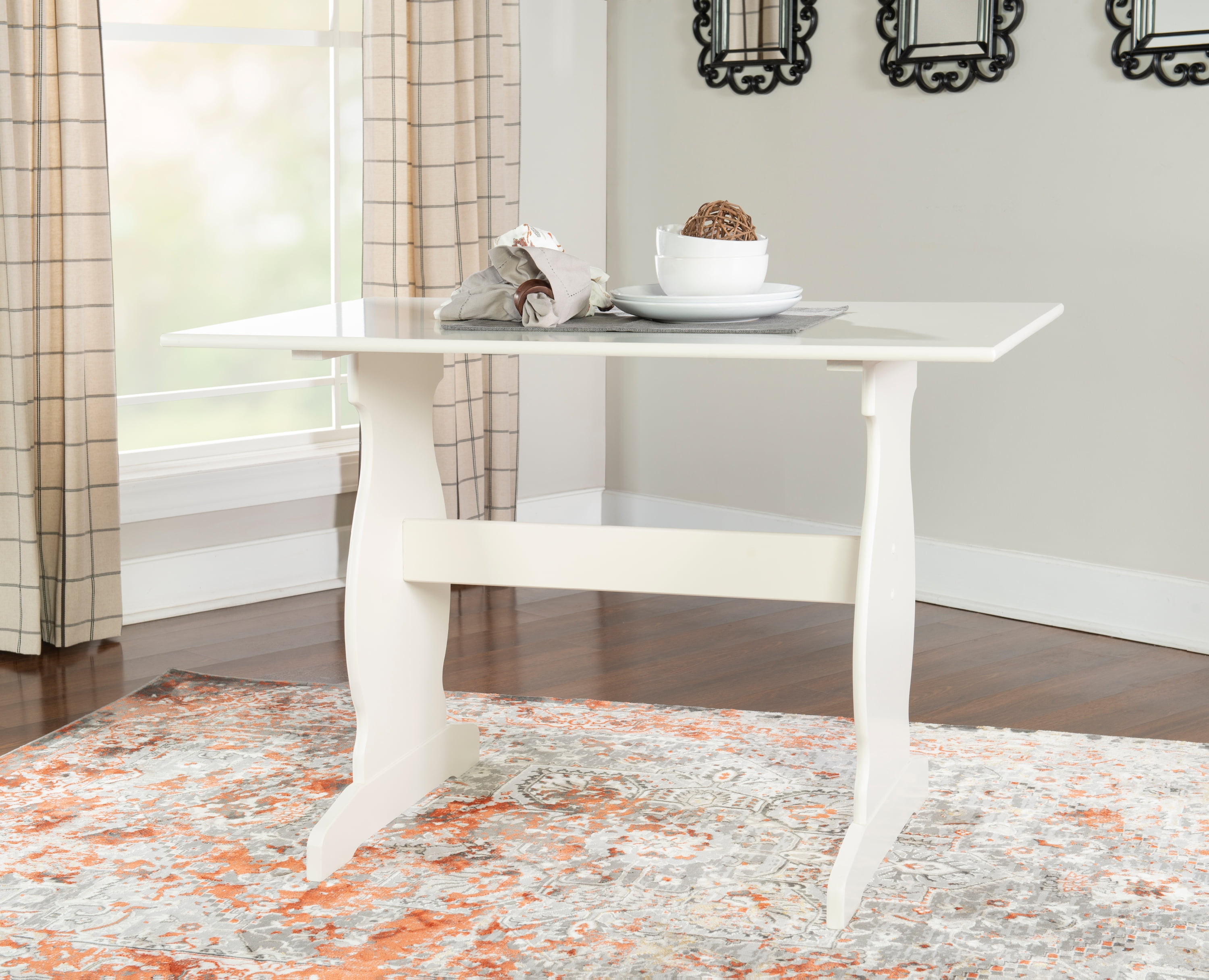 The Linon Weston 3-Piece Corner Dining Nook Set is a great pick for small kitchens. It includes a corner bench, side bench, and table. The set seats up to five people and fits neatly in a corner. Cushions with soft charcoal fabric add comfort. The white wood finish gives it a clean, classic look. Recommended Location: Indoor. Character Group: None.